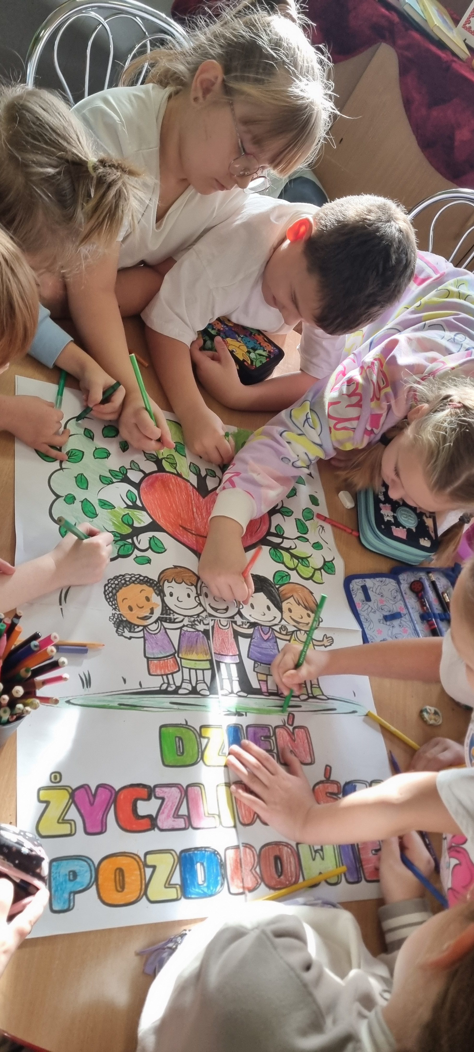 21 listopada obchodziliśmy radosny Dzień Życzliwości i Pozdrowień. Wspólnie malowaliśmy kolorowy plakat promujący życzliwość oraz odczytywaliśmy wskazówki, jak na co dzień być życzliwym dla innych.