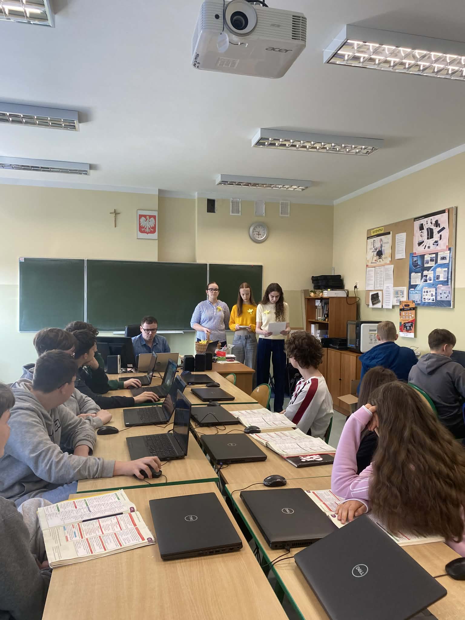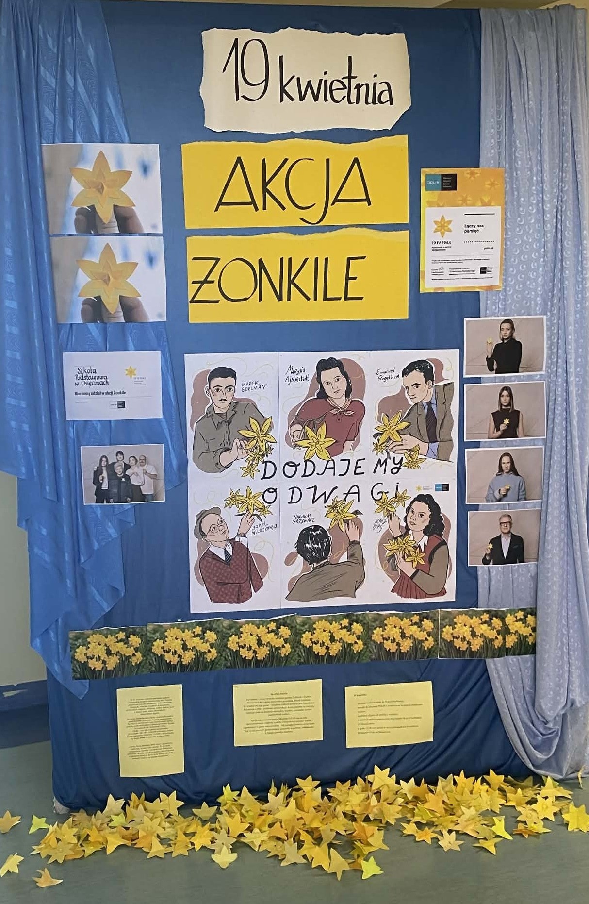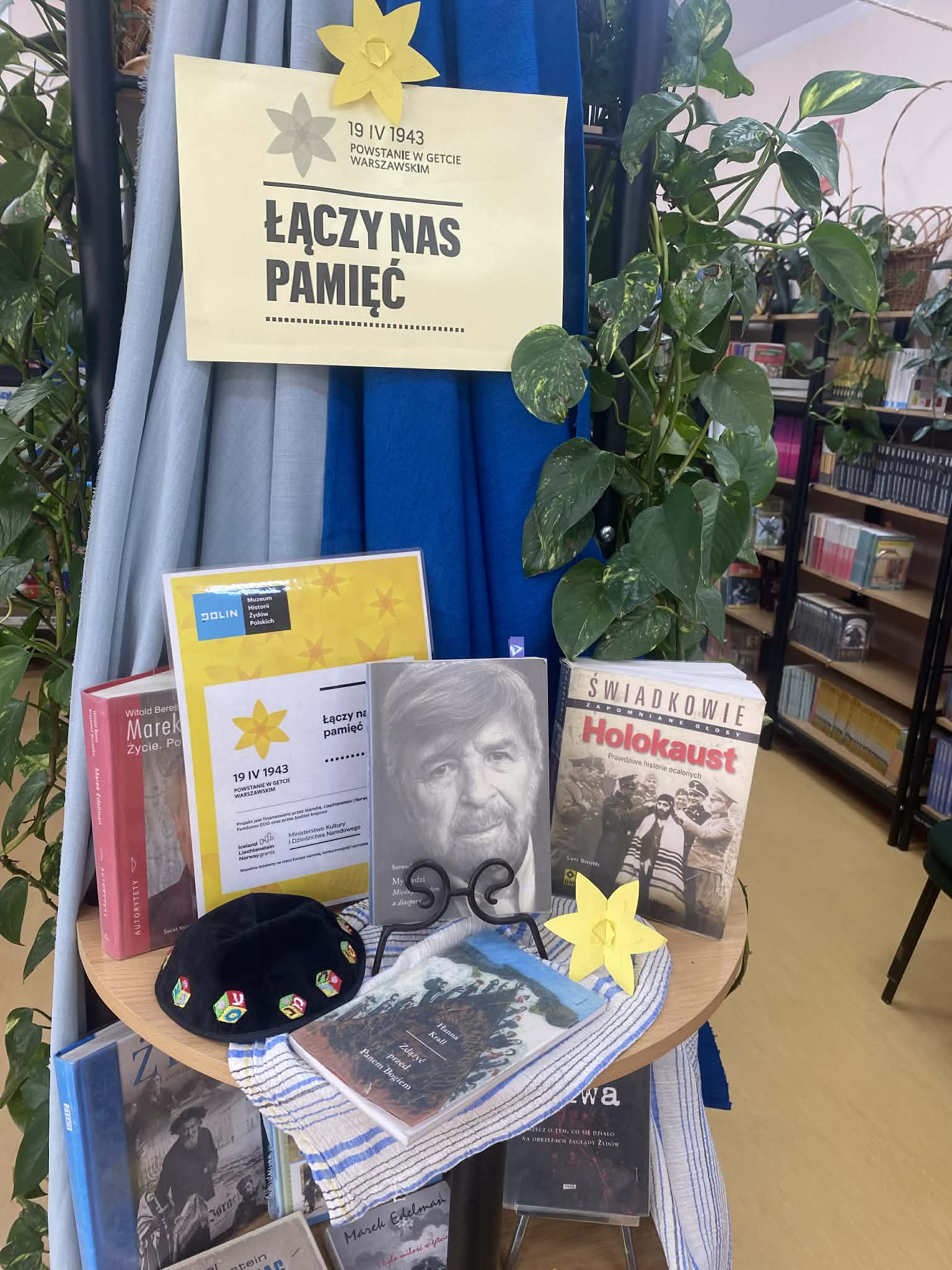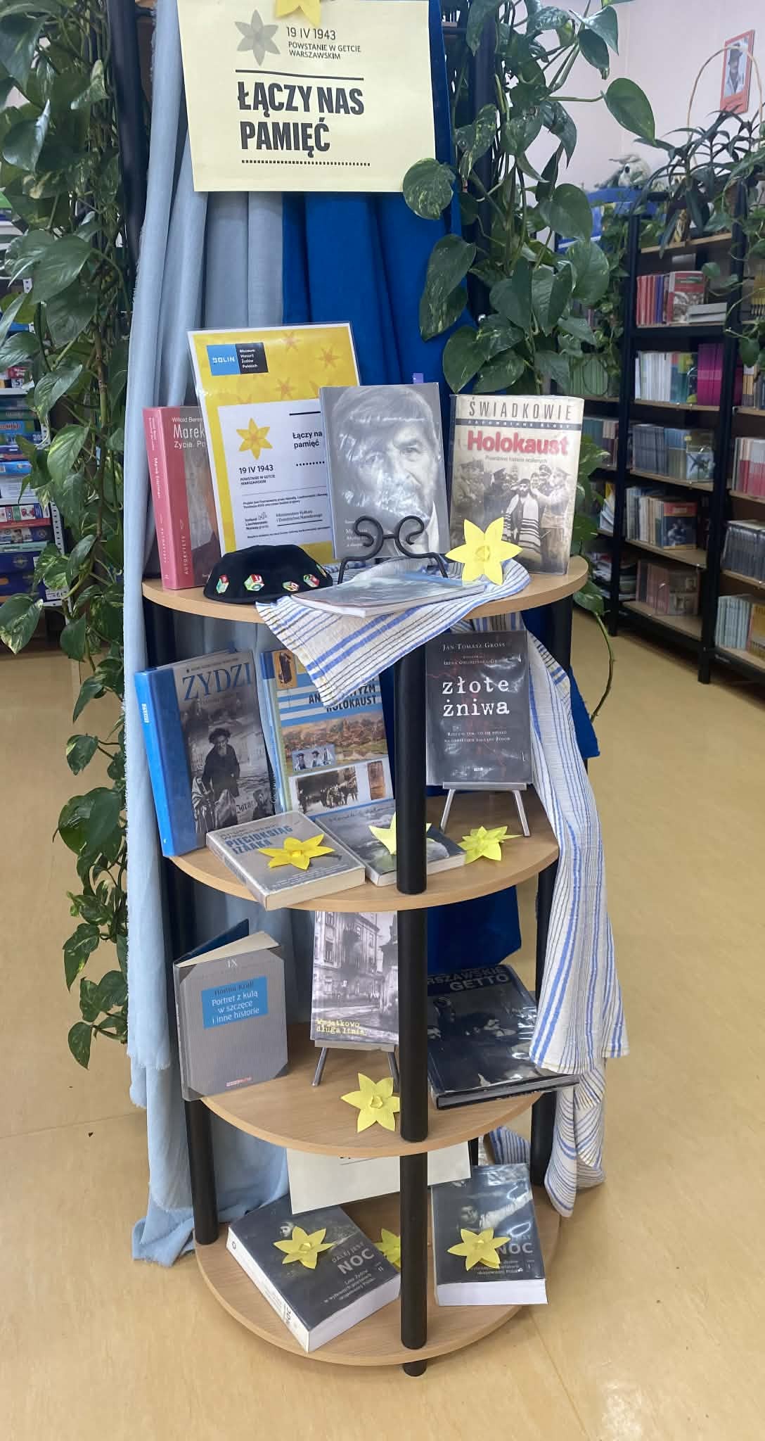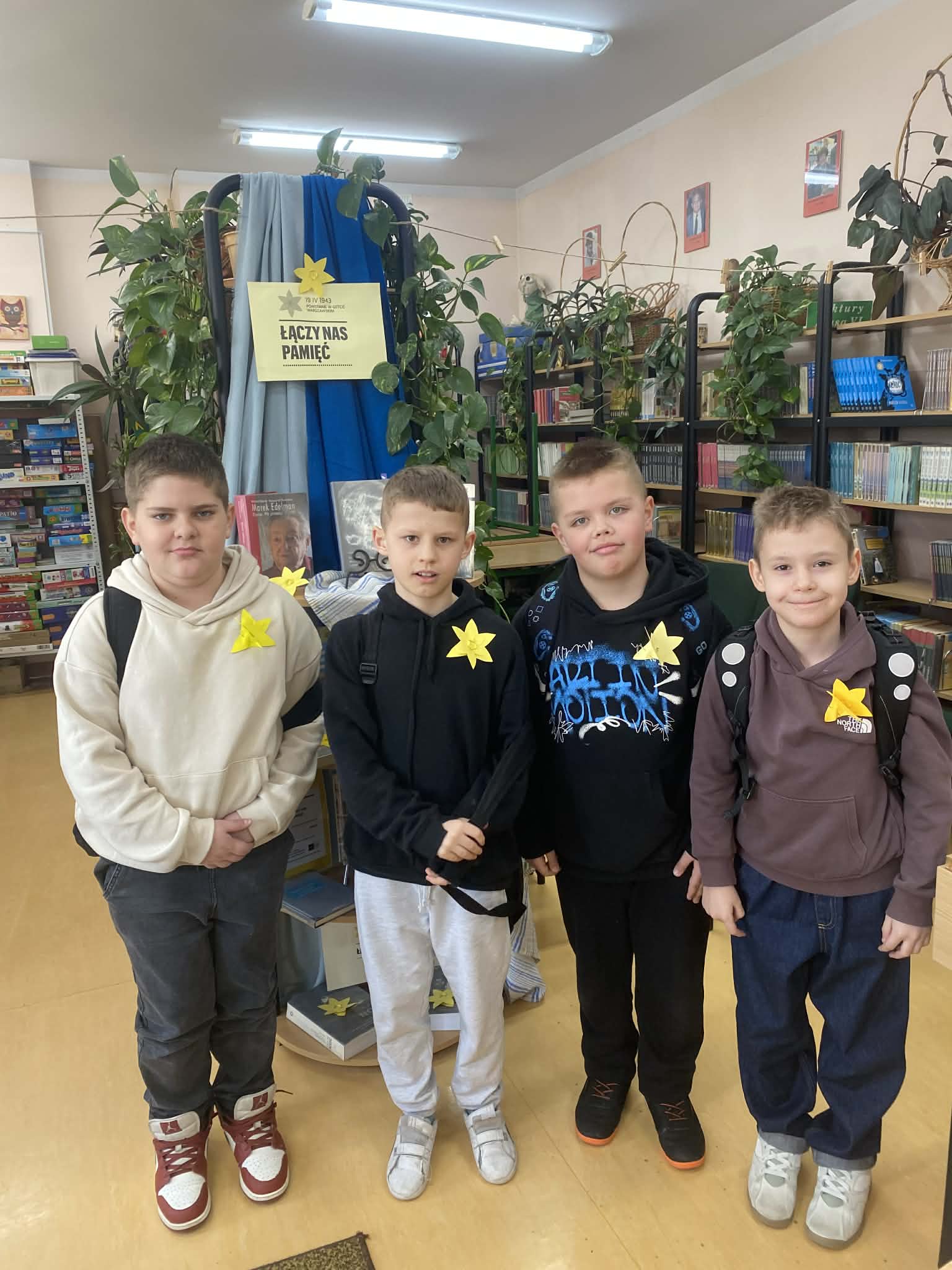 17 kwietnia 2026 r. obchodziliśmy w naszej szkole 83. rocznicę wybuchu powstania w getcie warszawskim – największego zbrojnego zrywu Żydów podczas II wojny światowej, a zarazem pierwszego powstania miejskiego w okupowanej Europie (19.04.1943 r.). Tego dnia Muzeum Historii Żydów Polskich POLIN organizuje corocznie akcję społeczno – edukacyjną pod hasłem „Akcja Żonkile”. Kolejny raz biblioteka szkolna wspólnie z p. Małgorzatą Hejman postanowiła przyłączyć się do tej wyjątkowej inicjatywy poprzez przeprowadzenie zajęć na temat holokaustu, przygotowanie wystawki książek oraz tablicy informacyjnej na korytarzu szkolnym z treściami związanymi z powstaniem w getcie warszawskim.