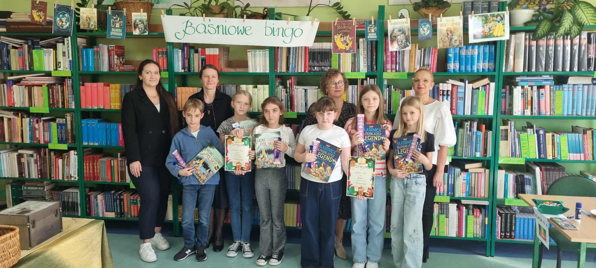 22 października 2025 r. klasy czwarte wzięły udział w kolejnej edycji konkursu bibliotecznego pod hasłem “Baśniowe bingo”, który składał się z sześciu konkurencji. Na początek trzyosobowe zespoły otrzymały kartę bingo, ilustracje z ośmiu baśni oraz etykiety z tytułami. Na podstawie czytanych fragmentów należało odgadnąć tytuły baśni i przykleić je pod właściwą ilustracją. Kolejna konkurencja polegało na rozszyfrowaniu zakodowanych kodami QR tytułów popularnych baśni. Następnie uczniowie otrzymali do rozwiązania krzyżówkę, która była tematycznie związana z baśniami. Po uzupełnieniu krzyżówki przyszedł czas na układanie puzzli na czas. Atrakcyjnym dla uczniów zadaniem było odgadywanie na podstawie wylosowanego przedmiotu (np.: lusterko, ziarnko grochu, jabłko, zapałki), z jaką baśnią się on kojarzy i podanie tytułu. Ostatnie zadanie sprawiło, że uczniowie mogli poczuć się jak baśniowy Kopciuszek, wybierający z mozołem mak z popiołu. Pomieszany groch z ryżem należało oddzielić za pomocą drewnianych klamerek. To zadanie wzbudziło wiele emocji i śmiechu. Po podliczeniu przez komisję punktów wyłoniono laureatów.