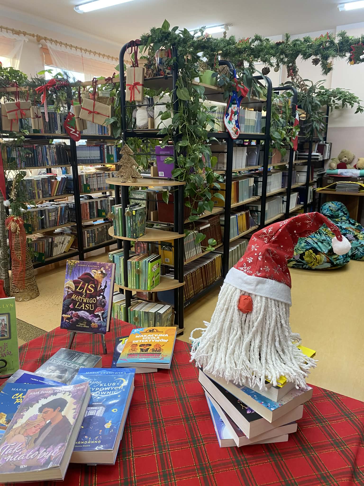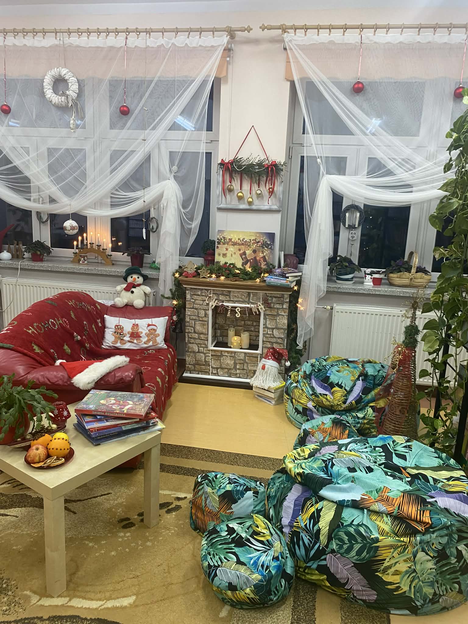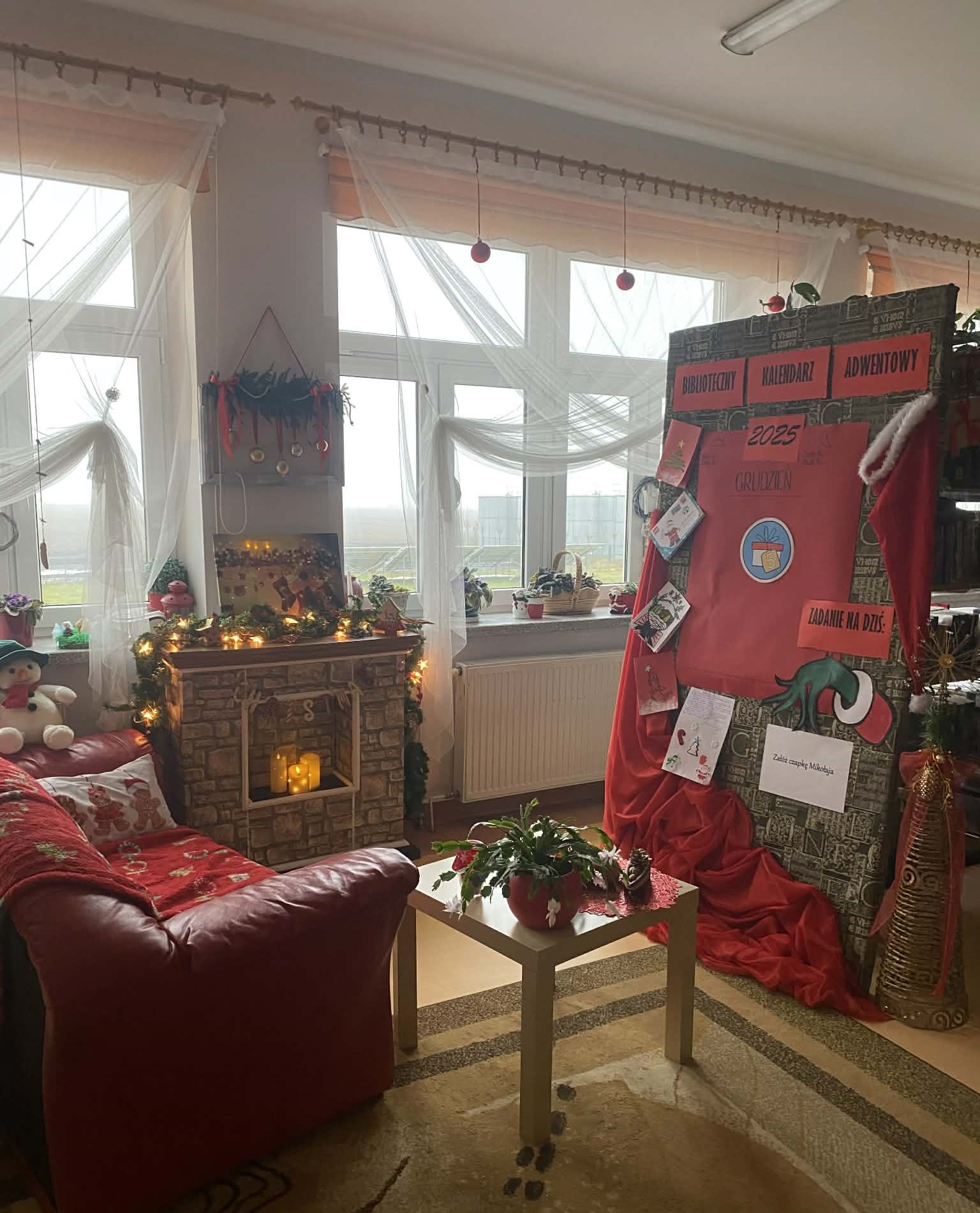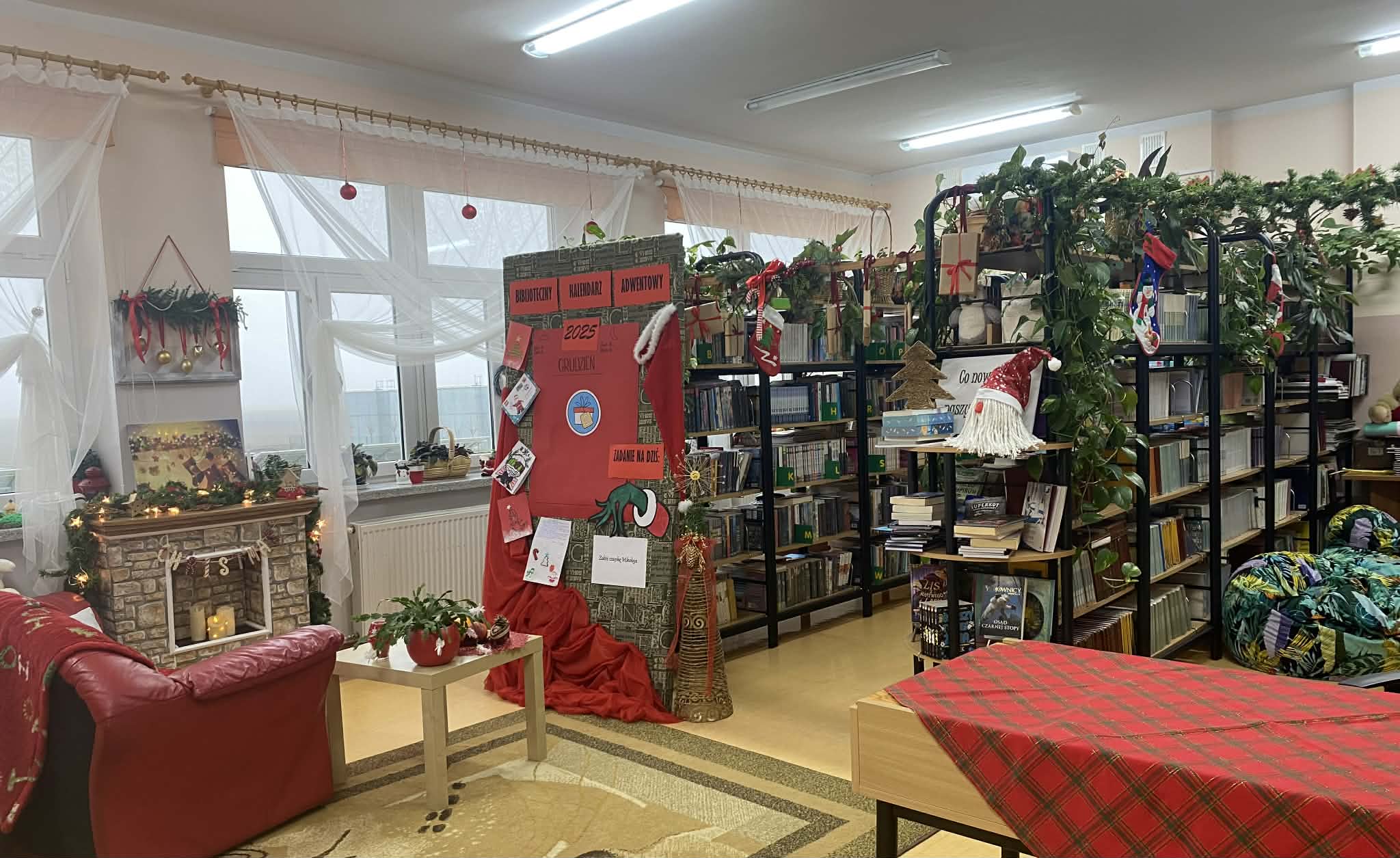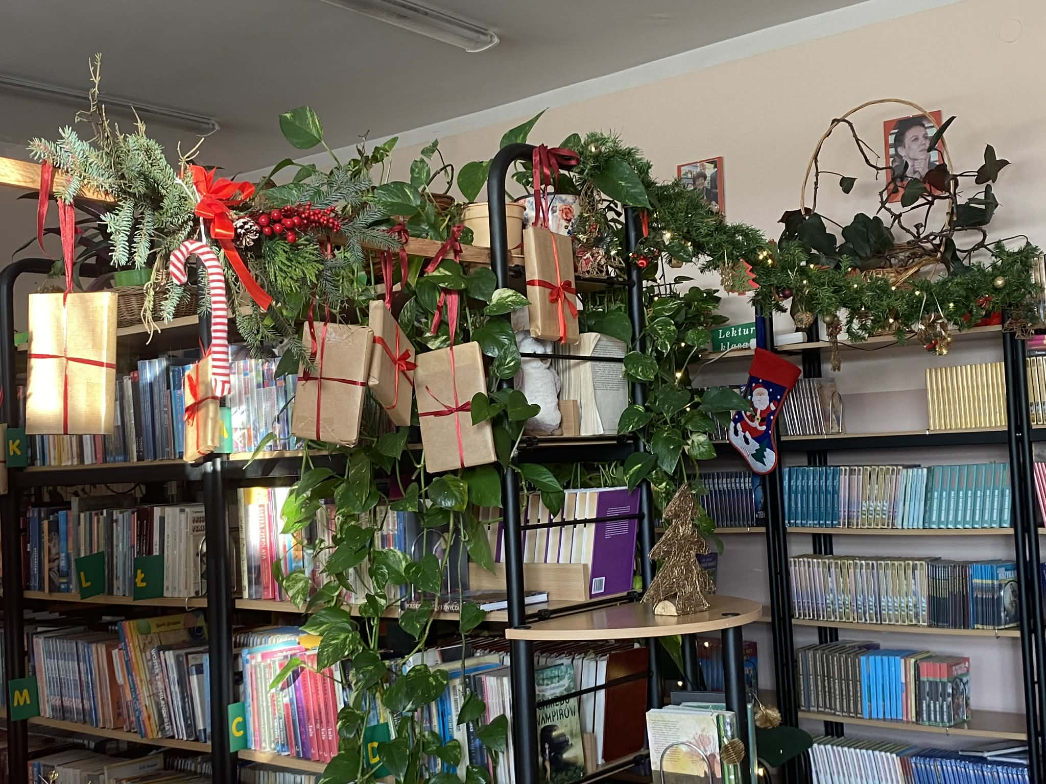 Od początku grudnia w bibliotece szkolnej (budynek byłego gimnazjum) panuje wyjątkowy, świąteczny nastrój. Między regałami pojawiły się girlandy z zielonych gałązek, udekorowane ozdobami i subtelnymi lampkami, które tworzą ciepłe, nastrojowe światło. W powietrzu unosi się zapach świeżych gałązek świerku, pomarańczy, goździków, cynamonu i pierników, wprowadzający odwiedzających uczniów wbożonarodzeniowy klimat. Na półkach pojawiły się świąteczne akcenty. Zamiast tradycyjnych dekoracji, na regałach zawieszono starannie opakowane “prezenty” – różnej wielkości książki, przewiązane wstążkami. Wyglądają jak prawdziwe podarunki, gotowe do wręczenia bliskim. W bibliotece panuje wyjątkowy, świąteczny nastrój, a główną ozdobą, która przyciąga wzrok, jest dekoracyjny kominek, który doskonale się komponuje z całym wystrojem. W miejscu ognia migoczą sztuczne płomienie, które tworzą ciepłą, przytulną atmosferę, a wnętrze biblioteki  nabiera domowego charakteru i zachęca do relaksu z książką. Na kominku znajdują się świąteczne dekoracje – obraz, girlanda z ozdobami, a także kilka książek, jakby przygotowanych na świąteczny czas pełen lektury. Do spędzenia czasu z książką zachęcają: wygodna kanapa oraz pufy i poduszki. Z głośników płyną ciepłe dźwięki kolęd, takich jak „Cicha noc” czy „Wśród nocnej ciszy”, które wprowadzają odwiedzających w bożonarodzeniową atmosferę.