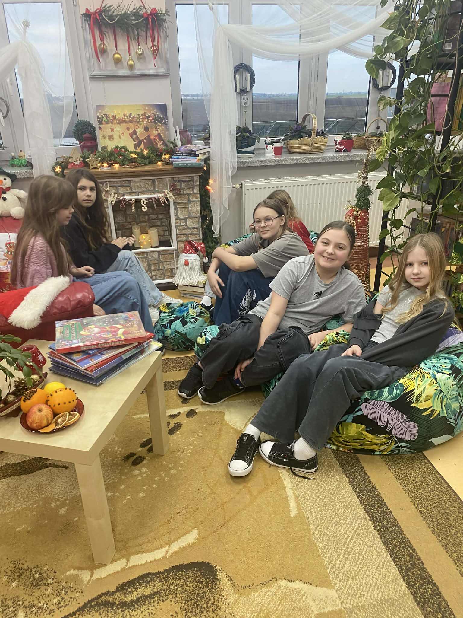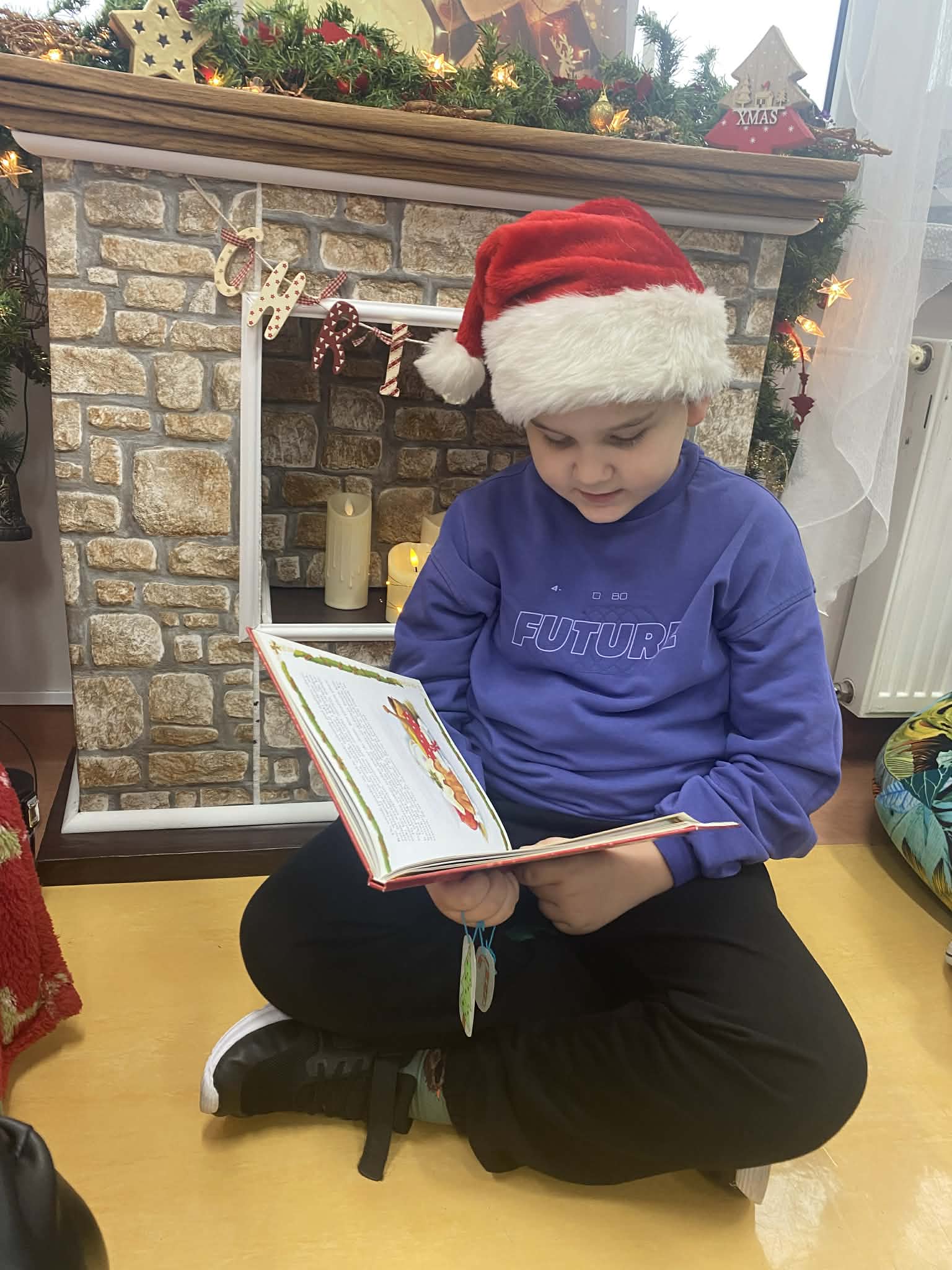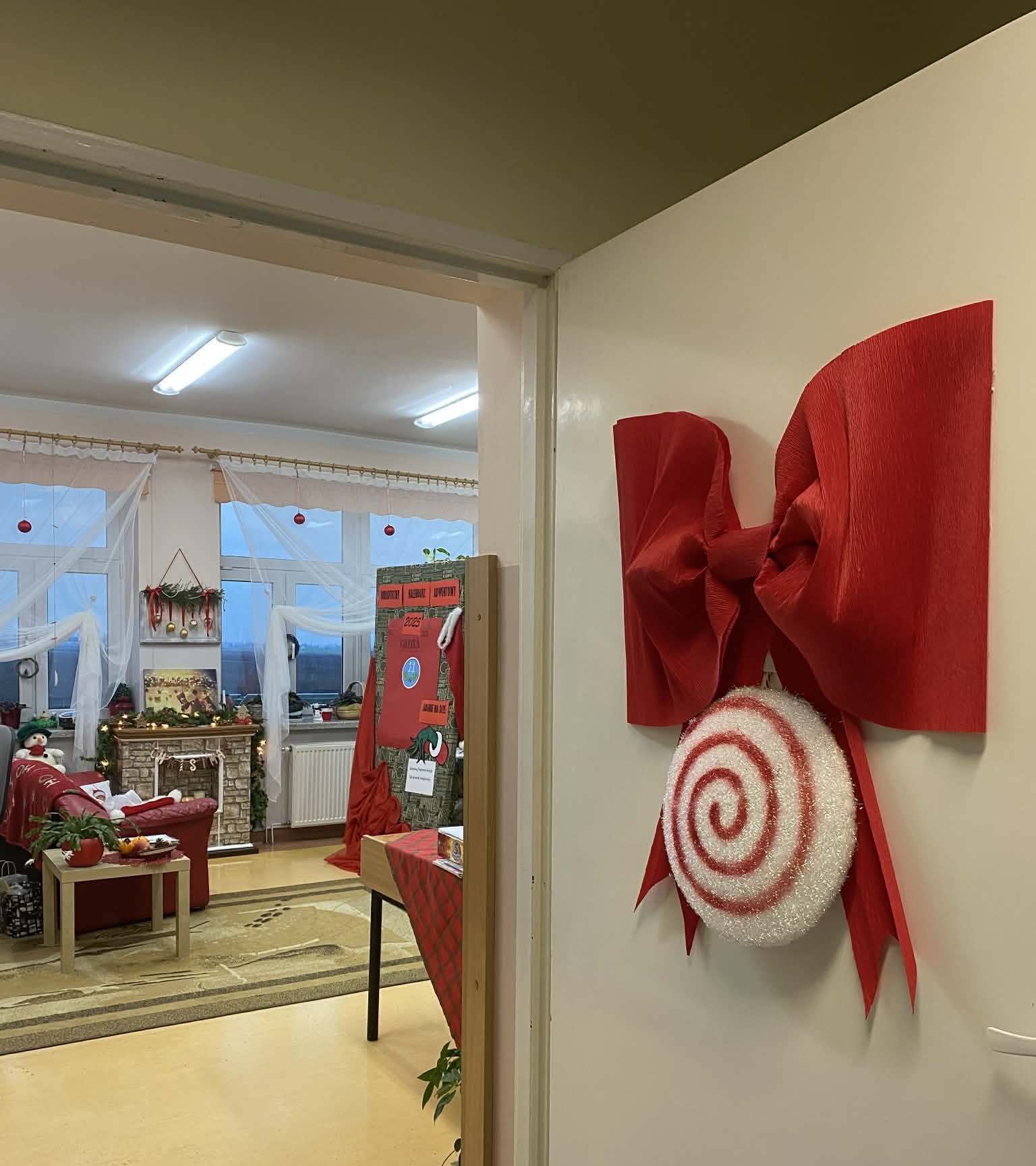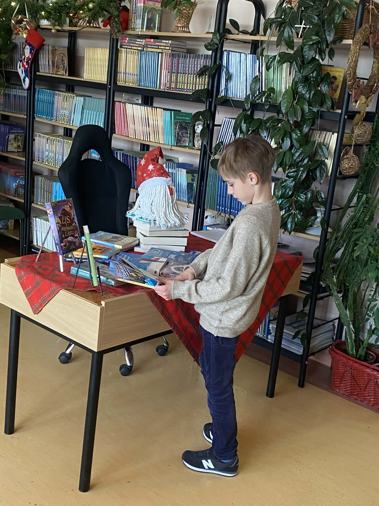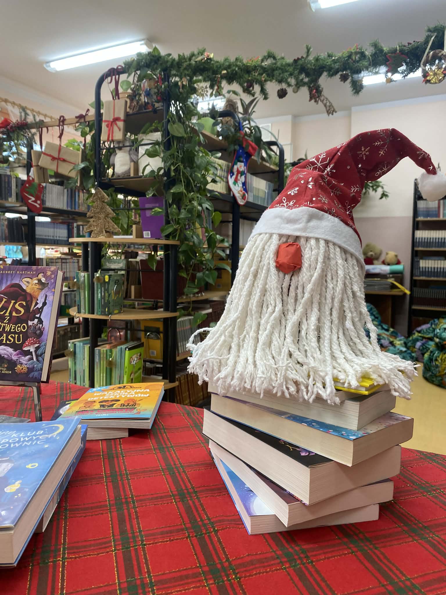 Od początku grudnia w bibliotece szkolnej (budynek byłego gimnazjum) panuje wyjątkowy, świąteczny nastrój. Między regałami pojawiły się girlandy z zielonych gałązek, udekorowane ozdobami i subtelnymi lampkami, które tworzą ciepłe, nastrojowe światło. W powietrzu unosi się zapach świeżych gałązek świerku, pomarańczy, goździków, cynamonu i pierników, wprowadzający odwiedzających uczniów wbożonarodzeniowy klimat. Na półkach pojawiły się świąteczne akcenty. Zamiast tradycyjnych dekoracji, na regałach zawieszono starannie opakowane “prezenty” – różnej wielkości książki, przewiązane wstążkami. Wyglądają jak prawdziwe podarunki, gotowe do wręczenia bliskim. W bibliotece panuje wyjątkowy, świąteczny nastrój, a główną ozdobą, która przyciąga wzrok, jest dekoracyjny kominek, który doskonale się komponuje z całym wystrojem. W miejscu ognia migoczą sztuczne płomienie, które tworzą ciepłą, przytulną atmosferę, a wnętrze biblioteki  nabiera domowego charakteru i zachęca do relaksu z książką. Na kominku znajdują się świąteczne dekoracje – obraz, girlanda z ozdobami, a także kilka książek, jakby przygotowanych na świąteczny czas pełen lektury. Do spędzenia czasu z książką zachęcają: wygodna kanapa oraz pufy i poduszki. Z głośników płyną ciepłe dźwięki kolęd, takich jak „Cicha noc” czy „Wśród nocnej ciszy”, które wprowadzają odwiedzających w bożonarodzeniową atmosferę.