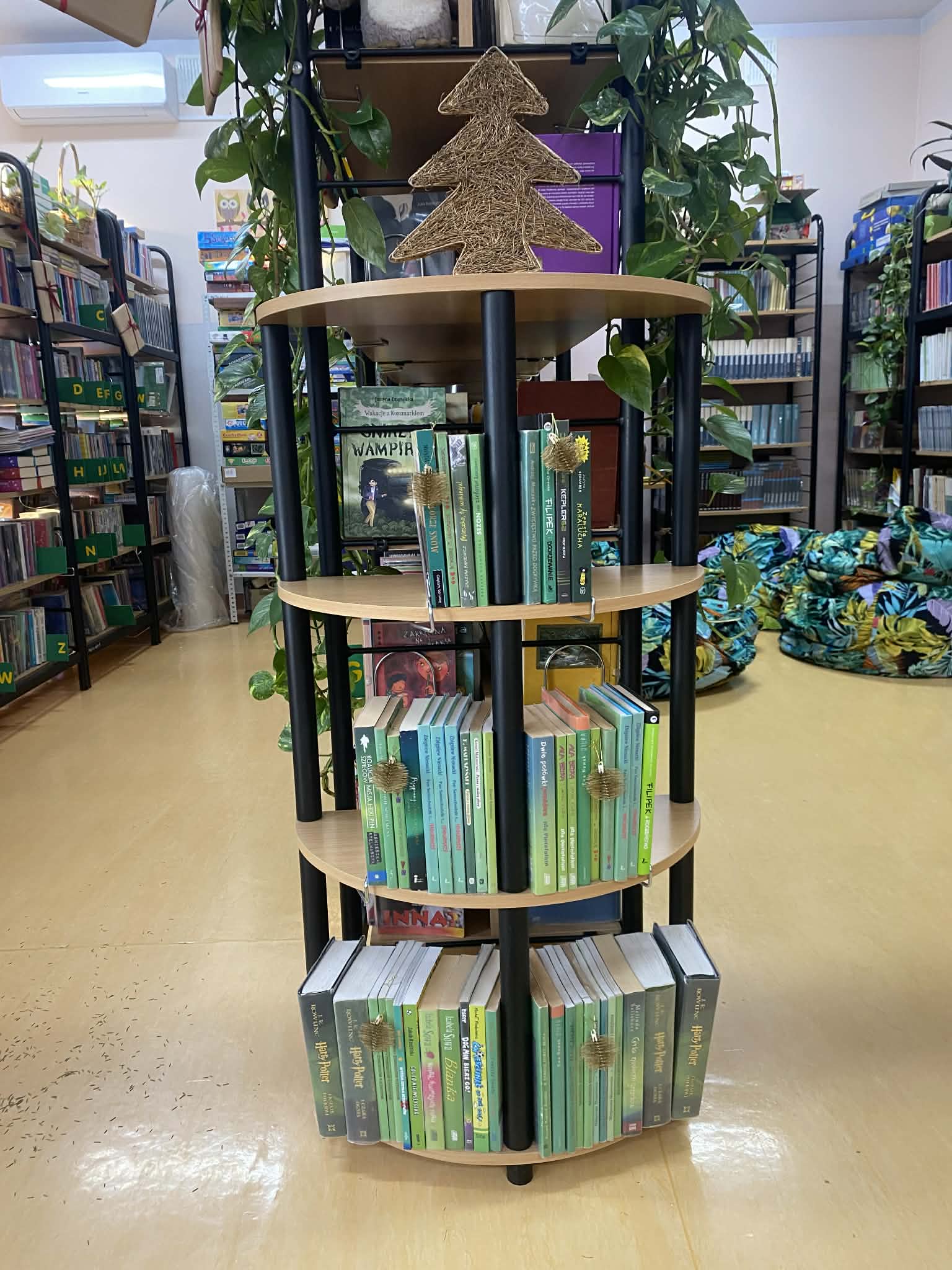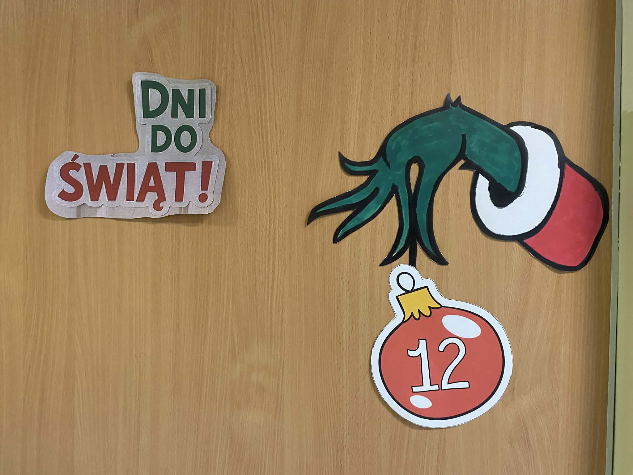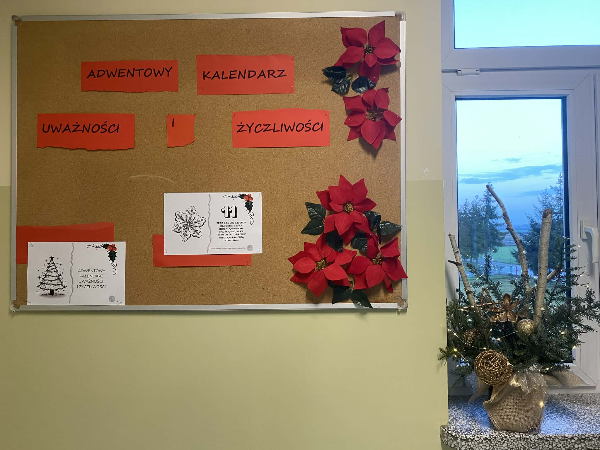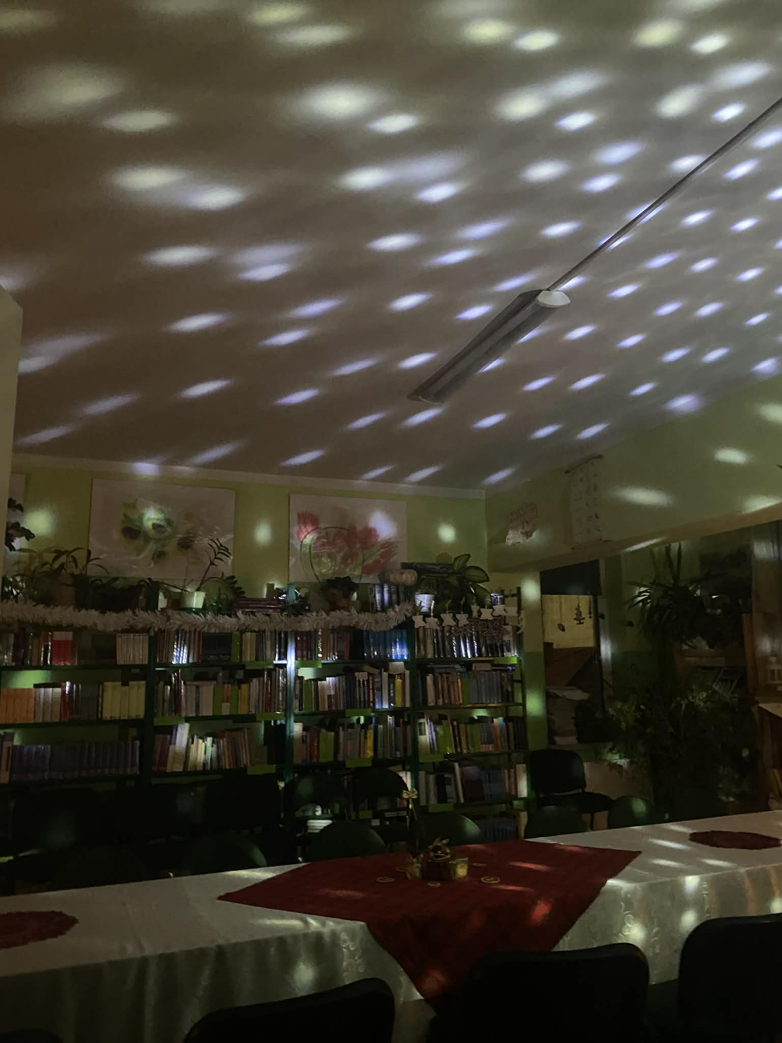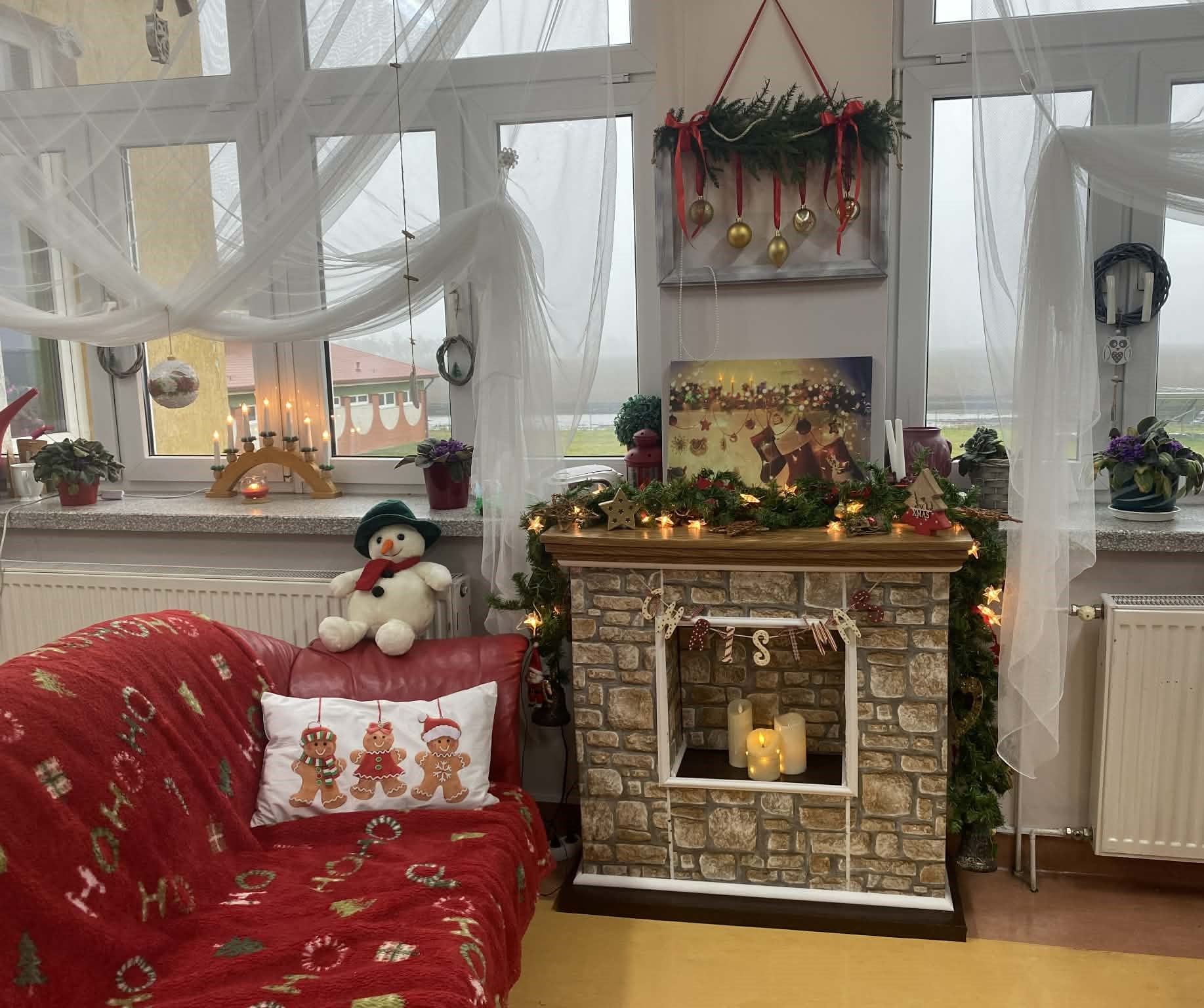 Od początku grudnia w bibliotece szkolnej (budynek byłego gimnazjum) panuje wyjątkowy, świąteczny nastrój. Między regałami pojawiły się girlandy z zielonych gałązek, udekorowane ozdobami i subtelnymi lampkami, które tworzą ciepłe, nastrojowe światło. W powietrzu unosi się zapach świeżych gałązek świerku, pomarańczy, goździków, cynamonu i pierników, wprowadzający odwiedzających uczniów wbożonarodzeniowy klimat. Na półkach pojawiły się świąteczne akcenty. Zamiast tradycyjnych dekoracji, na regałach zawieszono starannie opakowane “prezenty” – różnej wielkości książki, przewiązane wstążkami. Wyglądają jak prawdziwe podarunki, gotowe do wręczenia bliskim. W bibliotece panuje wyjątkowy, świąteczny nastrój, a główną ozdobą, która przyciąga wzrok, jest dekoracyjny kominek, który doskonale się komponuje z całym wystrojem. W miejscu ognia migoczą sztuczne płomienie, które tworzą ciepłą, przytulną atmosferę, a wnętrze biblioteki  nabiera domowego charakteru i zachęca do relaksu z książką. Na kominku znajdują się świąteczne dekoracje – obraz, girlanda z ozdobami, a także kilka książek, jakby przygotowanych na świąteczny czas pełen lektury. Do spędzenia czasu z książką zachęcają: wygodna kanapa oraz pufy i poduszki. Z głośników płyną ciepłe dźwięki kolęd, takich jak „Cicha noc” czy „Wśród nocnej ciszy”, które wprowadzają odwiedzających w bożonarodzeniową atmosferę.