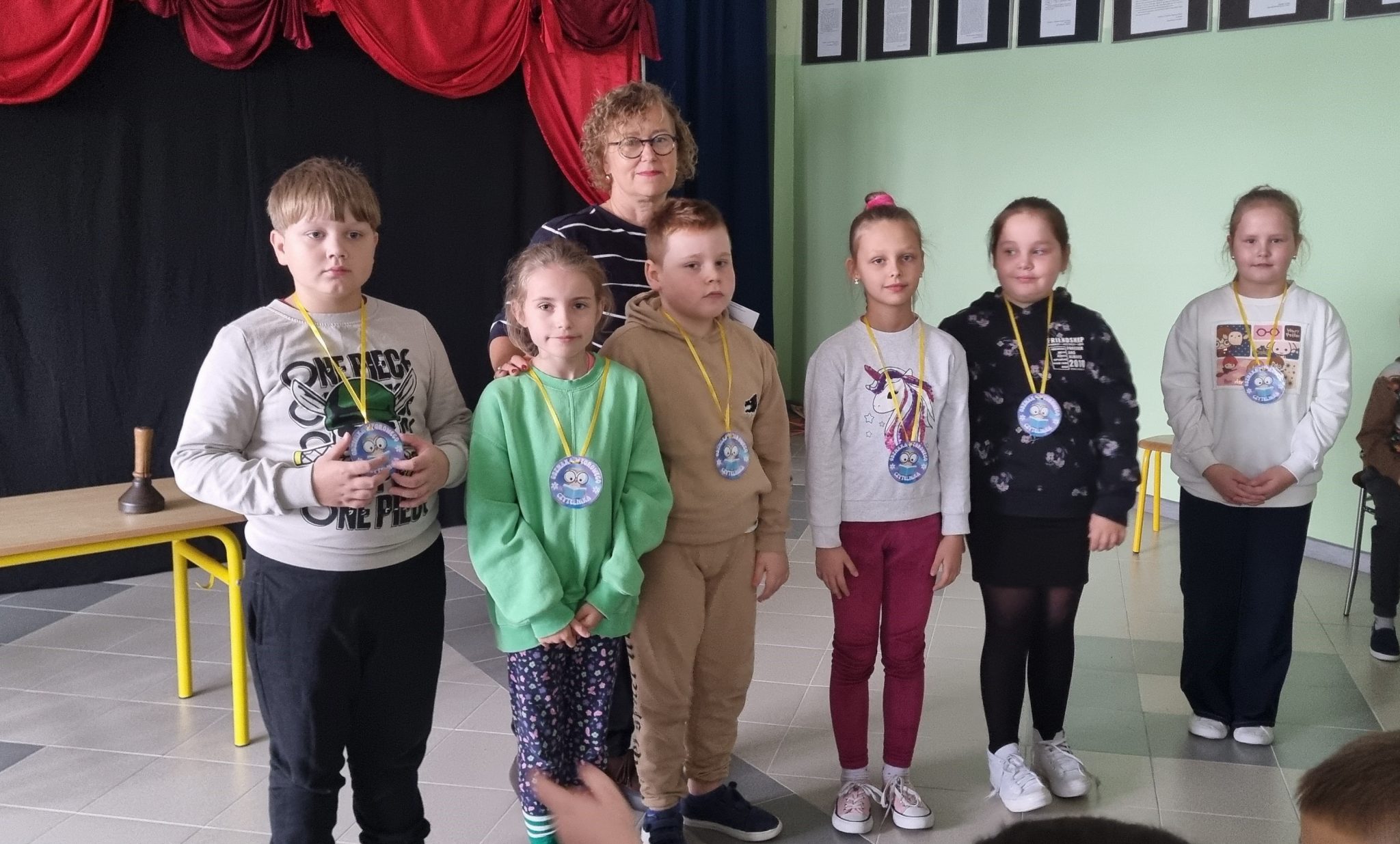 22 października 2025 r. klasy czwarte wzięły udział w kolejnej edycji konkursu bibliotecznego pod hasłem “Baśniowe bingo”, który składał się z sześciu konkurencji. Na początek trzyosobowe zespoły otrzymały kartę bingo, ilustracje z ośmiu baśni oraz etykiety z tytułami. Na podstawie czytanych fragmentów należało odgadnąć tytuły