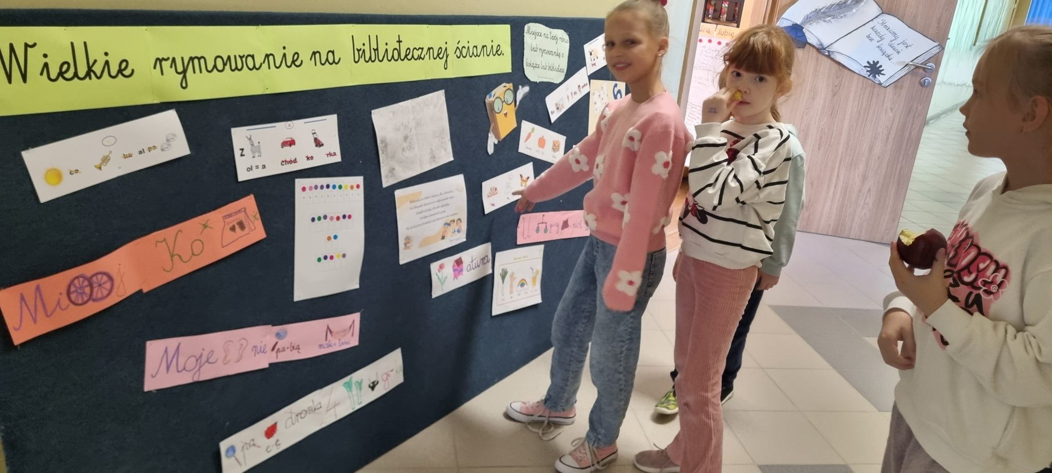 W październiku w szkolnej bibliotece odbyła się akcja „Rymowanie na bibliotecznej ścianie”, której celem było: Podczas wydarzenia uczniowie tworzyli własne rymy i rebusy, które następnie prezentowali na bibliotecznej ścianie. Powstało wiele ciekawych i pomysłowych prac. Za szczególną kreatywność i oryginalne pomysły wyróżniono następujących uczniów: Dziękujemy