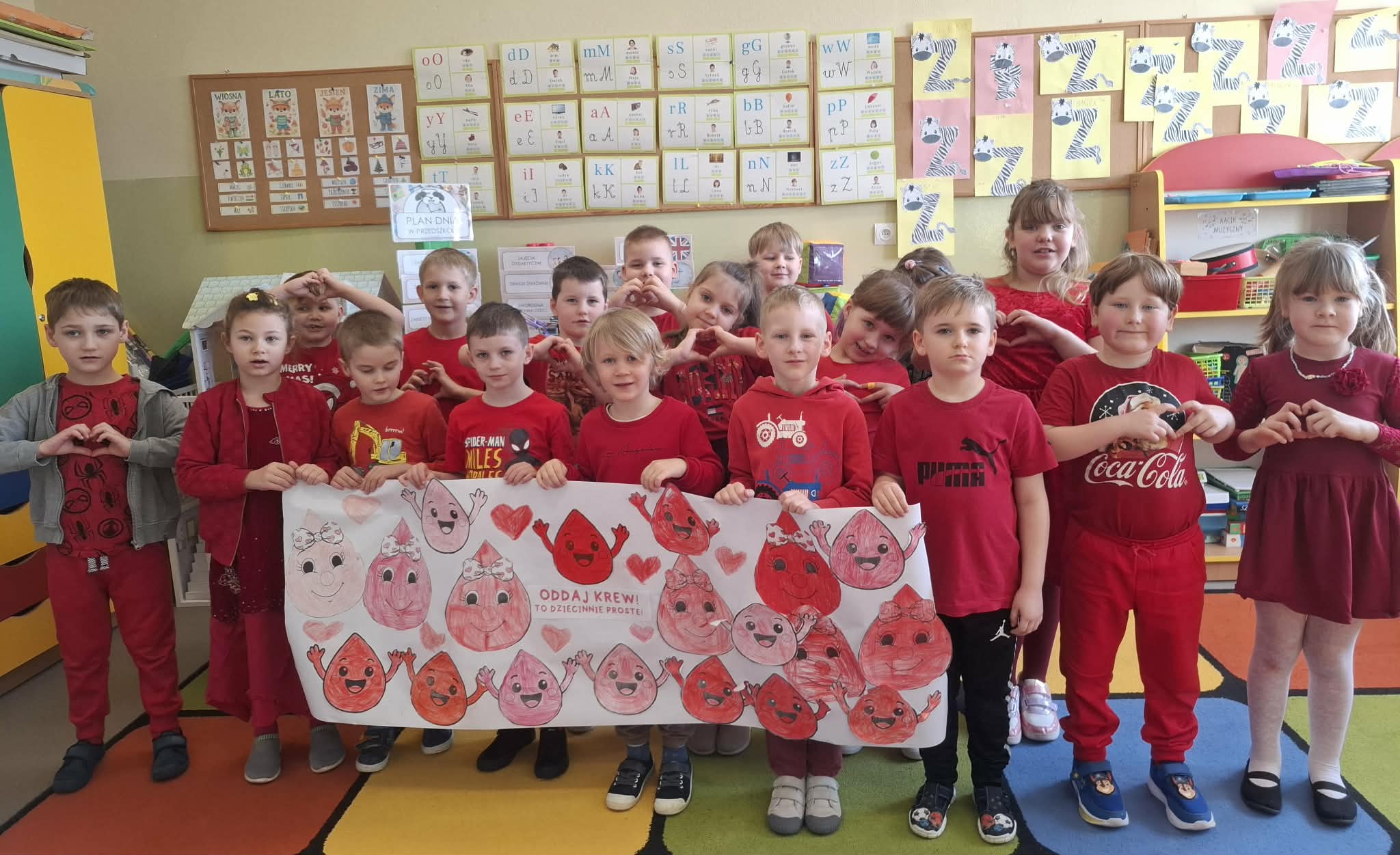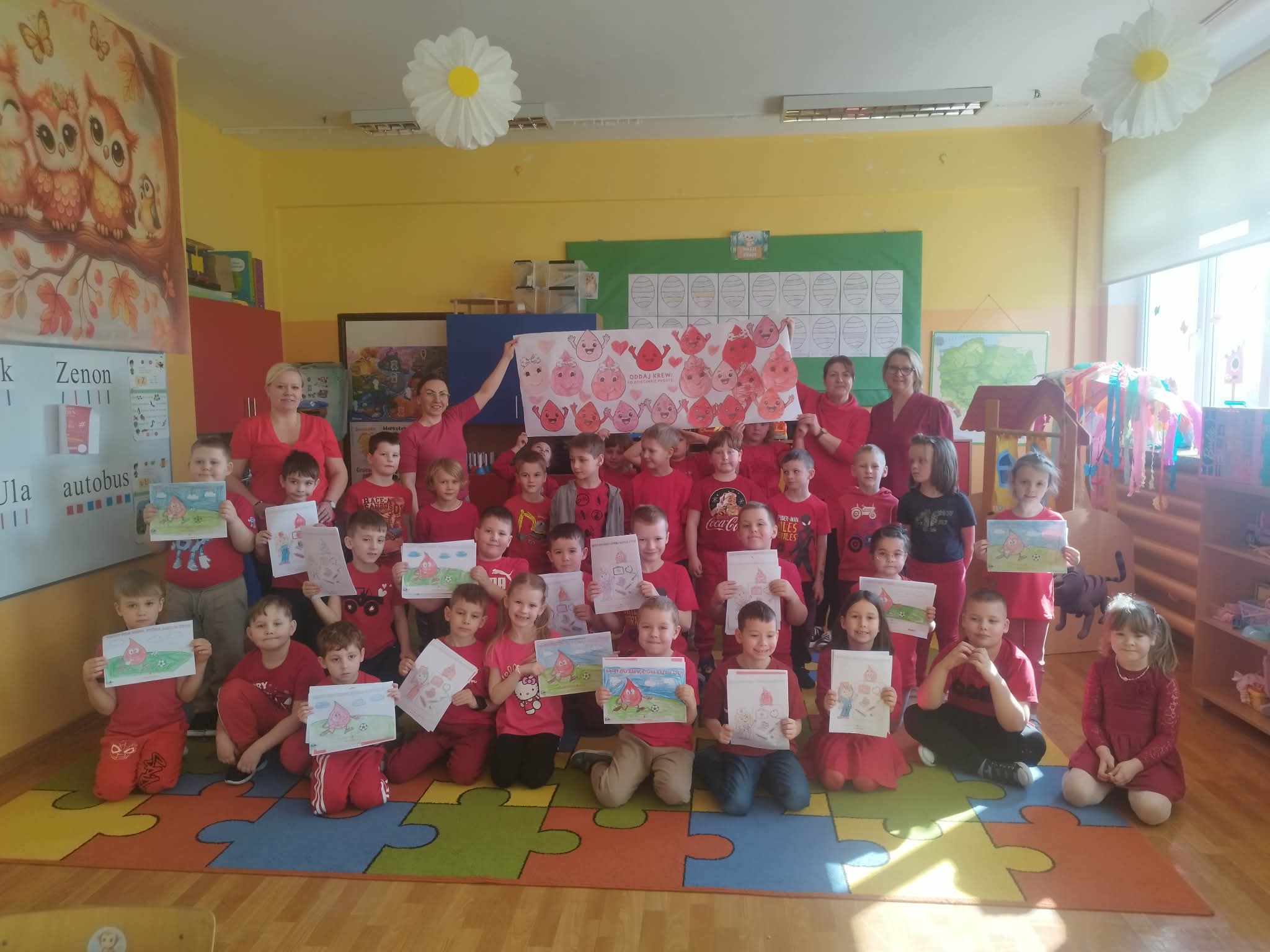 W dniu dzisiejszym dzieci z wszystkich grup w przedszkolu brały udział w akcji zorganizowanej przez Koło Gospodyń Wiejskich “Nasza Pasja” w Konarach – Czerwony tydzień. Jest to tydzień solidarności, serca i realnej pomocy. Przedszkolaki dowiedziały się czym jest krew, dlaczego jest tak potrzebna do życia i czemu możemy się nią dzielić. Dziękujemy wszystkim, którzy szerzą idee krwiodawstwa.