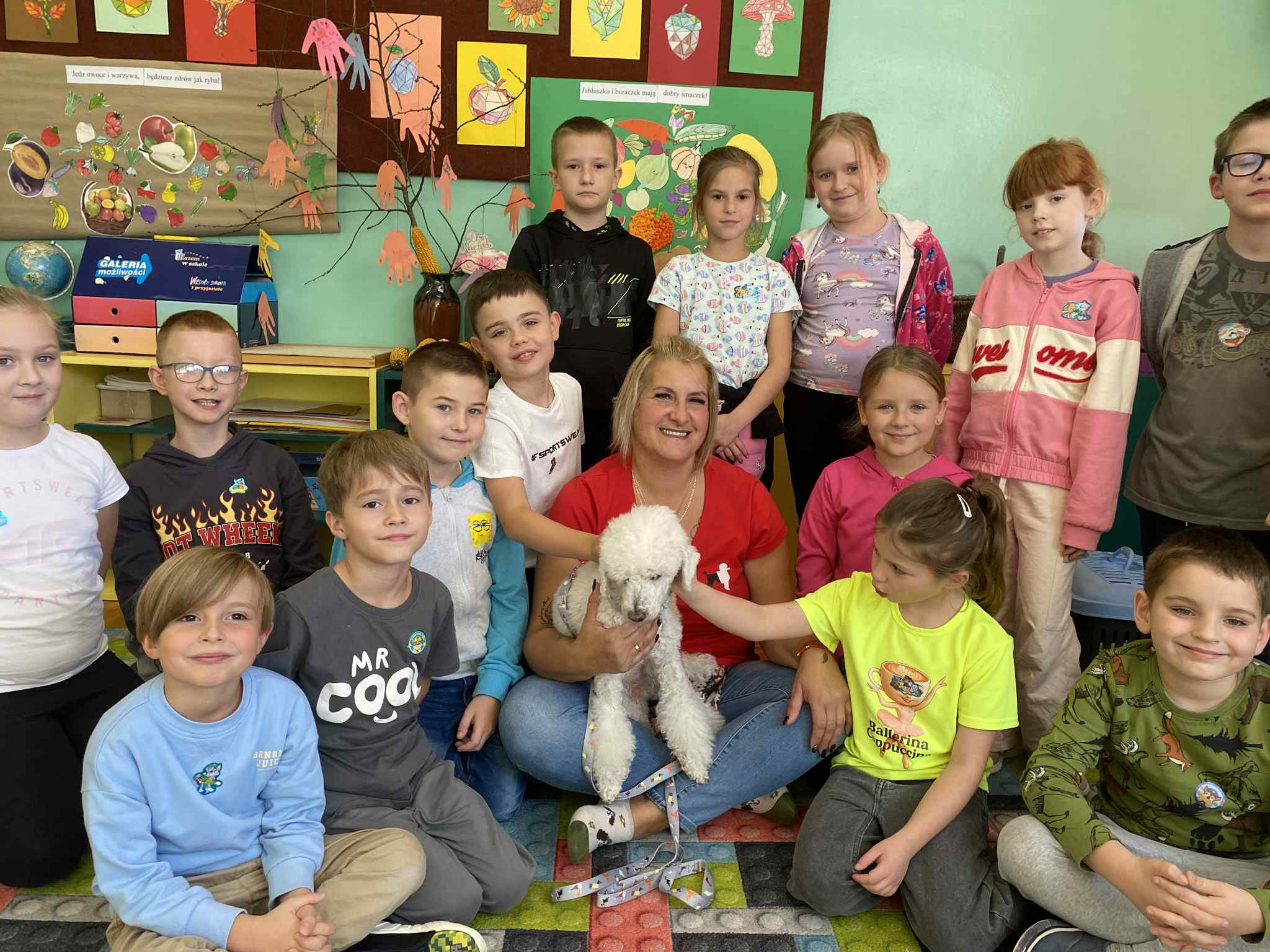 W poniedziałek, 20 października 2025r., mieliśmy przyjemność gościć po raz pierwszy w naszej szkole i klasie p. Anetę Domżał, która prowadzi zajęcia z dogoterapii. W związku z tym, że październik jest Miesiącem Dobroci dla Zwierząt i w tym czasie organizowane są wydarzenia, które dążą do zwrócenia uwagi na sytuację zwierząt. Uczniowie kl 2c mieli okazję wypowiedzieć się na temat swoich czworonożnych pupili. Rozmawiali o tym, jak być dobry opiekunem. Uczniowie poznali psa Żakusia, agamę Boldka, żółwia Alfreda i ślimaki afrykańskie.