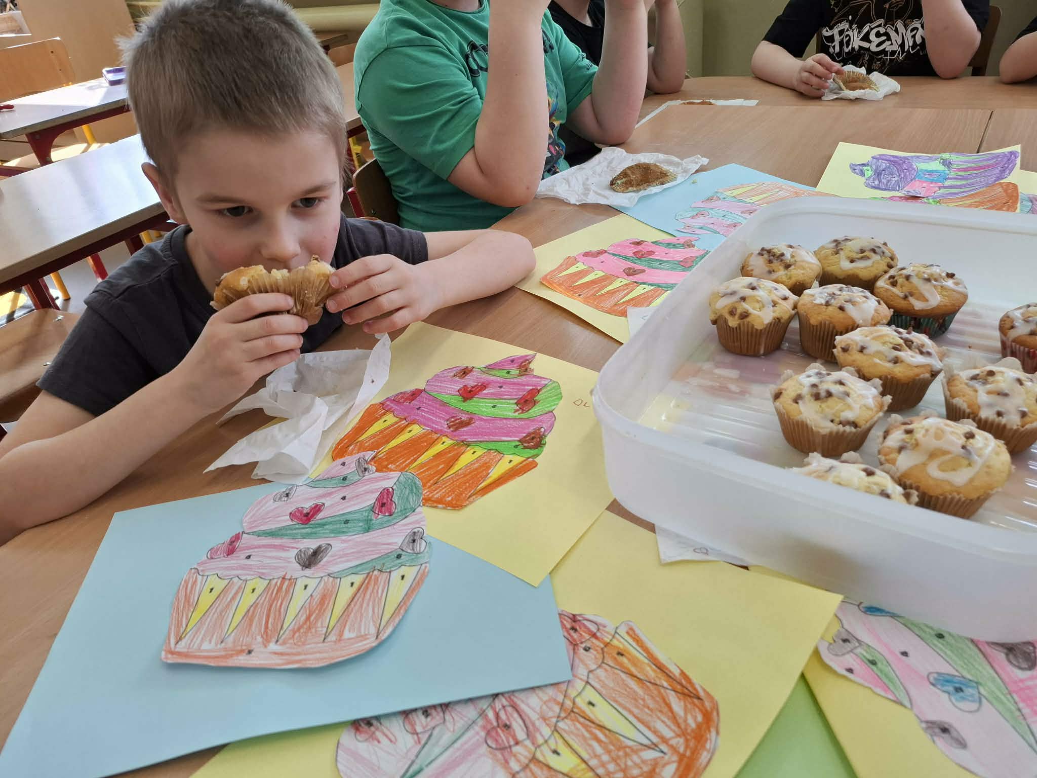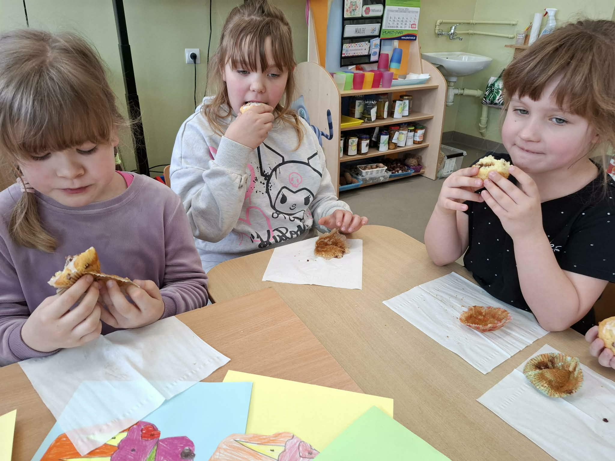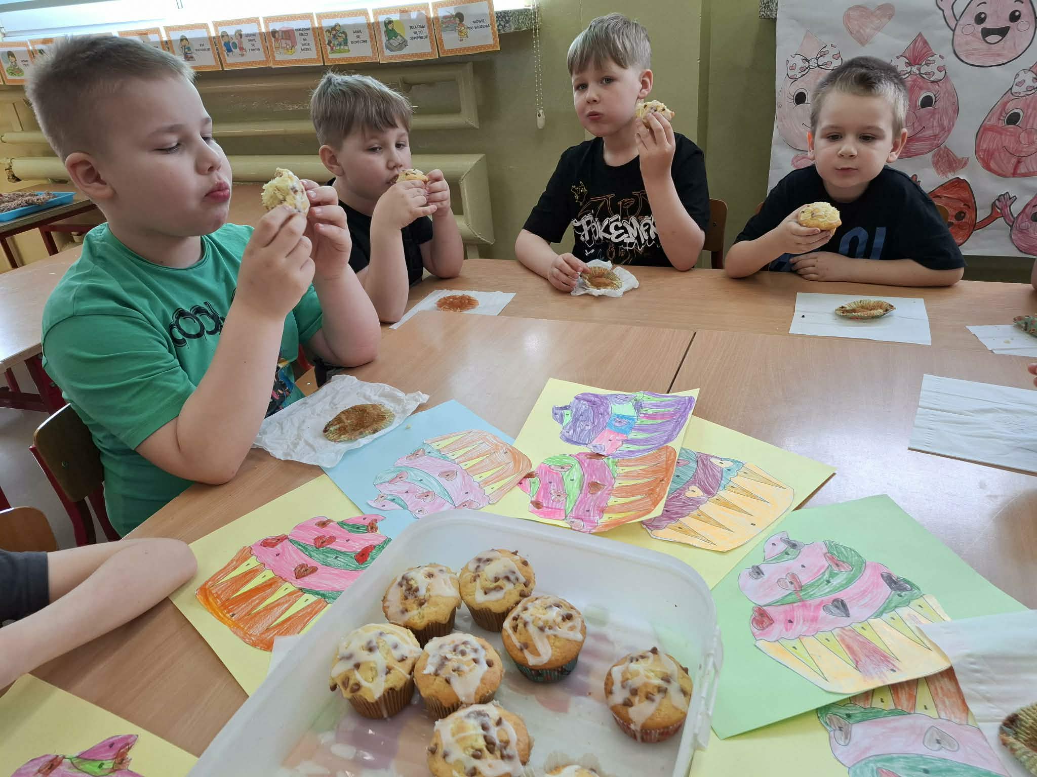 Co roku 30 marca obchodzony jest Światowy Dzień Muffinka. To nieformalne święto popularnych słodkich (lub wytrawnych) babeczek, które wywodzą się z Anglii z przełomu X i XI wieku. Dzisiejsze święto stało się idealną okazją do wykonania pracy plastycznej oraz zasmakowania rozpływających się w ustach muffinek. Pięknie pachnącą i smaczną babeczkę każdy zajadał z uśmiechem na twarzy. Dziękujemy mamie Olka R. za pyszne i zdrowe babeczki.