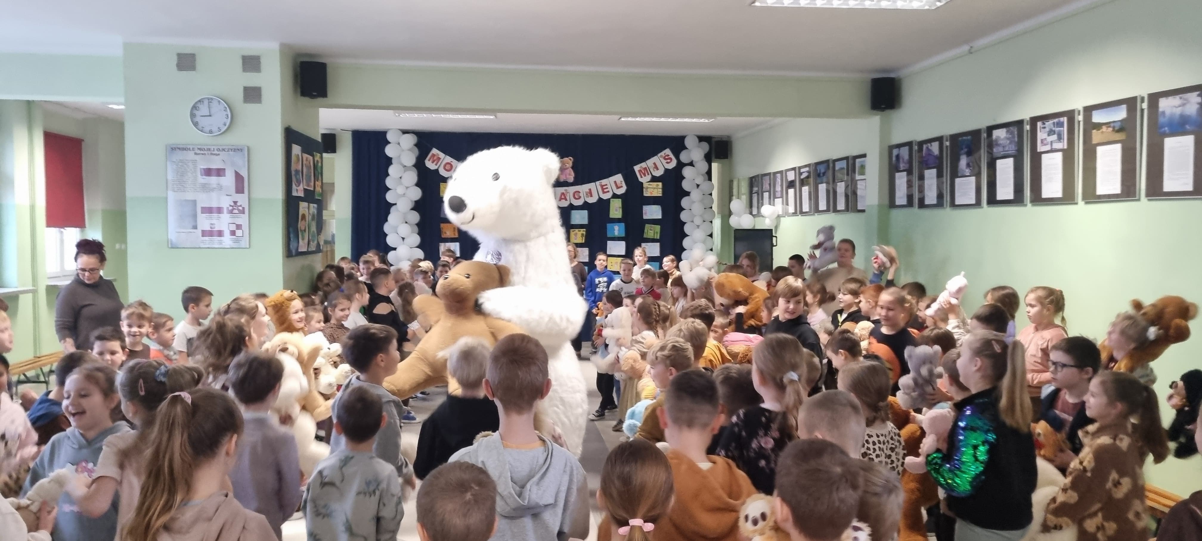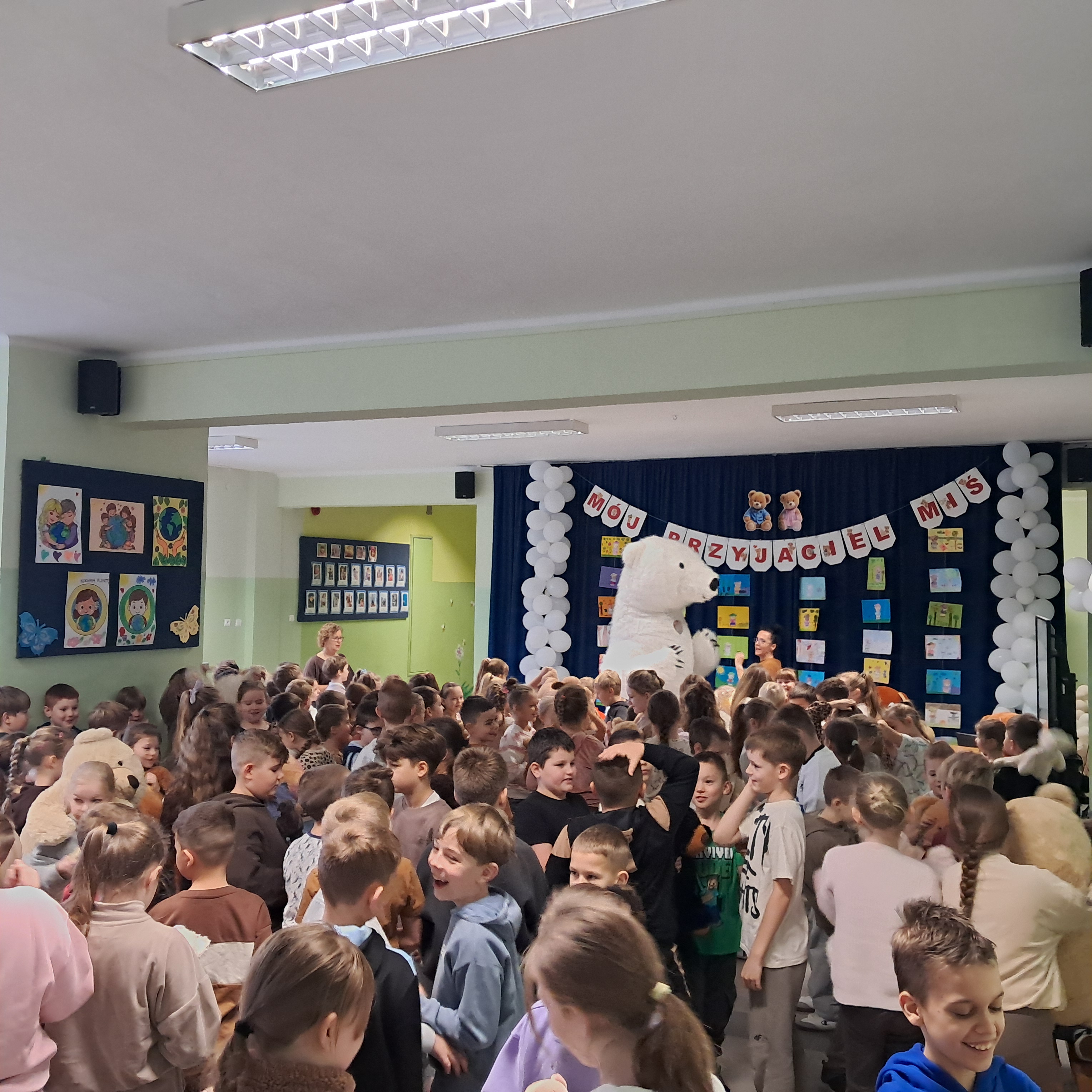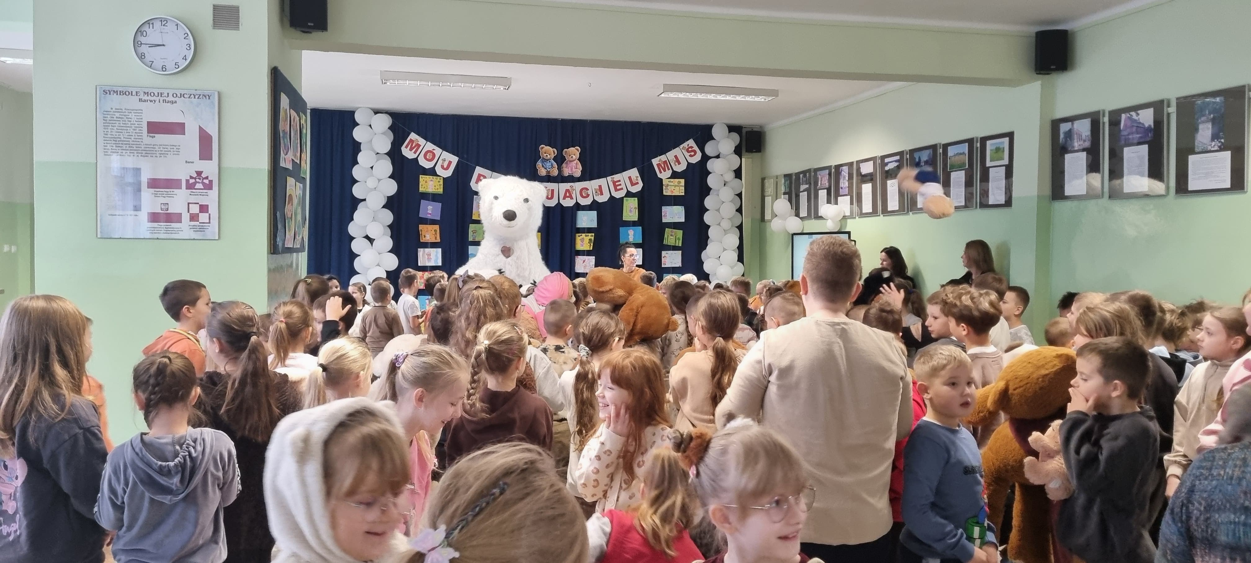 Dziś w naszej szkole było naprawdę misiowo! Obchodziliśmy Dzień Pluszowego Misia i odwiedził nas wyjątkowy gość — Miś z Alei Marzeń. Machając łapką i przytulając uczniów klas 1–3, zapraszał do wspólnej zabawy i radosnego świętowania. Przybijał uczniom „piątki”, pozował do zdjęć i siał radość wszędzie tam, gdzie się pojawił.W rytmie wesołej misiowej muzyki uczniowie tańczyli, tworzyli kolorowy korowód prowadzony przez Misia, a ich pluszaki dumnie maszerowały razem z nimi. Każde dziecko otrzymało też słodki upominek — pyszne ciasteczko Lubisia, które dodało energii do dalszego misiowania.