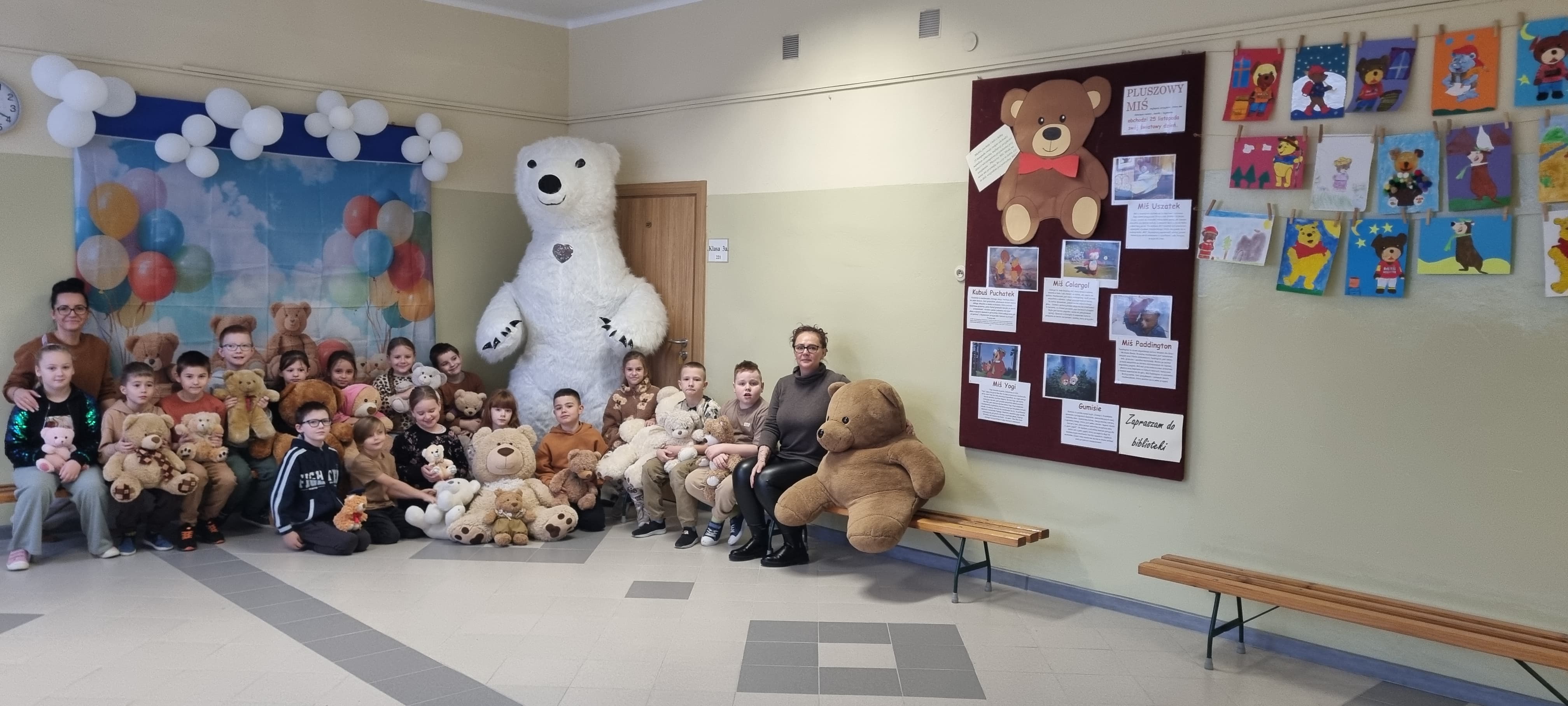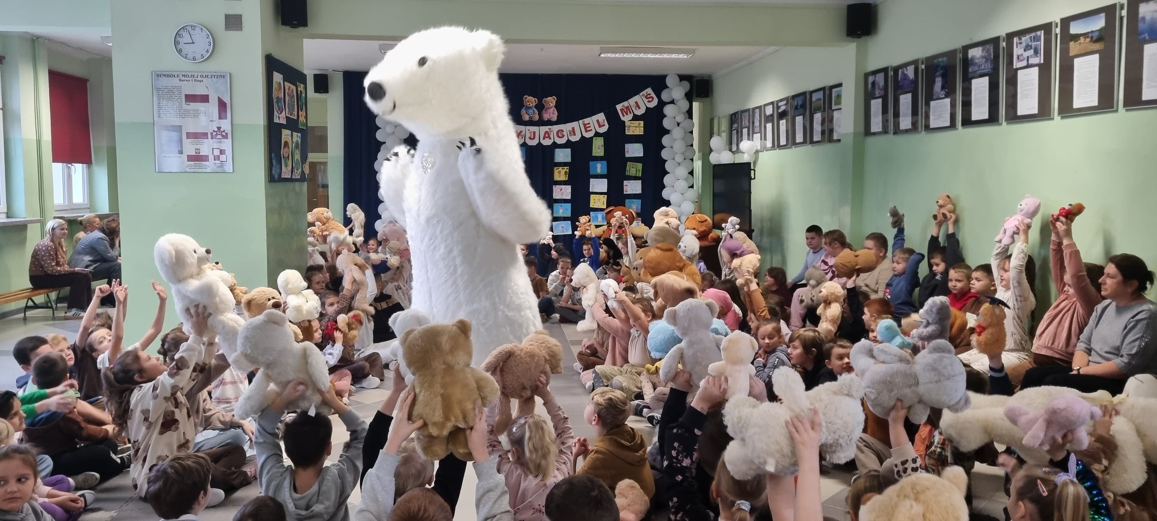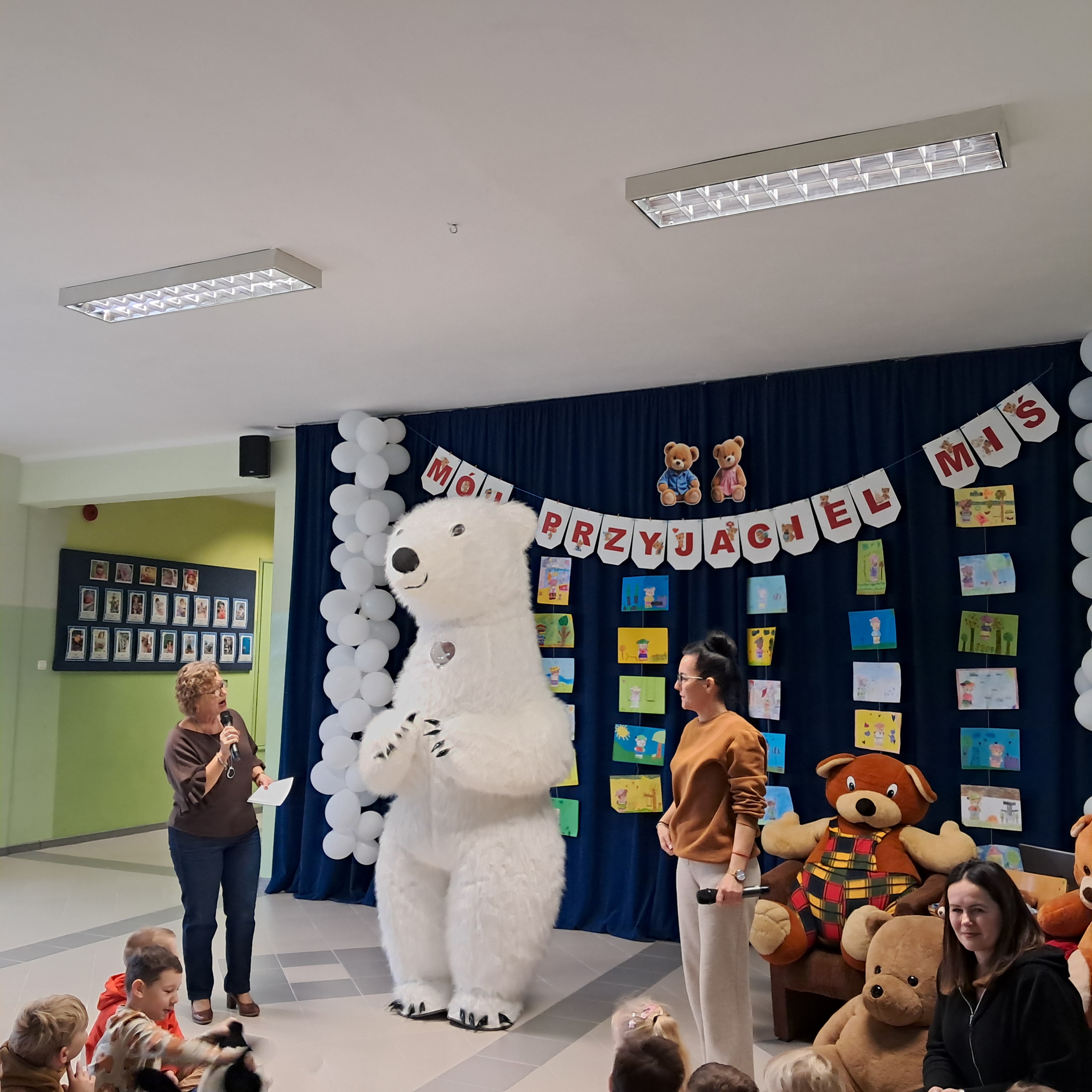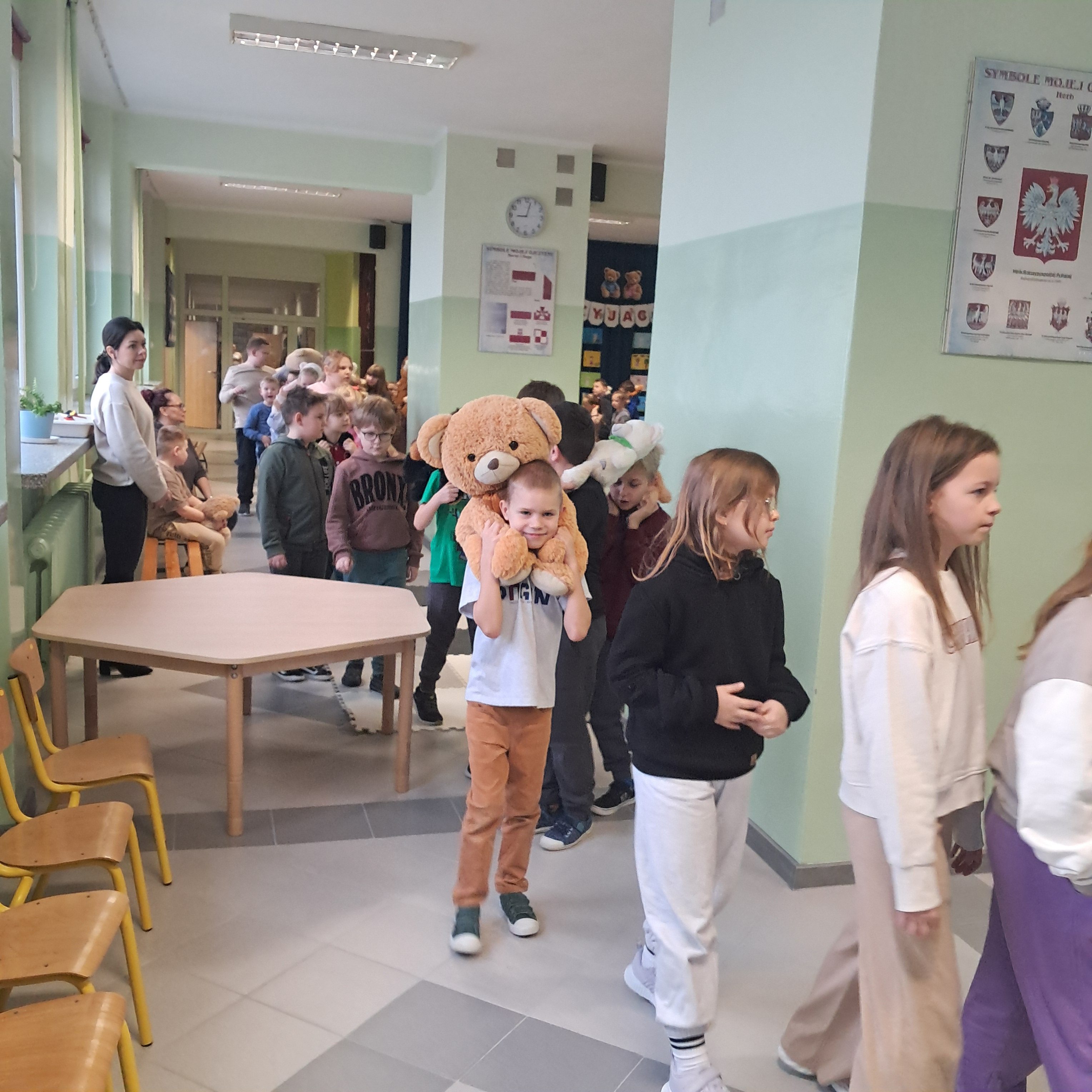 Dziś w naszej szkole było naprawdę misiowo! Obchodziliśmy Dzień Pluszowego Misia i odwiedził nas wyjątkowy gość — Miś z Alei Marzeń. Machając łapką i przytulając uczniów klas 1–3, zapraszał do wspólnej zabawy i radosnego świętowania. Przybijał uczniom „piątki”, pozował do zdjęć i siał radość wszędzie tam, gdzie się pojawił.W rytmie wesołej misiowej muzyki uczniowie tańczyli, tworzyli kolorowy korowód prowadzony przez Misia, a ich pluszaki dumnie maszerowały razem z nimi. Każde dziecko otrzymało też słodki upominek — pyszne ciasteczko Lubisia, które dodało energii do dalszego misiowania.