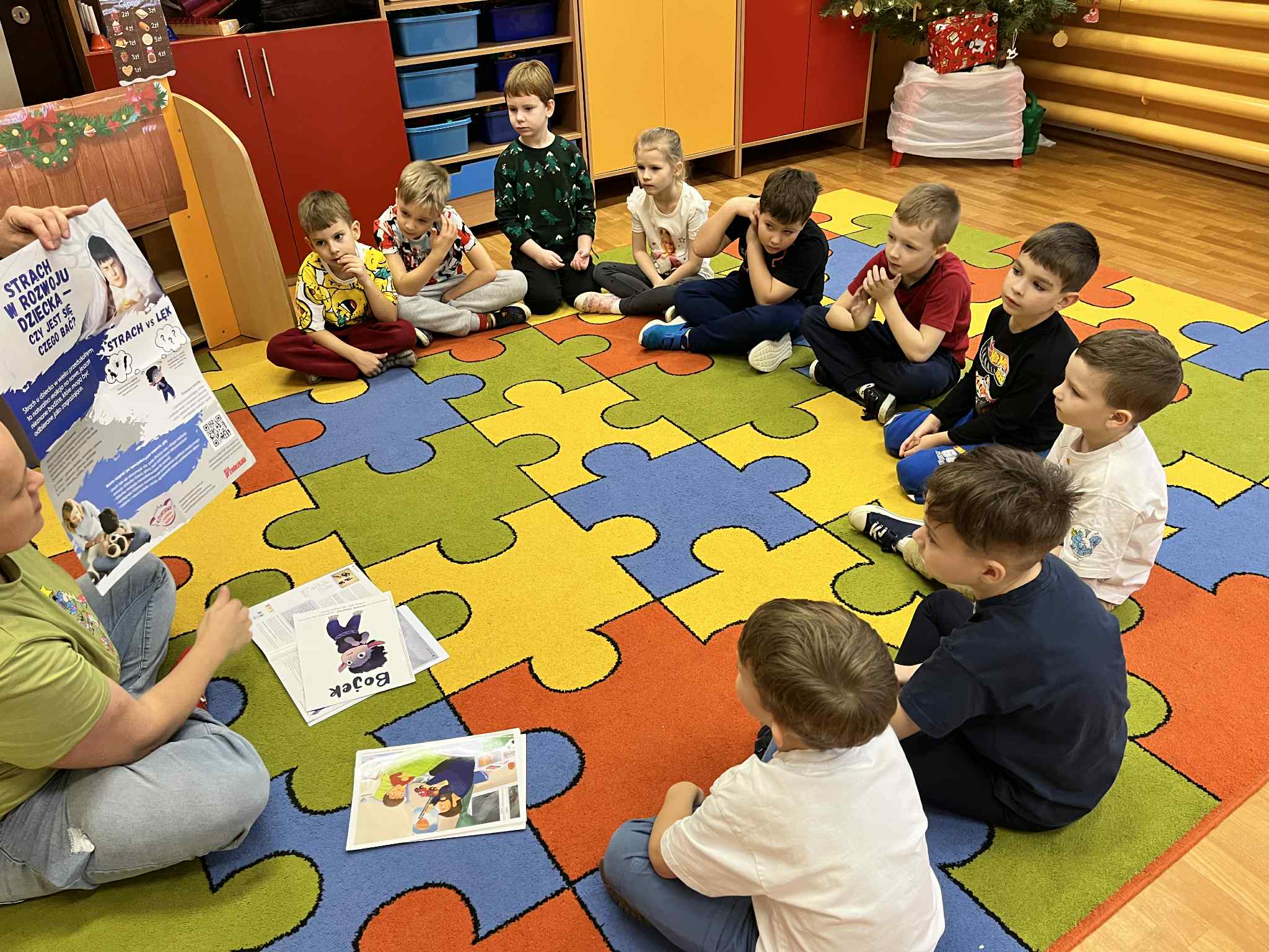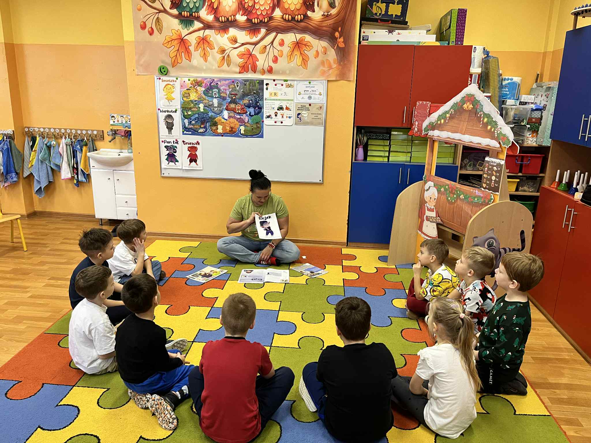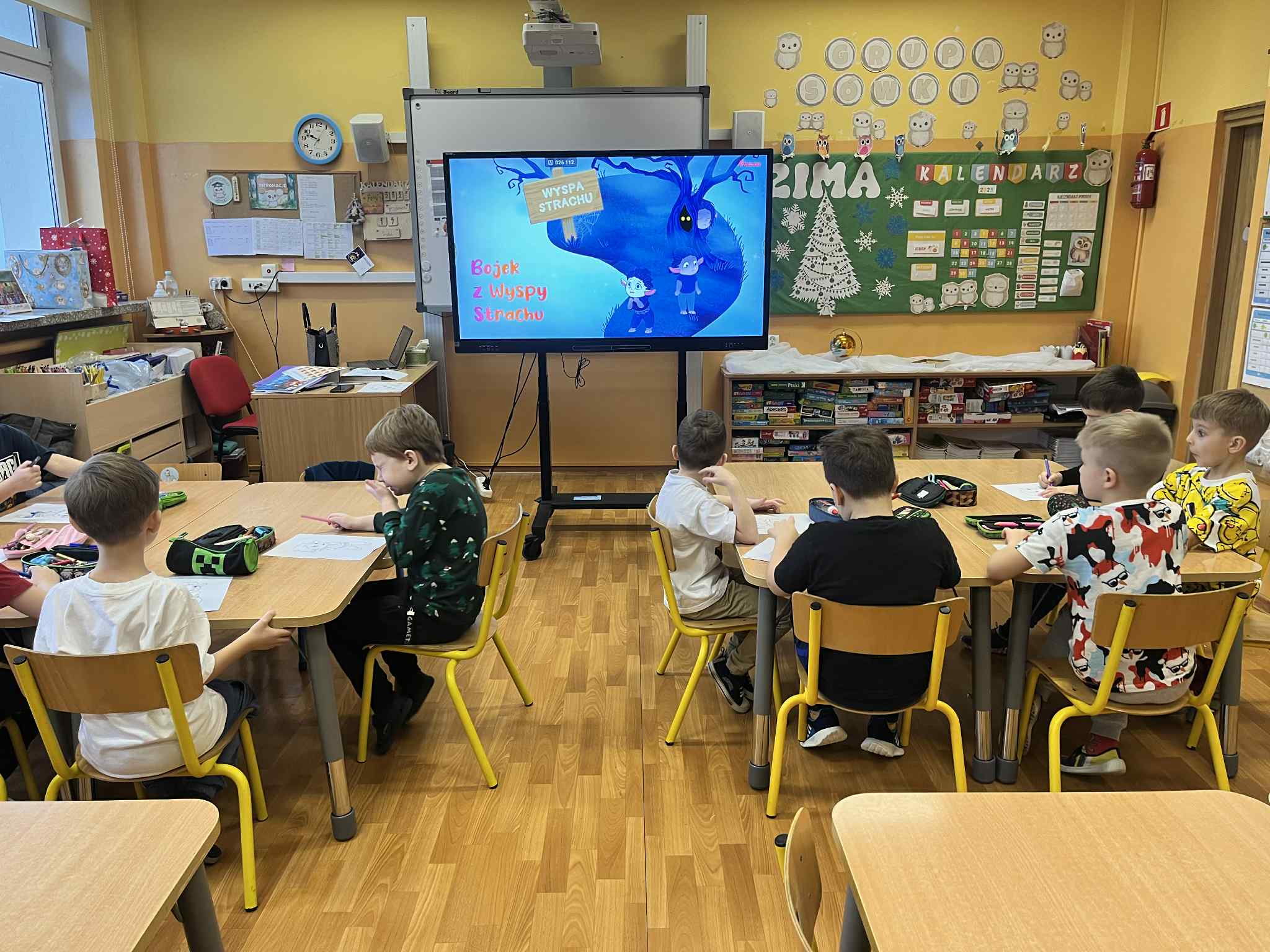 W grudniu dzieci z grupy Sówek podjęły kolejne zadanie z projektu „Czuciaki w krainie emocji”. Tym razem poznały Bojka z Wyspy Strachu, który uczył dzieci oswajać strach i radzić sobie z lękiem. Podczas zajęć przedszkolaki wysłuchały opowiadania o Jasiu, który bał się ciemności. Za pomocą rysunku przedstawiły to, czego same się boją i mówiły jakie mają sposoby na strach. Zamieniły swoje strachy w śmieszne potworki, aby kojarzyły się im się z czymś zabawnym. Na zakończenie zajęć wszystkie dzieci pokolorowały Bojka i uzupełniły „książeczki emocjonalne”. Bojek natomiast wrócił na swoją wyspę.  Podczas zajęć dzieci  nauczyły się, że strach nie jest czymś złym ani wstydliwym. To sygnał, który warto zauważyć, nazwać i oswoić – w bezpiecznej, spokojnej przestrzeni, z uważnym dorosłym obok. „Czuciaki z Wyspy Emocji” pokazują dzieciom, że każda emocja jest ważna, a kiedy ją poznają, przestaje być taka straszna.