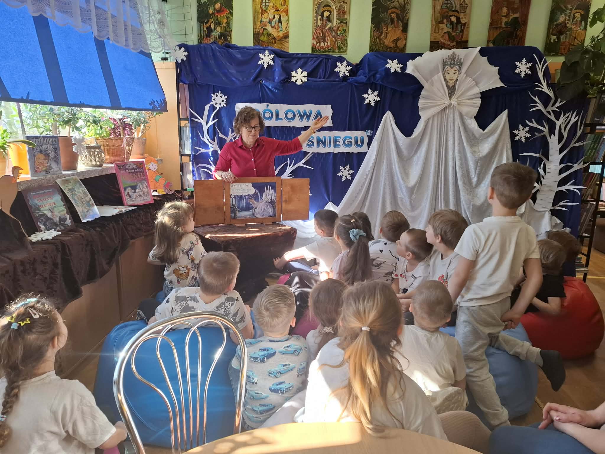 Dziś w bibliotece szkolnej odbyło się przedstawienie teatru kamishibai pt. „Królowa Śniegu”. Dzieci z