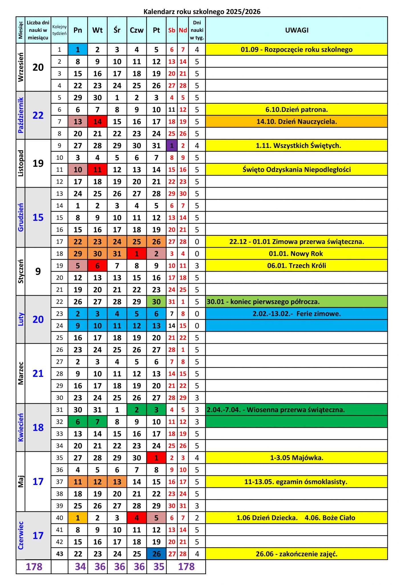 Przedstawiamy kalendarz roku szkolnego, w którym znajdziecie wszystkie najważniejsze informacje dotyczące organizacji roku szkolnego (dni wolne, wydarzenia uroczystości i święta)