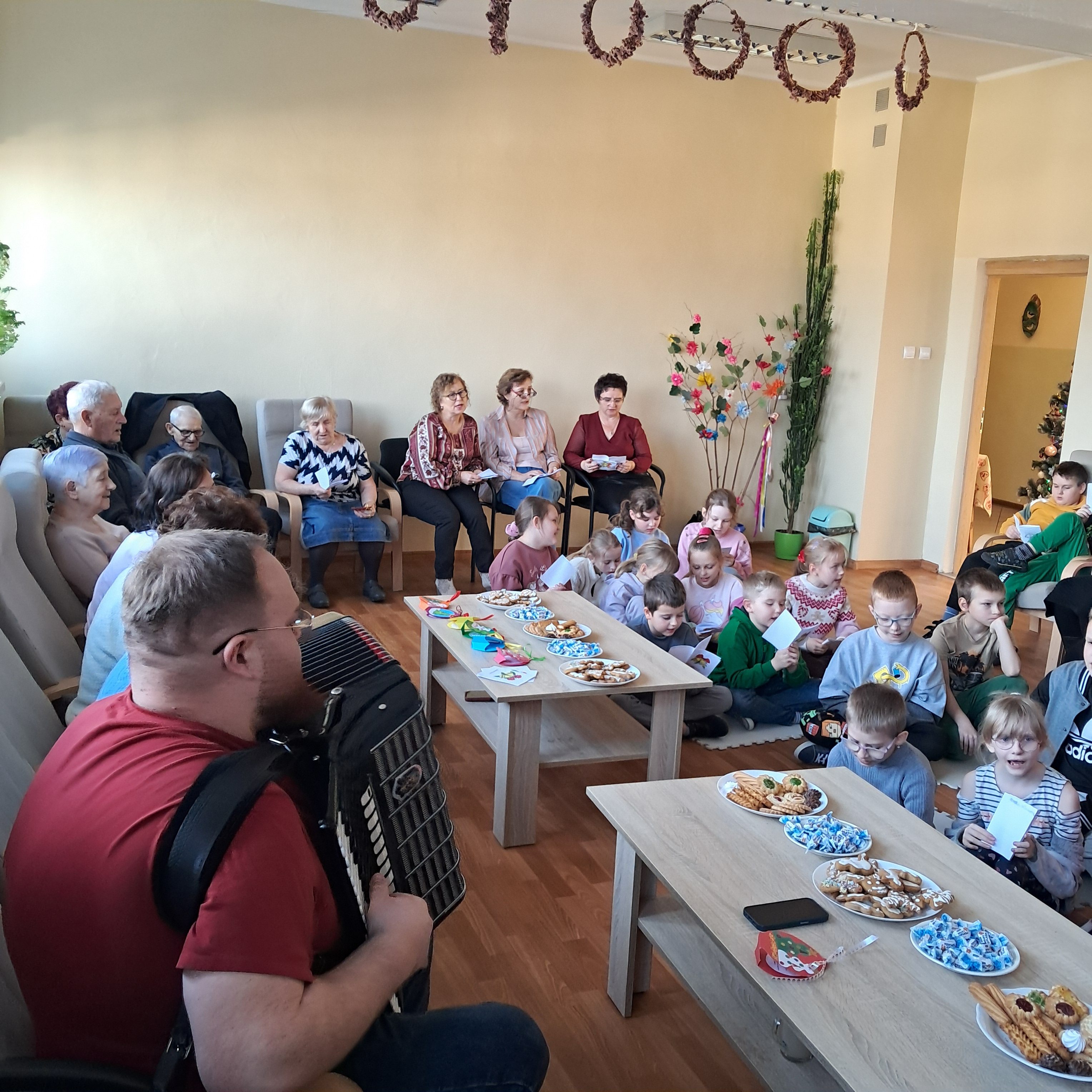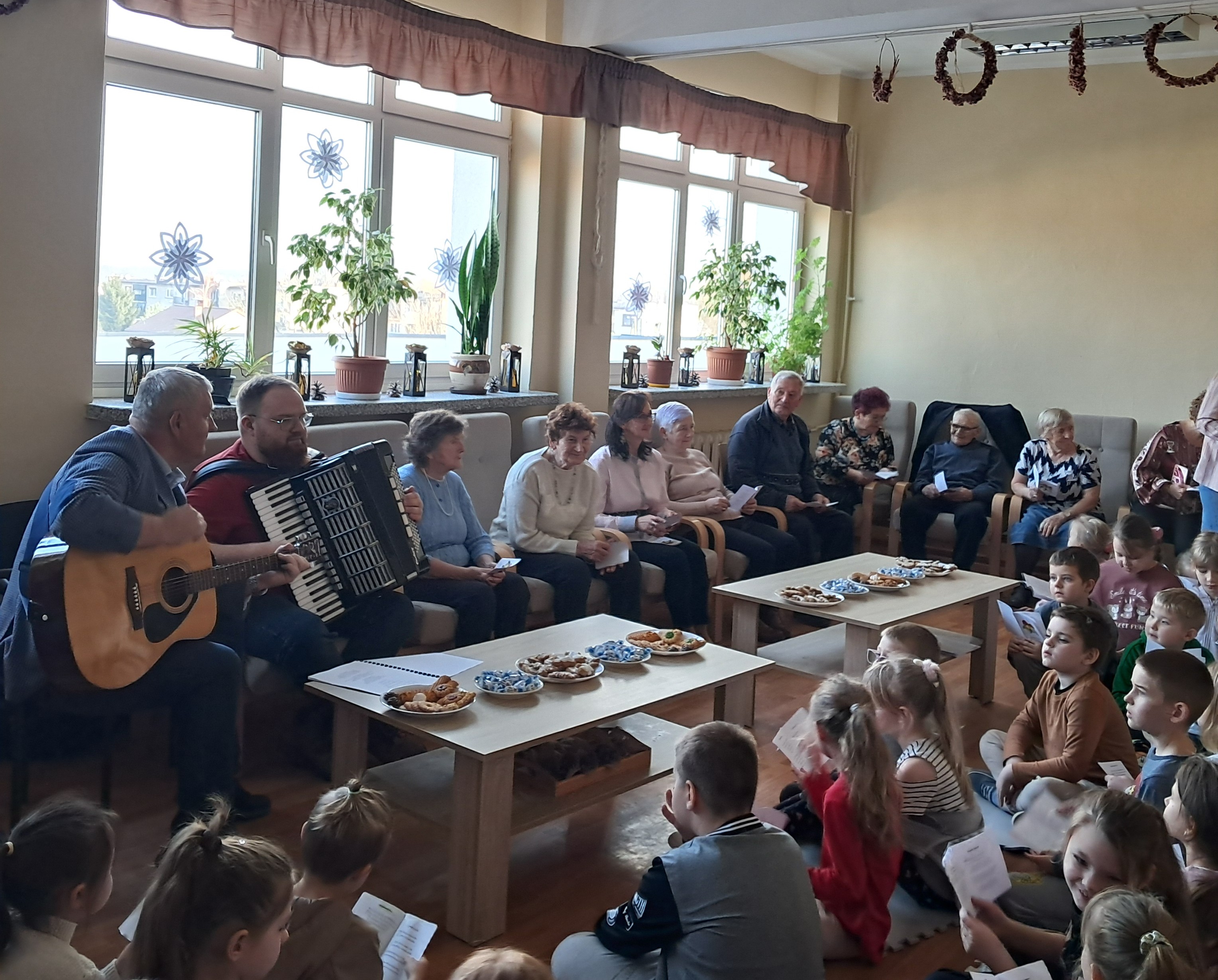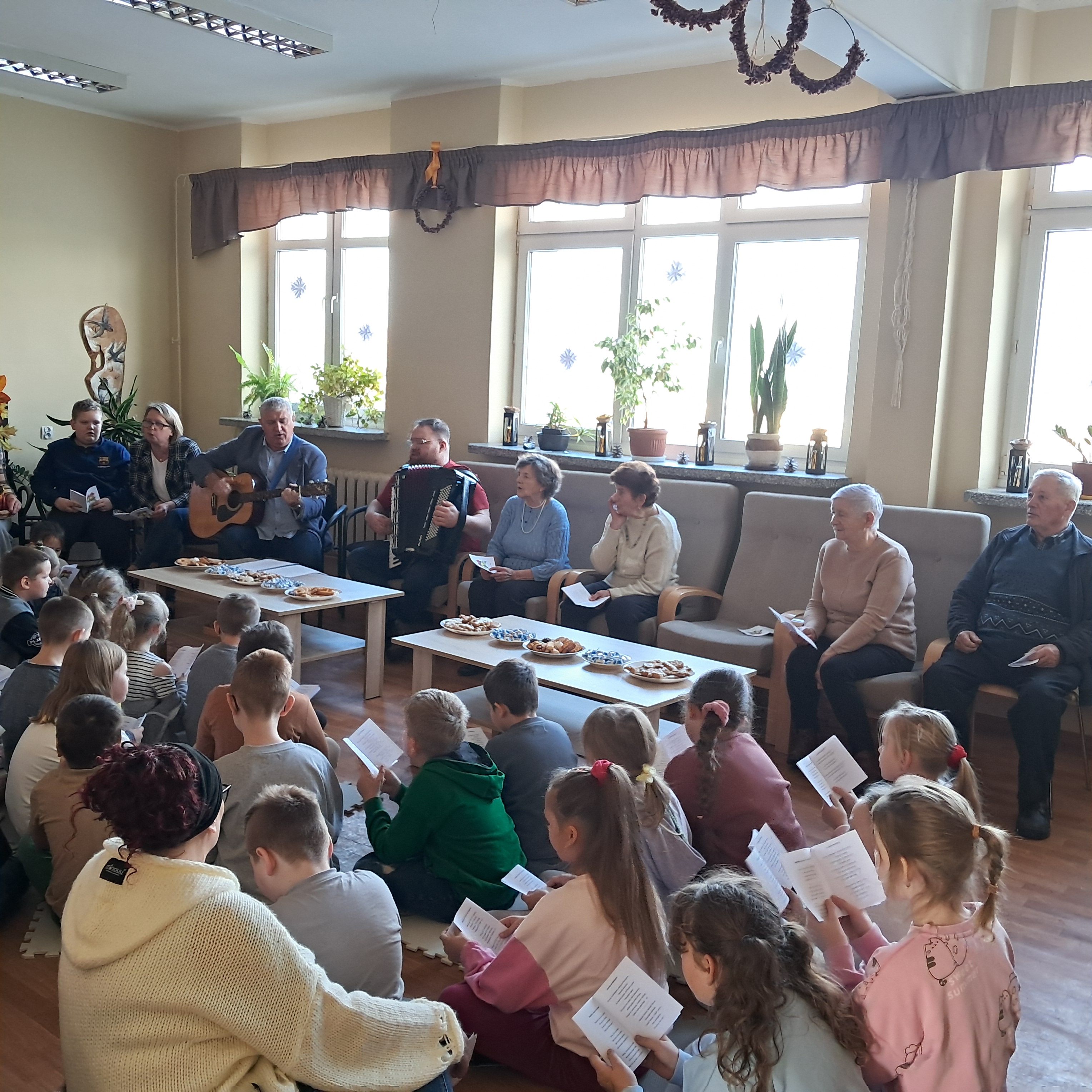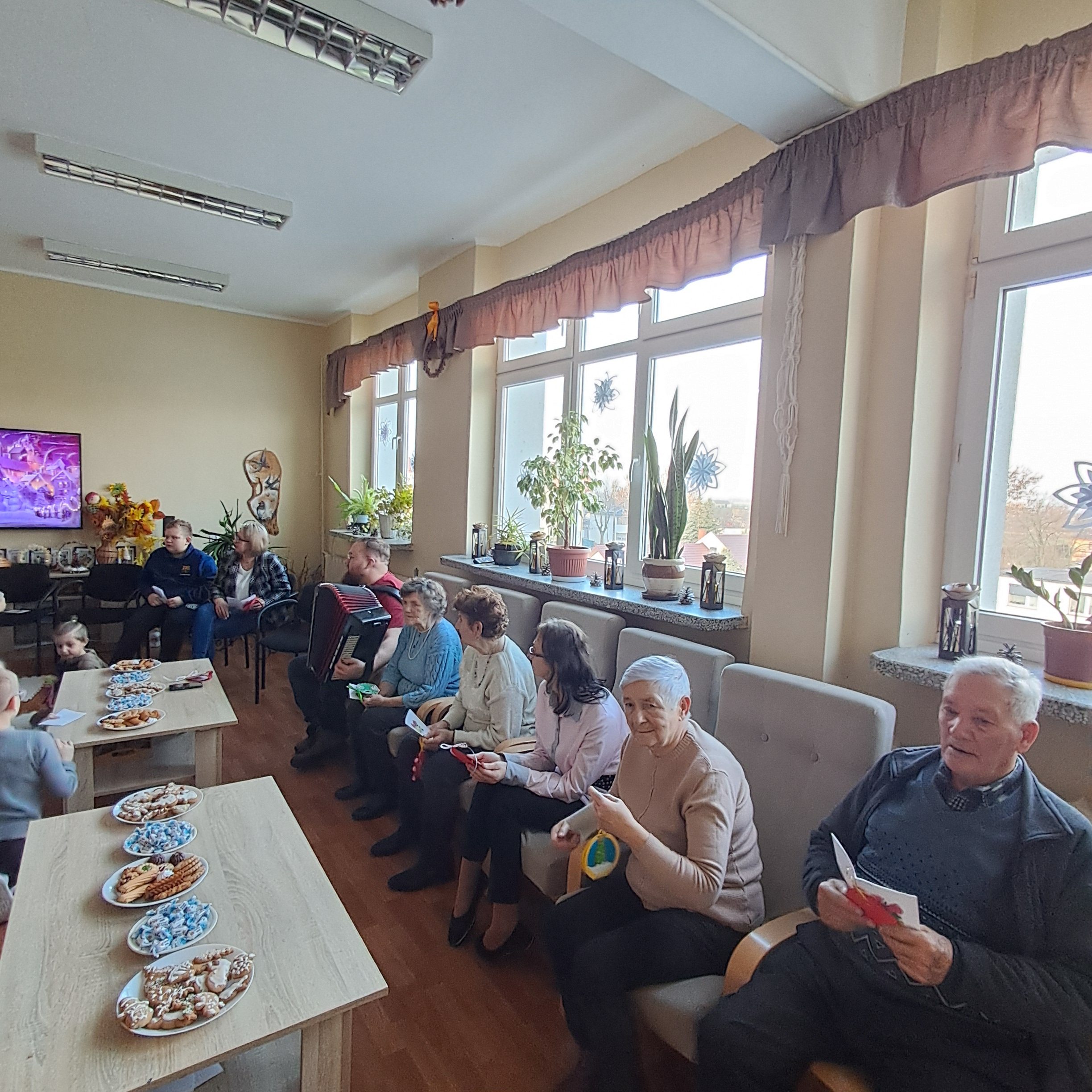 Seniorzy chętnie dzielili się wspomnieniami świąt z lat młodości, a młodsi uczestnicy z radością towarzyszyli im w śpiewie. Wspólne muzykowanie przyniosło wiele uśmiechu i stworzyło wyjątkowy, rodzinny nastrój, przypominając o tym, jak ważna jest obecność i bliskość drugiego człowieka.