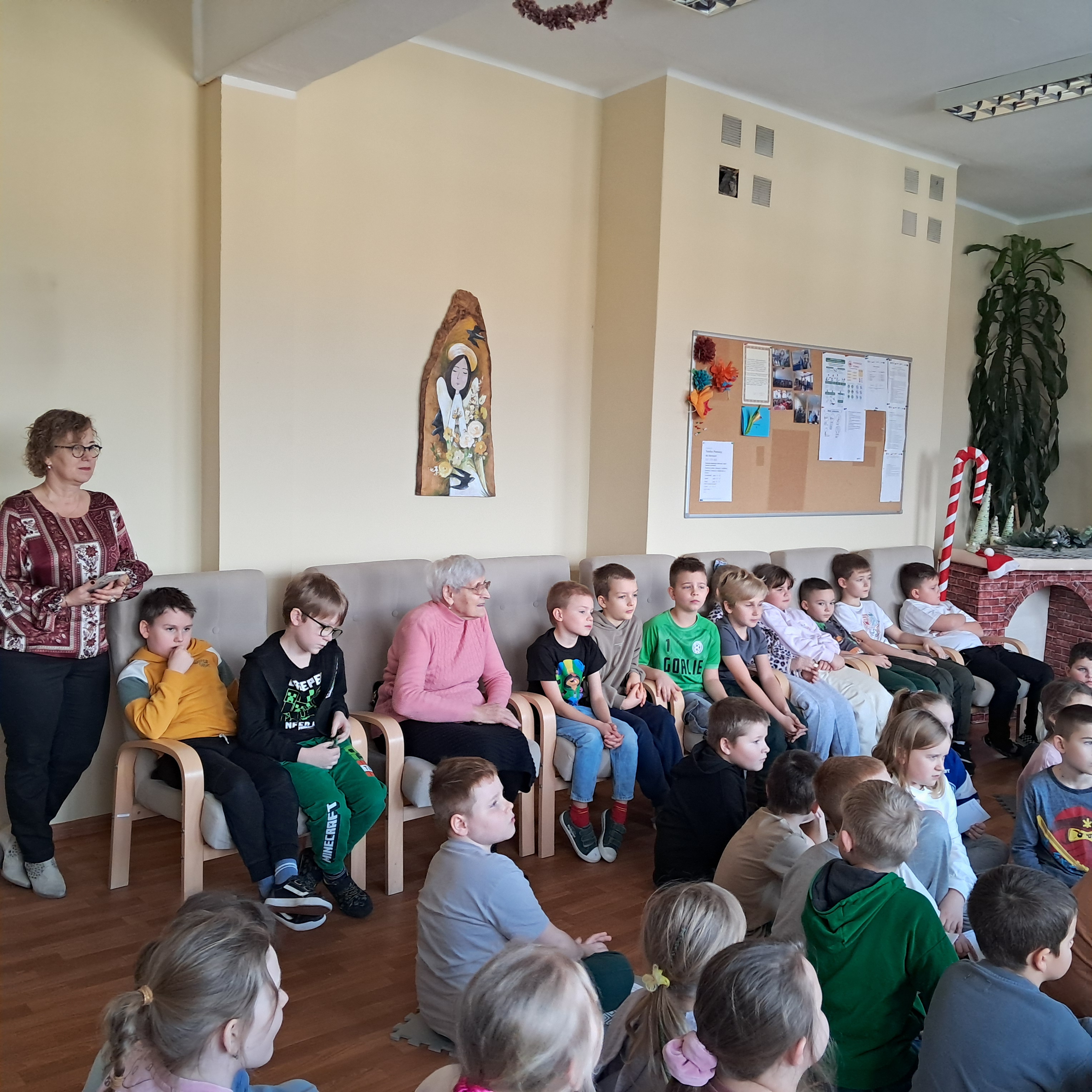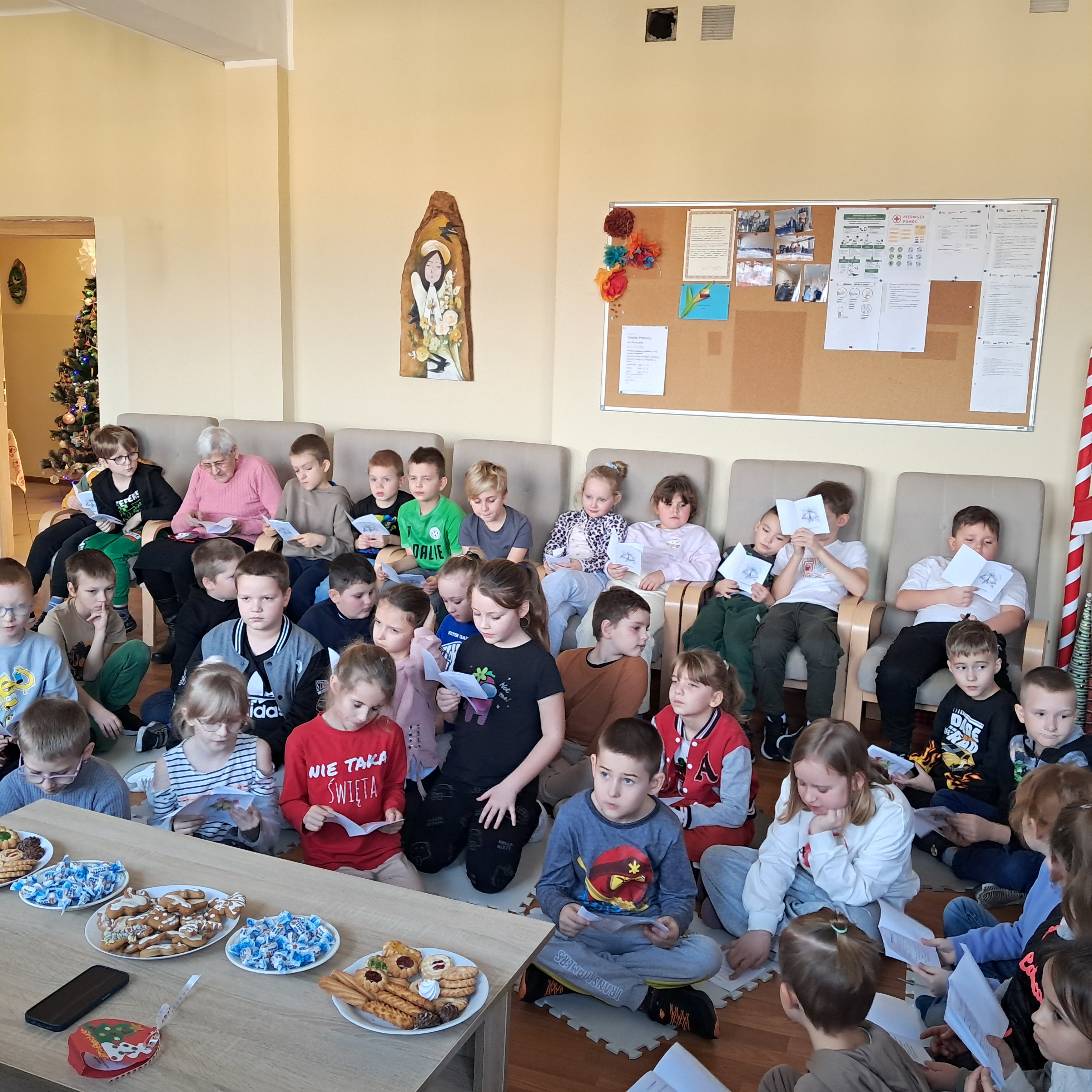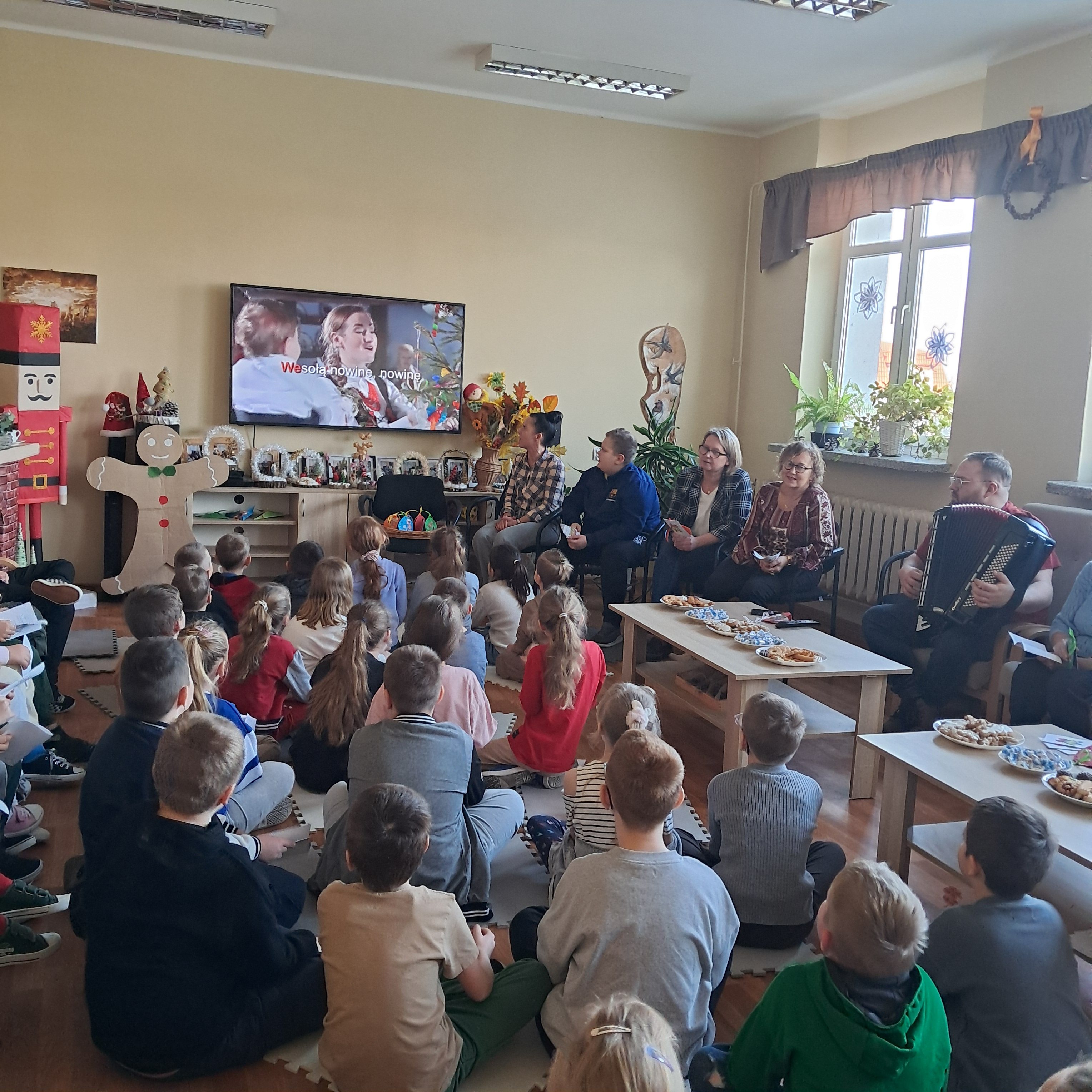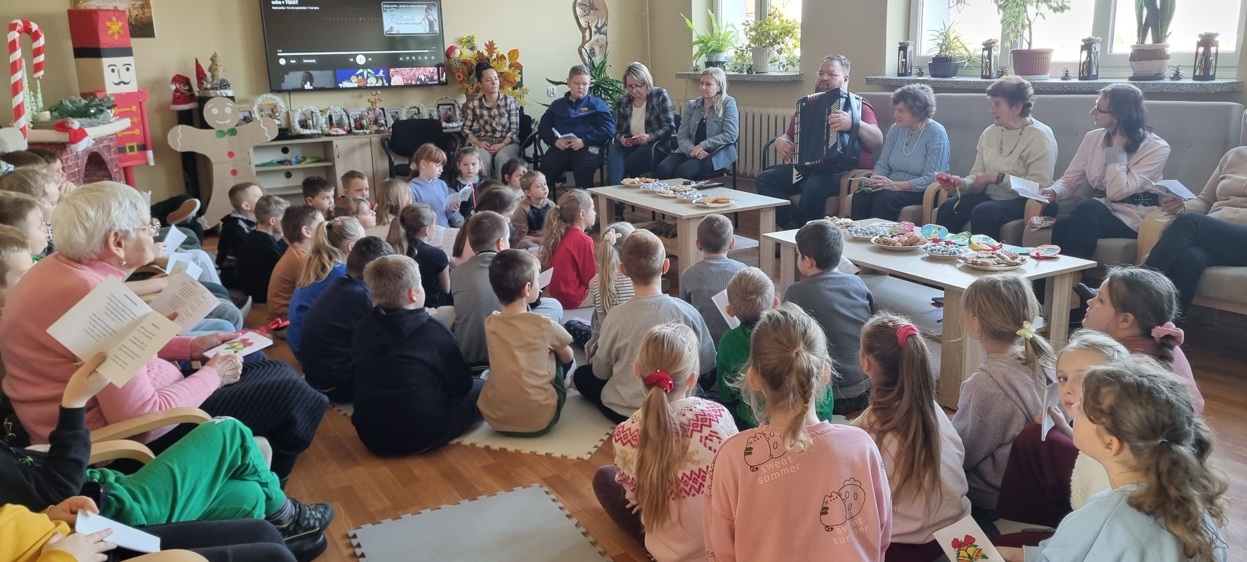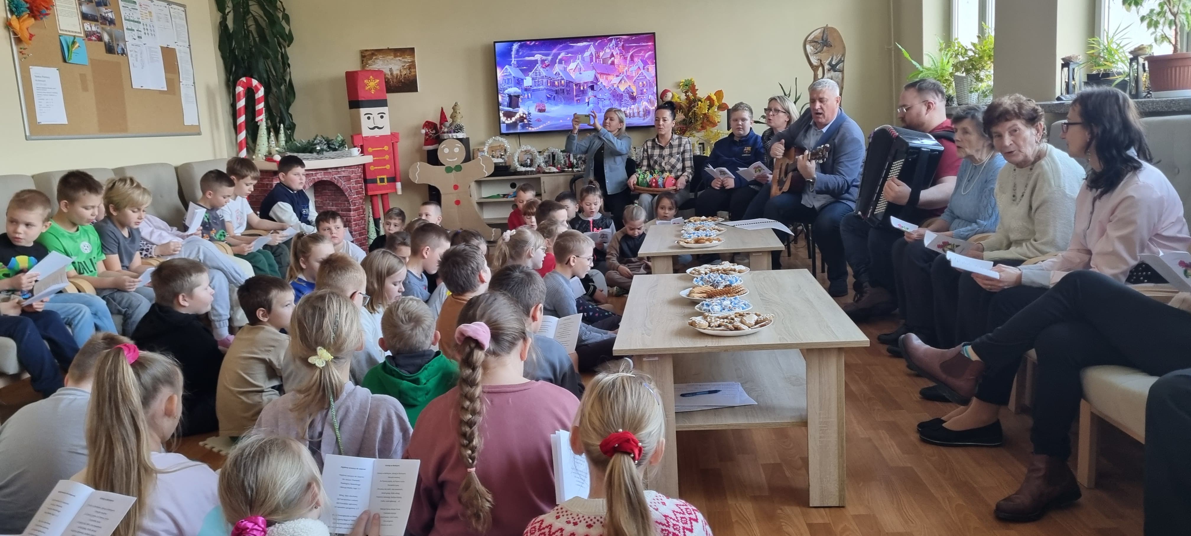 W ciepłej, rodzinnej atmosferze w środę 10 grudnia, odbyło się świąteczne spotkanie klas drugich z seniorami oraz Dyrekcją Szkoły. Wspólnie śpiewaliśmy najpiękniejsze polskie kolędy i pastorałki przy akompaniamencie instrumentów muzycznych. Pan Dyrektor Andrzej Polaszek zagrał na gitarze, a Pan Krzysztof Ulczycki na akordeonie. To niezwykłe spotkanie stało się okazją do rozmów, wzruszeń oraz budowania więzi między pokoleniami.