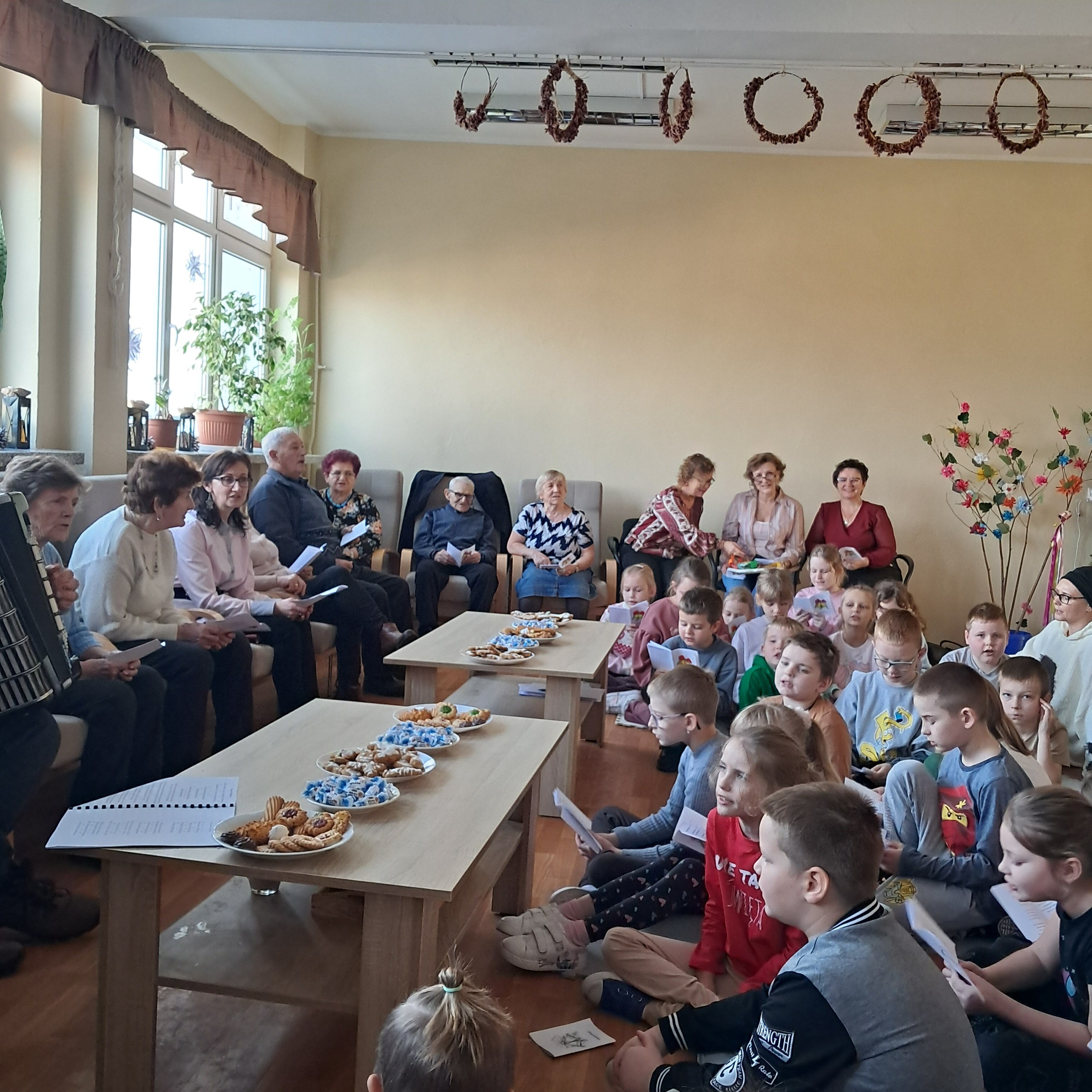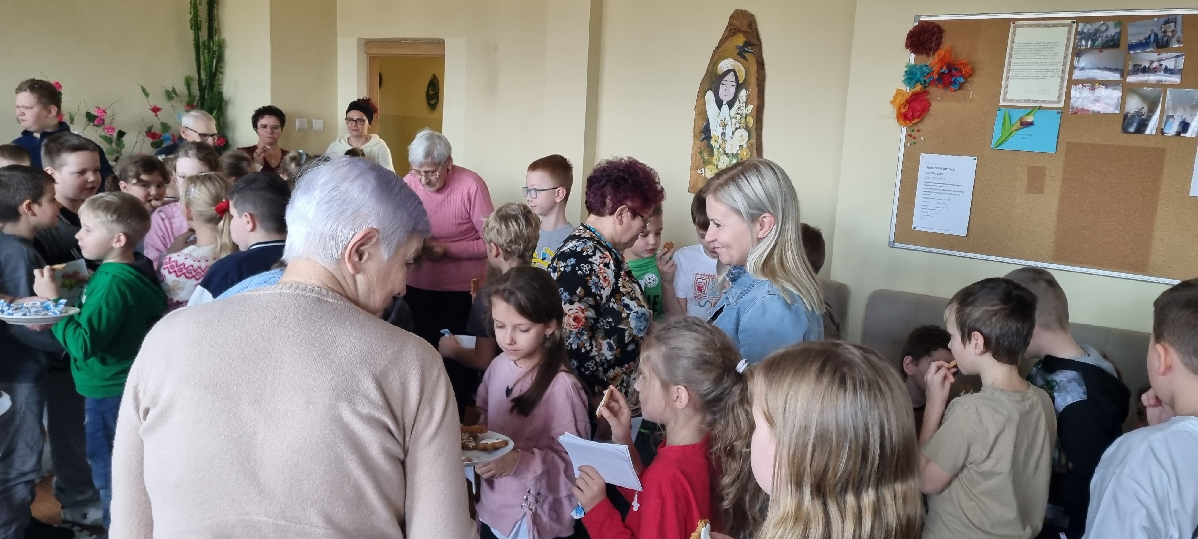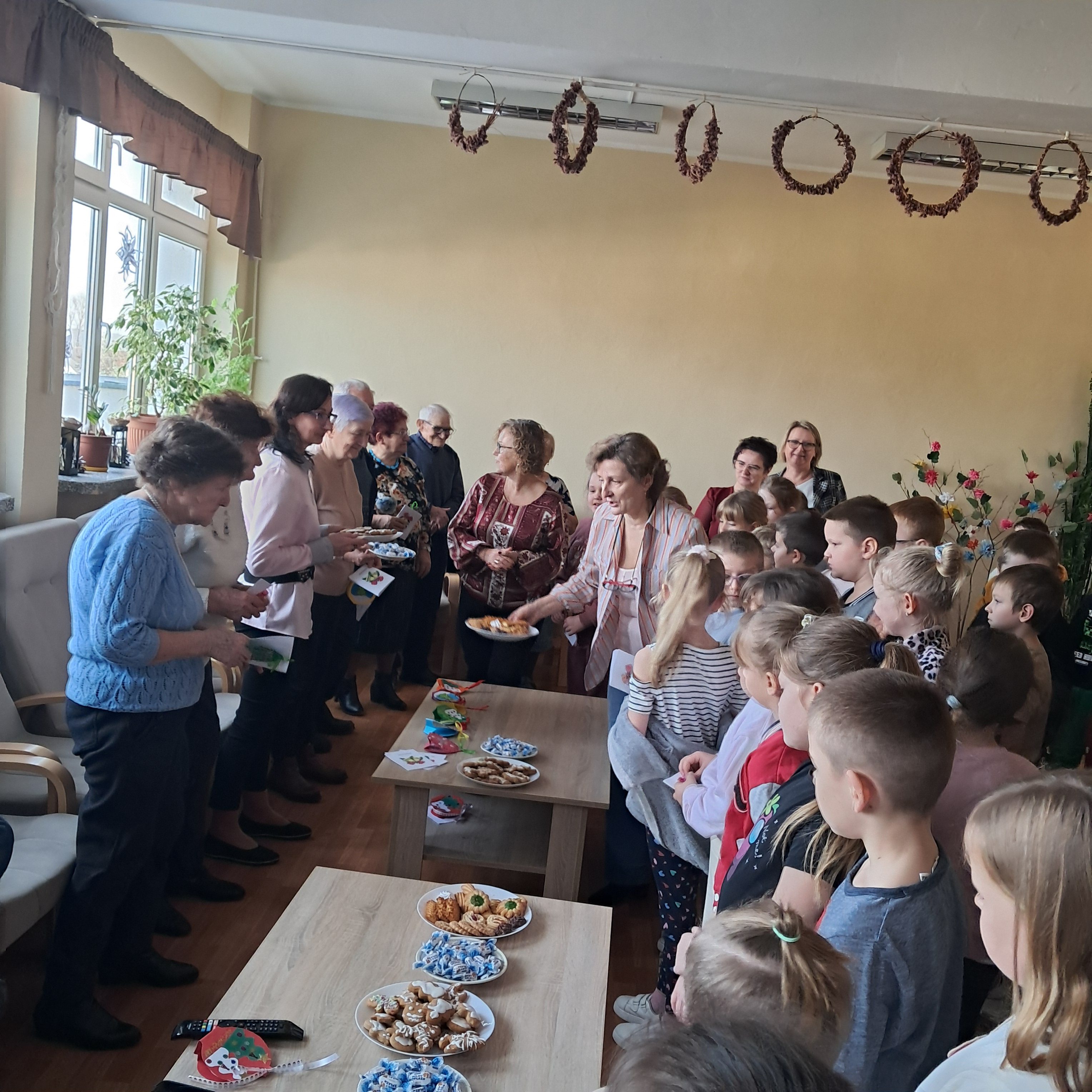 Spotkanie zakończyło się serdecznymi życzeniami, wręczeniem kartek wykonanych przez uczniów klas drugich oraz słodkim poczęstunkiem przygotowanym przez Seniorów. Był to czas pełen dobra, wdzięczności i pięknych chwil, które na długo pozostaną w pamięci uczestników.