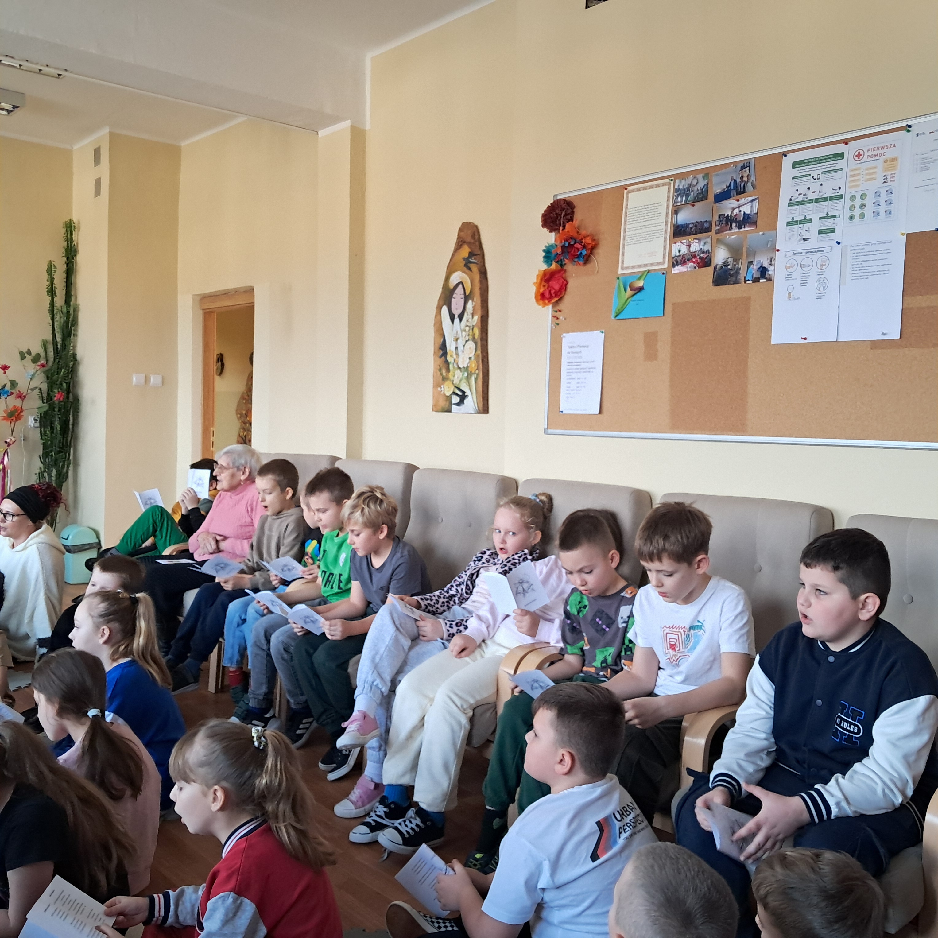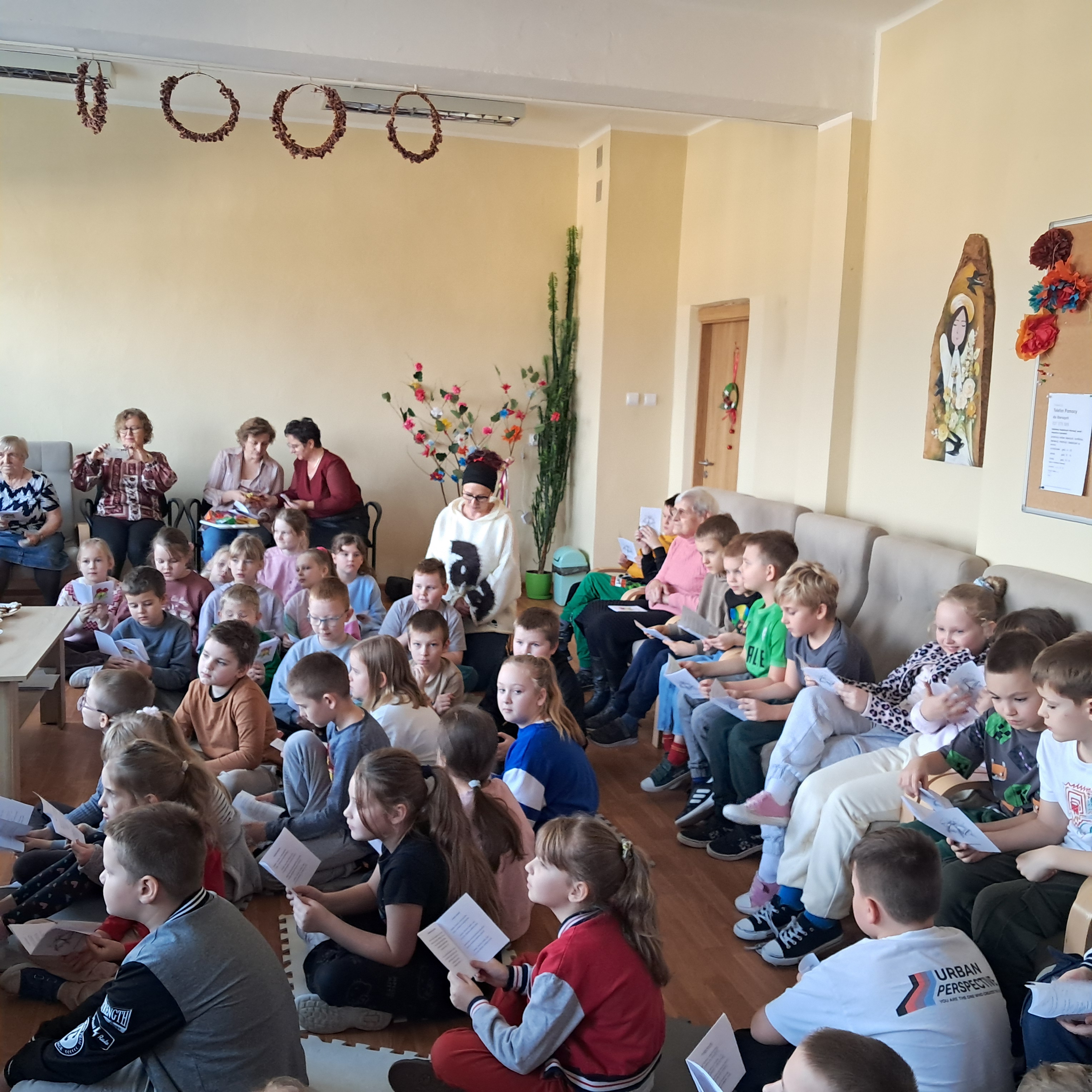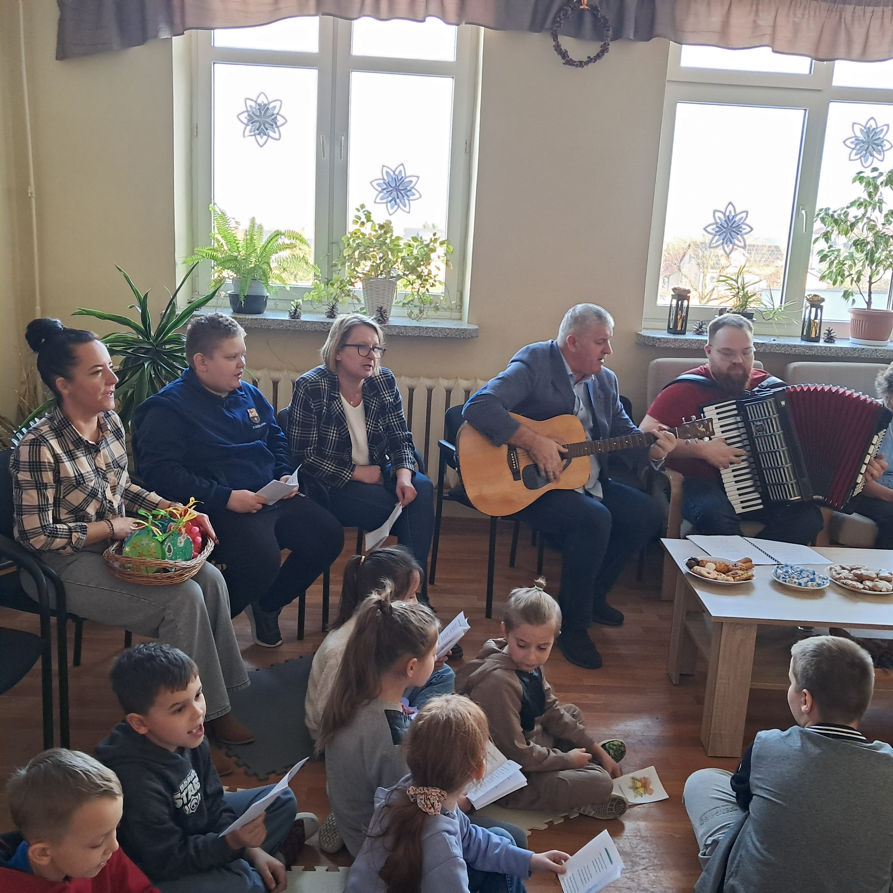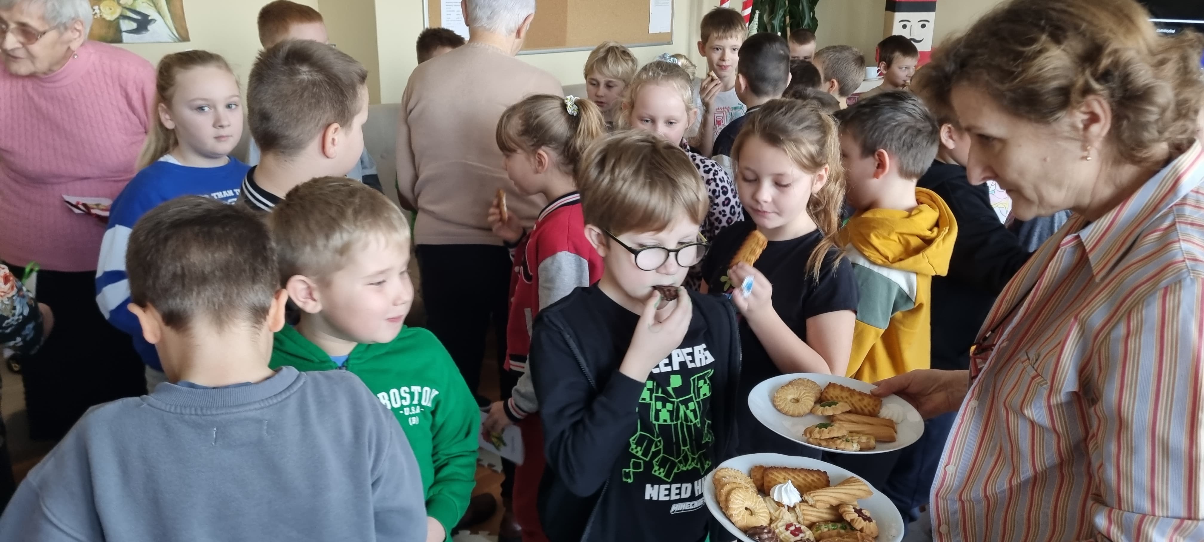 Spotkanie zakończyło się serdecznymi życzeniami, wręczeniem kartek wykonanych przez uczniów klas drugich oraz słodkim poczęstunkiem przygotowanym przez Seniorów. Był to czas pełen dobra, wdzięczności i pięknych chwil, które na długo pozostaną w pamięci uczestników.