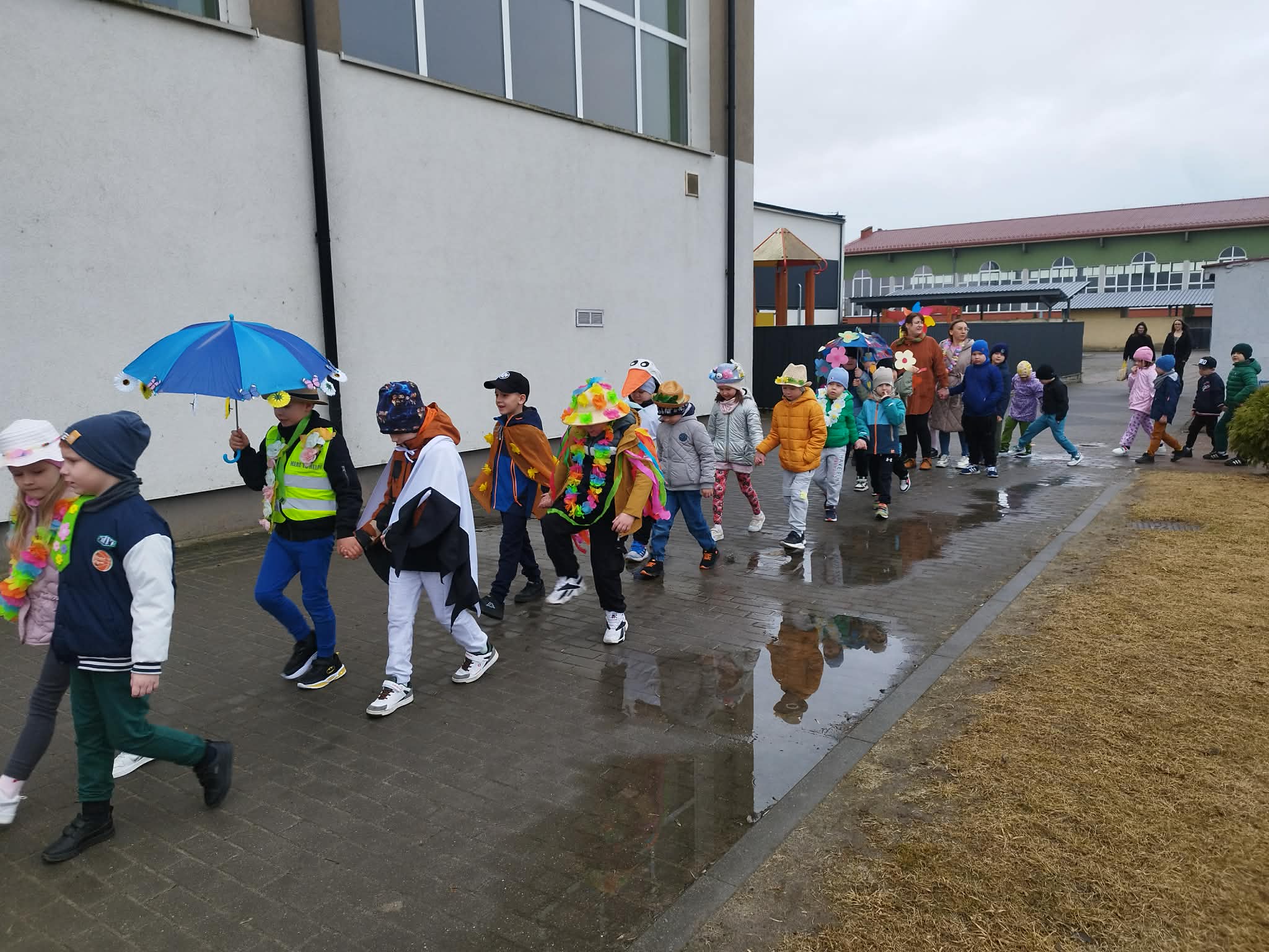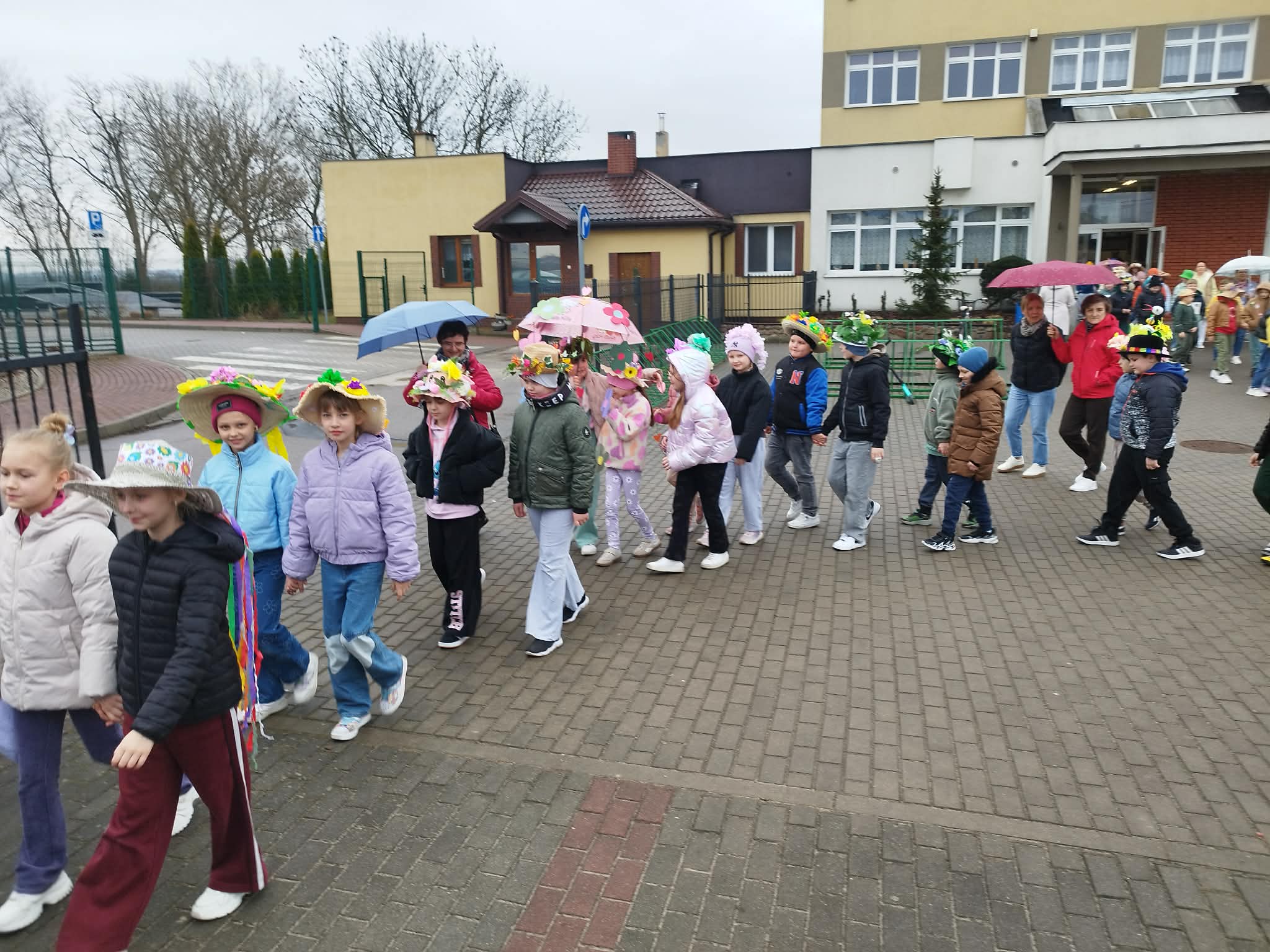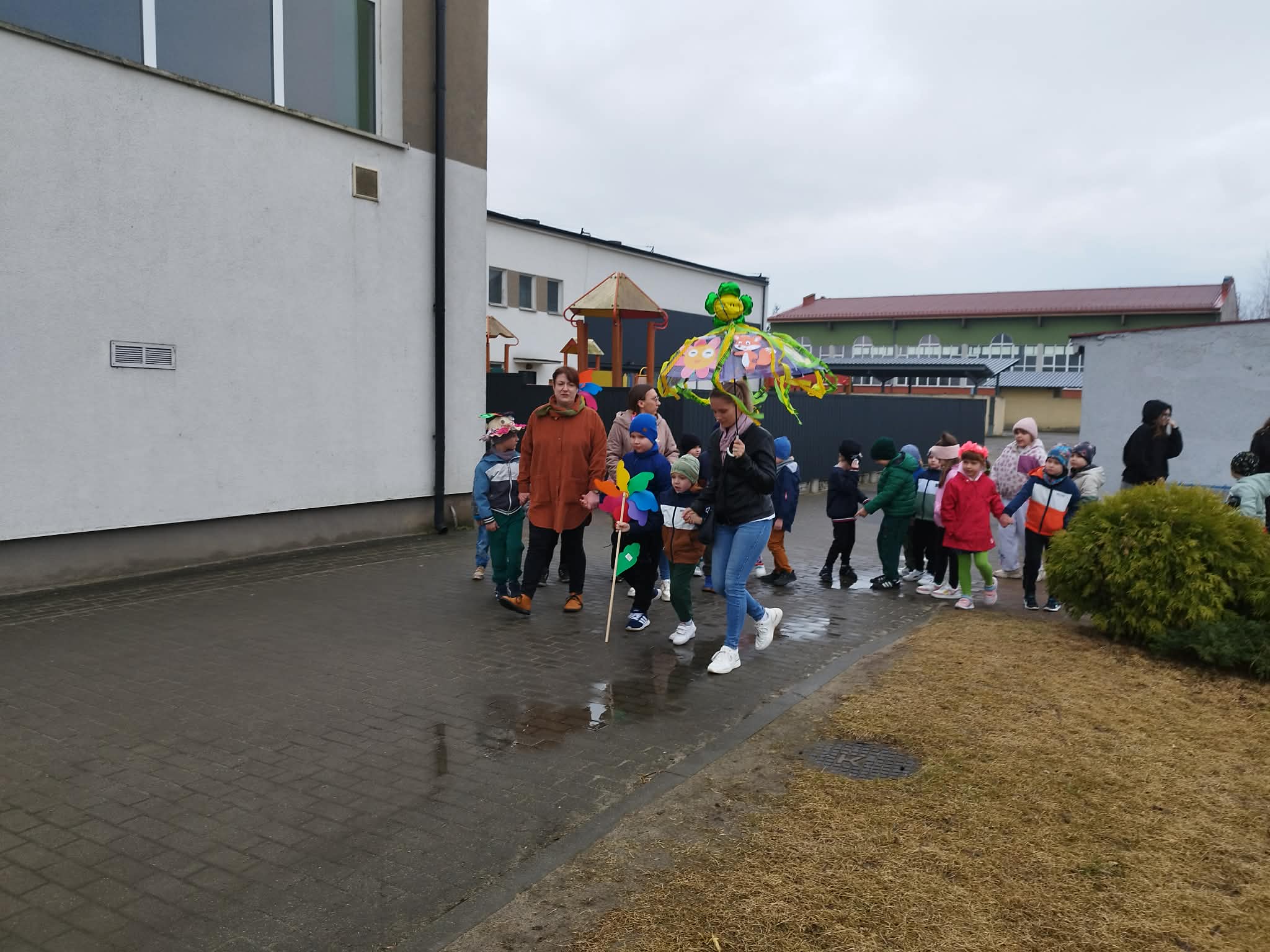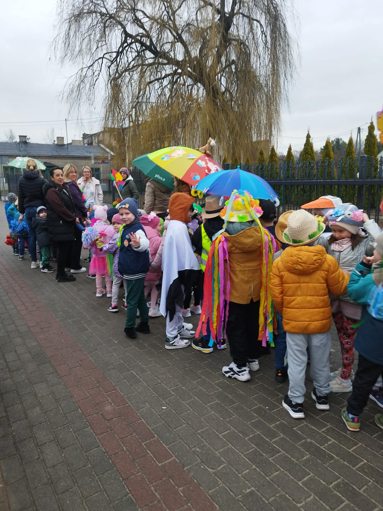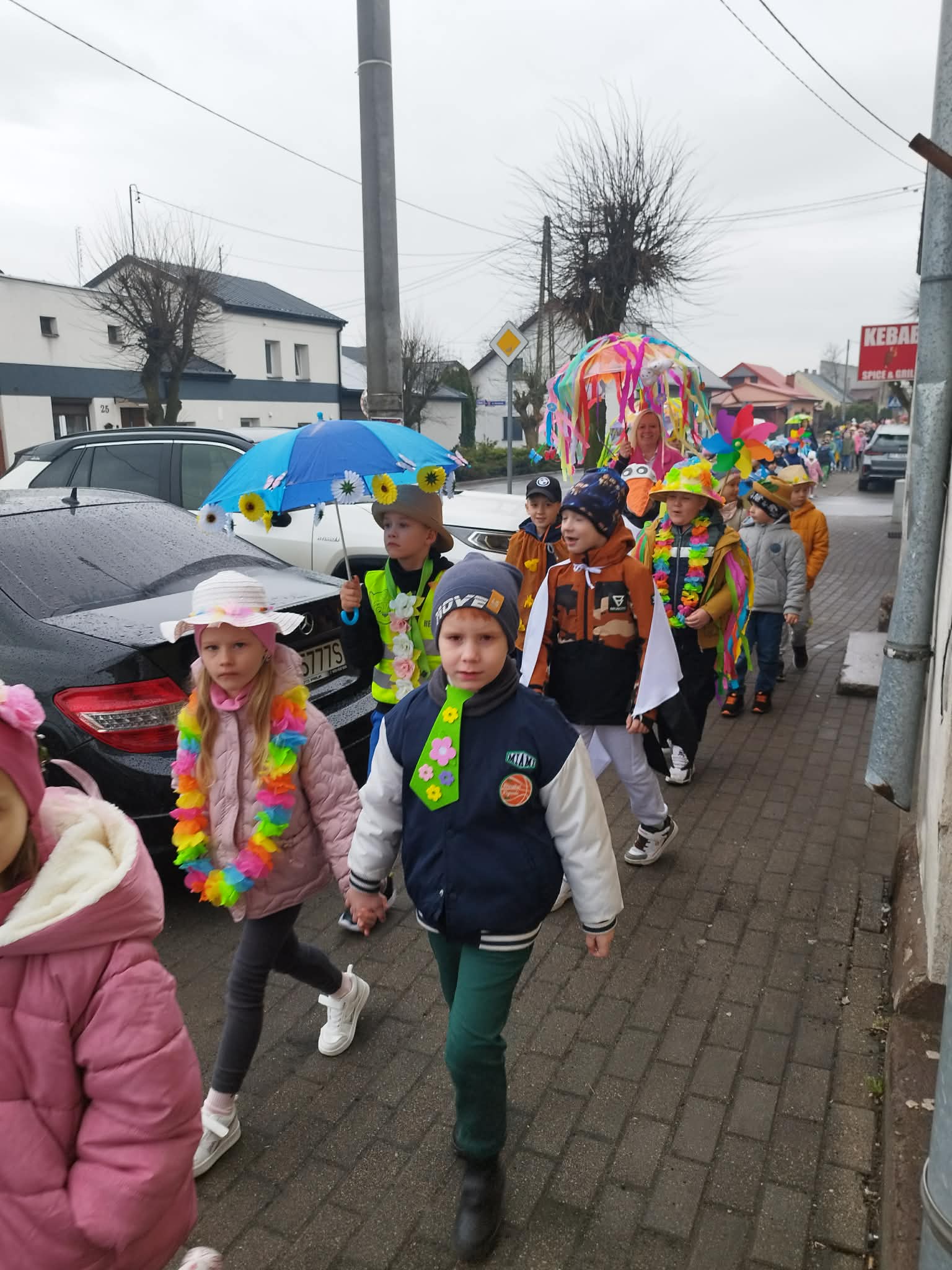 20 marca w pierwszy dzień astronomicznej wiosny dzieci z grup przedszkolnych oraz klas I-III wyruszyły barwnym korowodem, aby powitać wiosnę. Podczas marszu dzieci śpiewały wiosenne piosenki, dzięki którym nasz korowód nie pozostał niezauważony. Wszyscy przechodnie uśmiechem reagowali na widok tak barwnej i roześmianej gromady dzieci. Tradycyjnie żegnaliśmy zimę wypuszczając w niebo niebieskie balony z helem. Do przedszkola wracaliśmy niosąc kolorowe gaiki – maiki, parasolki oraz inne elementy związane z wiosną. Teraz pozostało nam już tylko czekać, aż wiosna zagości u nas na dobre