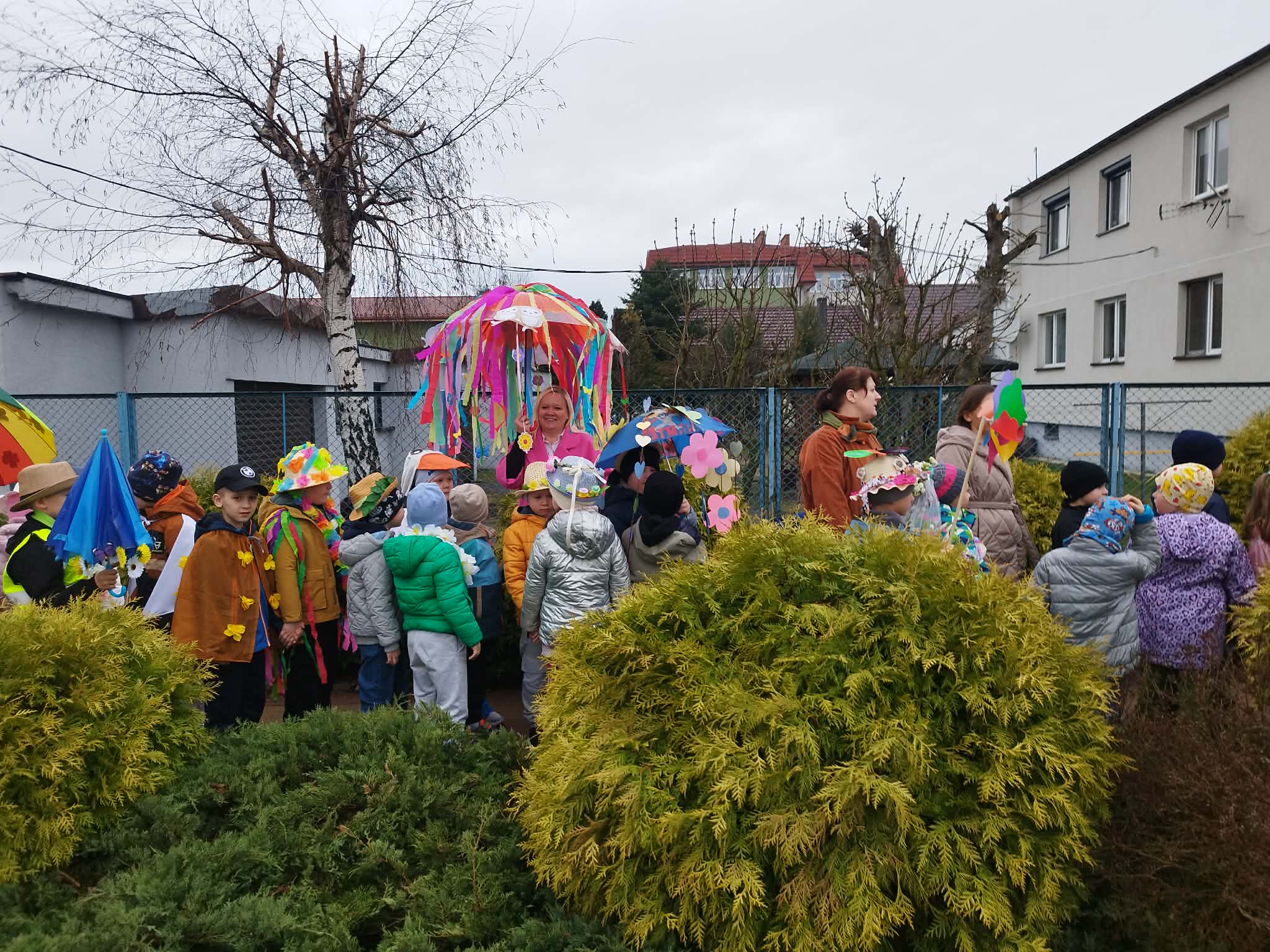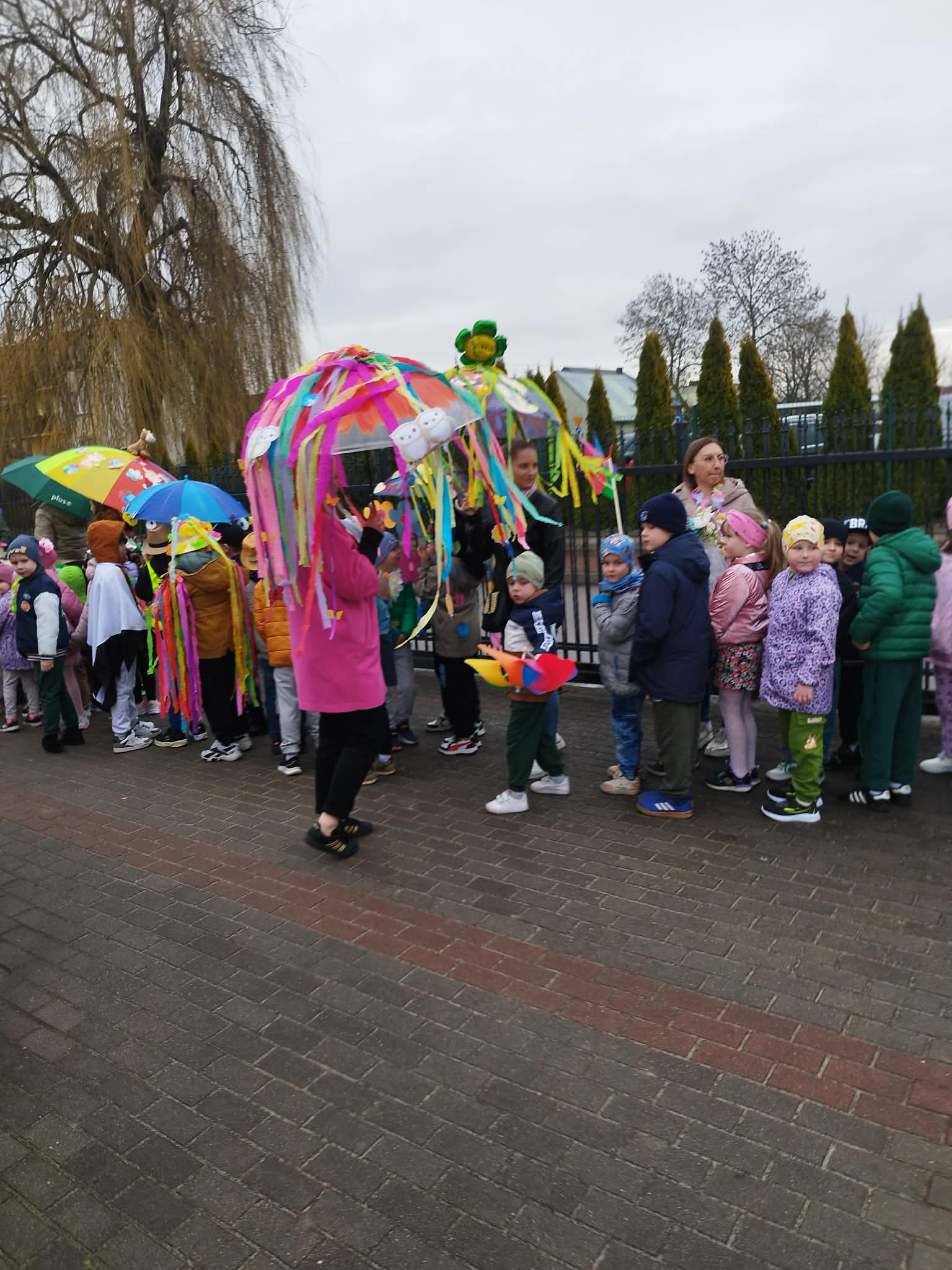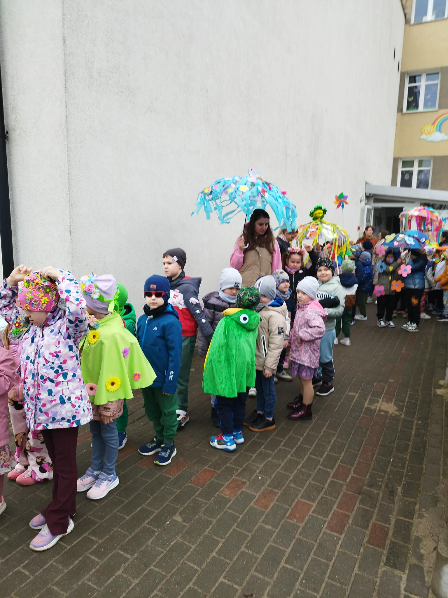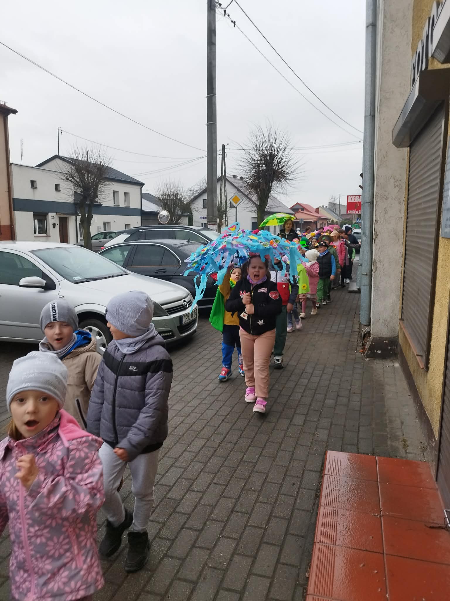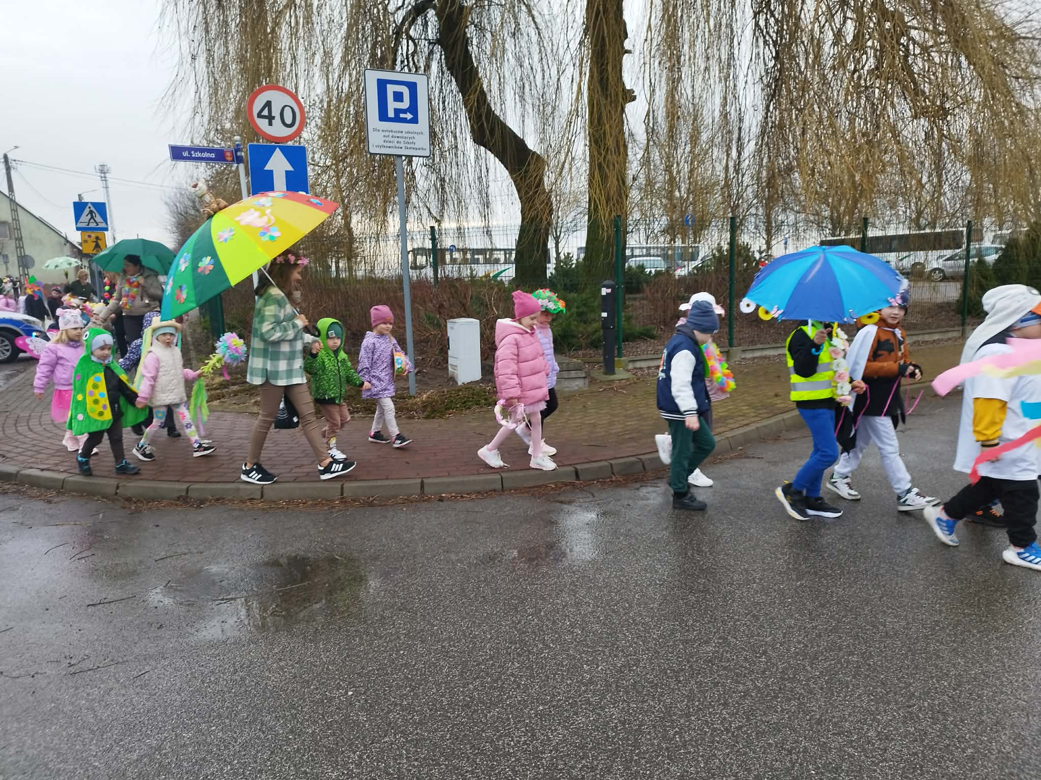20 marca w pierwszy dzień astronomicznej wiosny dzieci z grup przedszkolnych oraz klas I-III wyruszyły barwnym korowodem, aby powitać wiosnę. Podczas marszu dzieci śpiewały wiosenne piosenki, dzięki którym nasz korowód nie pozostał niezauważony. Wszyscy przechodnie uśmiechem reagowali na widok tak barwnej i roześmianej gromady dzieci. Tradycyjnie żegnaliśmy zimę wypuszczając w niebo niebieskie balony z helem. Do przedszkola wracaliśmy niosąc kolorowe gaiki – maiki, parasolki oraz inne elementy związane z wiosną. Teraz pozostało nam już tylko czekać, aż wiosna zagości u nas na dobre