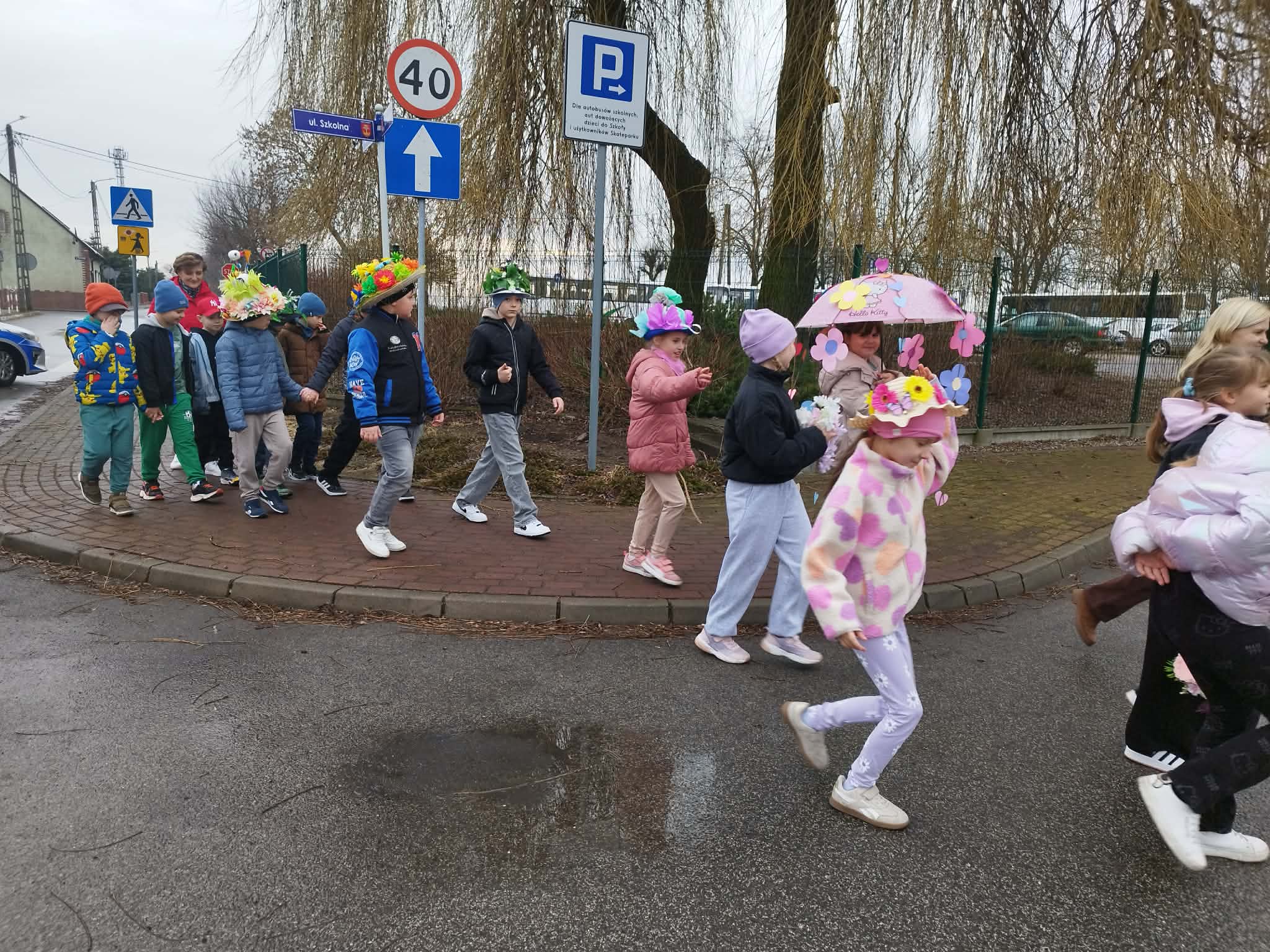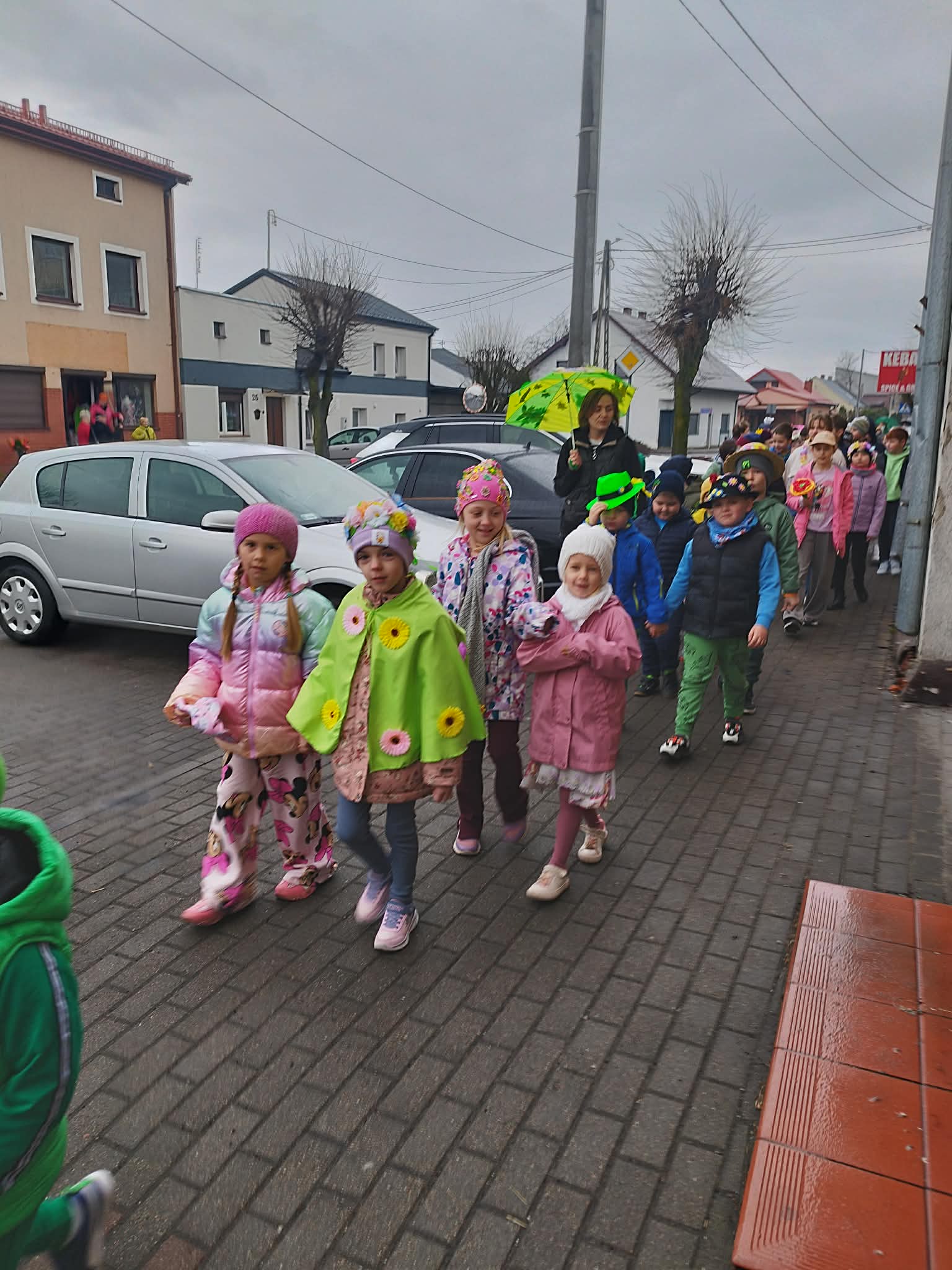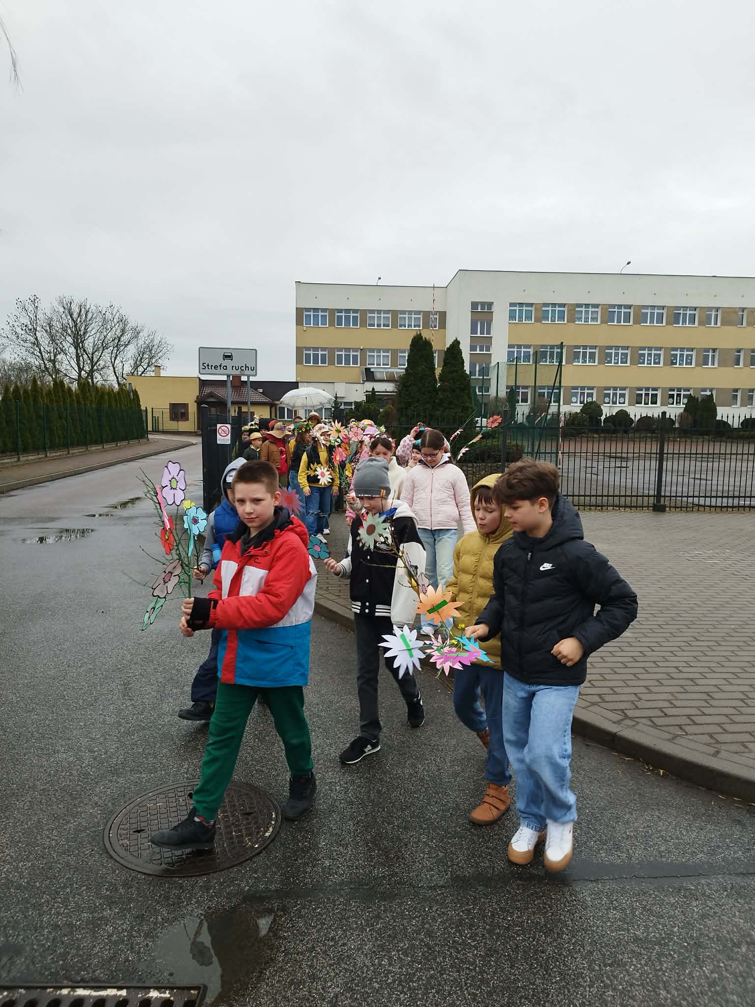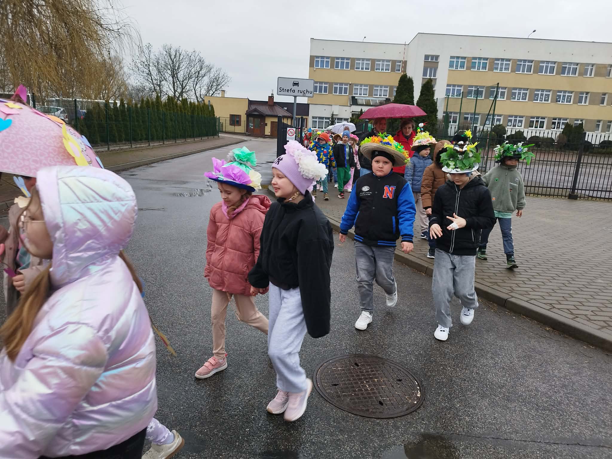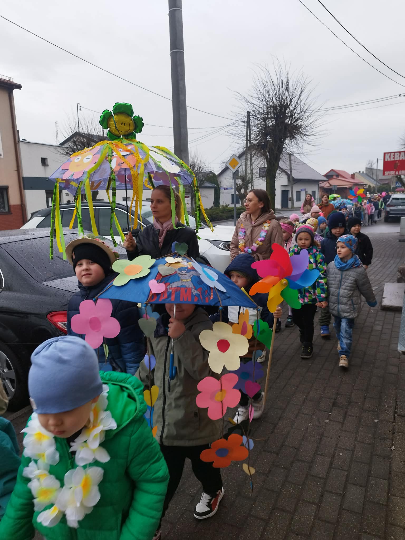 20 marca w pierwszy dzień astronomicznej wiosny dzieci z grup przedszkolnych oraz klas I-III wyruszyły barwnym korowodem, aby powitać wiosnę. Podczas marszu dzieci śpiewały wiosenne piosenki, dzięki którym nasz korowód nie pozostał niezauważony. Wszyscy przechodnie uśmiechem reagowali na widok tak barwnej i roześmianej gromady dzieci. Tradycyjnie żegnaliśmy zimę wypuszczając w niebo niebieskie balony z helem. Do przedszkola wracaliśmy niosąc kolorowe gaiki – maiki, parasolki oraz inne elementy związane z wiosną. Teraz pozostało nam już tylko czekać, aż wiosna zagości u nas na dobre
