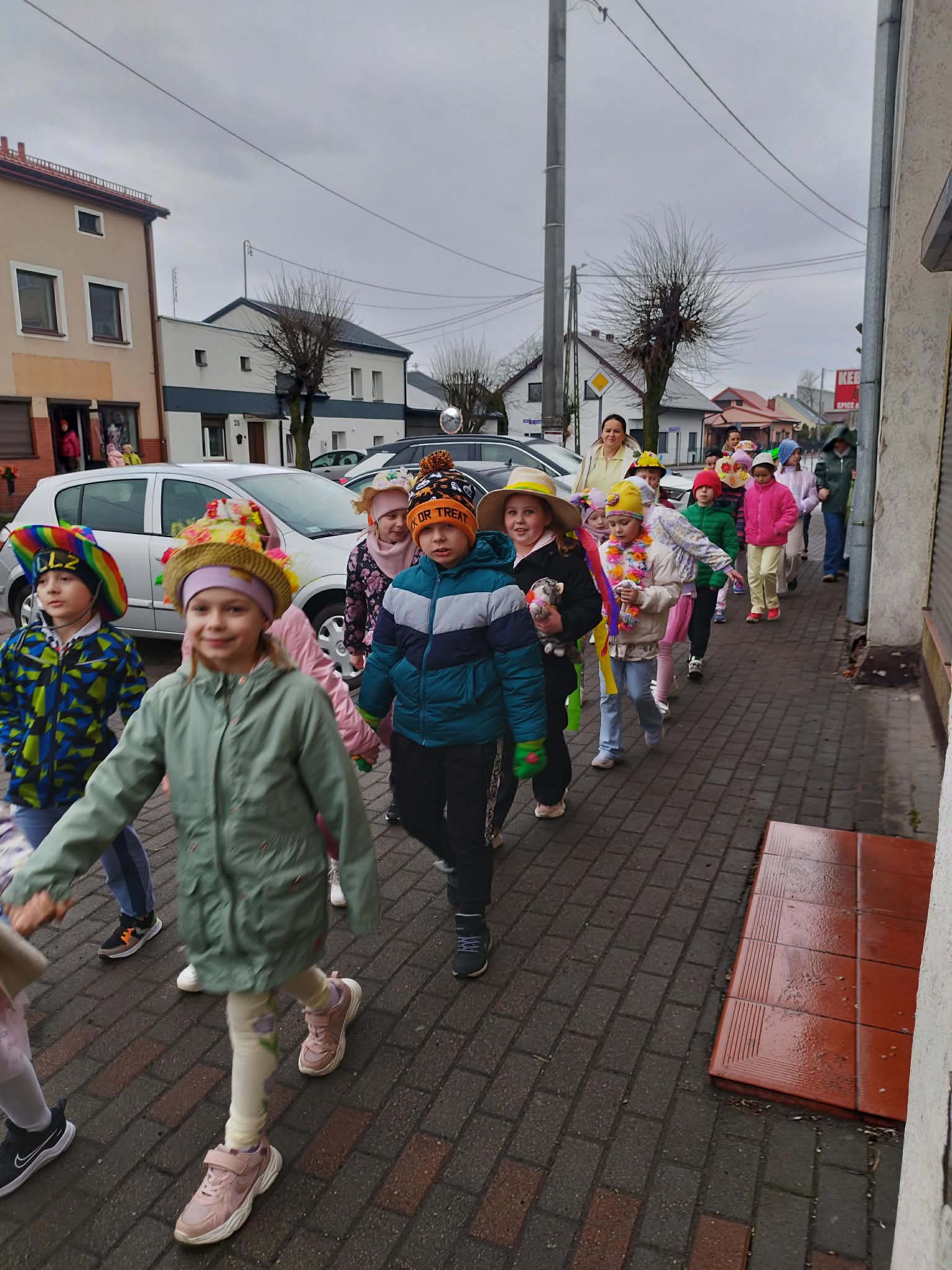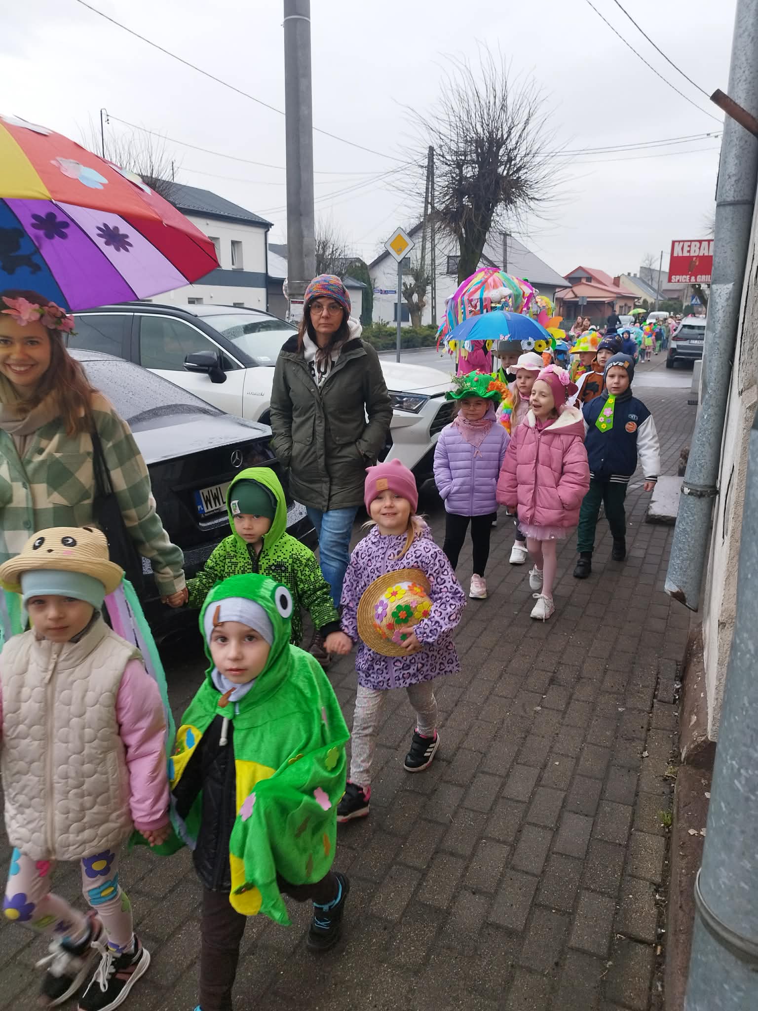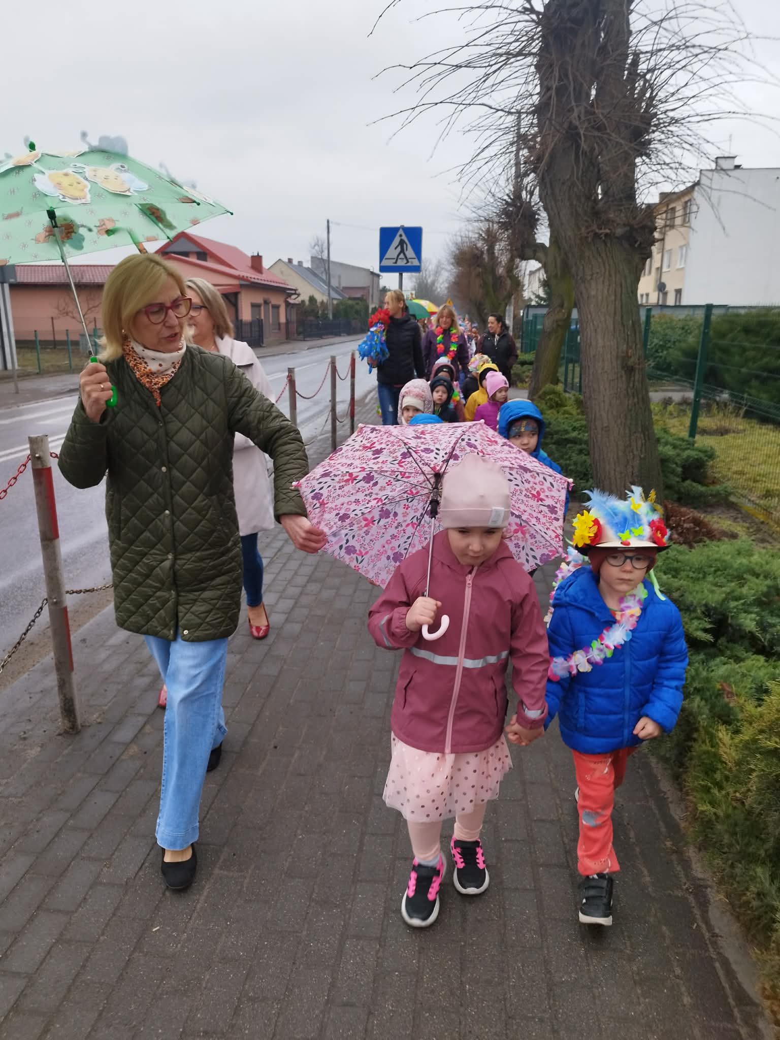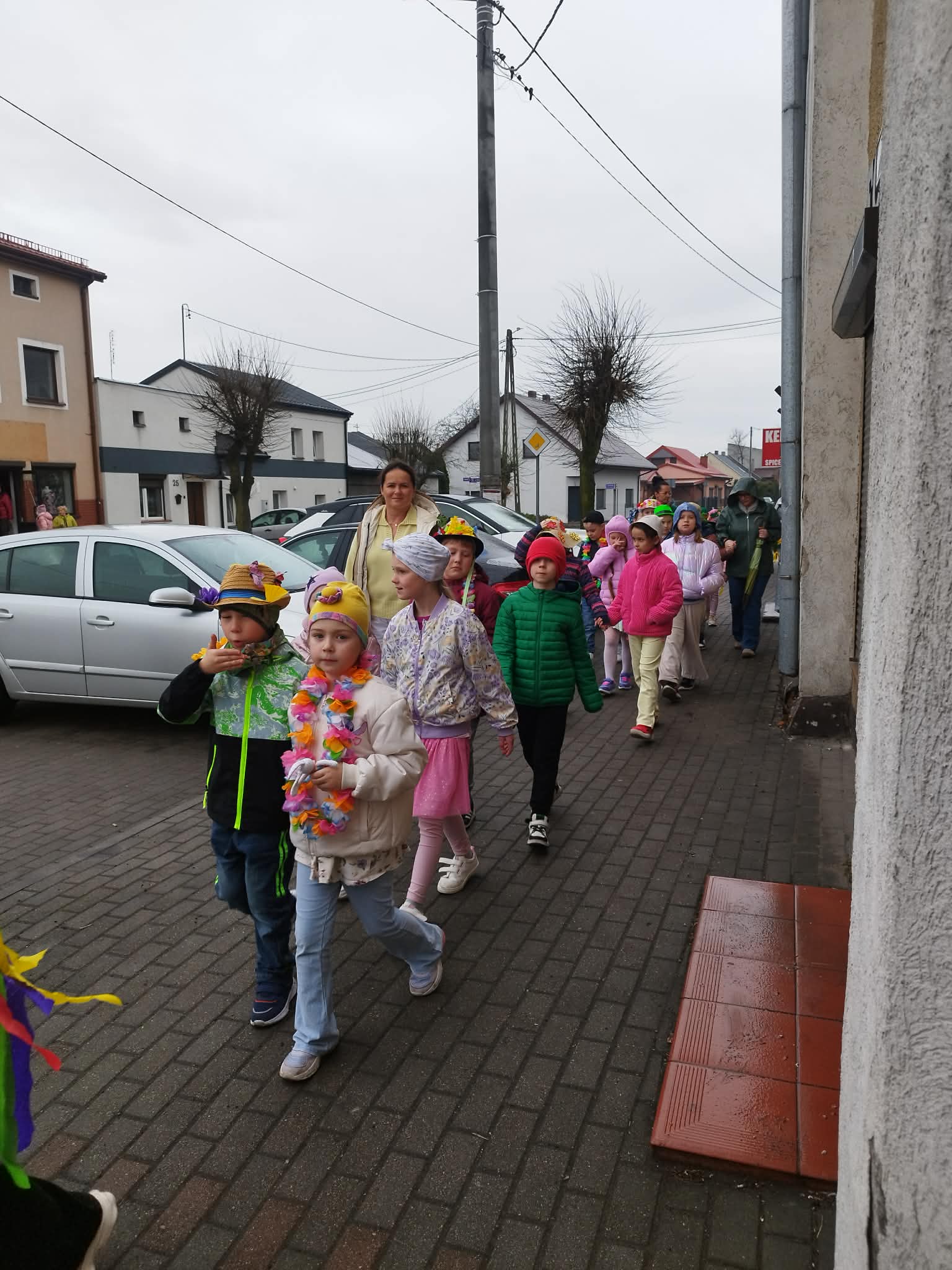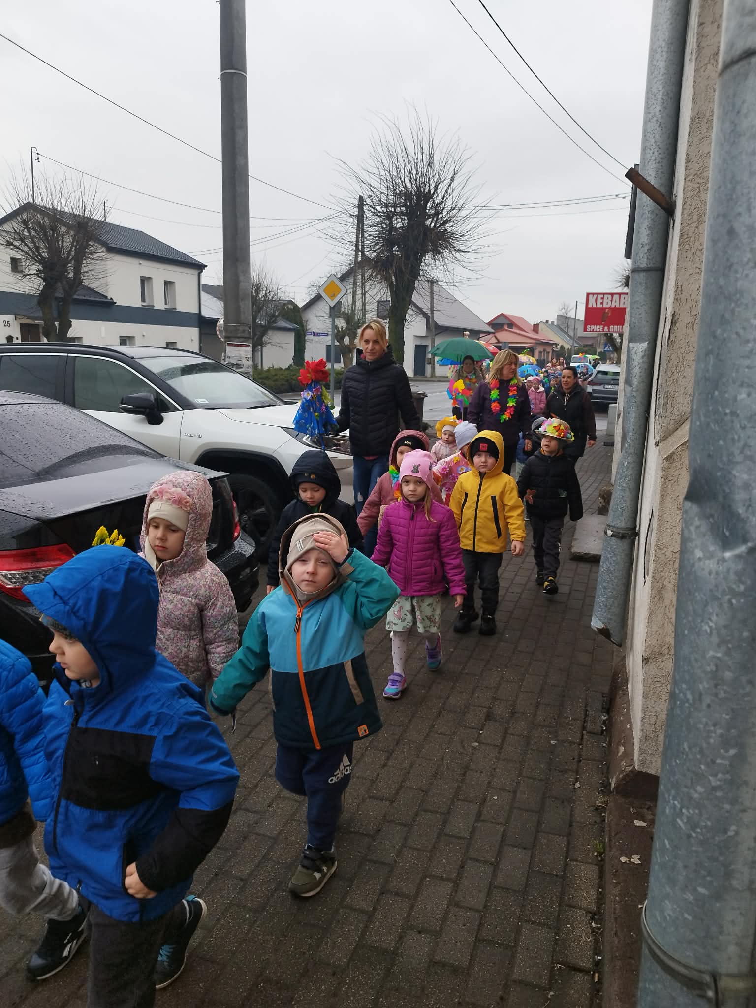20 marca w pierwszy dzień astronomicznej wiosny dzieci z grup przedszkolnych oraz klas I-III wyruszyły barwnym korowodem, aby powitać wiosnę. Podczas marszu dzieci śpiewały wiosenne piosenki, dzięki którym nasz korowód nie pozostał niezauważony. Wszyscy przechodnie uśmiechem reagowali na widok tak barwnej i roześmianej gromady dzieci. Tradycyjnie żegnaliśmy zimę wypuszczając w niebo niebieskie balony z helem. Do przedszkola wracaliśmy niosąc kolorowe gaiki – maiki, parasolki oraz inne elementy związane z wiosną. Teraz pozostało nam już tylko czekać, aż wiosna zagości u nas na dobre