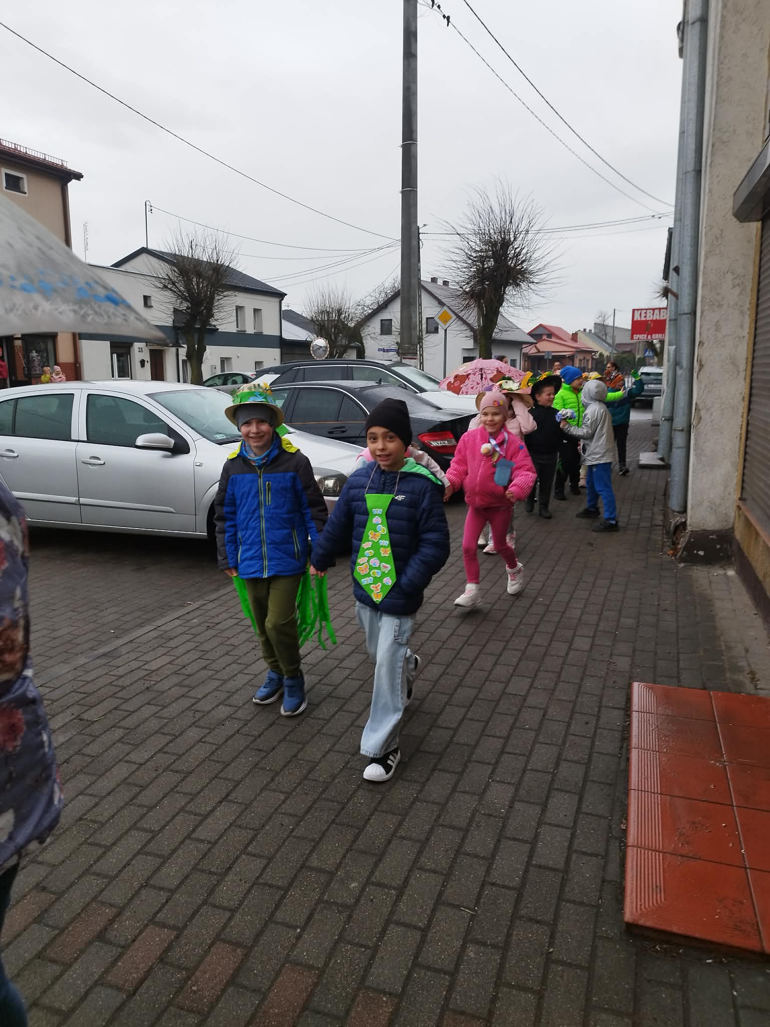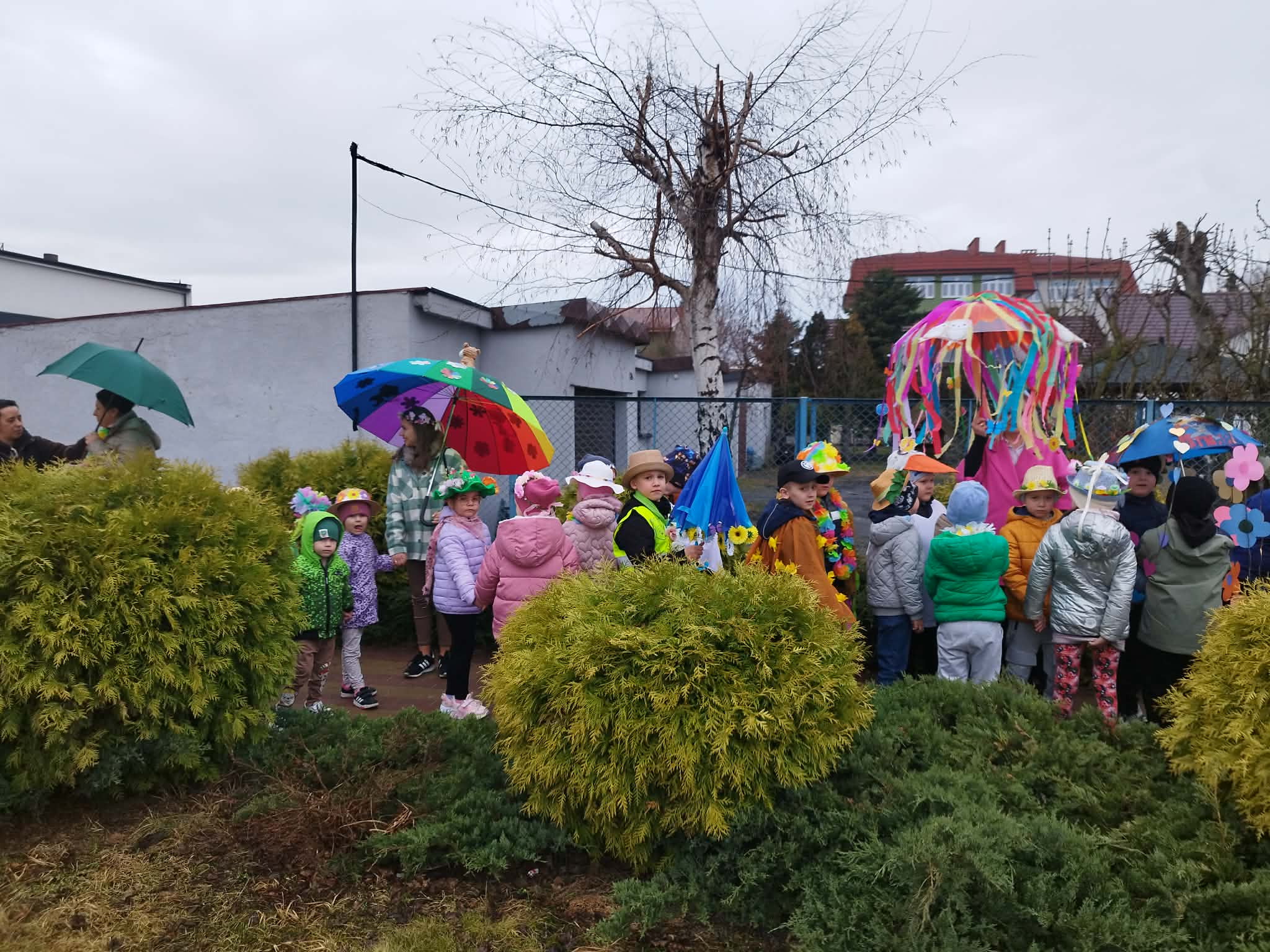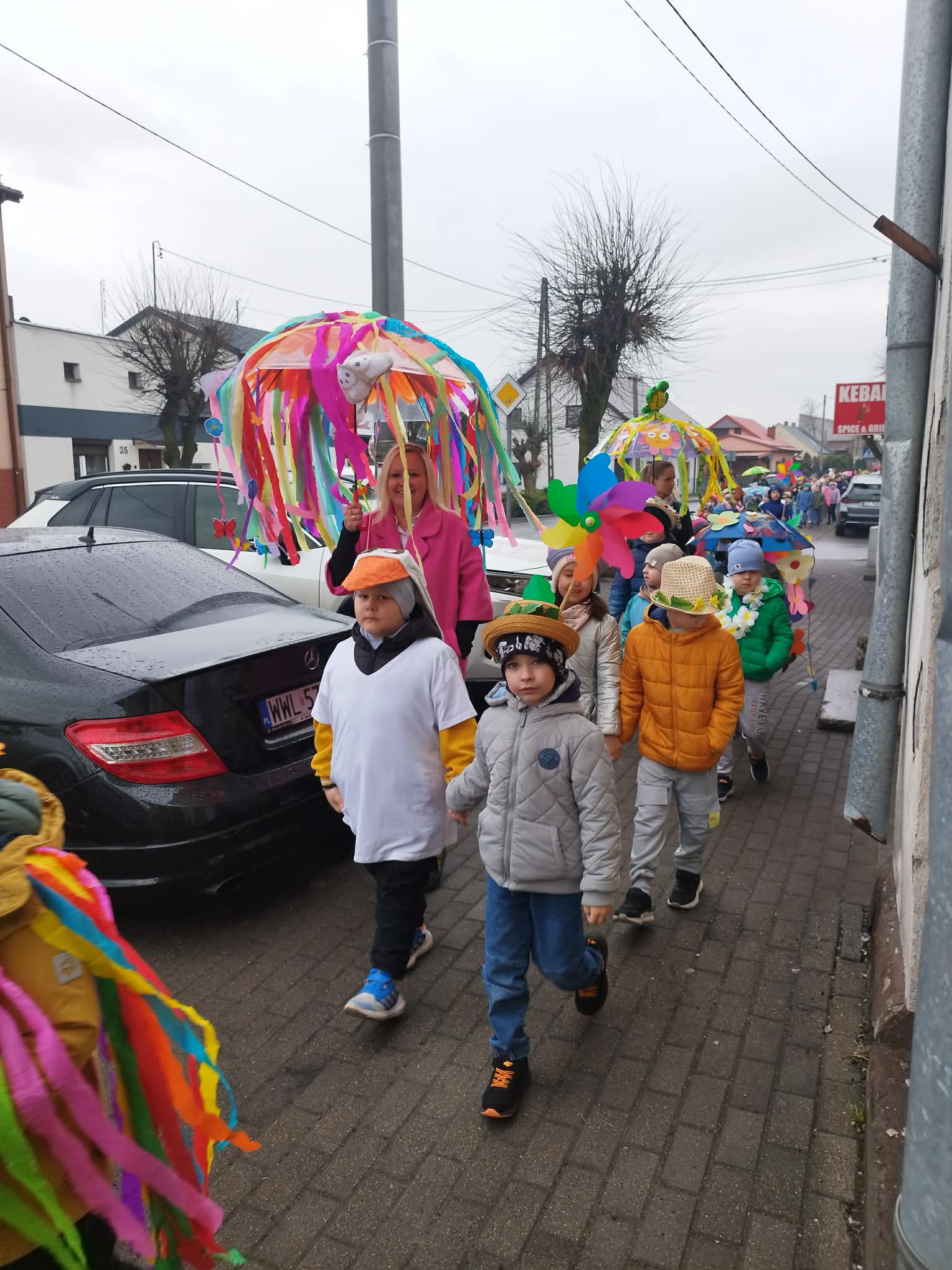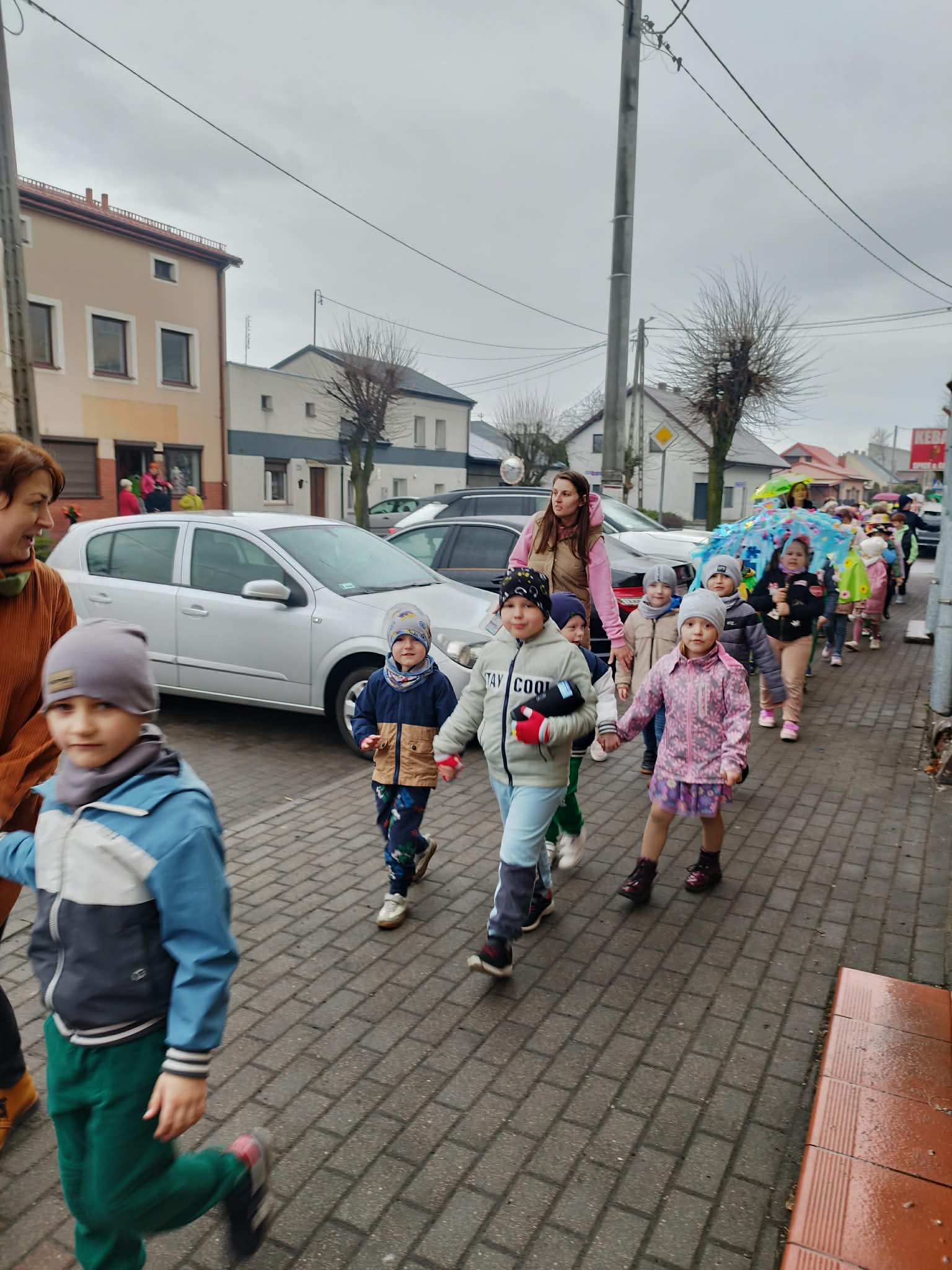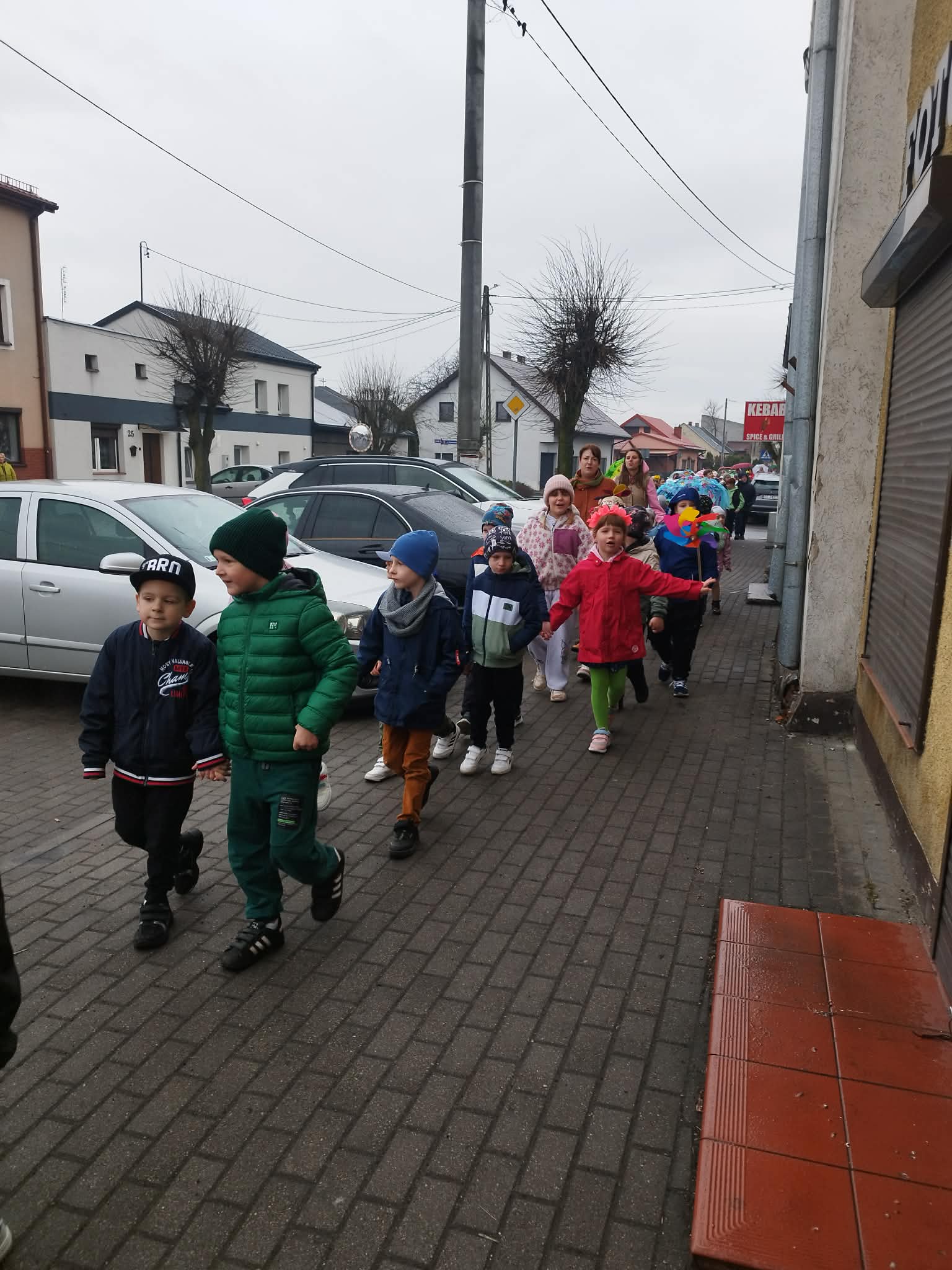 20 marca w pierwszy dzień astronomicznej wiosny dzieci z grup przedszkolnych oraz klas I-III wyruszyły barwnym korowodem, aby powitać wiosnę. Podczas marszu dzieci śpiewały wiosenne piosenki, dzięki którym nasz korowód nie pozostał niezauważony. Wszyscy przechodnie uśmiechem reagowali na widok tak barwnej i roześmianej gromady dzieci. Tradycyjnie żegnaliśmy zimę wypuszczając w niebo niebieskie balony z helem. Do przedszkola wracaliśmy niosąc kolorowe gaiki – maiki, parasolki oraz inne elementy związane z wiosną. Teraz pozostało nam już tylko czekać, aż wiosna zagości u nas na dobre