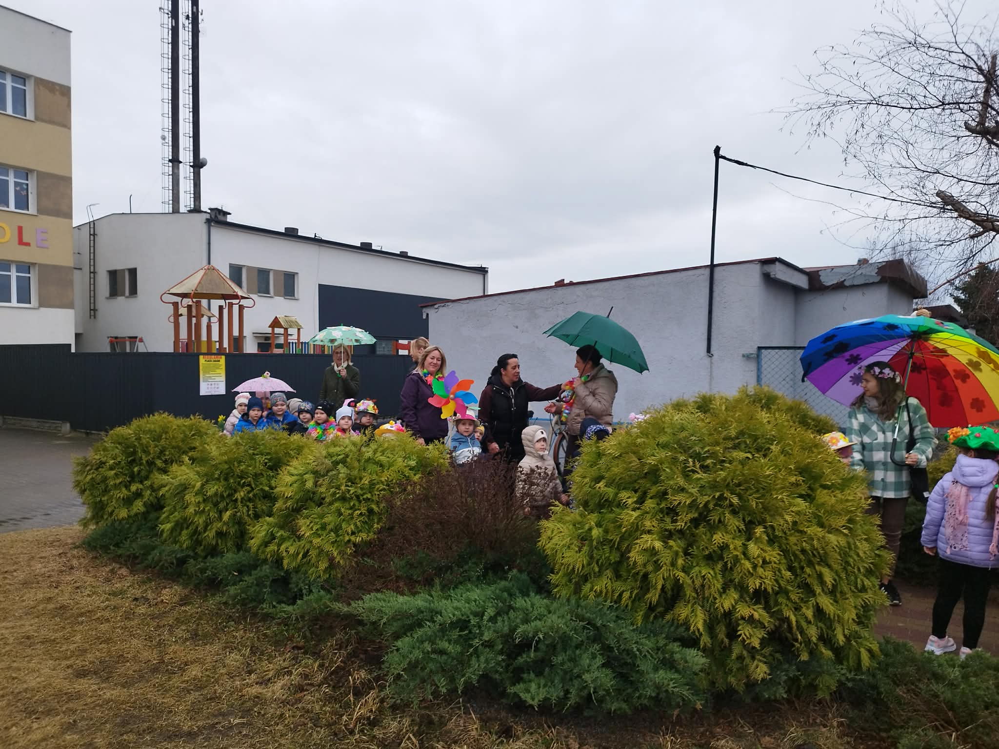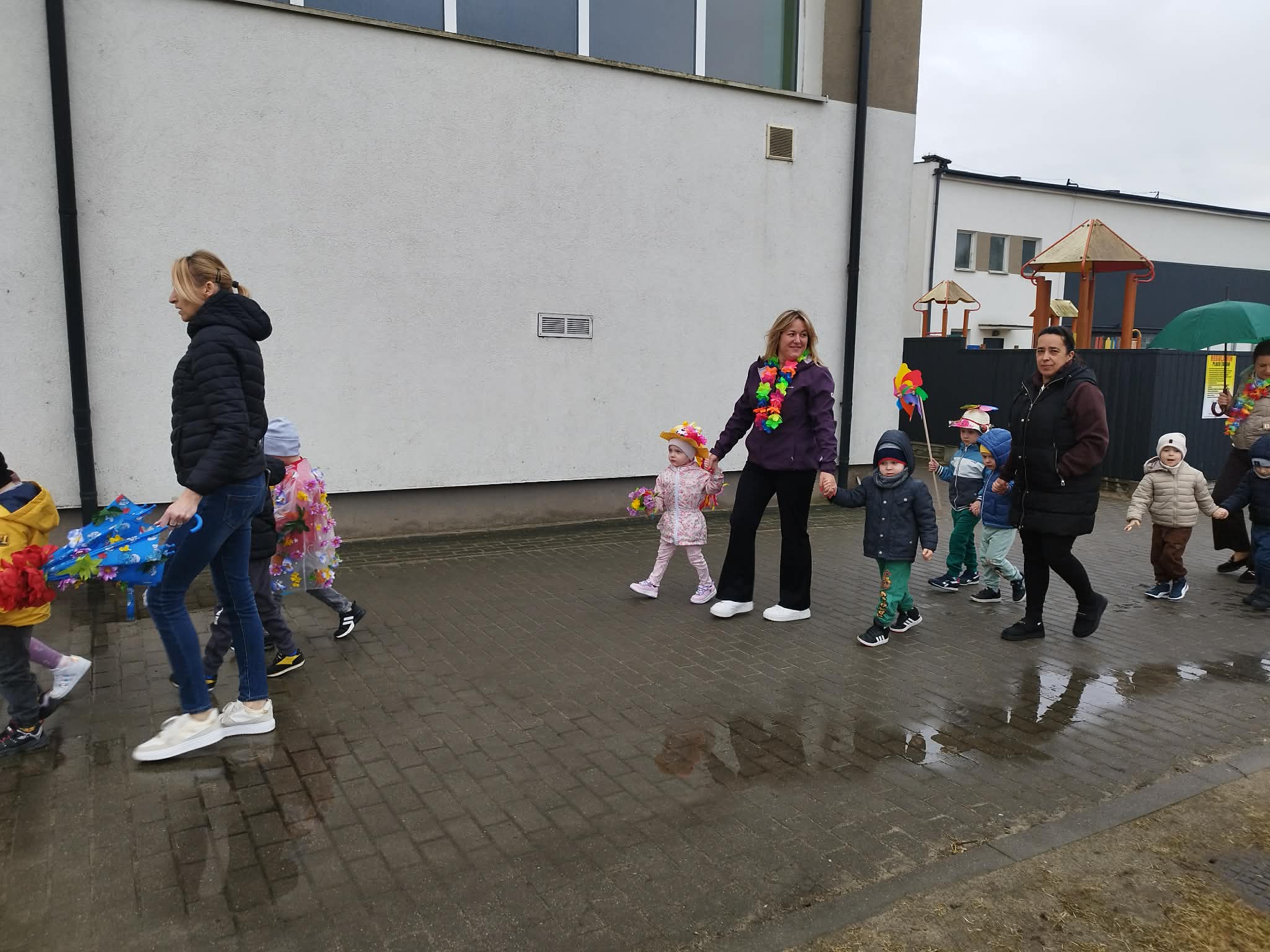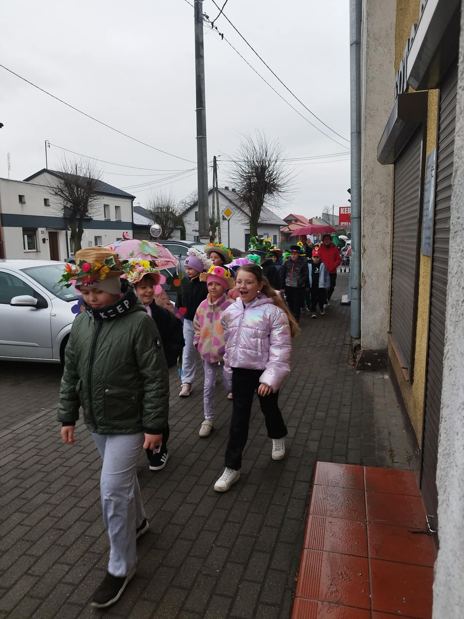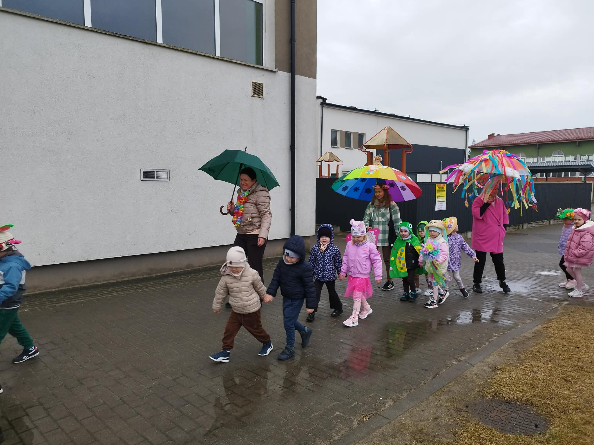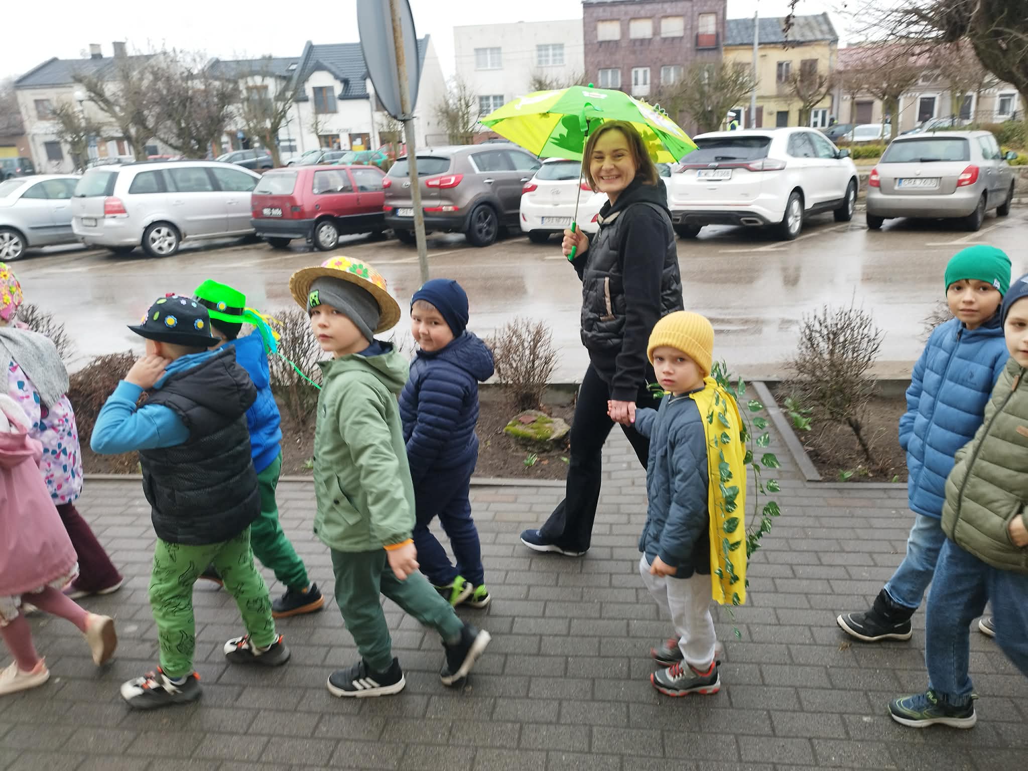20 marca w pierwszy dzień astronomicznej wiosny dzieci z grup przedszkolnych oraz klas I-III wyruszyły barwnym korowodem, aby powitać wiosnę. Podczas marszu dzieci śpiewały wiosenne piosenki, dzięki którym nasz korowód nie pozostał niezauważony. Wszyscy przechodnie uśmiechem reagowali na widok tak barwnej i roześmianej gromady dzieci. Tradycyjnie żegnaliśmy zimę wypuszczając w niebo niebieskie balony z helem. Do przedszkola wracaliśmy niosąc kolorowe gaiki – maiki, parasolki oraz inne elementy związane z wiosną. Teraz pozostało nam już tylko czekać, aż wiosna zagości u nas na dobre