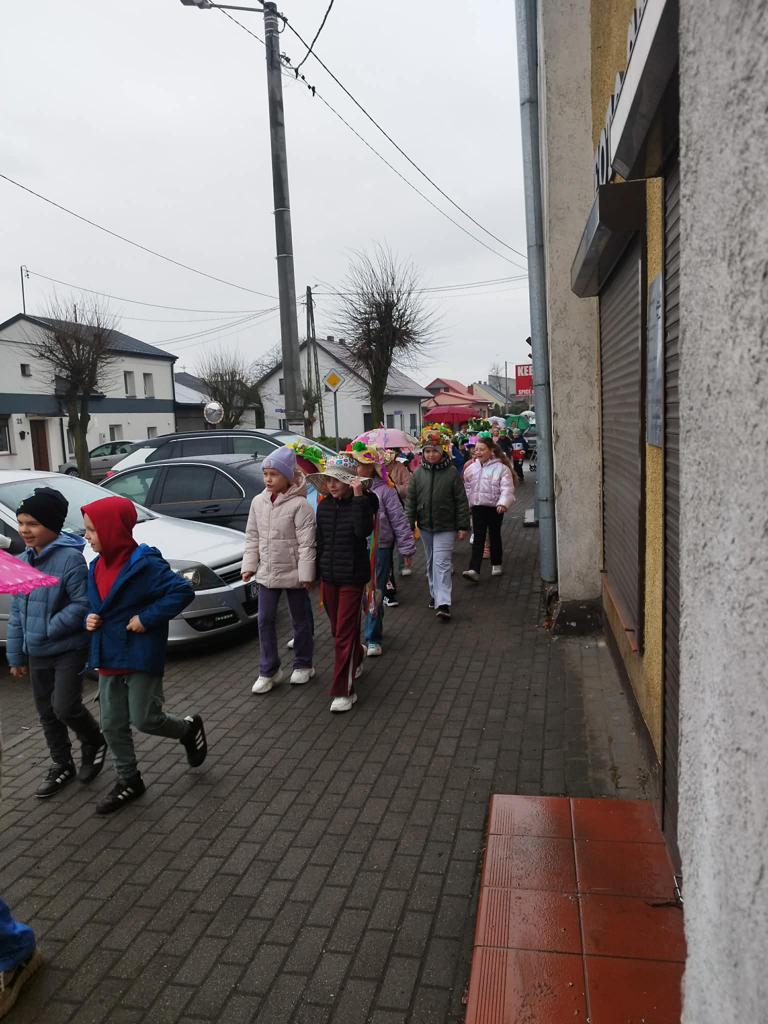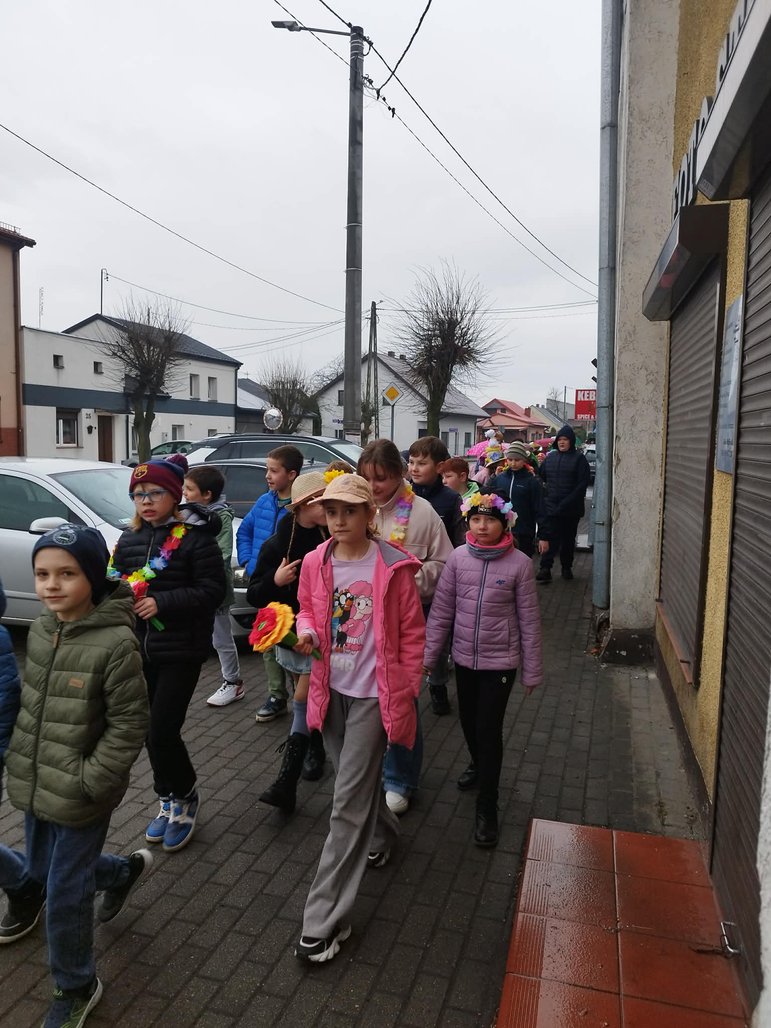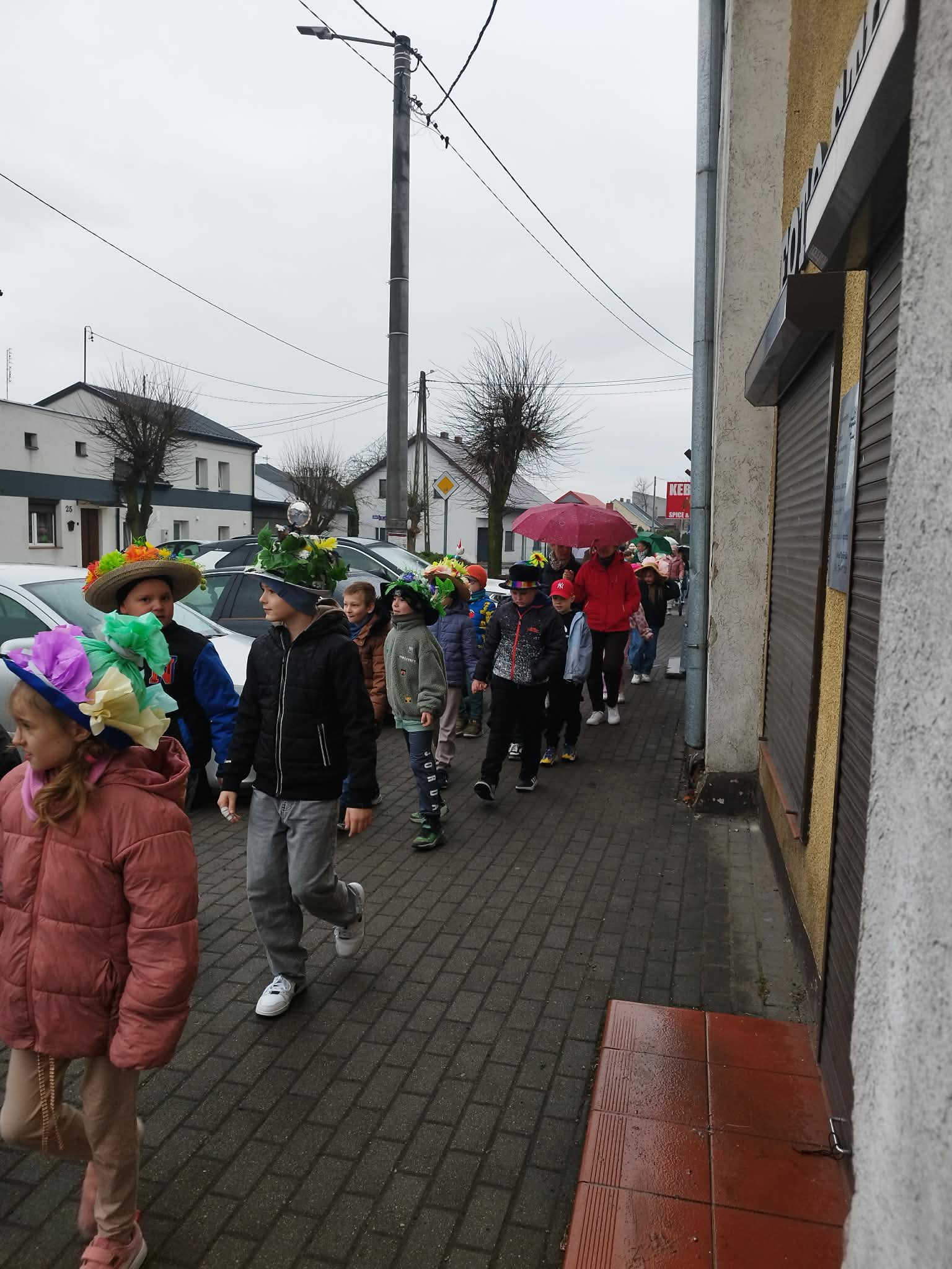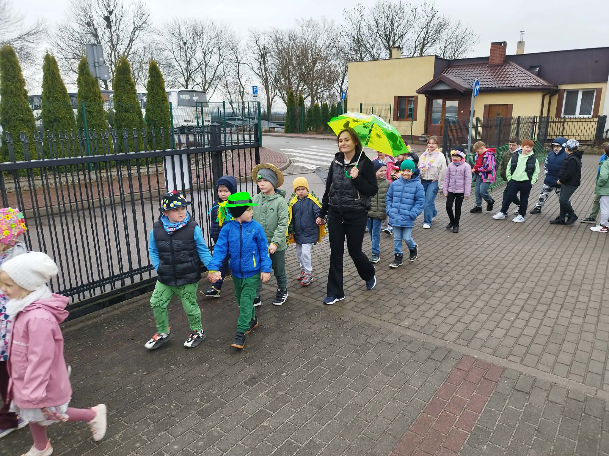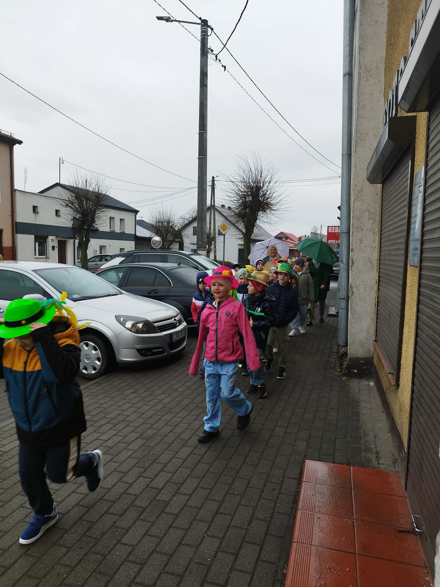 20 marca w pierwszy dzień astronomicznej wiosny dzieci z grup przedszkolnych oraz klas I-III wyruszyły barwnym korowodem, aby powitać wiosnę. Podczas marszu dzieci śpiewały wiosenne piosenki, dzięki którym nasz korowód nie pozostał niezauważony. Wszyscy przechodnie uśmiechem reagowali na widok tak barwnej i roześmianej gromady dzieci. Tradycyjnie żegnaliśmy zimę wypuszczając w niebo niebieskie balony z helem. Do przedszkola wracaliśmy niosąc kolorowe gaiki – maiki, parasolki oraz inne elementy związane z wiosną. Teraz pozostało nam już tylko czekać, aż wiosna zagości u nas na dobre