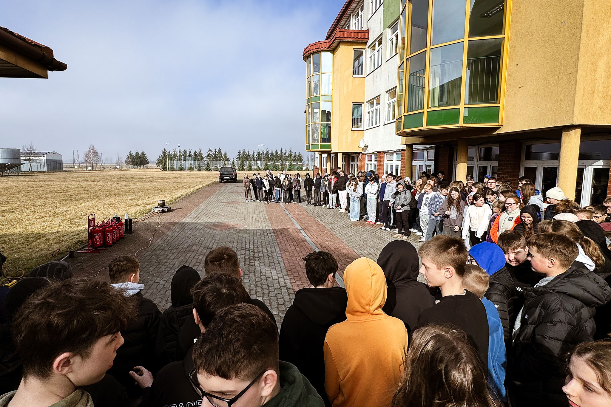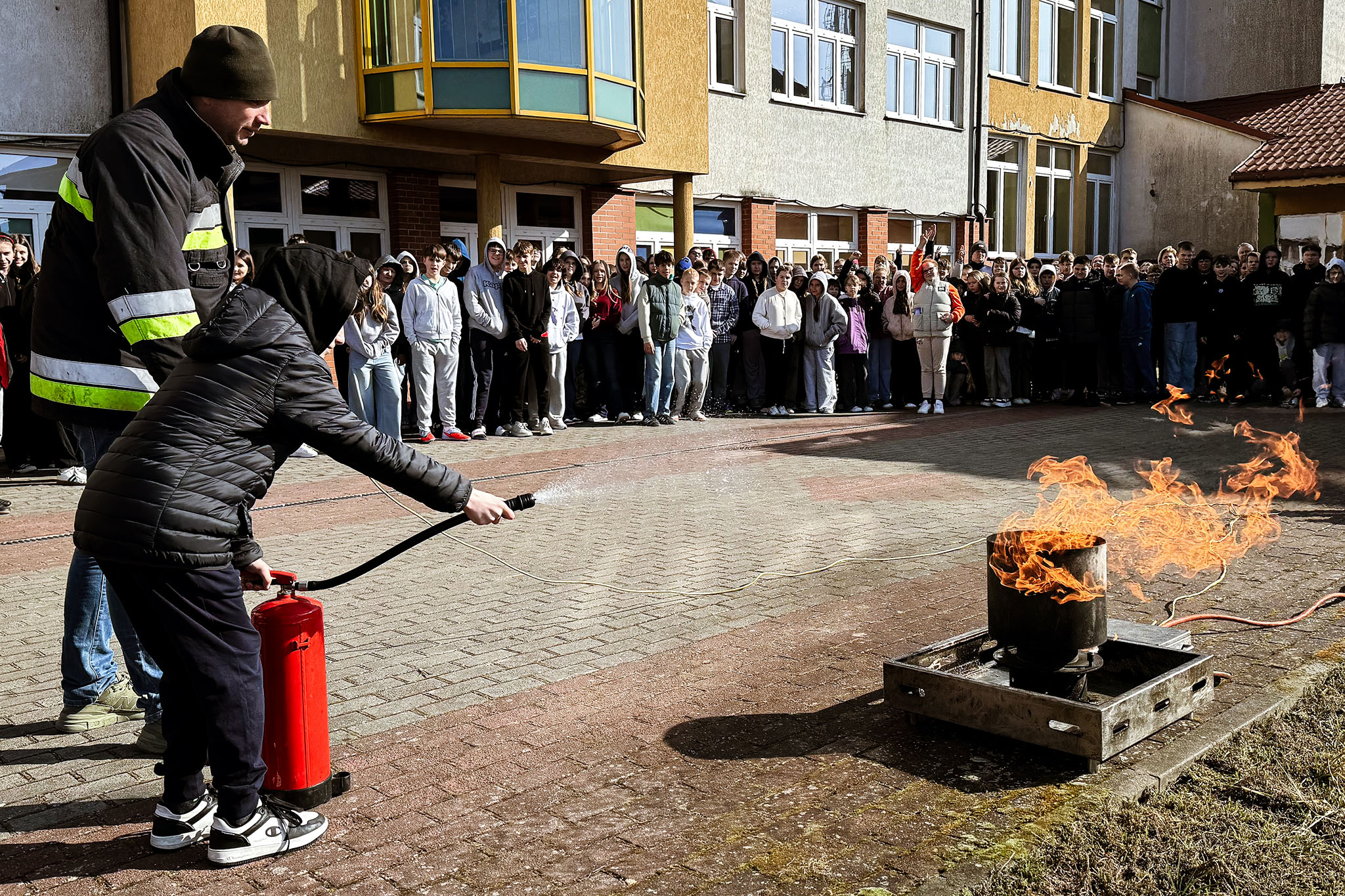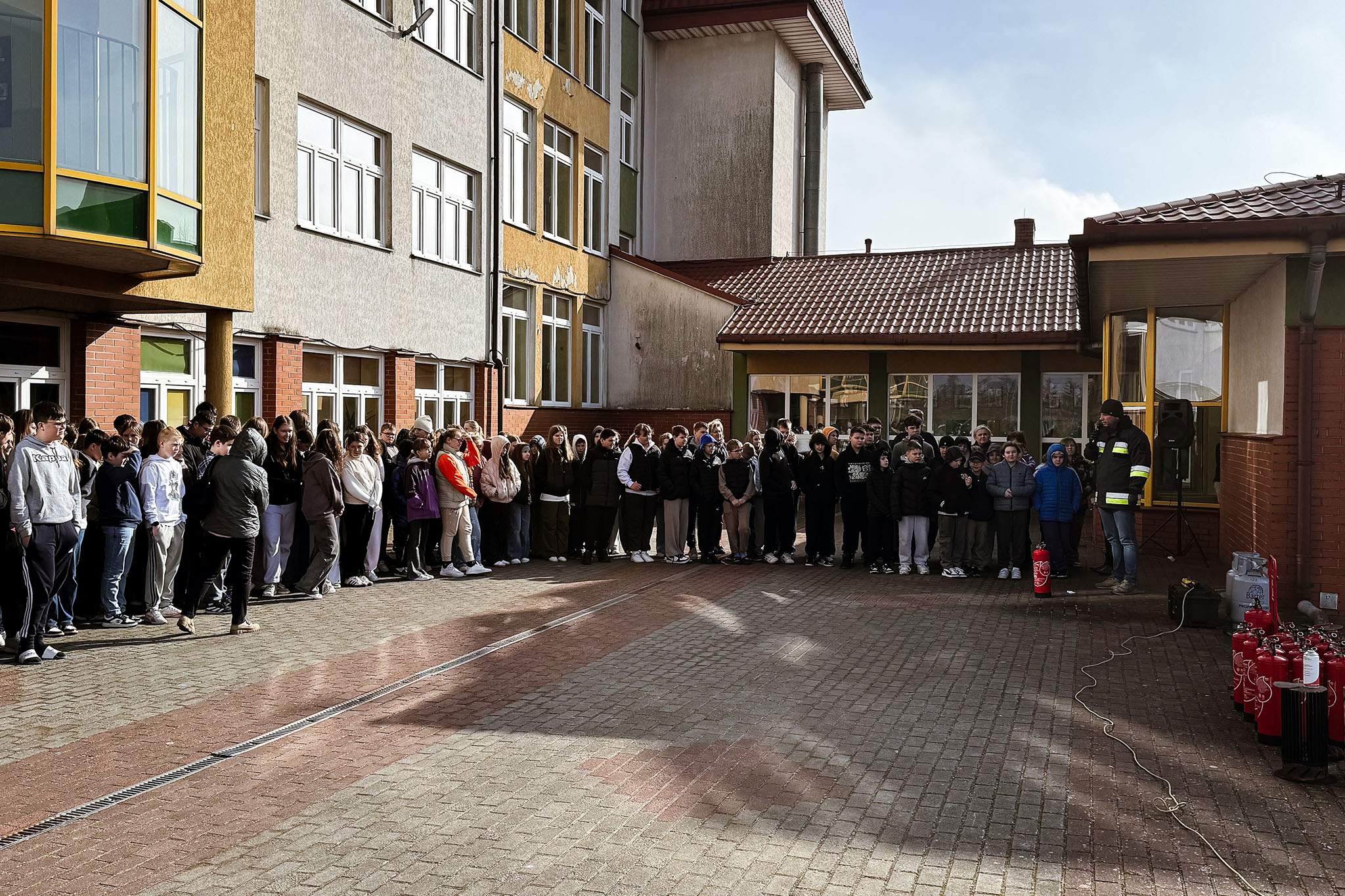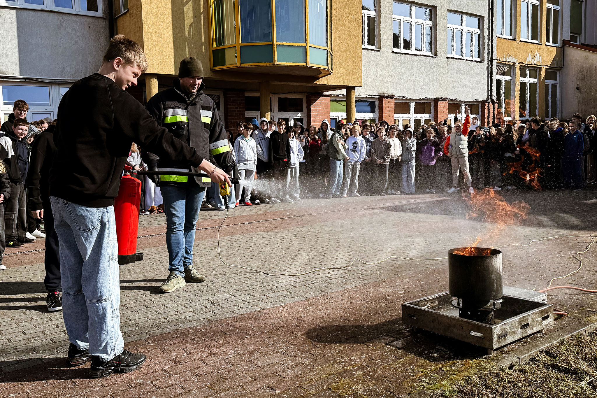 Szczególną uwagę poświęcono praktycznym aspektom korzystania z gaśnic. Prowadzący wyjaśnił, jakie są rodzaje gaśnic oraz w jakich sytuacjach należy ich używać. Uczniowie mogli również zobaczyć, jak prawidłowo obsługiwać sprzęt gaśniczy i jakie zasady bezpieczeństwa należy zachować podczas gaszenia ognia.