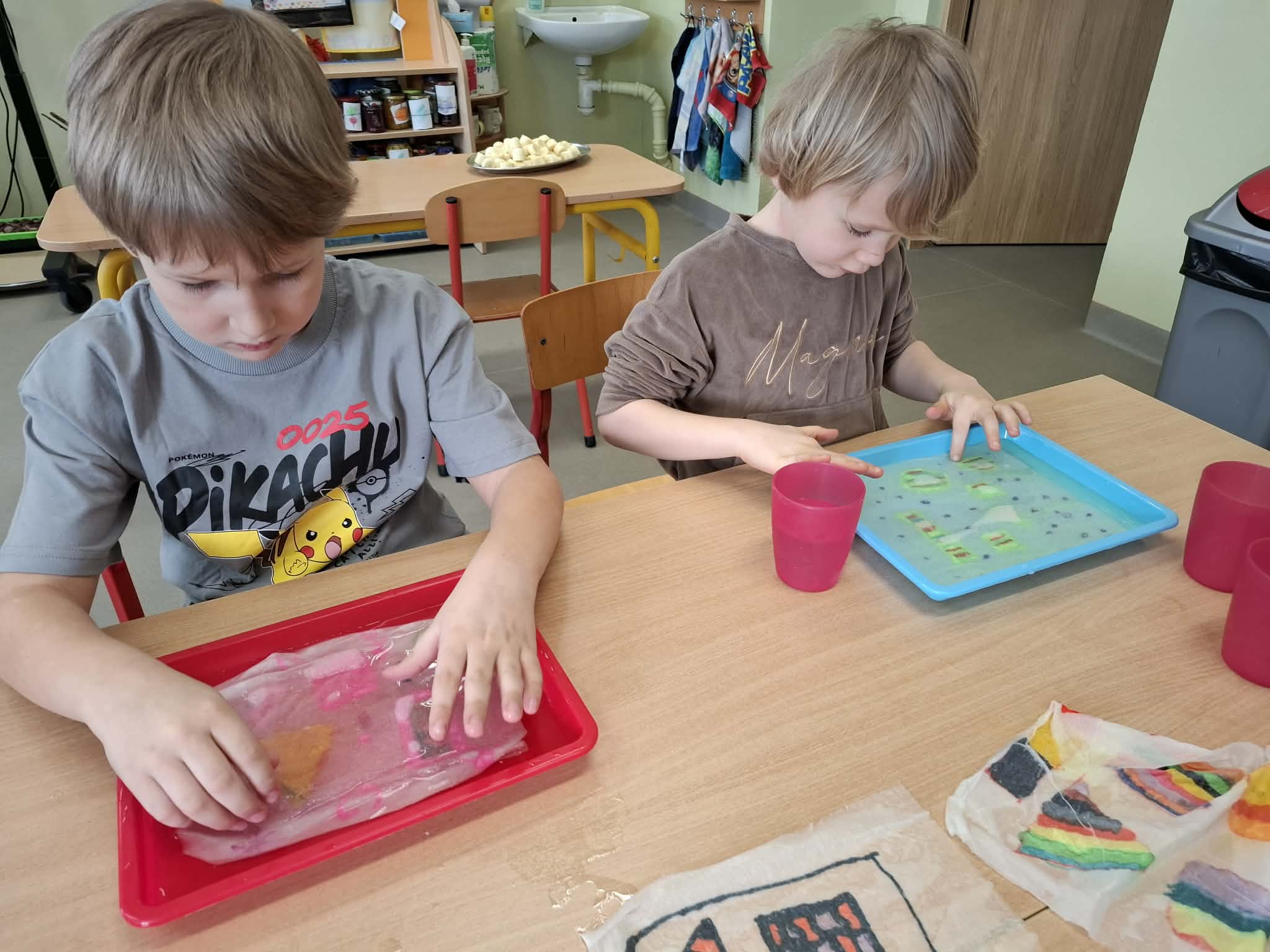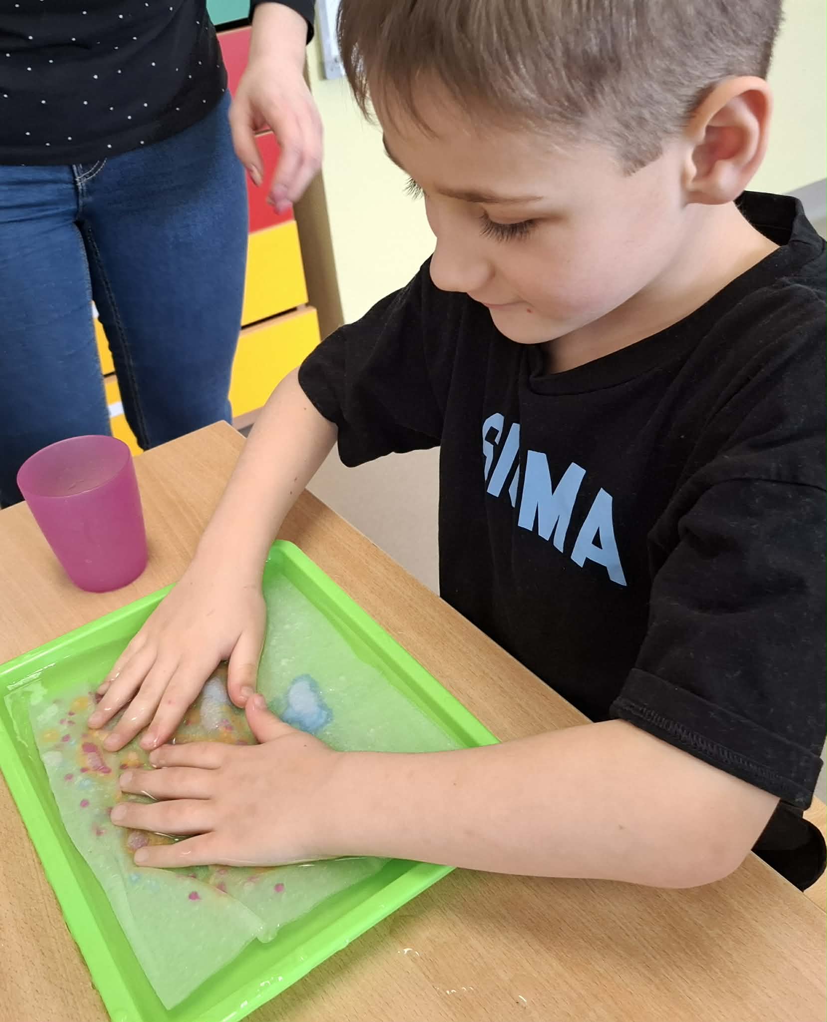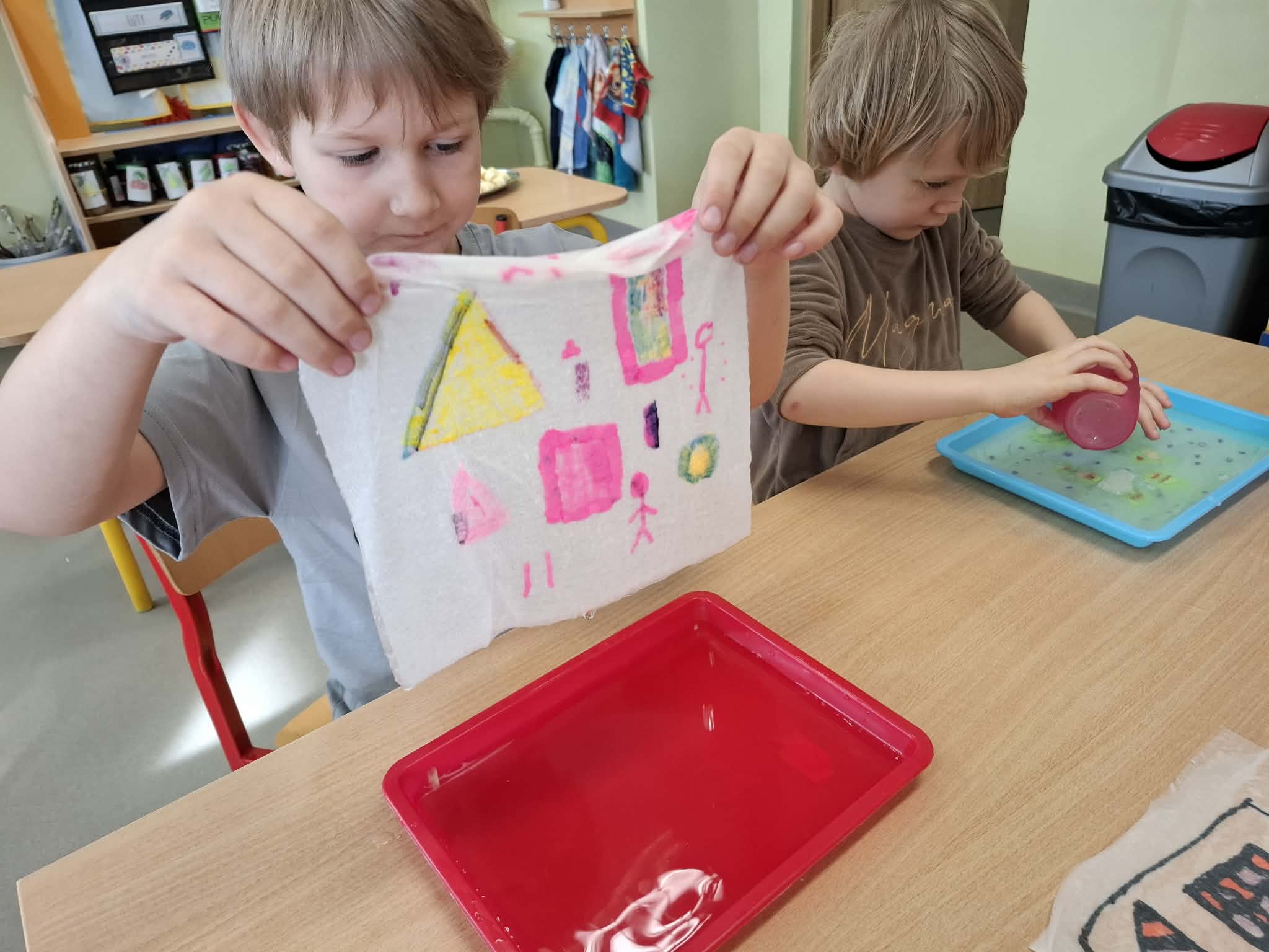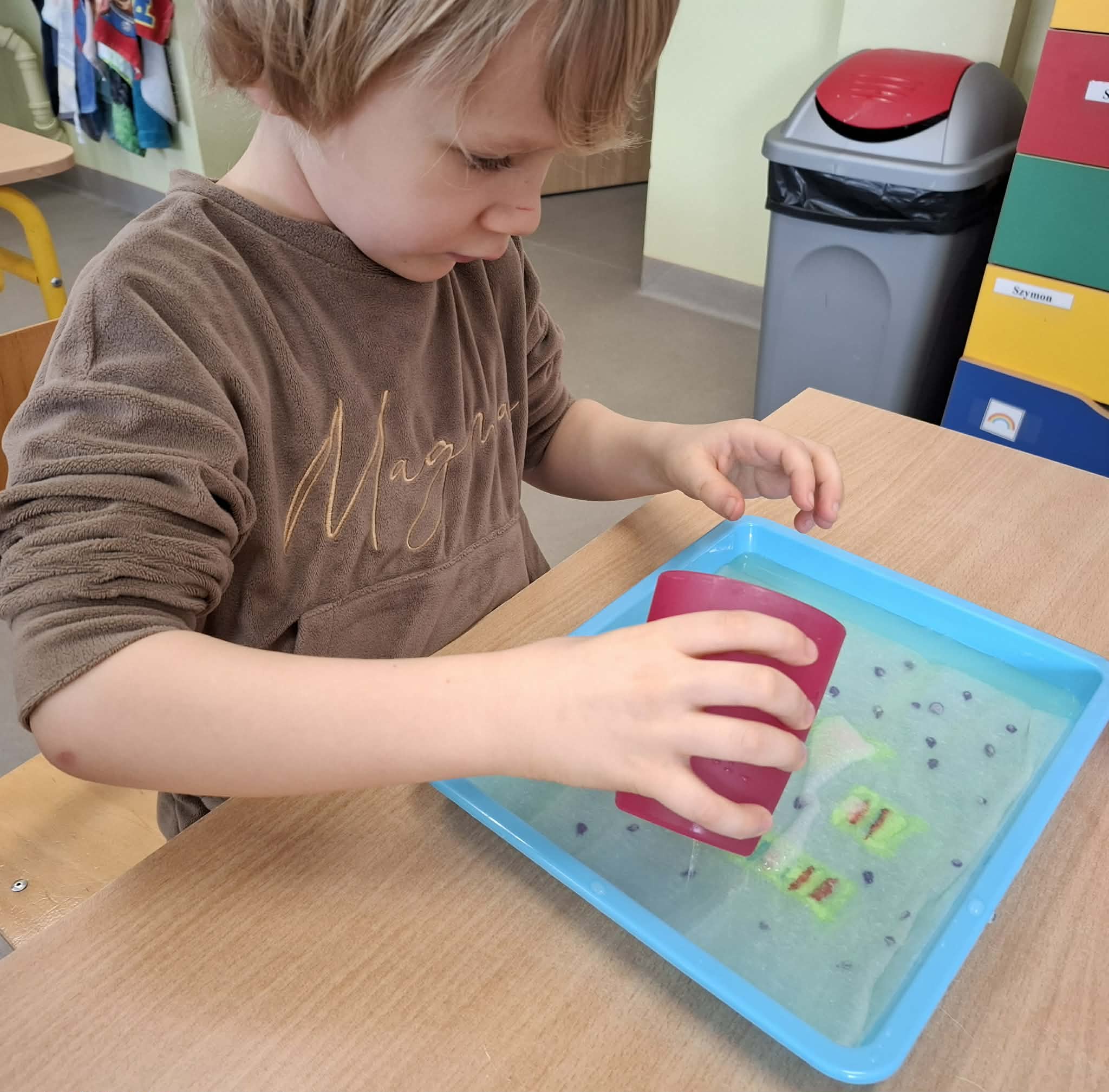 Angażując zmysł wzroku i dotyku ,dzieci wykonały prosty eksperyment, który pobudził ich ciekawość i rozwinął myślenie przyczynowo-skutkowe.