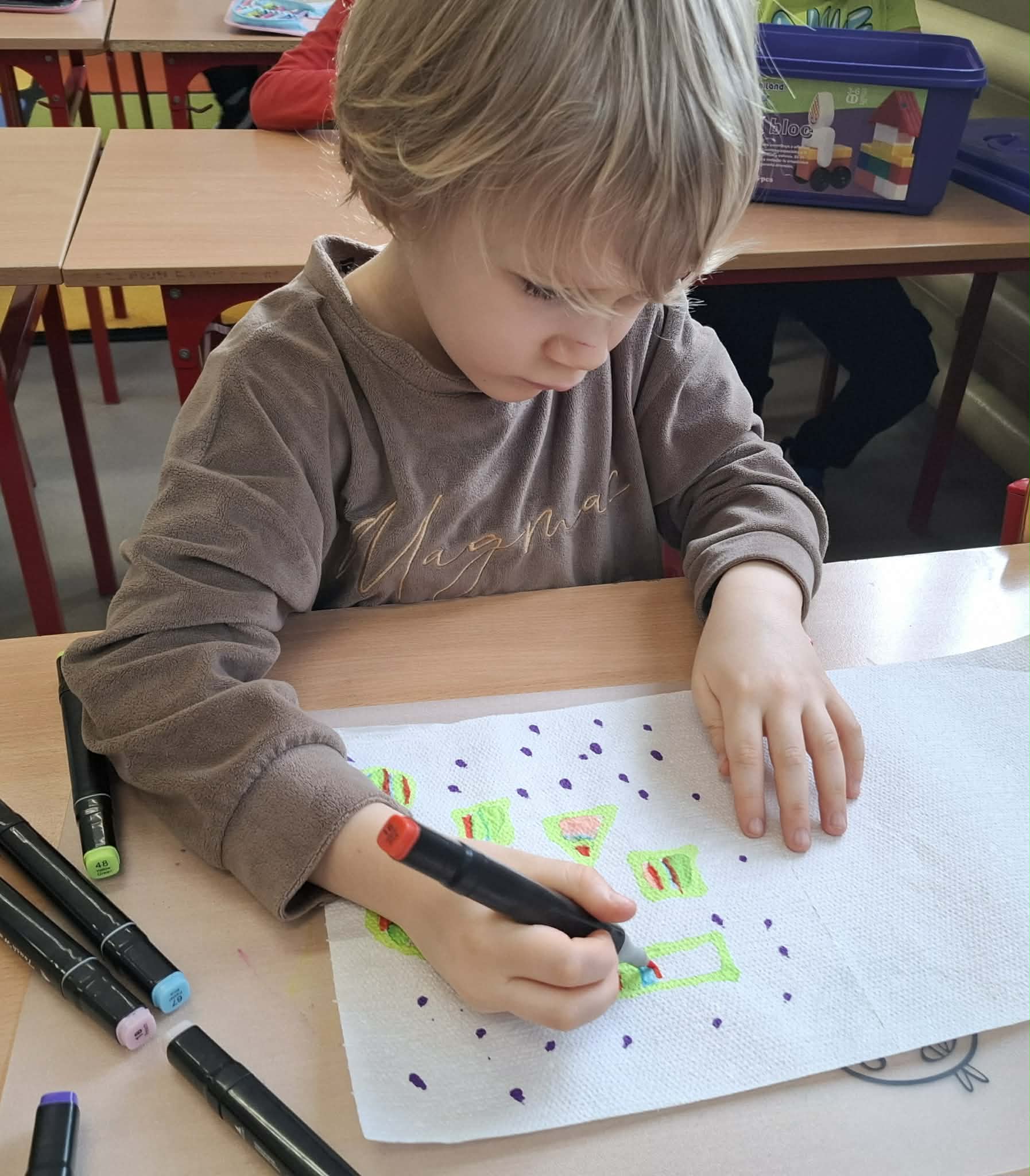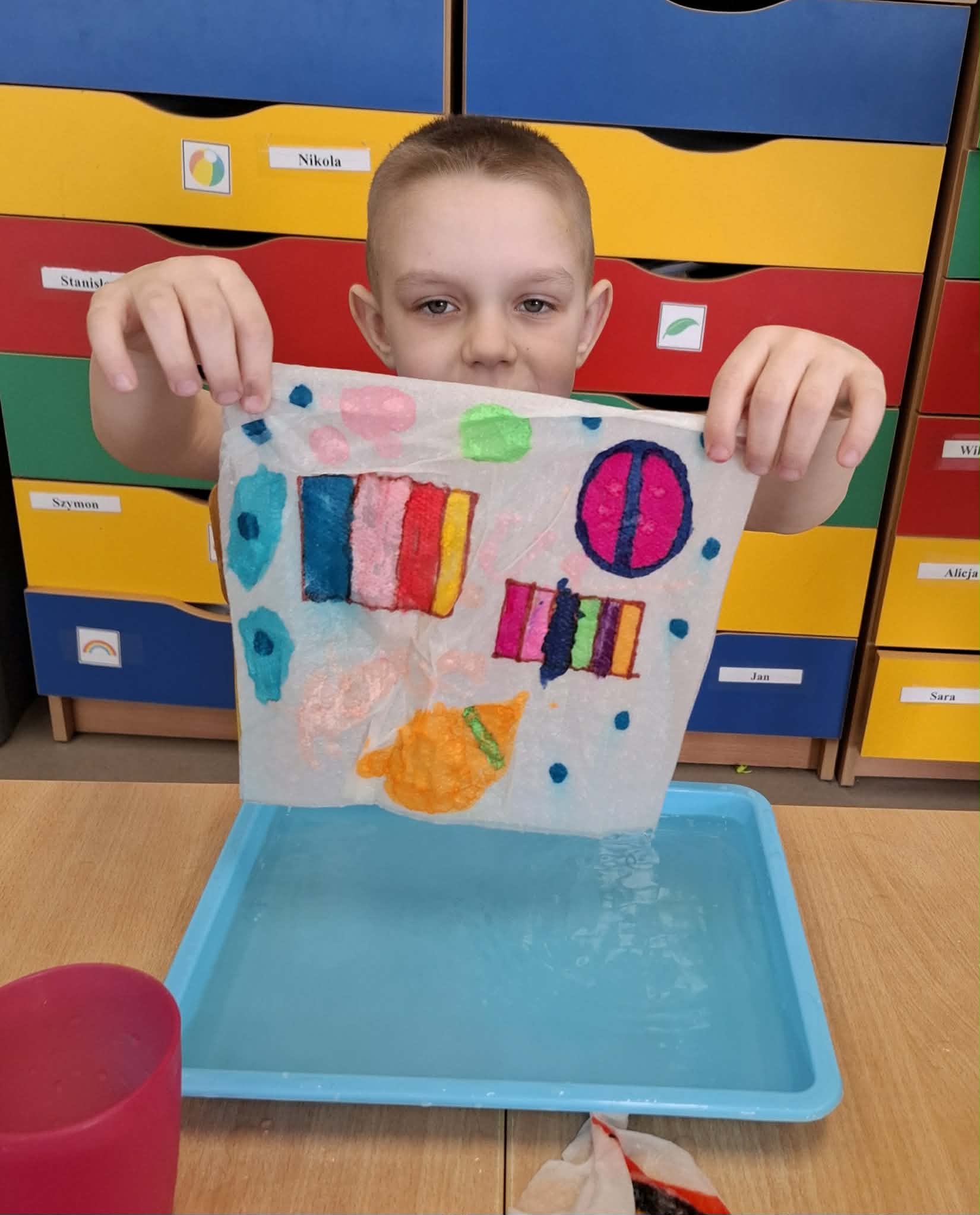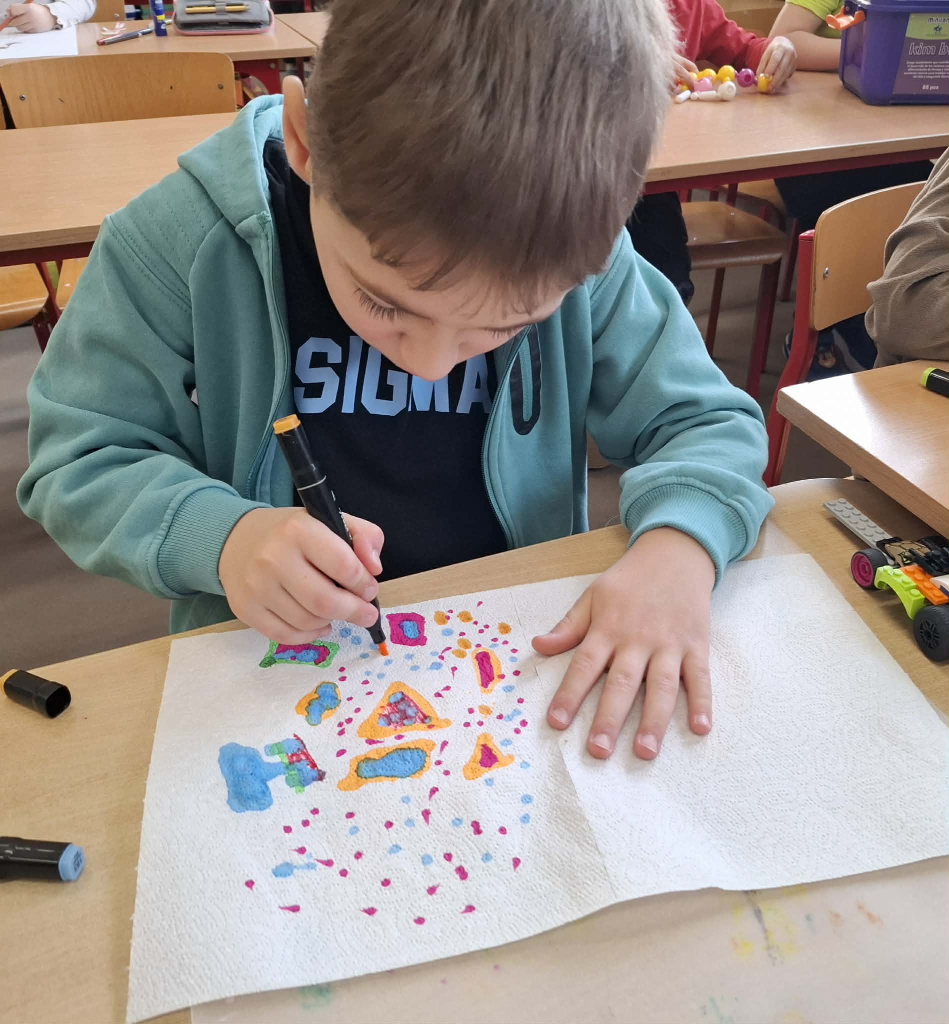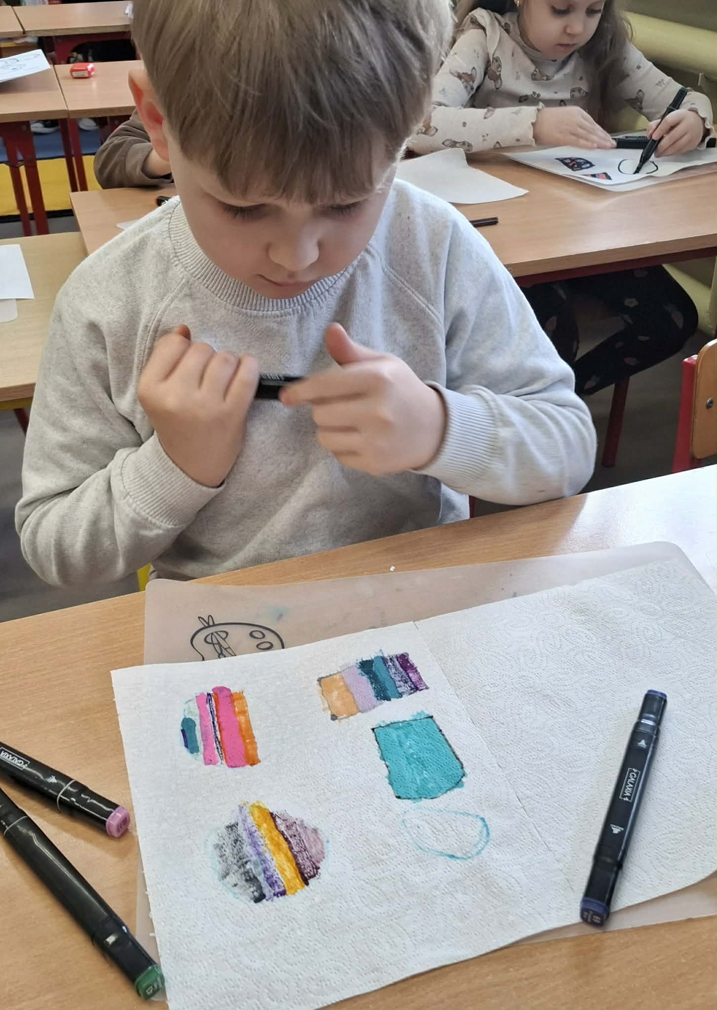 Dziś przedszkolaki zrealizowały piąte zadanie z Ogólnopolskiego Projektu Edukacyjnego “Kreatywna Matematyka”. Na papierowych ręcznikach rysowaly flamastrami figury geometryczne oraz dowolne wzory, składały ręcznik na pół , zanurzały w wodzie i obserwowały , jak kolory rozpuszczają i rozchodzą tworząc efekt “rozmycia”.