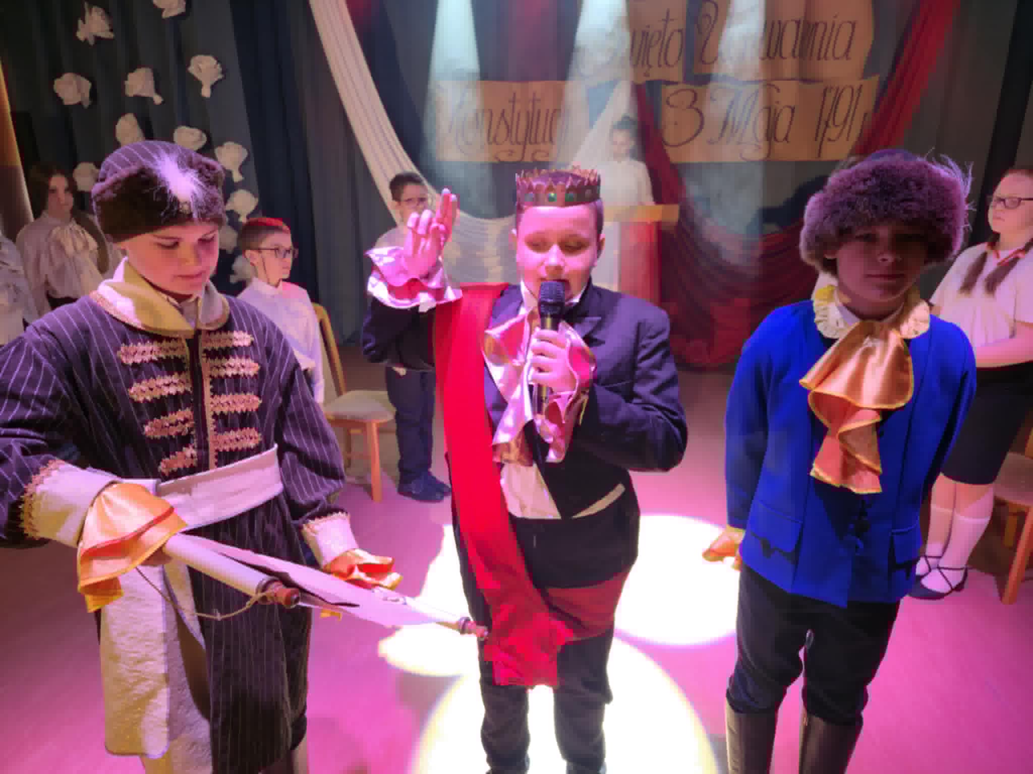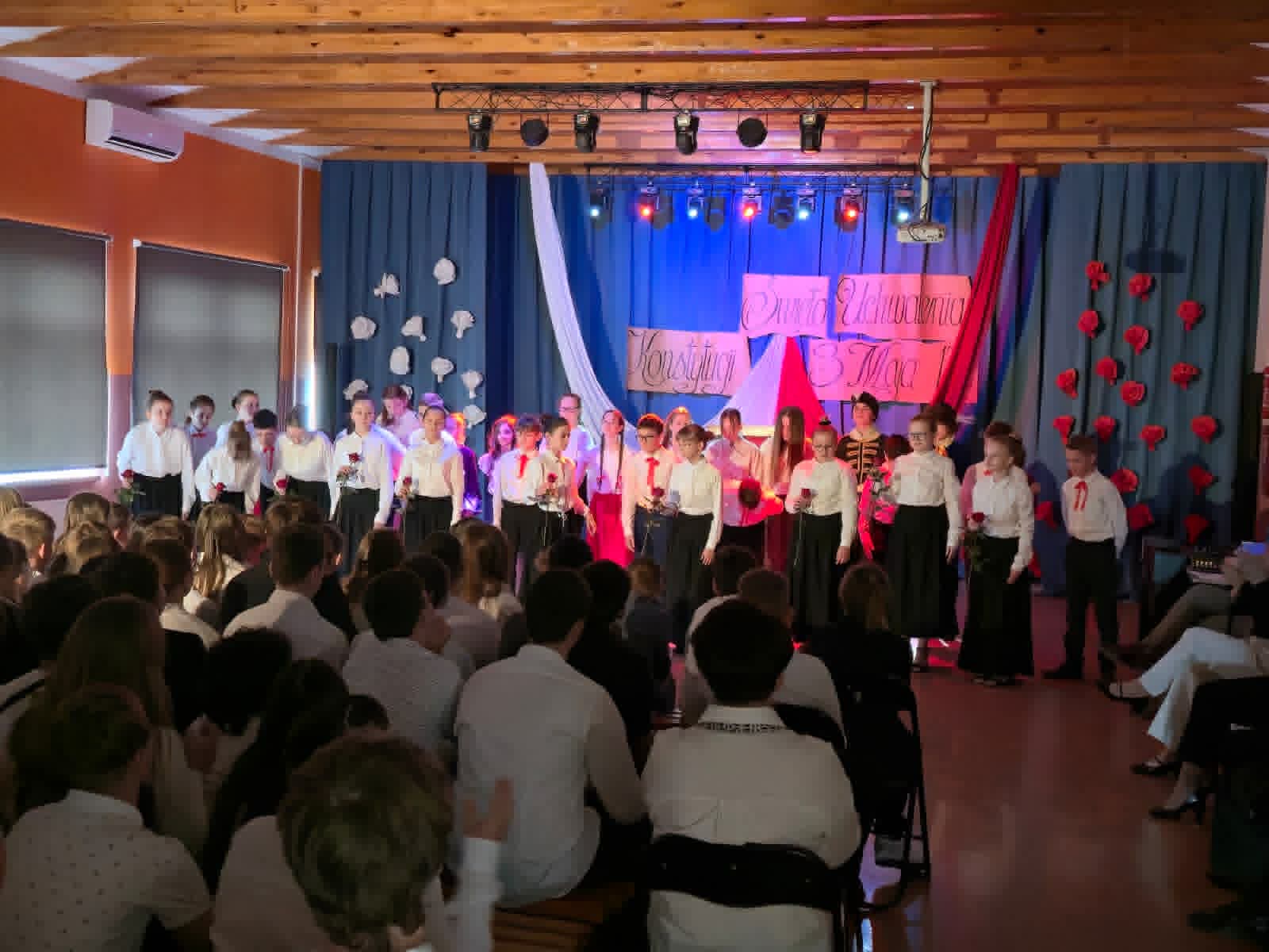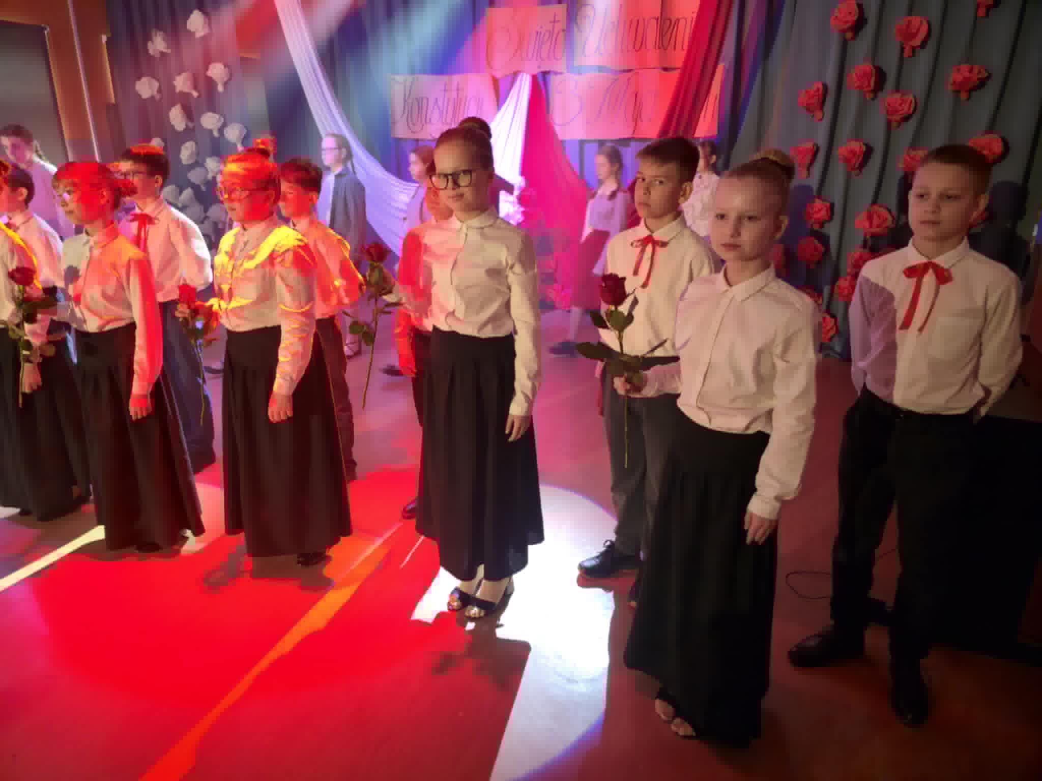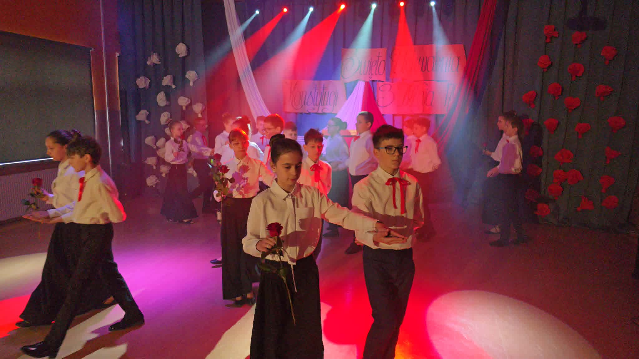 Wolność, Naród, Ojczyzna to hasła przewodnie tegorocznego apelu z okazji 235. rocznicy Uchwalenia Konstytucji 3-go Maja. Uroczystość rozpoczął swoim przemówieniem dyrektor szkoły p. Andrzej Polaszek. Występ artystyczny w wykonaniu uczniów z klasy 5a, 5b, 5c, który miał miejsce 30 kwietnia br. łączył teraźniejszość z przeszłością i przybrał formę sejmiku uczniowskiego, na którym uczniowie mieli okazję poznać ważne fakty historyczne związane z Uchwaleniem Konstytucji. Nie zabrakło wierszy, samodzielnie skomponowanej przez jednego z uczniów prezentacji instrumentalnej oraz piosenek odzwierciedlających klimat tamtych wydarzeń. Zwieńczeniem występu było zatańczenie niezwykle uroczystego poloneza przygotowanego pod profesjonalnym okiem p. A. Rozpędowskiego. Dopełnieniem całości była przepiękna i elegancka dekoracja w biało-czerwonych barwach wykonana przez p. Małgorzatę Hejman z pomocą p. I. Zakrzewskiej. Oryginalną i twórczą oprawę muzyczną tego przedsięwzięcia przygotował p. T. Cybulski. Nad całością montażu słowno-muzycznego czuwały autorki scenariusza i jednocześnie reżyserki przedstawienia- p. A. Jezierska, p . E. Staniszewska, p. A. Waloszek. Fotorelację z uroczystości wykonał p. Krzysztof Banasiak.