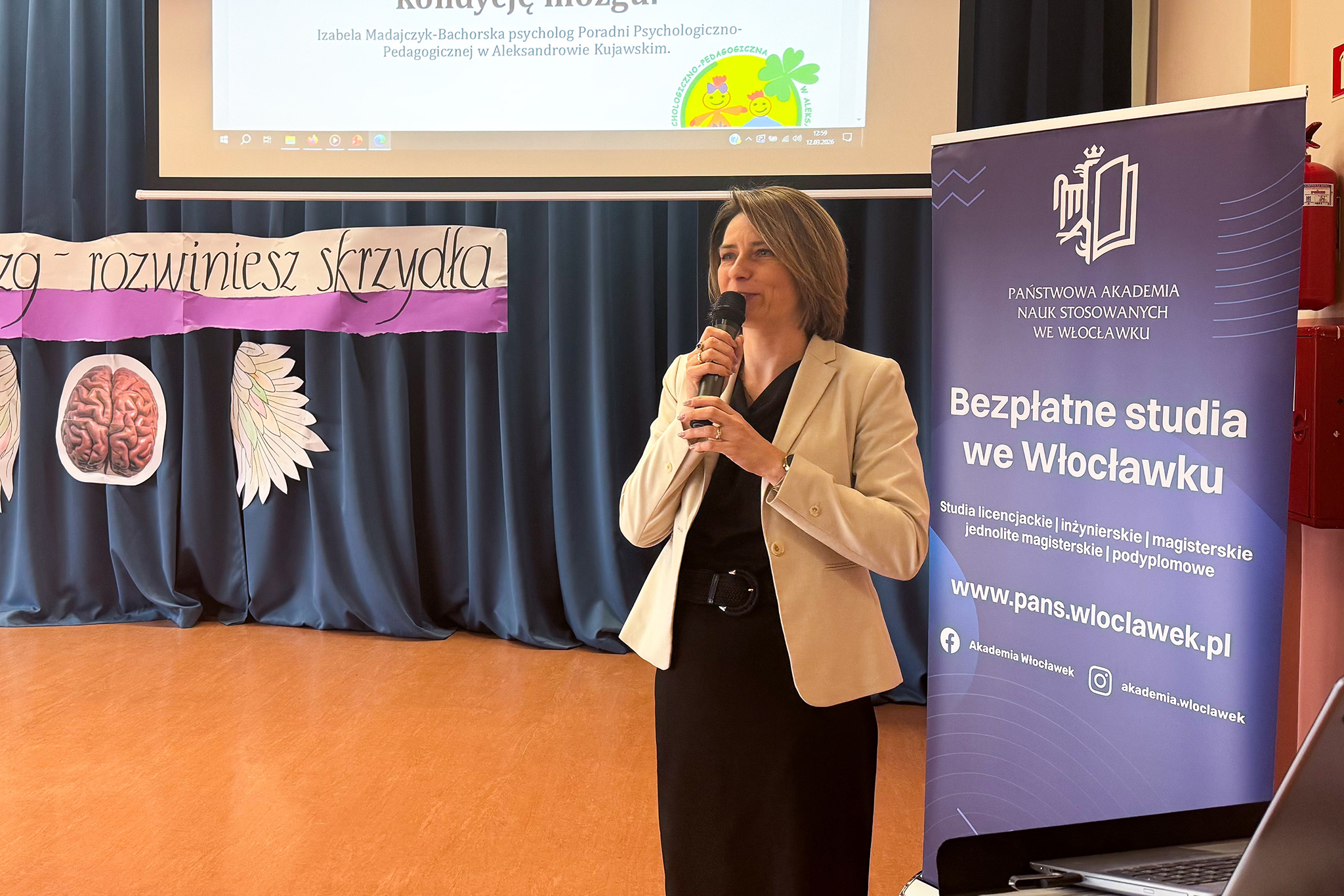 Kolejny wykład wygłosiła p. Izabela Madajczyk-Bachorska, psycholog z Poradni Psychologiczno-Pedagogicznej w Aleksandrowie Kujawskim pt. „Mózg Twoim najlepszym przyjacielem – jak dbać o kondycję mózgu”. Prelegentka zwróciła uwagę na rolę zabawy, ale i pozytywnej dyscypliny w edukacji. Omówiła zagadnienie prawidłowego odżywiania się, odpoczynku, aktywności fizycznej oraz właściwych nawyków sprzyjających efektywnemu uczeniu się.