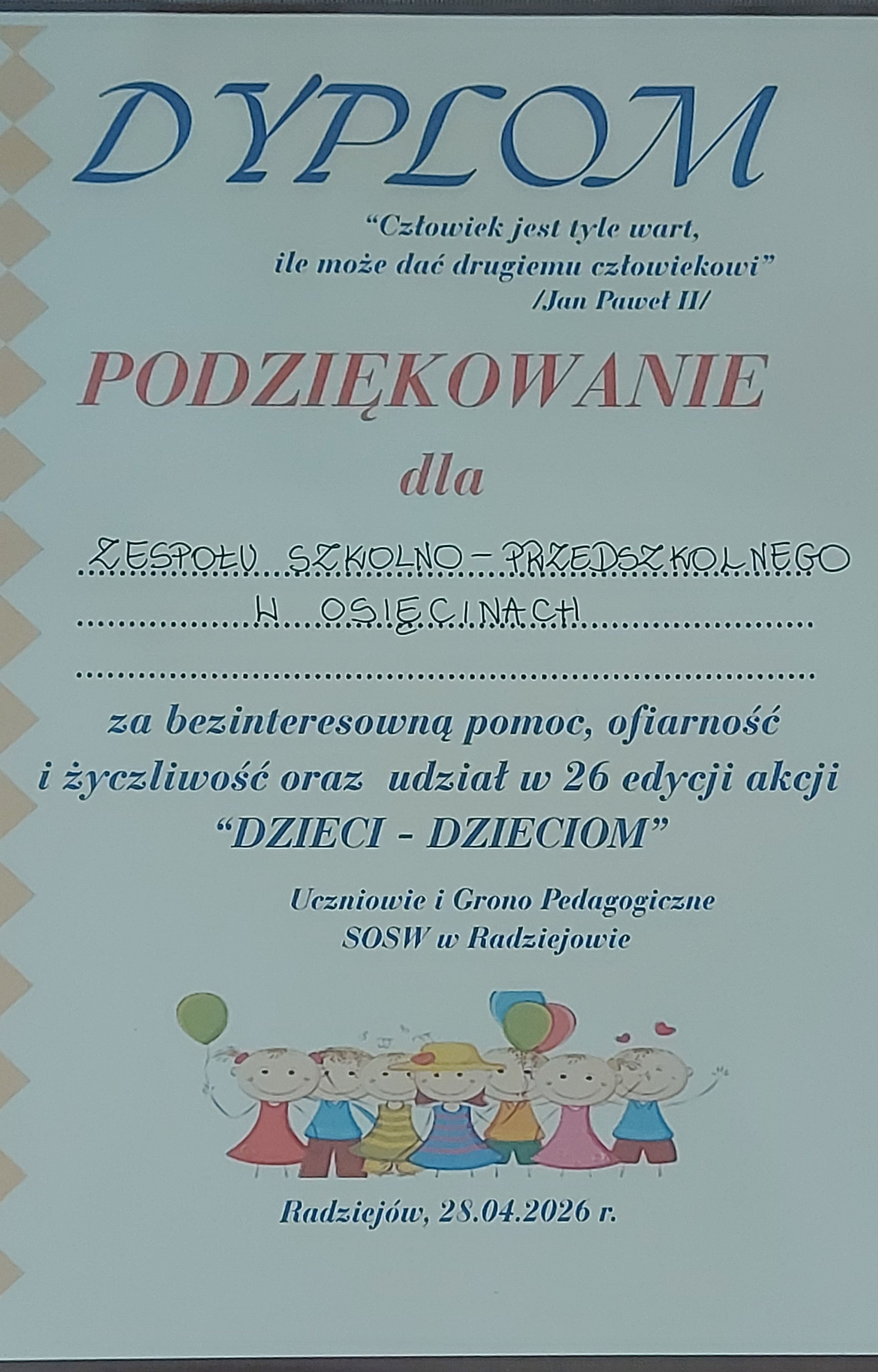 28 kwietnia 2026r.  delegacja Szkoły Podstawowej w Osięcinach, pod opieką p. Agnieszki Matkowskiej i p. Agnieszki Trawińskiej  wzięła udział w uroczystej gali podsumowującej 26. edycję akcji charytatywnej „Dzieci – Dzieciom”, która odbyła się w auli Liceum Ogólnokształcącego im. Władysława Łokietka w Radziejowie.