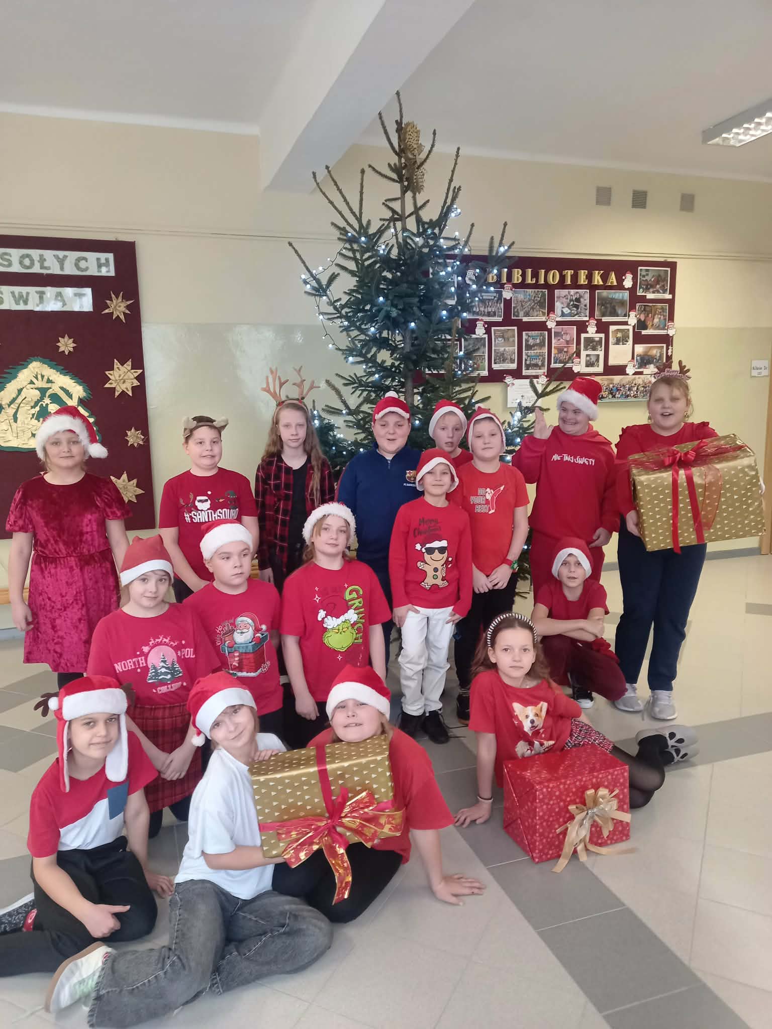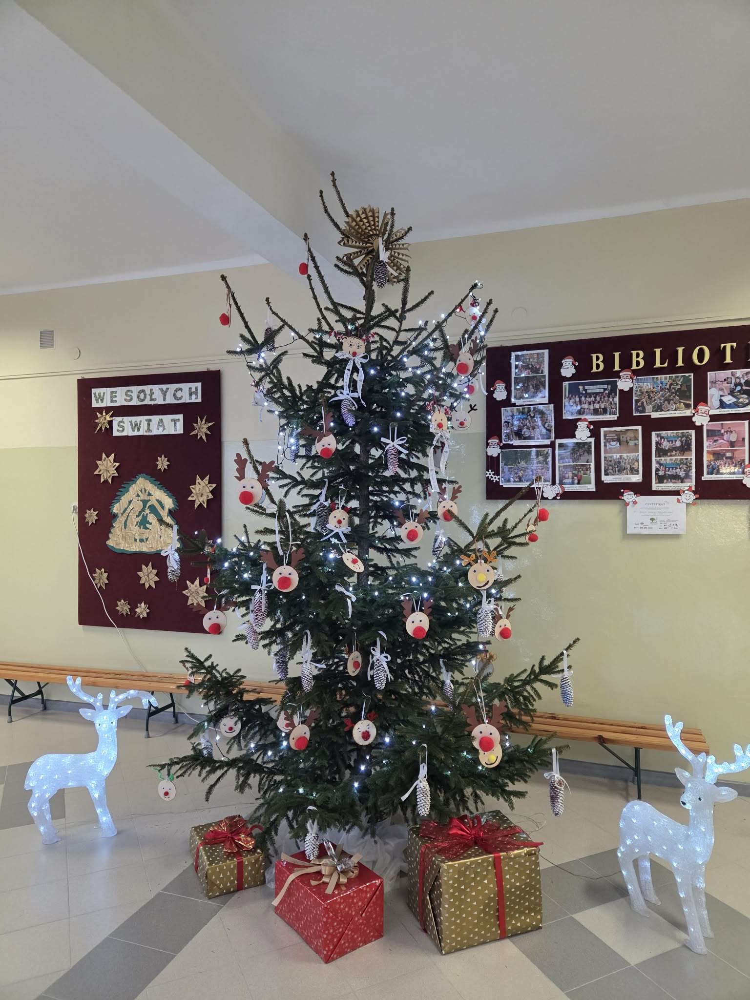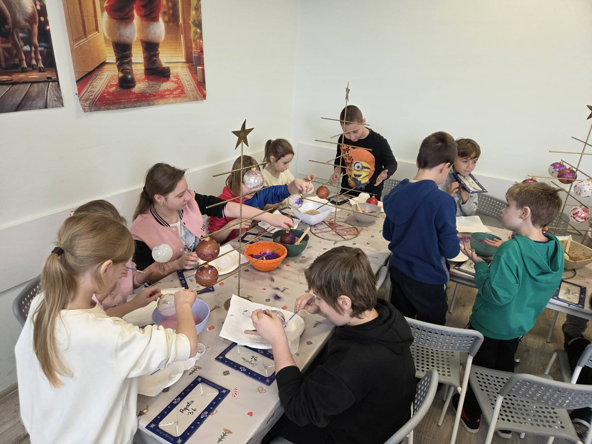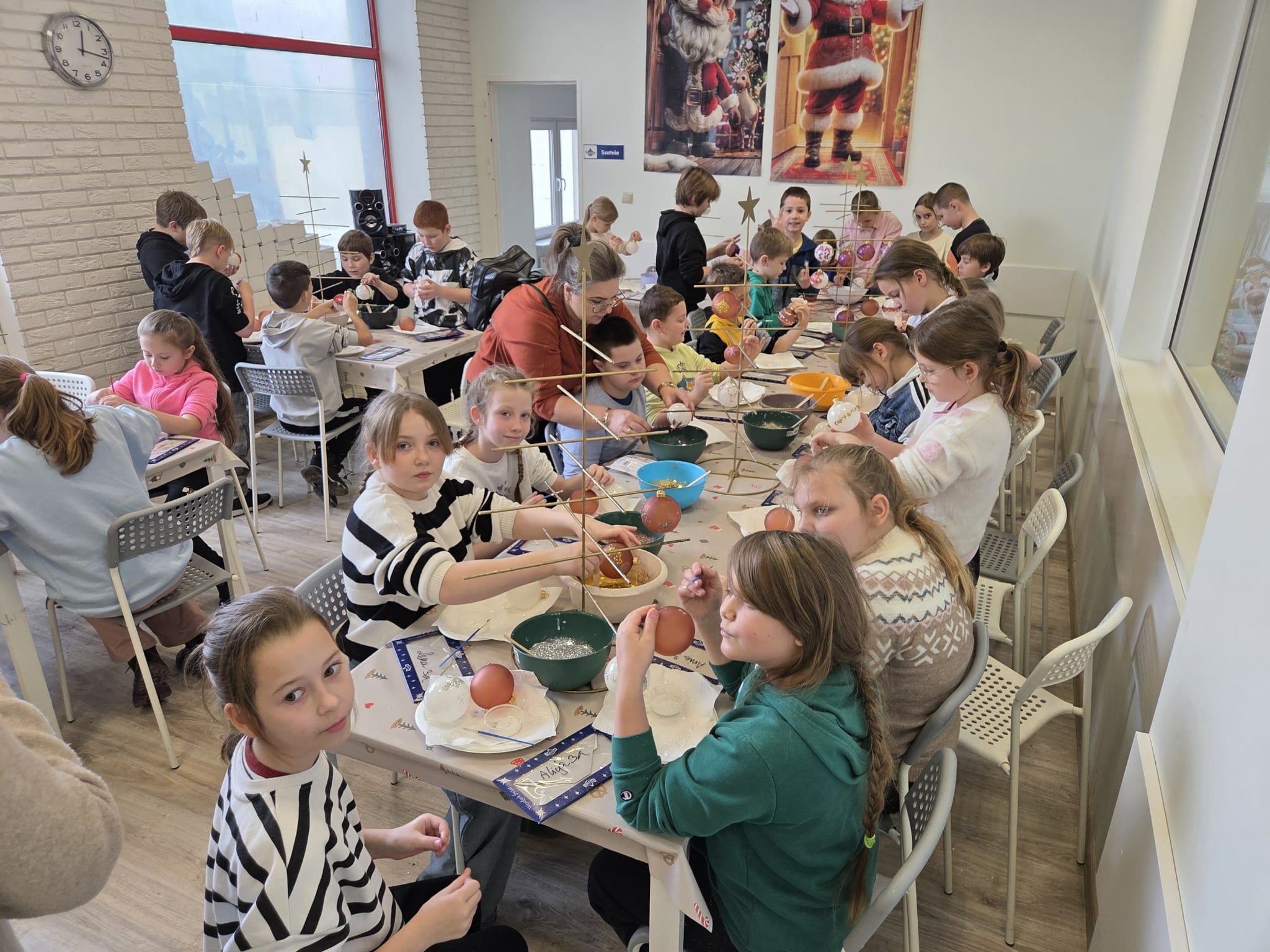 Uczniowie klas 3a i 3b aktywnie włączyli się w dekorowanie holu szkolnego, przygotowując świąteczne ozdoby i tworząc wyjątkowy klimat w przestrzeni szkolnej.
