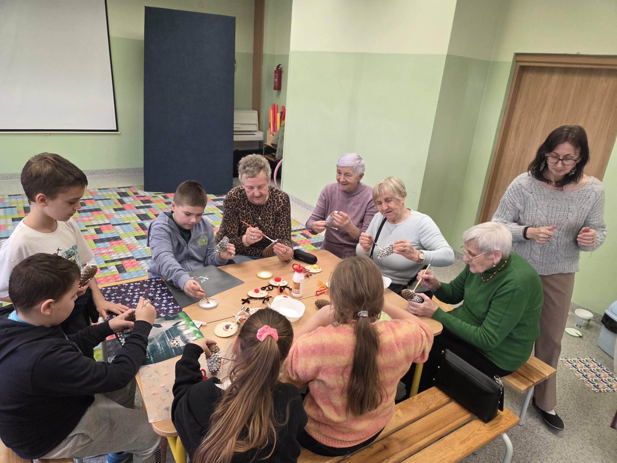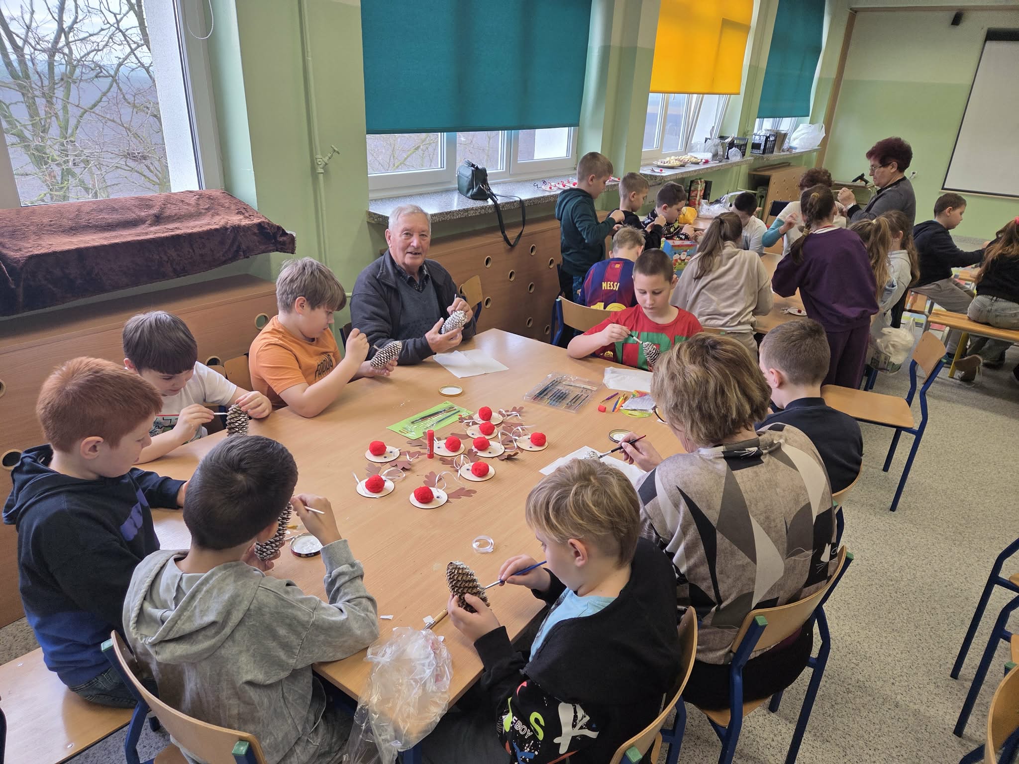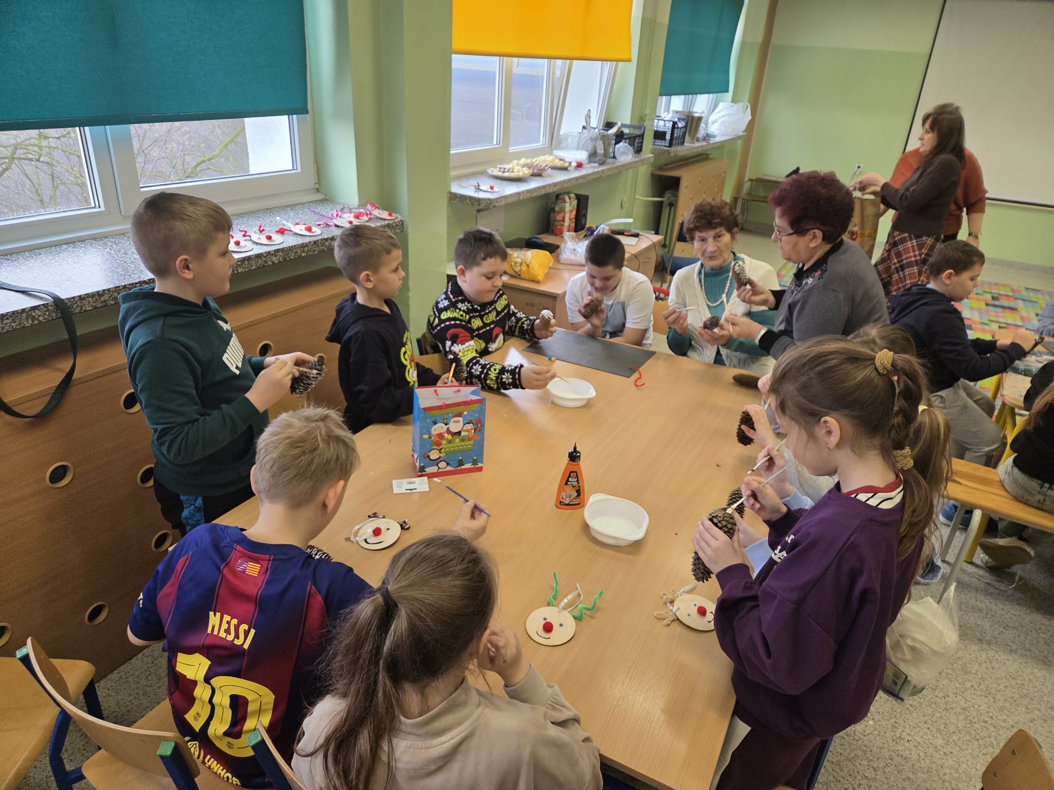 Szczególnym wydarzeniem w klasach 3a i 3b realizowanym w ramach projektu były warsztaty międzypokoleniowe z udziałem seniorów, podczas których goście dzielili się wspomnieniami i opowieściami o dawnych tradycjach bożonarodzeniowych. Uczniowie mieli okazję poznać dawne tradycje i obyczaje Świąt Bożego Narodzenia. W miłej, rodzinnej atmosferze dzieci wraz z seniorami wykonywały świąteczne ozdoby, m.in. bożonarodzeniowe szyszki oraz renifery z materiałów ekologicznych, które stały się piękną dekoracją choinki. Choinka ta, nazwana już w ubiegłym roku „Senioritką”, stała się symbolem współpracy międzypokoleniowej oraz wspólnego pielęgnowania tradycji świątecznych.