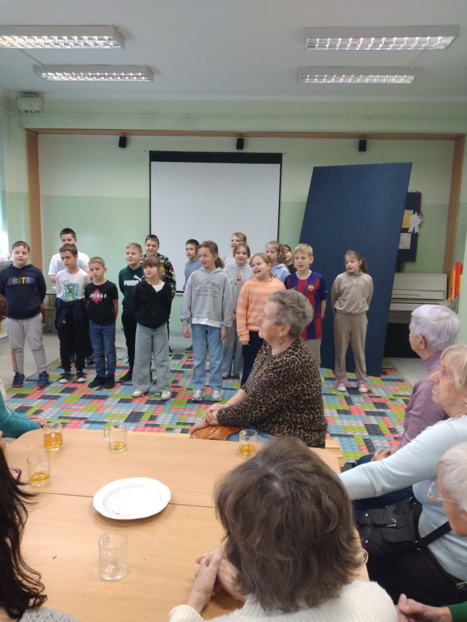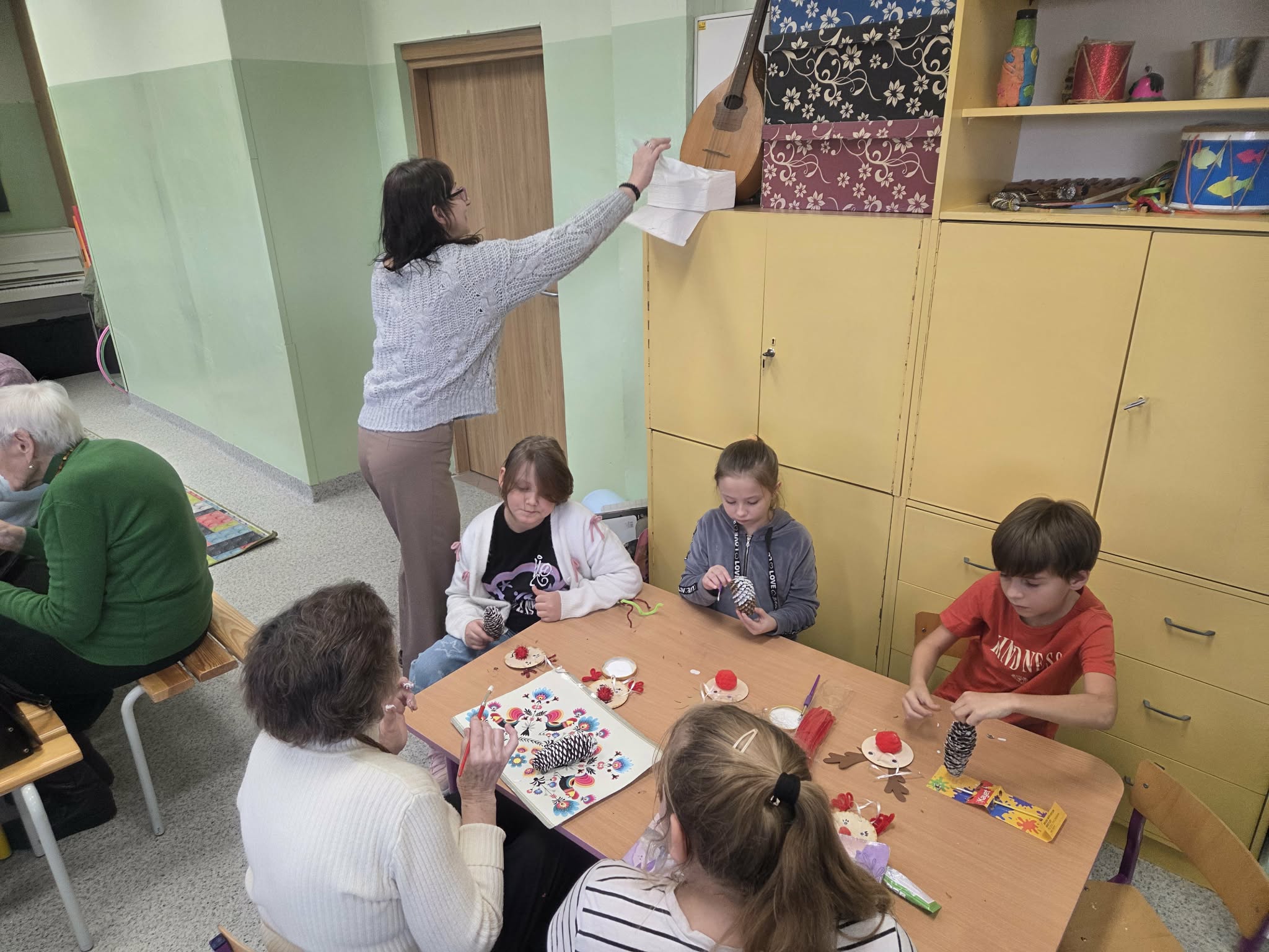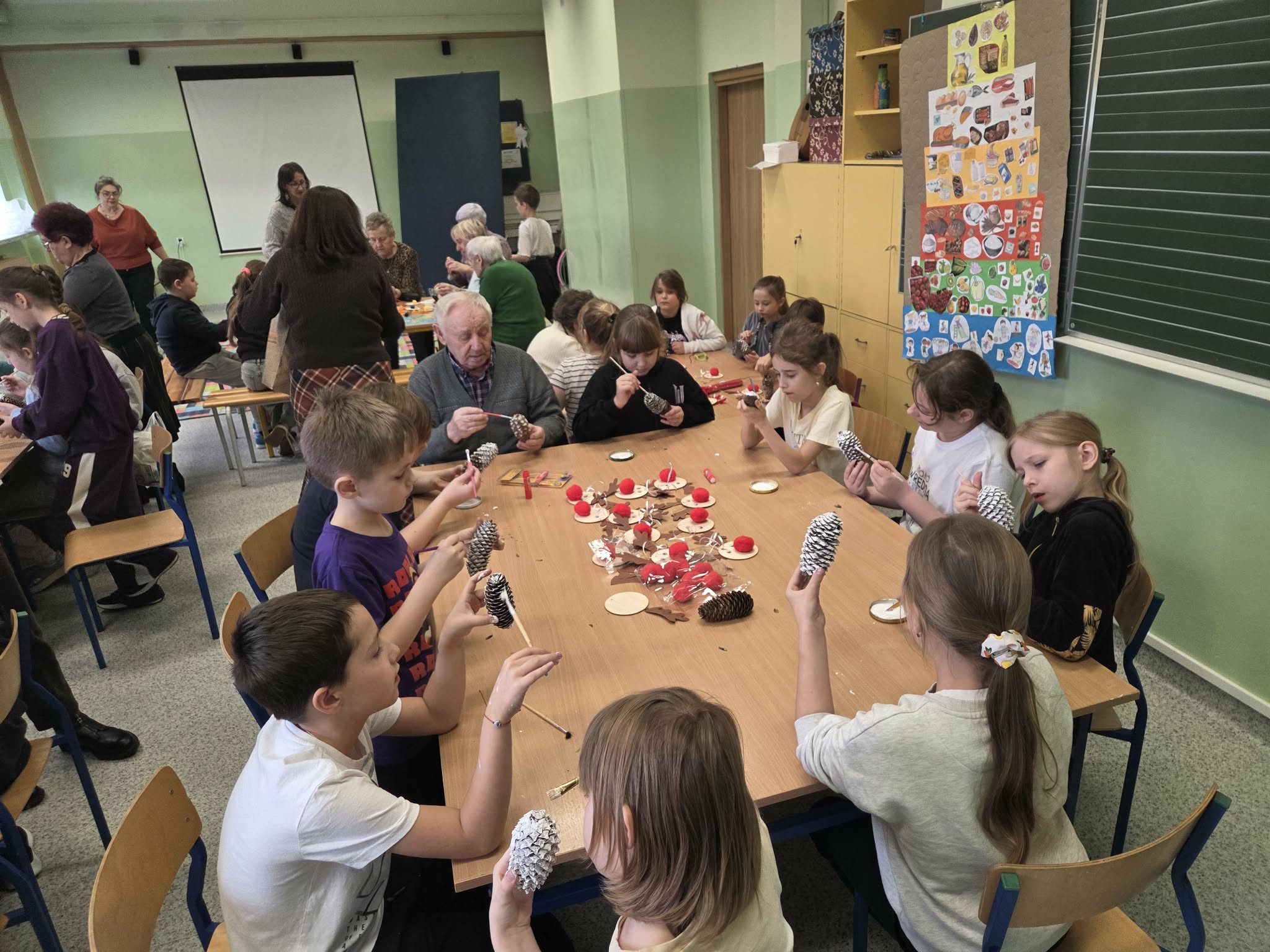 Szczególnym wydarzeniem w klasach 3a i 3b realizowanym w ramach projektu były warsztaty międzypokoleniowe z udziałem seniorów, podczas których goście dzielili się wspomnieniami i opowieściami o dawnych tradycjach bożonarodzeniowych. Uczniowie mieli okazję poznać dawne tradycje i obyczaje Świąt Bożego Narodzenia. W miłej, rodzinnej atmosferze dzieci wraz z seniorami wykonywały świąteczne ozdoby, m.in. bożonarodzeniowe szyszki oraz renifery z materiałów ekologicznych, które stały się piękną dekoracją choinki. Choinka ta, nazwana już w ubiegłym roku „Senioritką”, stała się symbolem współpracy międzypokoleniowej oraz wspólnego pielęgnowania tradycji świątecznych.