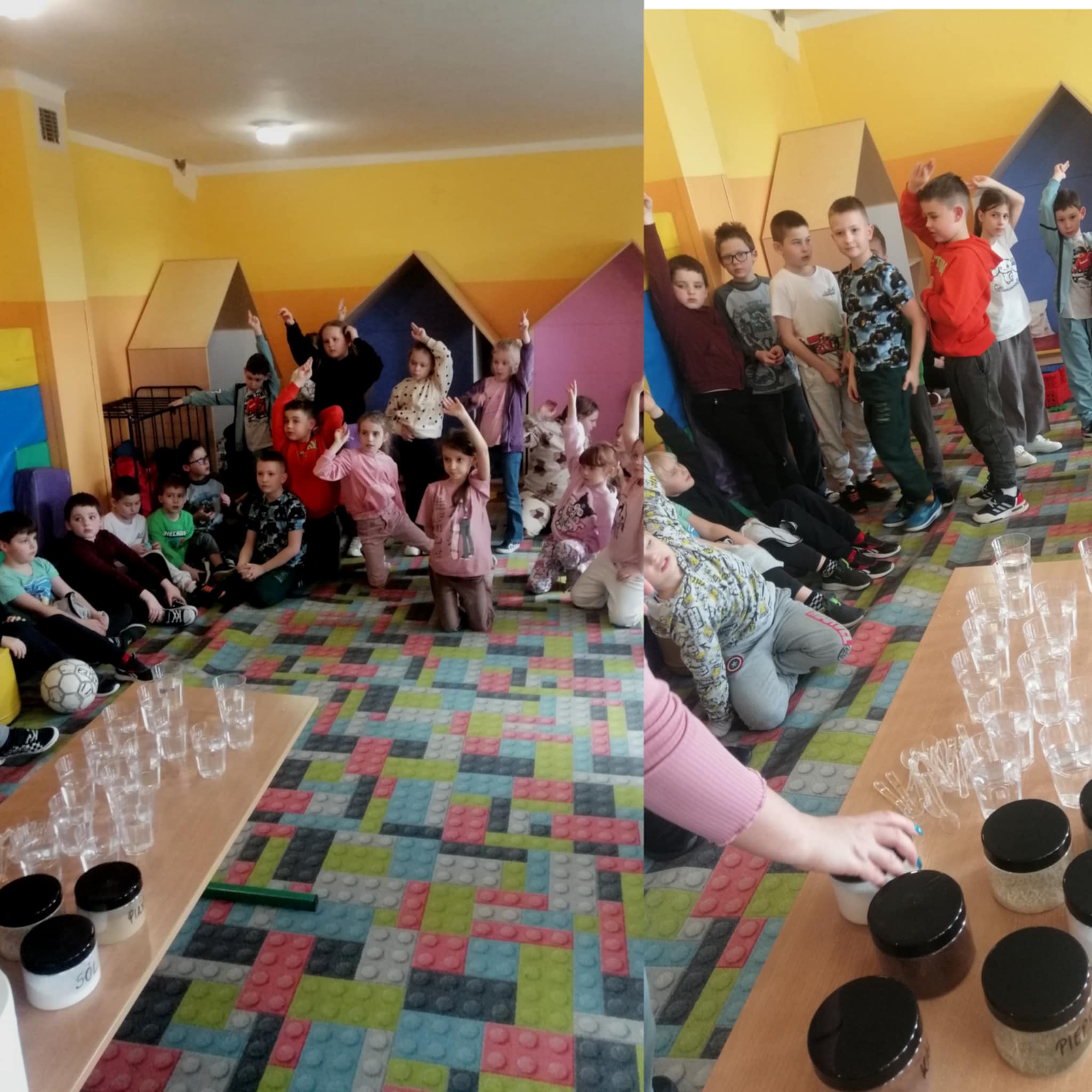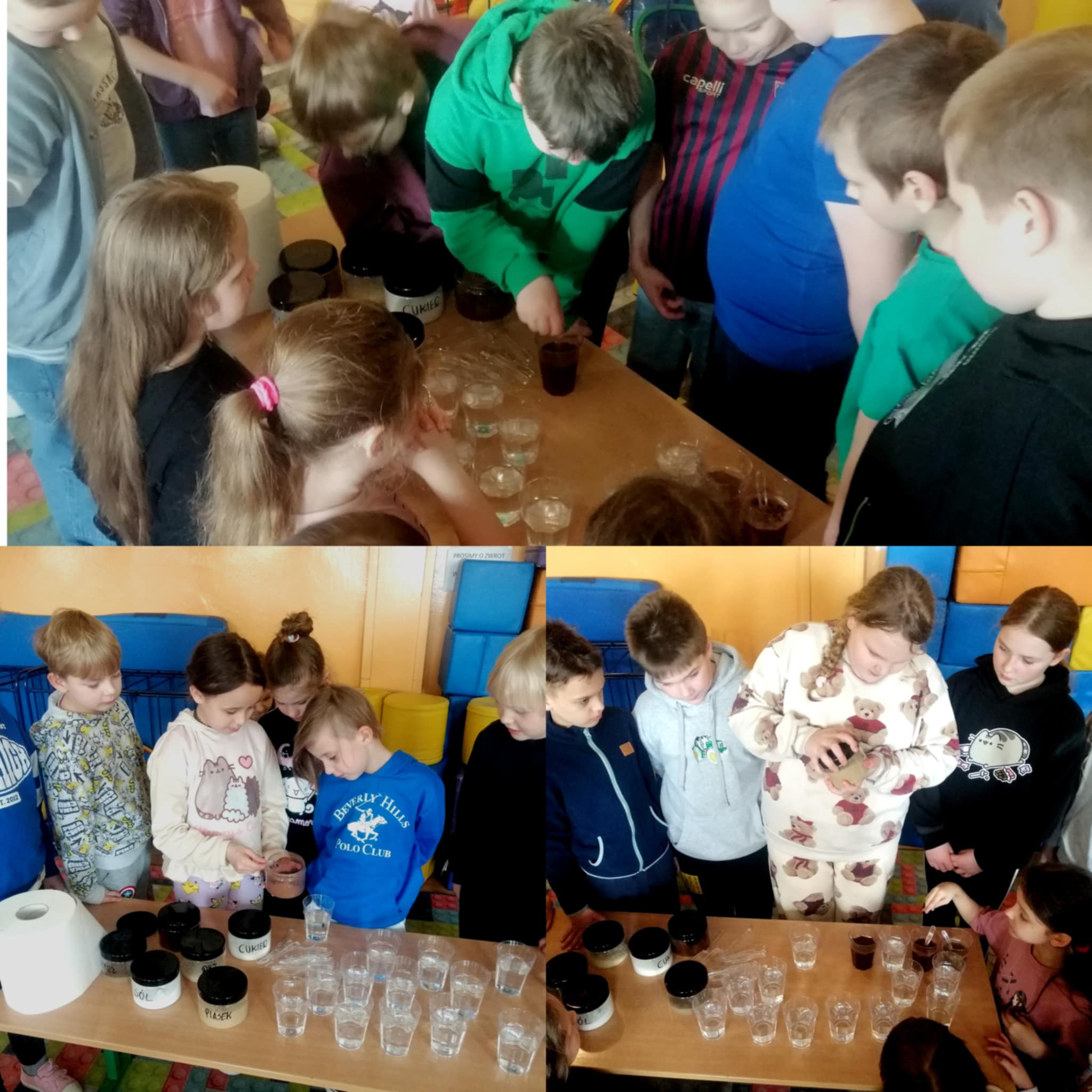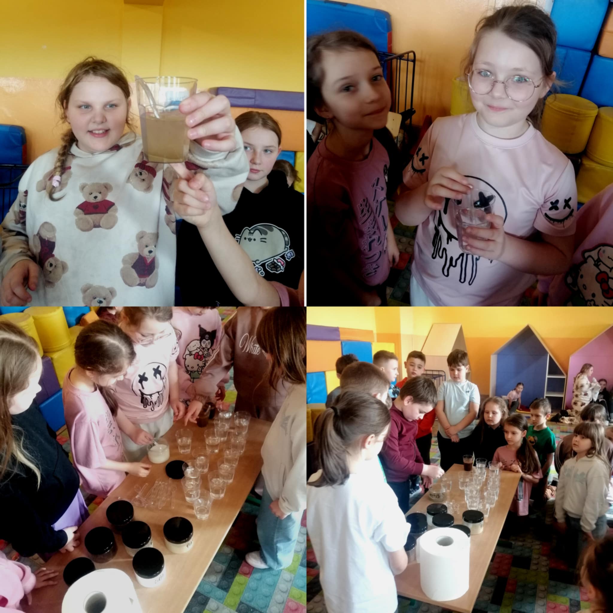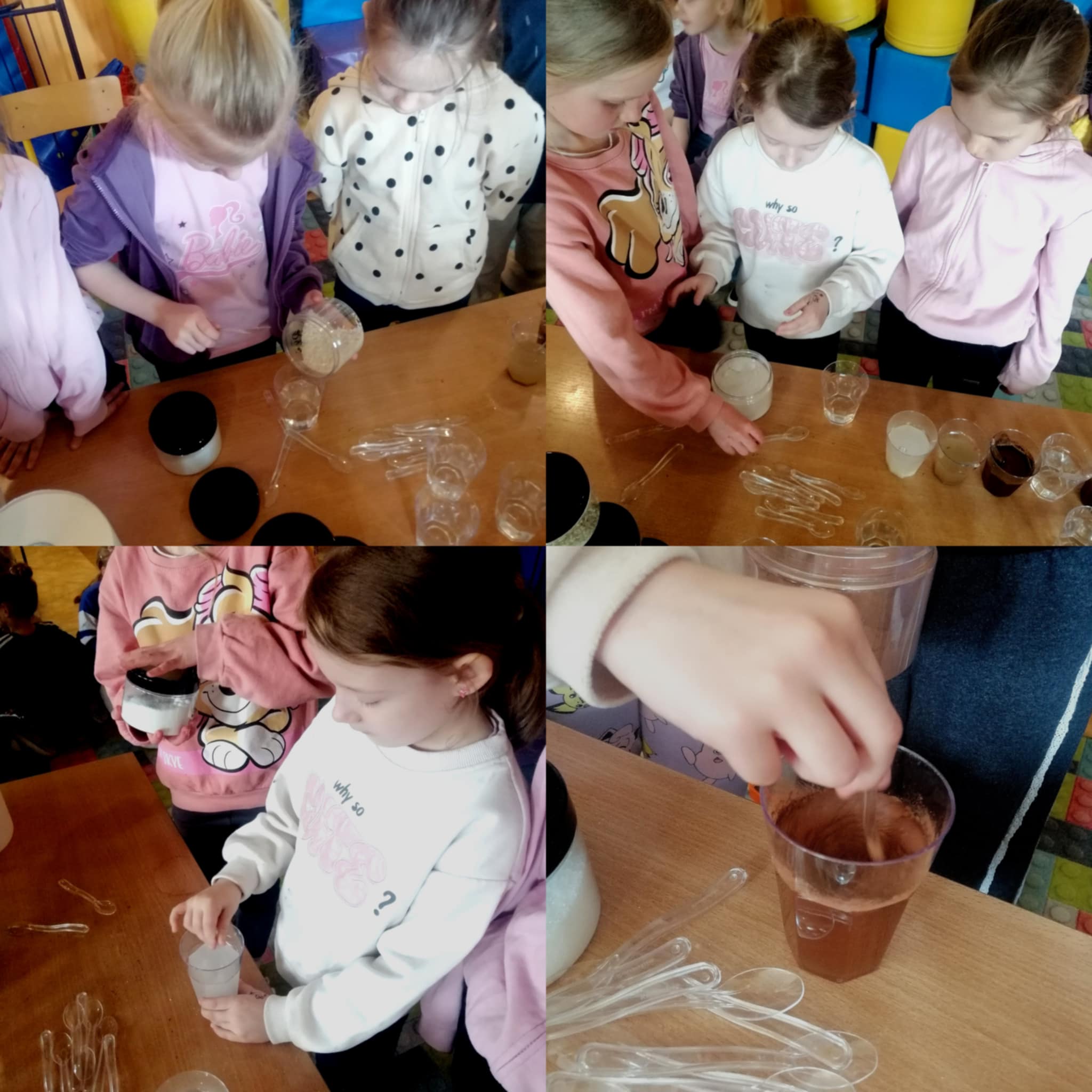 Dzieci z dużym zaangażowaniem uczestniczą w zajęciach, poznając różne zjawiska zachodzące w przyrodzie. Na zdjęciu przedstawiono przykładowe doświadczenie ukazujące zjawisko rozpuszczania substancji w wodzie.