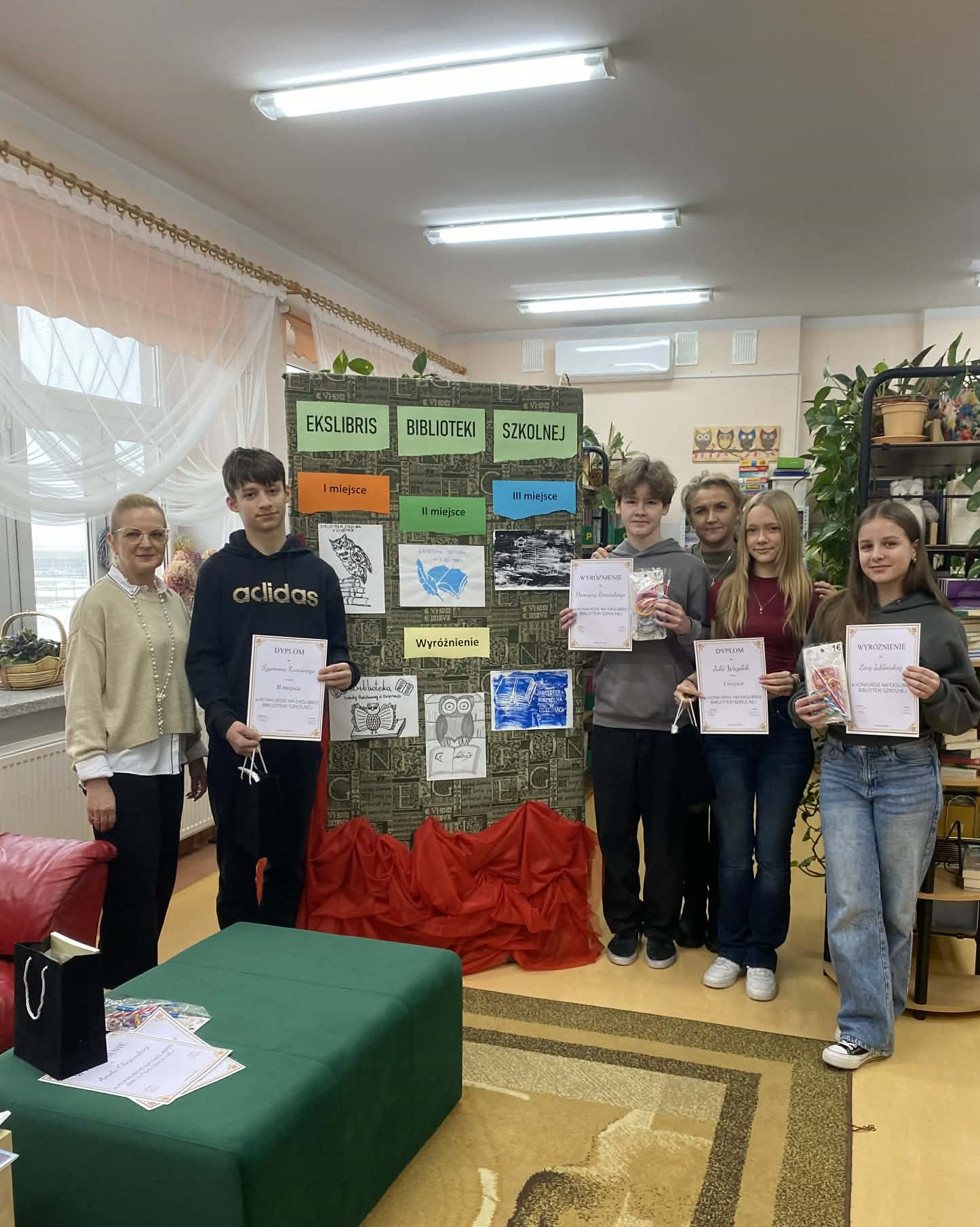 Laureaci otrzymali dyplomy, nagrody książkowe, upominki rzeczowe i słodycze.Celami konkursu było rozwijanie wrażliwości estetycznej i umiejętności plastycznych uczniów, popularyzacja czytelnictwa oraz promowanie biblioteki i kultury książki, a także tworzenie oryginalnych projektów graficznych dla biblioteki szkolnej.