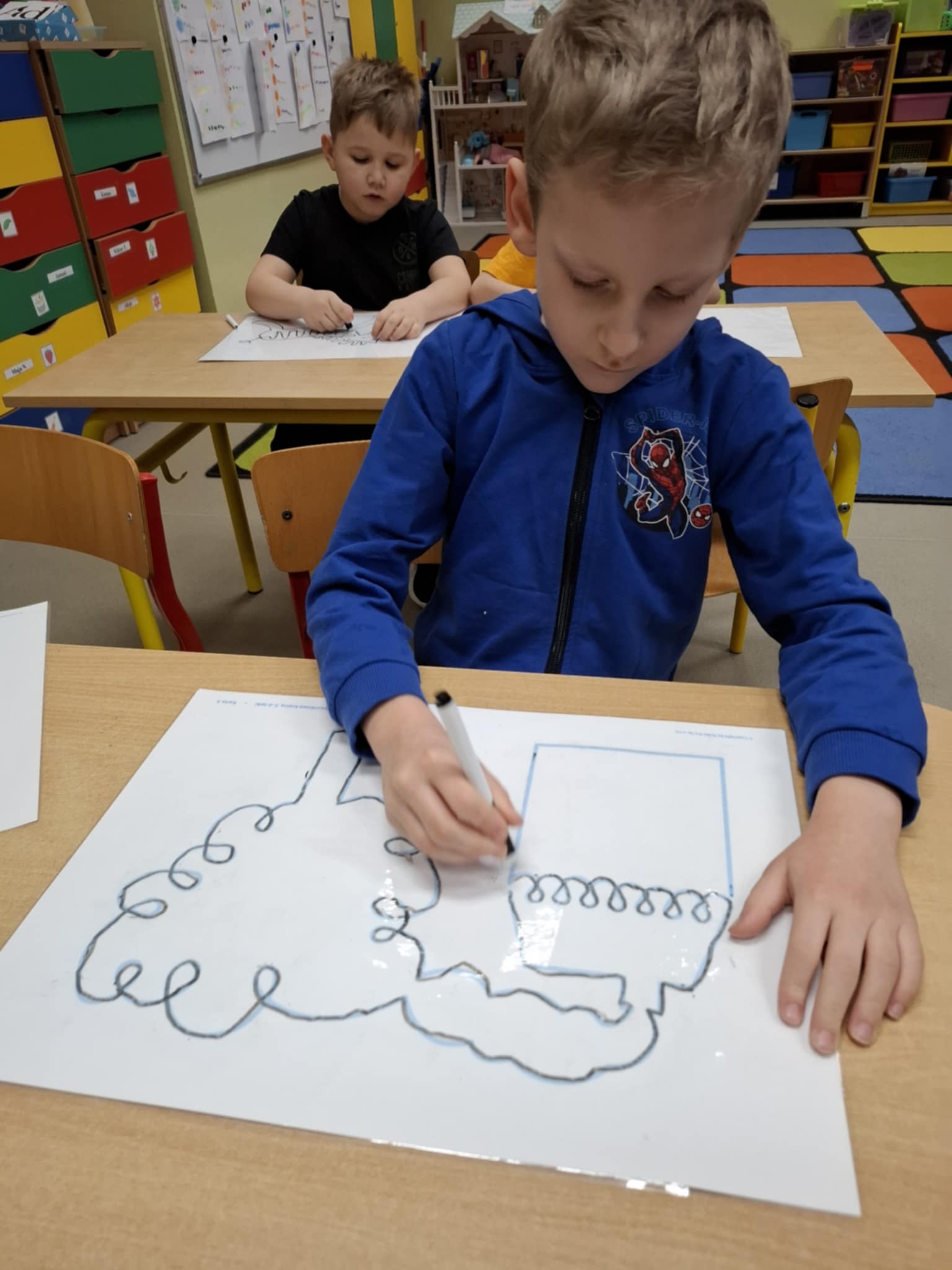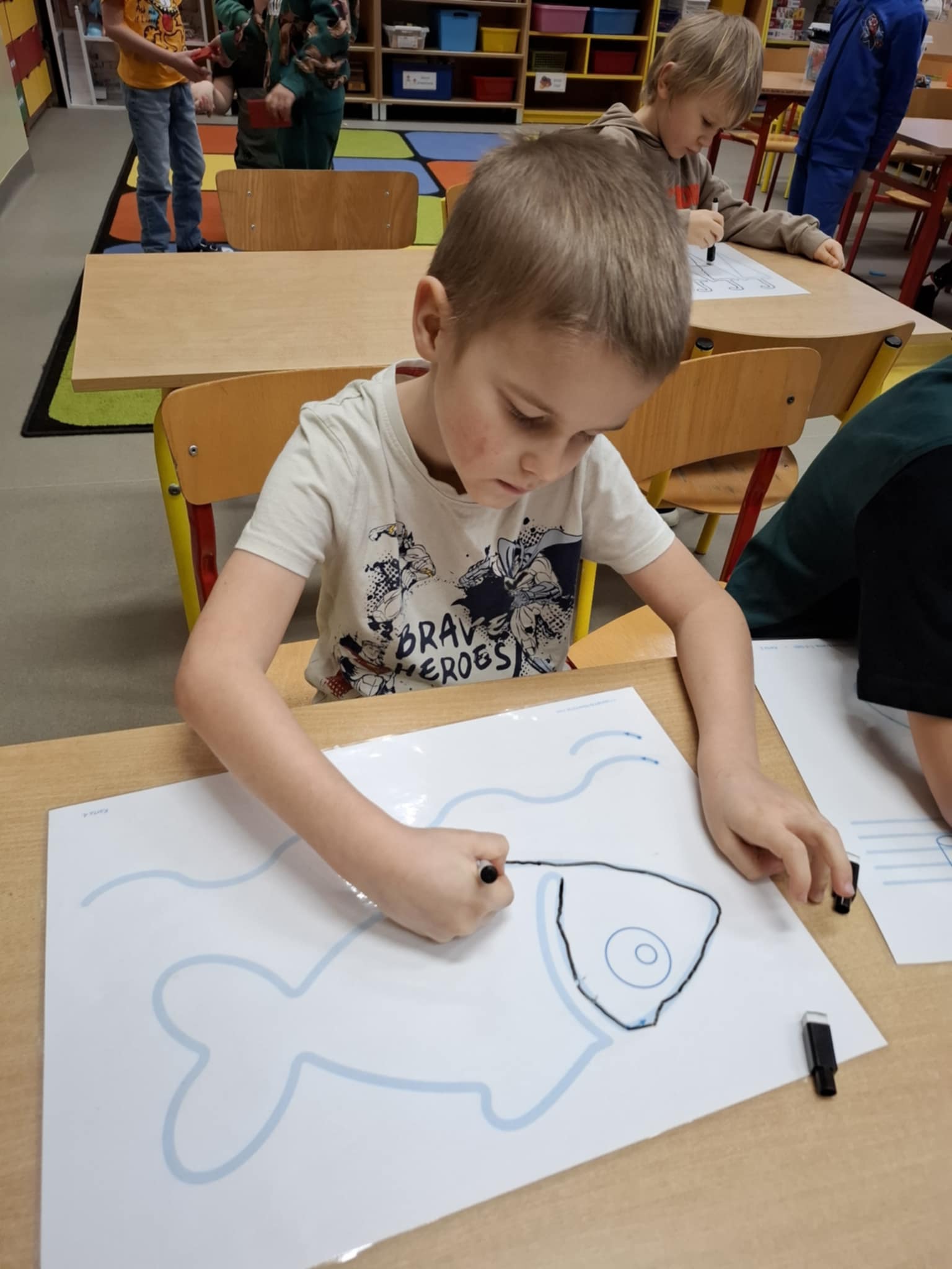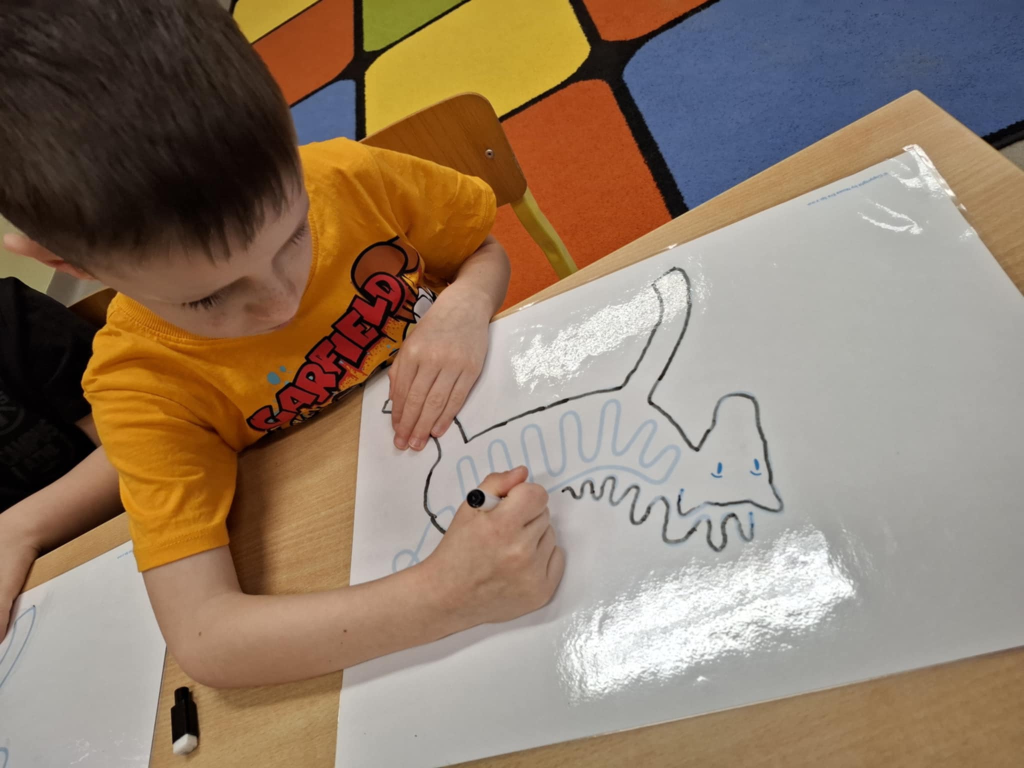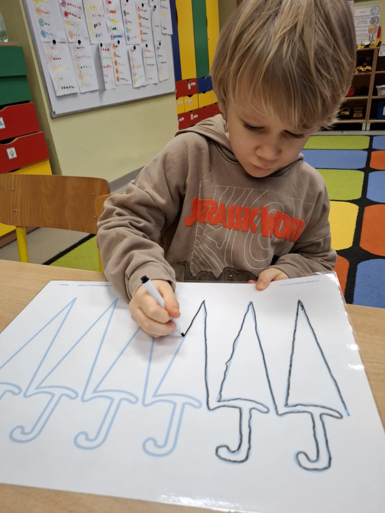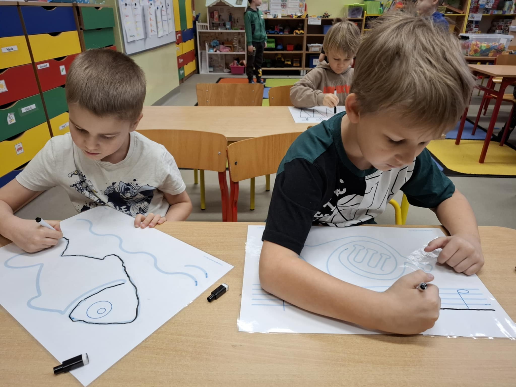 Rysując po śladzie pisakiem ścieralnym, dzieci ćwiczyły nie tylko umiejętności manualne, ale także spostrzegawczość, koncentrację, logiczne myślenie i kojarzenie. A po skończonej zabawie każdy mógł zetrzeć ślady i rozpocząć przygodę od nowa!