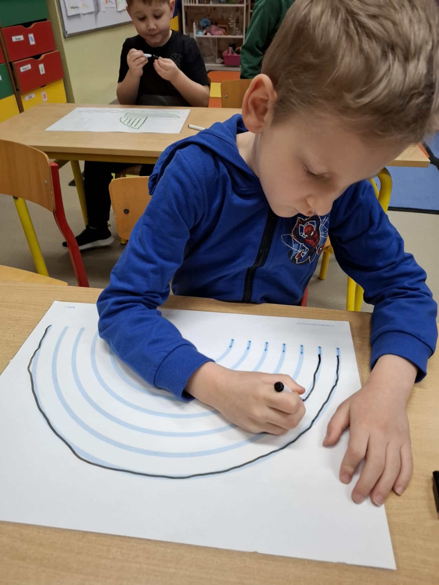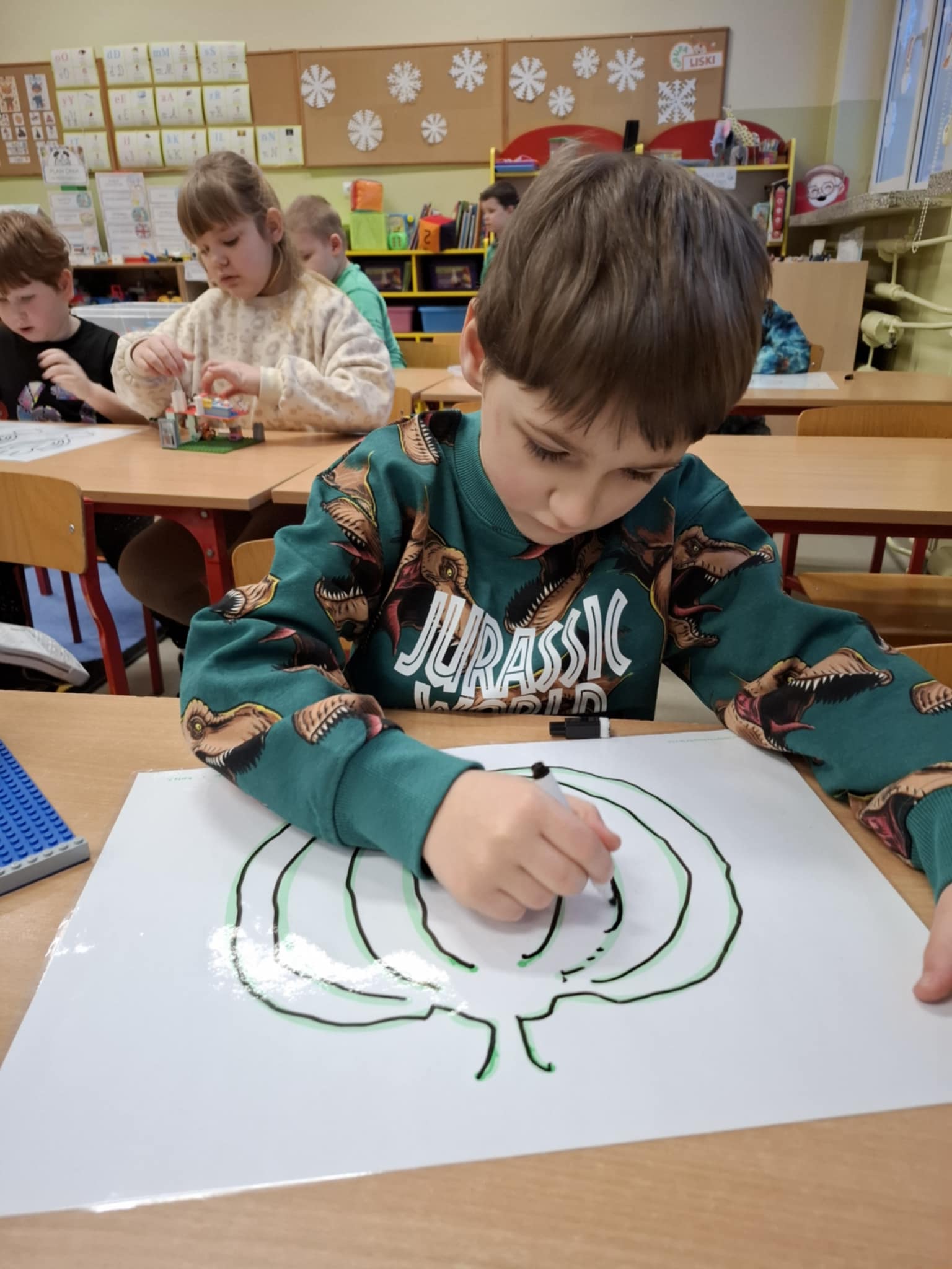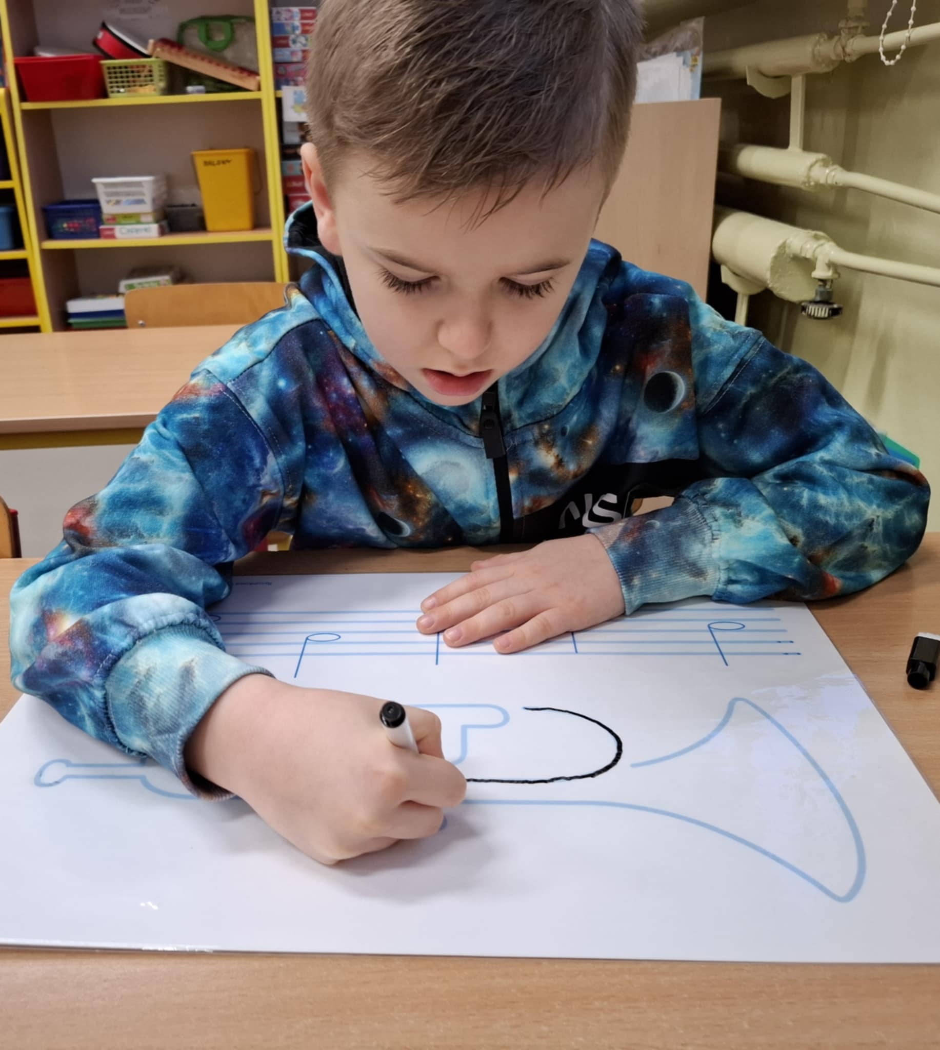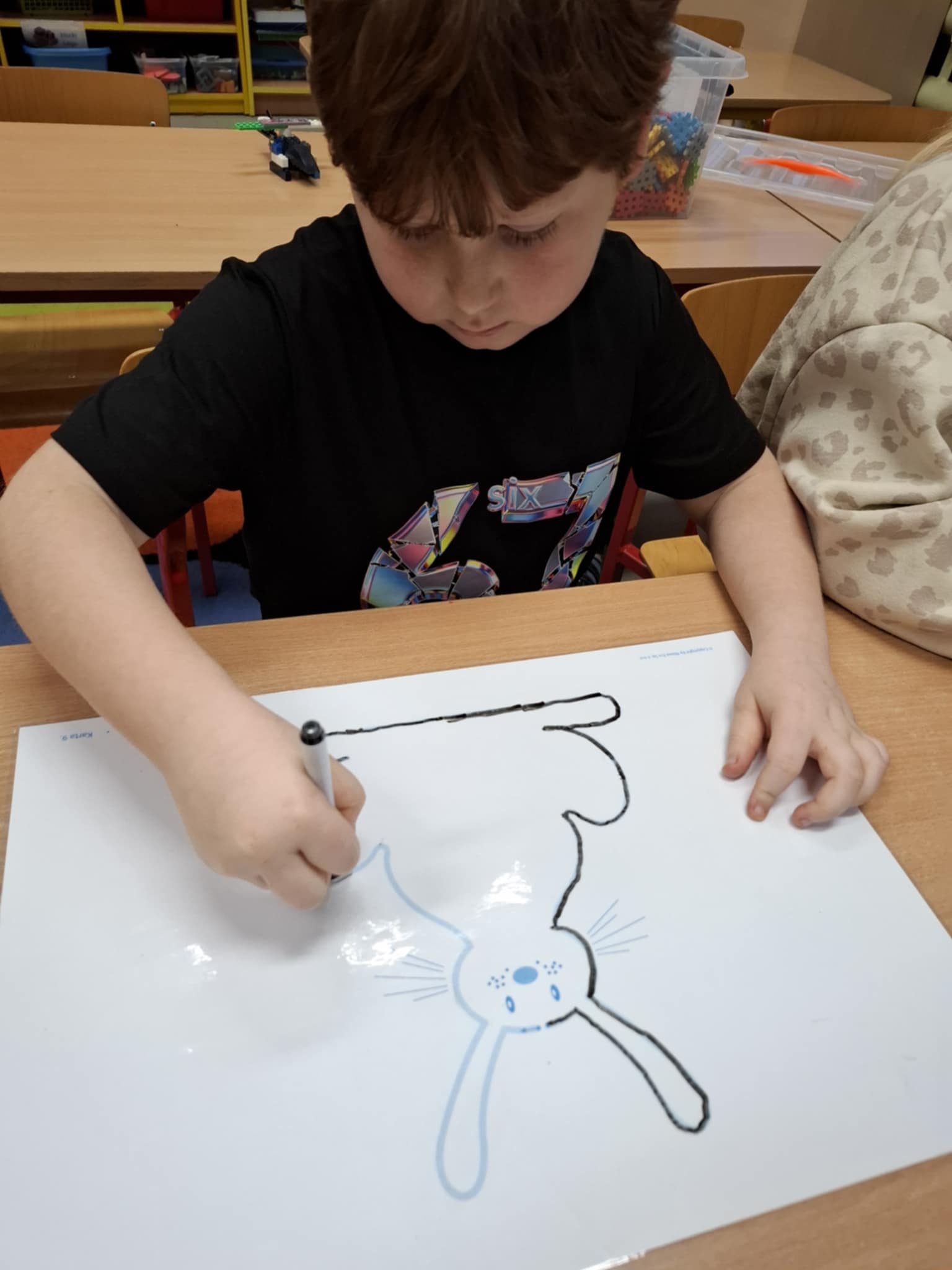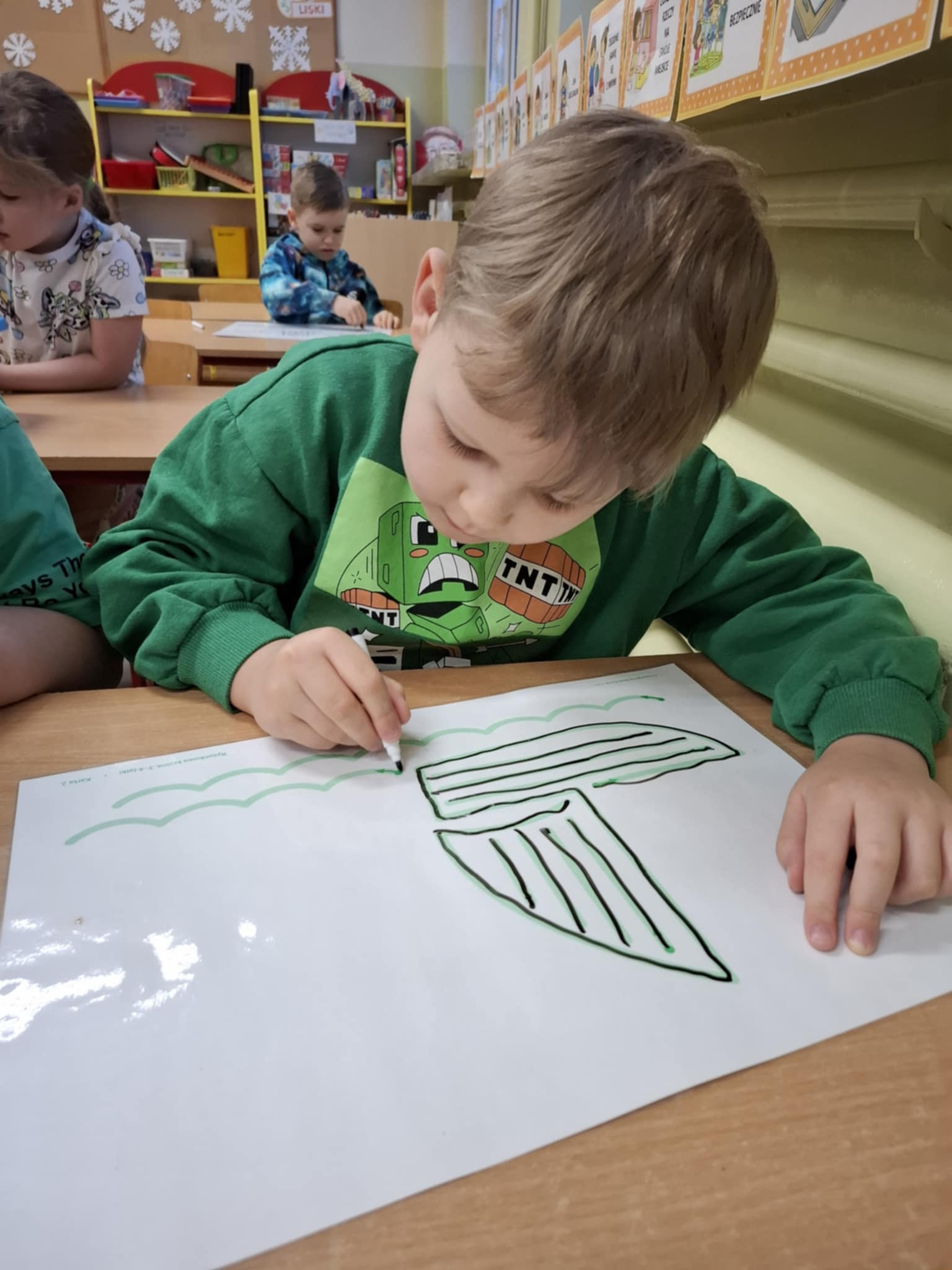 Rysując po śladzie pisakiem ścieralnym, dzieci ćwiczyły nie tylko umiejętności manualne, ale także spostrzegawczość, koncentrację, logiczne myślenie i kojarzenie. A po skończonej zabawie każdy mógł zetrzeć ślady i rozpocząć przygodę od nowa!