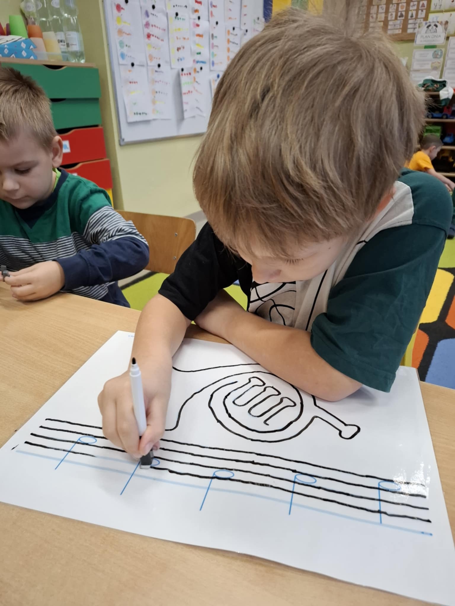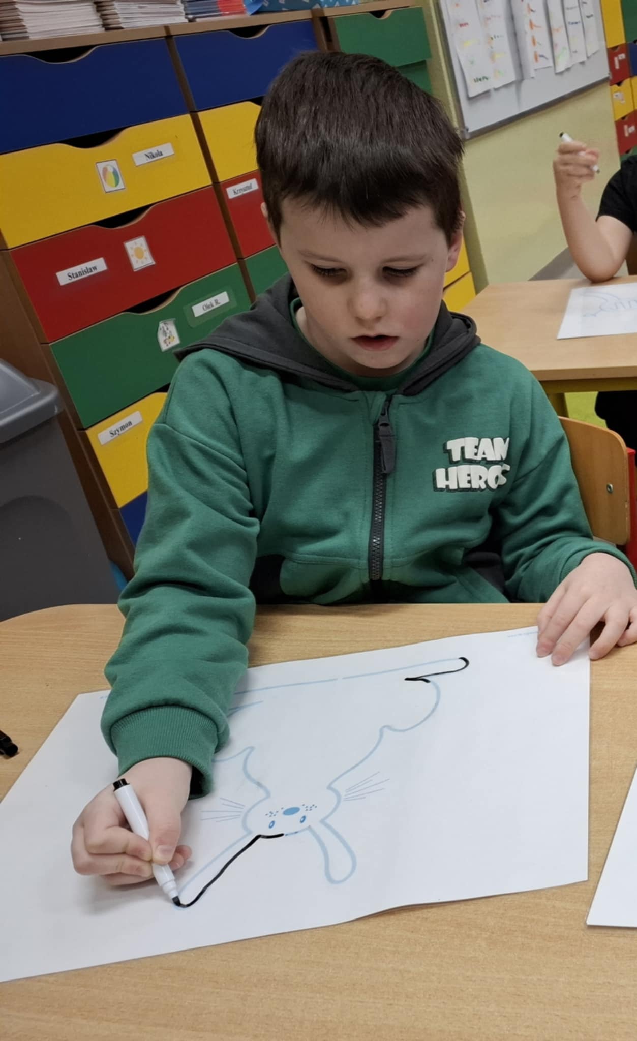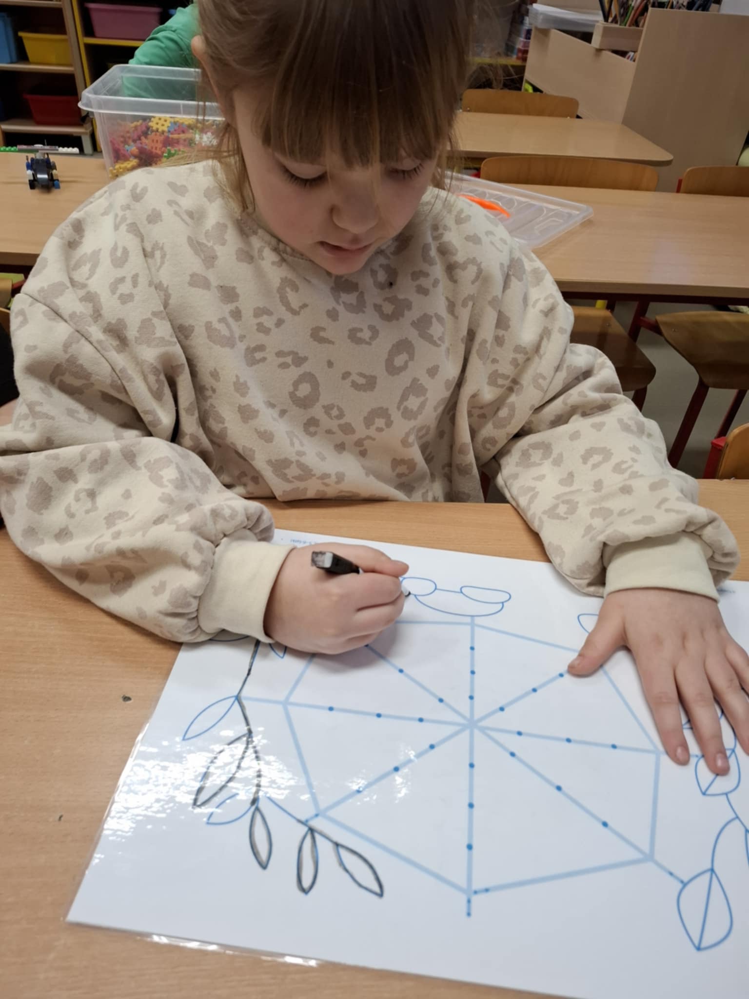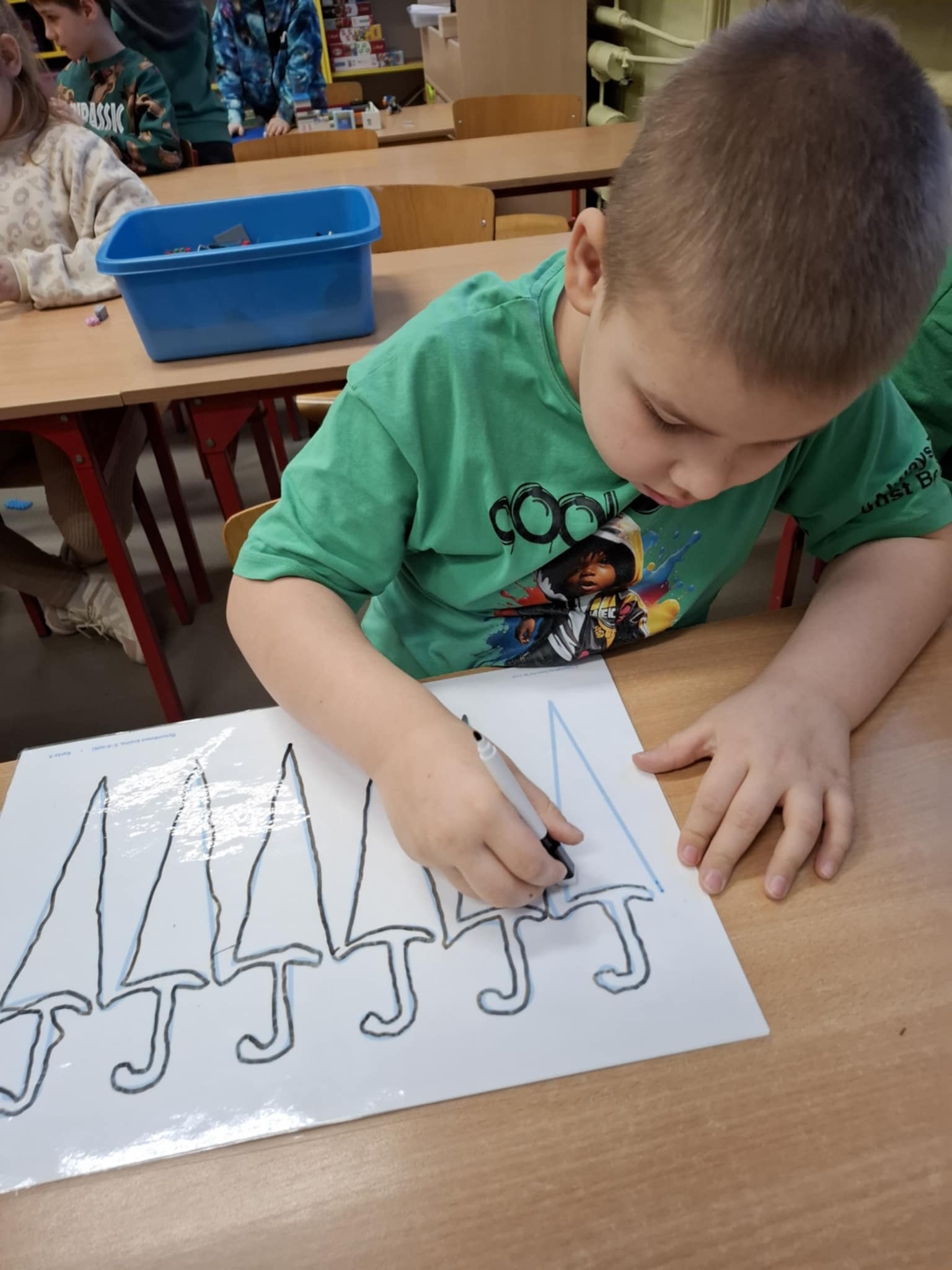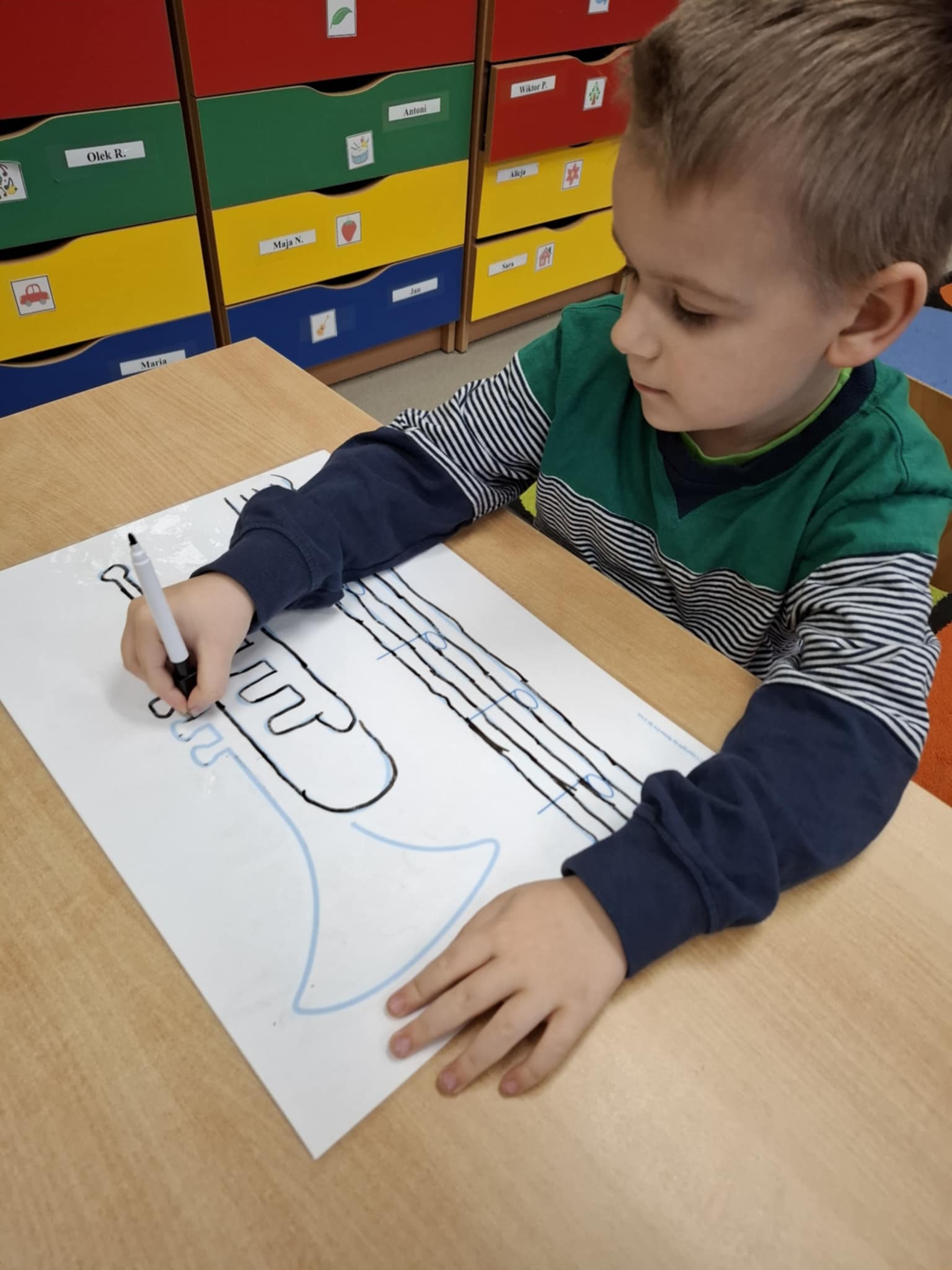 Rysując po śladzie pisakiem ścieralnym, dzieci ćwiczyły nie tylko umiejętności manualne, ale także spostrzegawczość, koncentrację, logiczne myślenie i kojarzenie. A po skończonej zabawie każdy mógł zetrzeć ślady i rozpocząć przygodę od nowa!