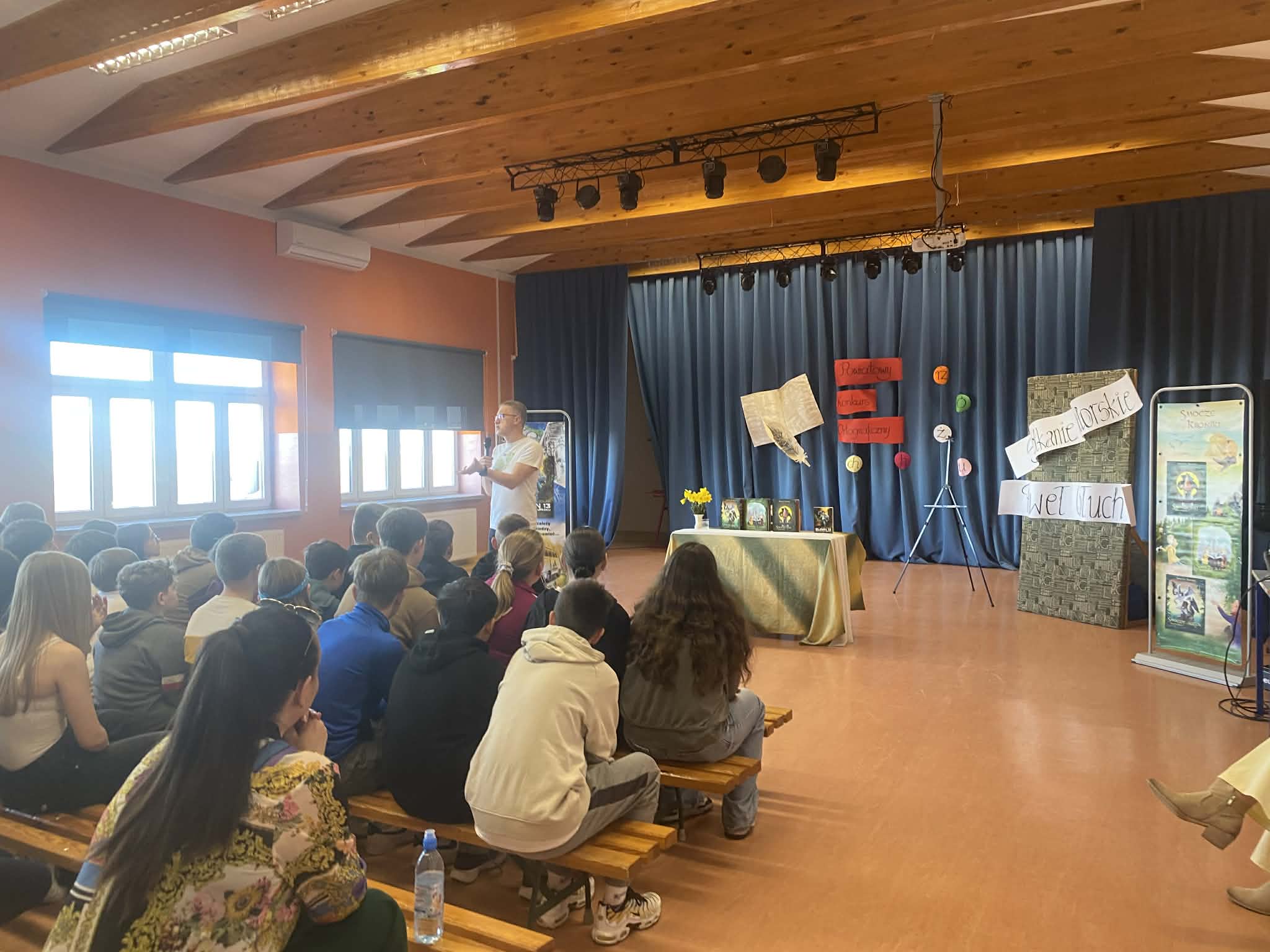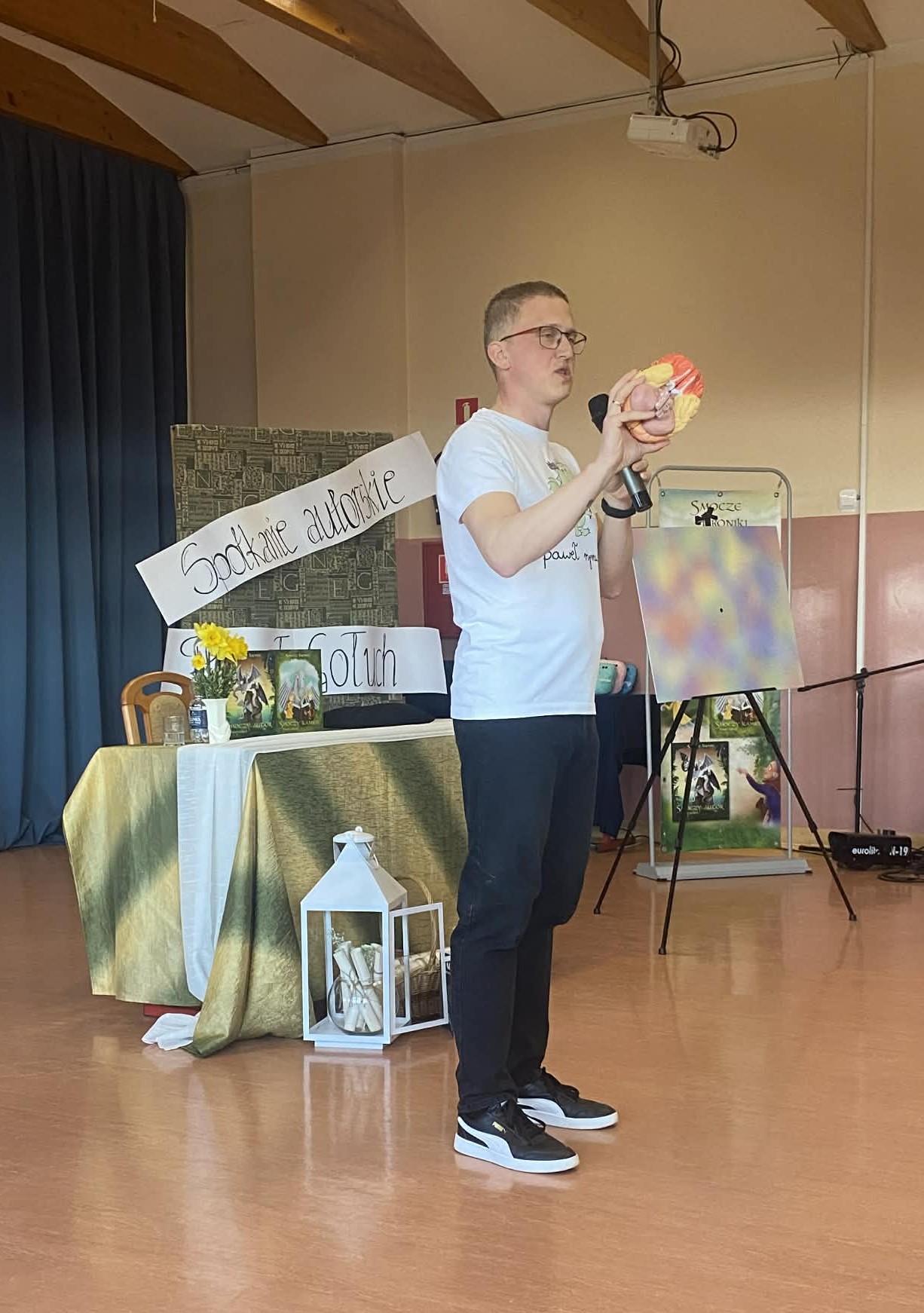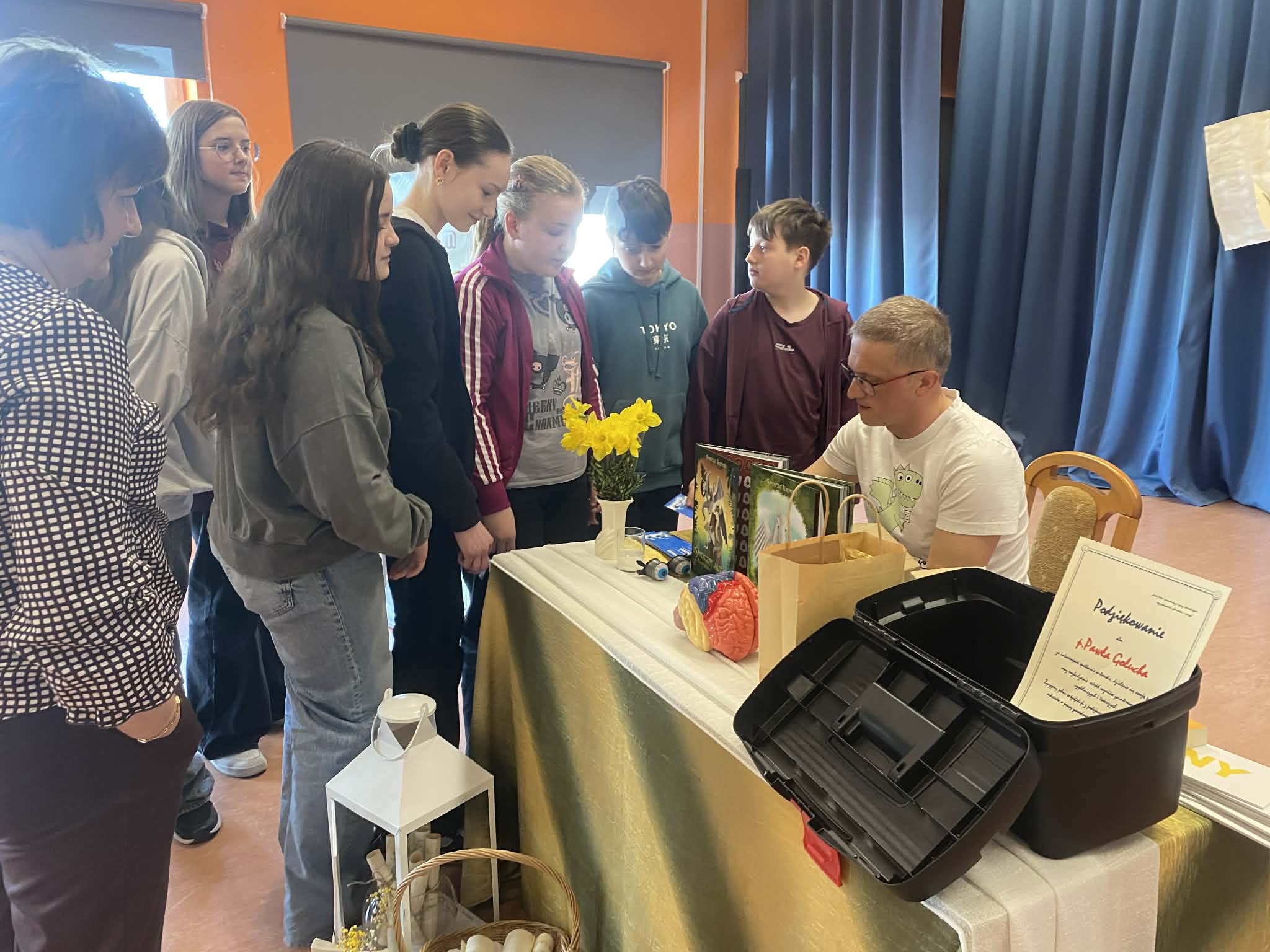 17 kwietnia 2026 r. na prawdziwie literacko-naukowe show zaprosił uczniów kas 6 i 7 poeta i pisarz Paweł Gołuch. Podczas spotkania nie było miejsca na nudę, każda chwila wypełniona była czymś ciekawym i zabawnym. Pojawiły się istotne rekwizyty i pomoce naukowe, które udowadniały, jak wspaniały jest ludzki mózg. Nasz gość podzielił się również spostrzeżeniami na temat sposobów pisania i tworzenia tekstów, opowiadał o powodach, dla których zaczął swoją przygodę z książkami.