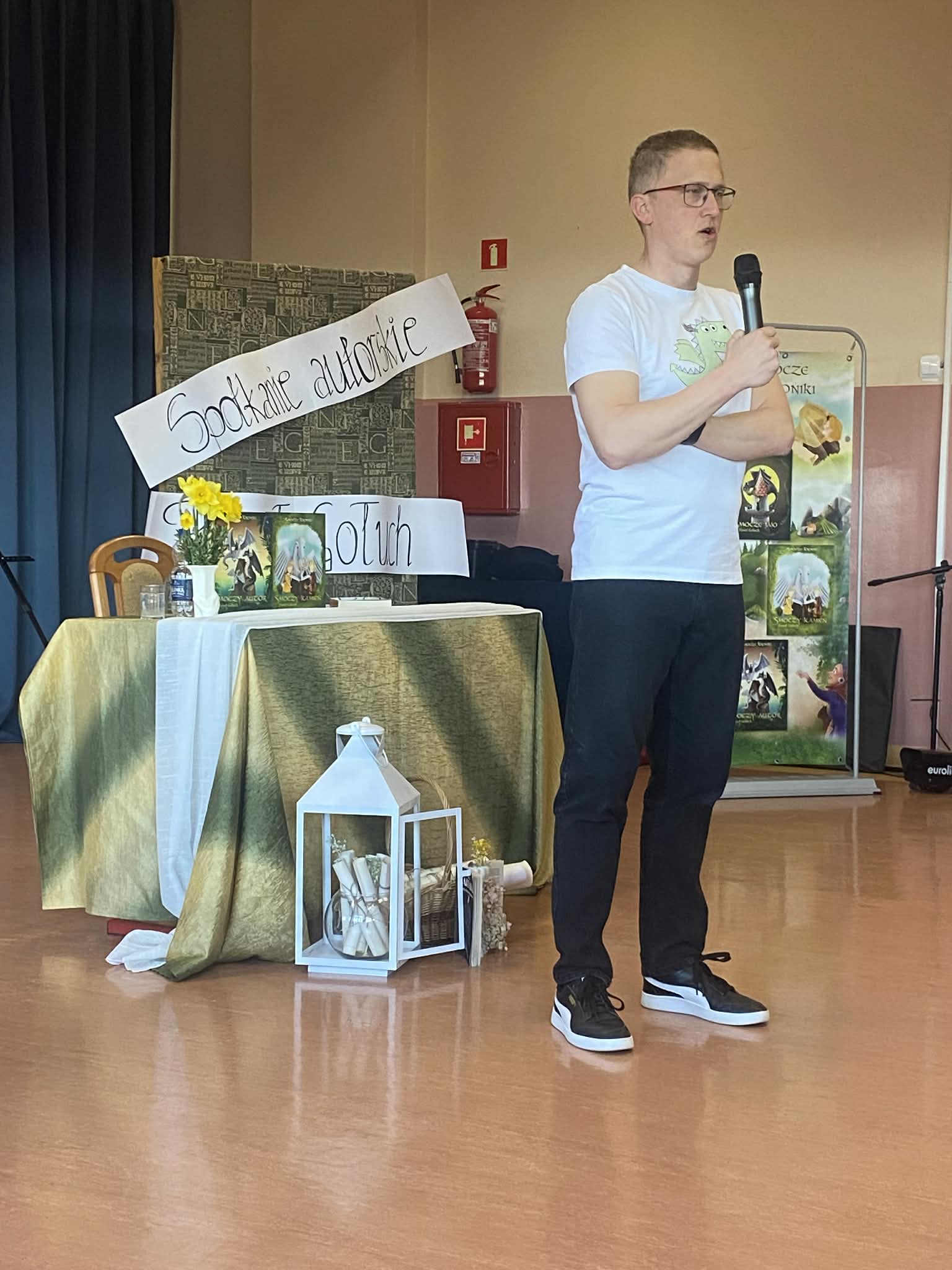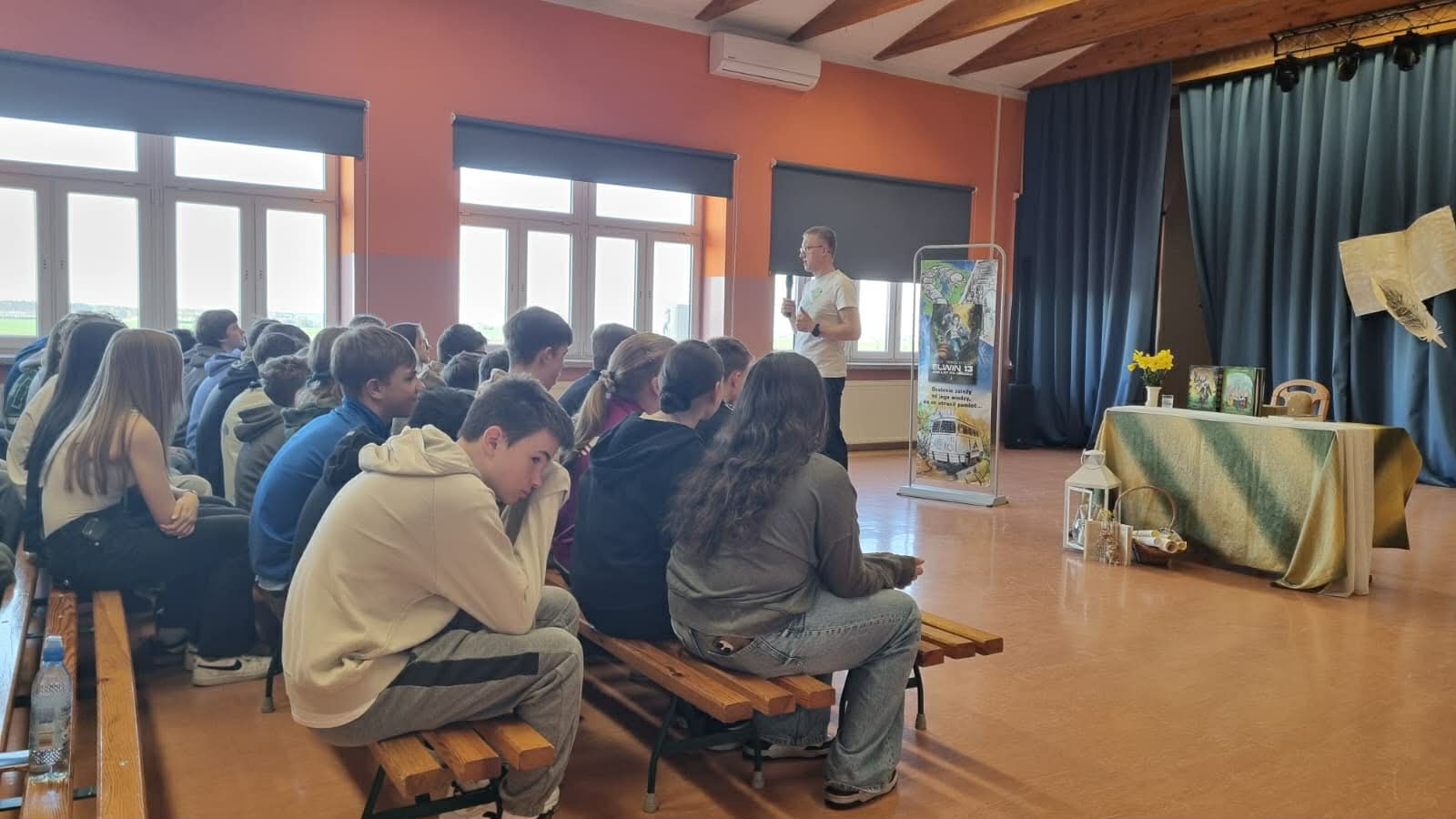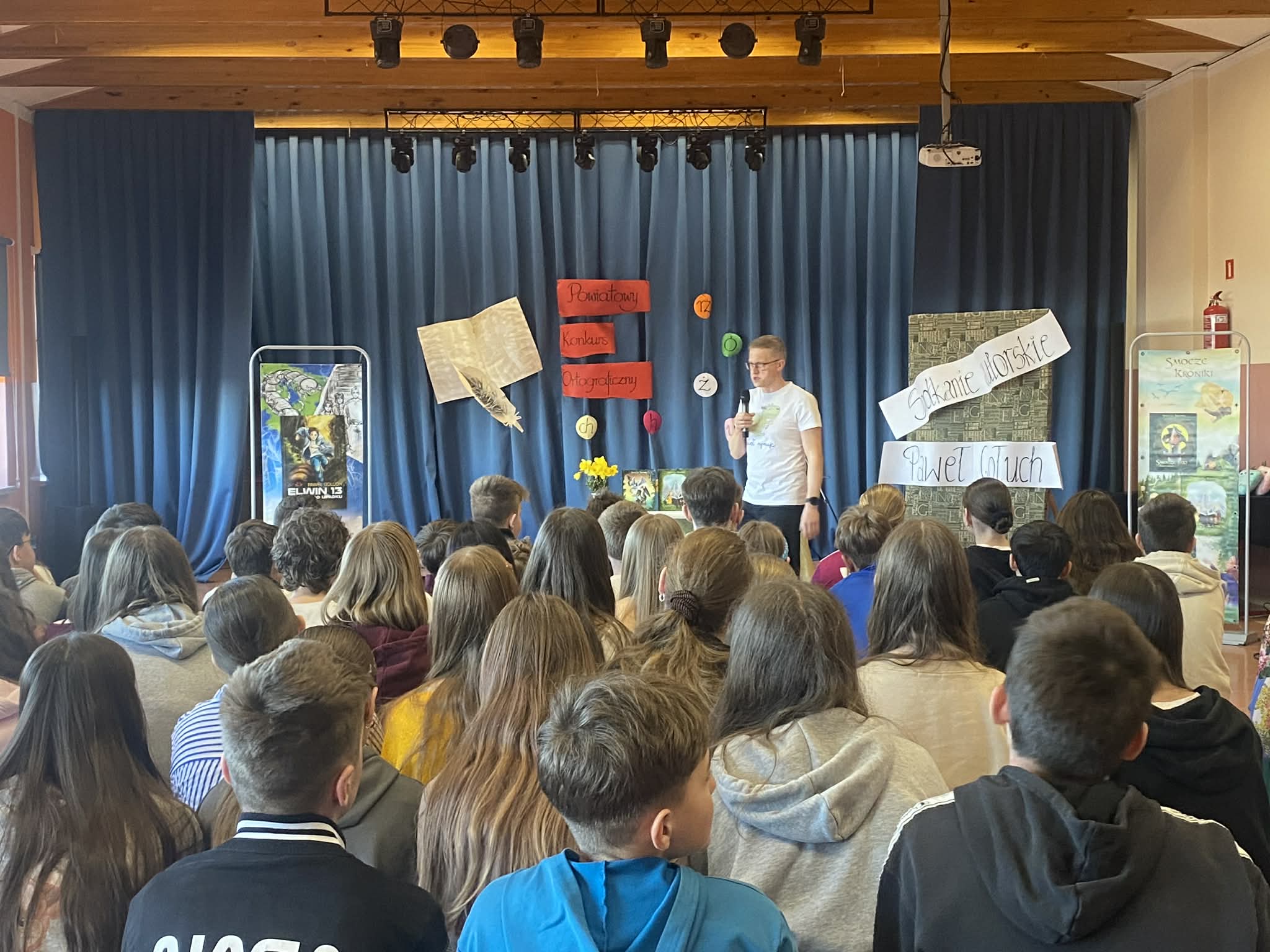 Uczniowie mieli okazję dowiedzieć się o czym jest najnowsza książka autora pt. „Elwin 13. 400 lat po upadku” oraz poznać jej głównego bohatera. Spotkanie było pełne dynamizmu i pozytywnych emocji. Uczestnicy z ogromnym zainteresowaniem słuchali autora, odpowiadali na pytania oraz chętnie brali udział w proponowanych doświadczeniach i zadaniach.