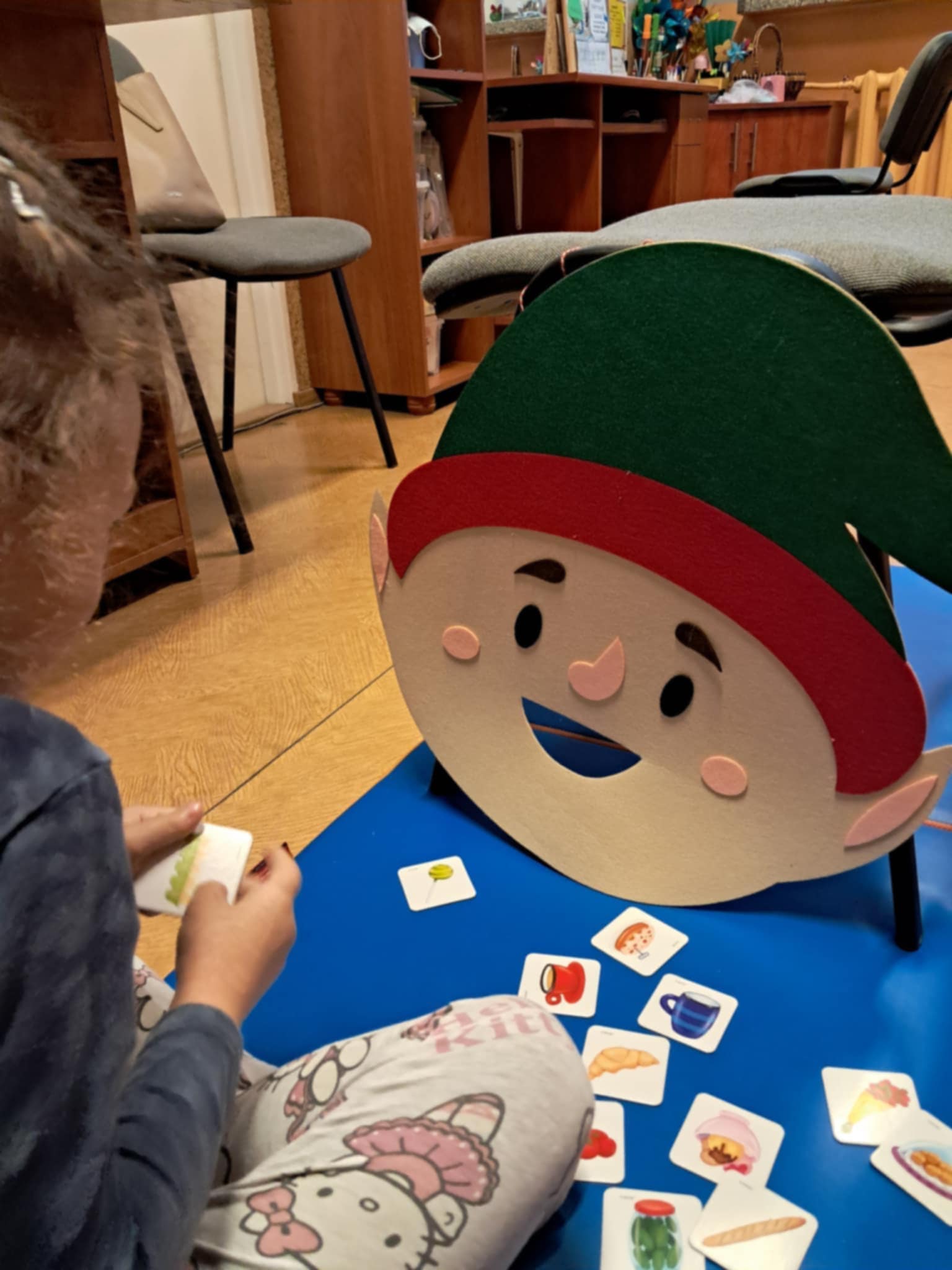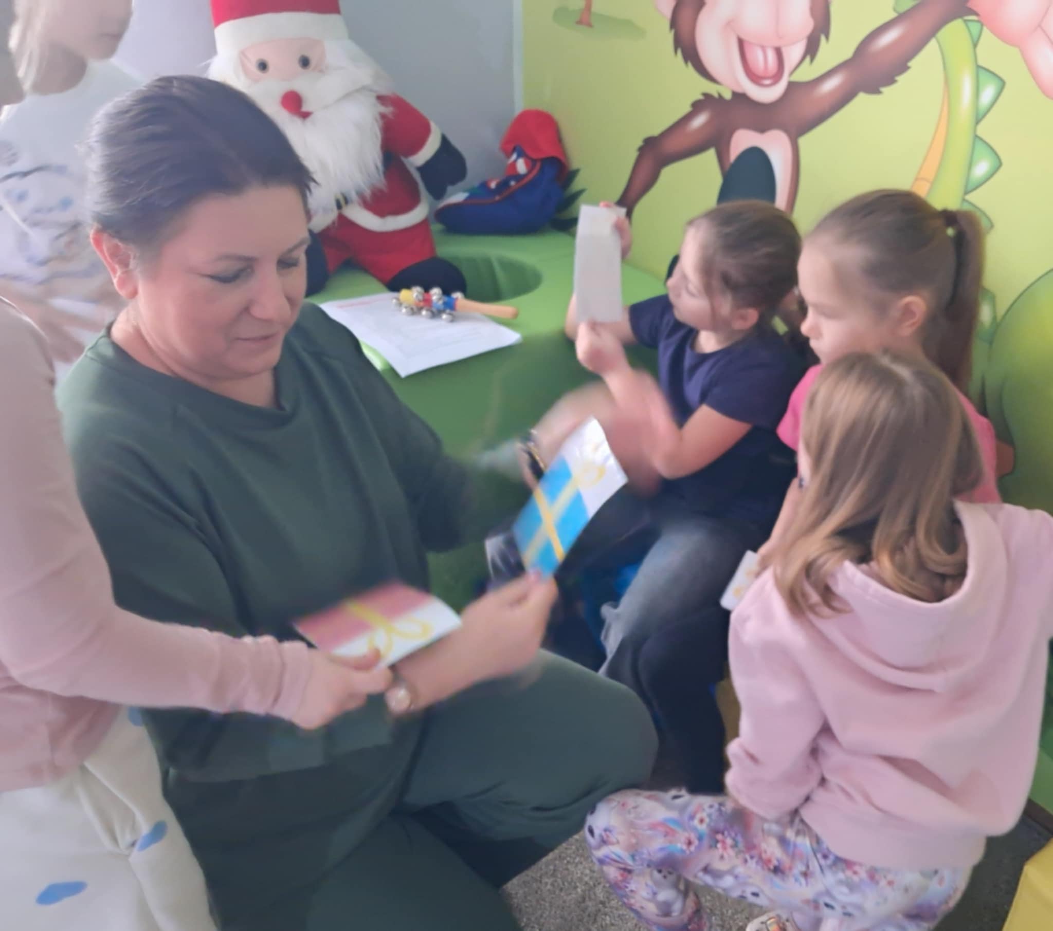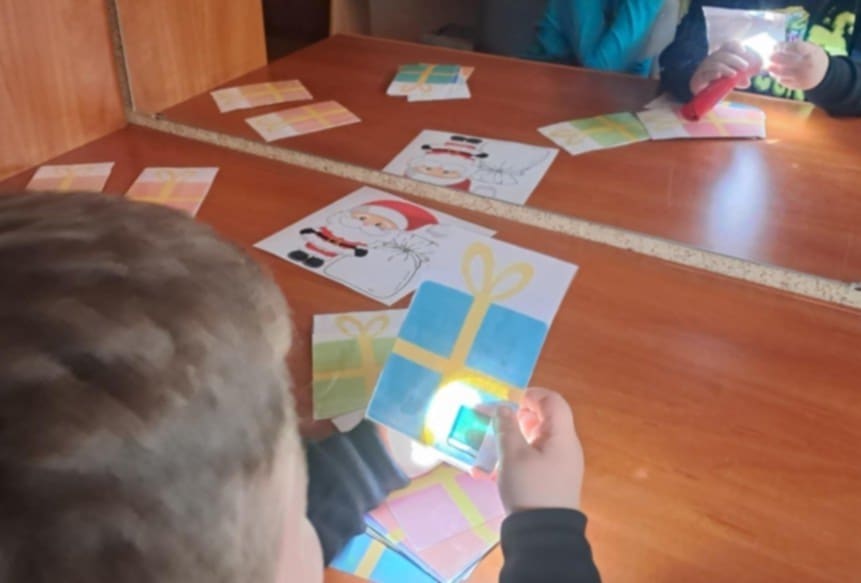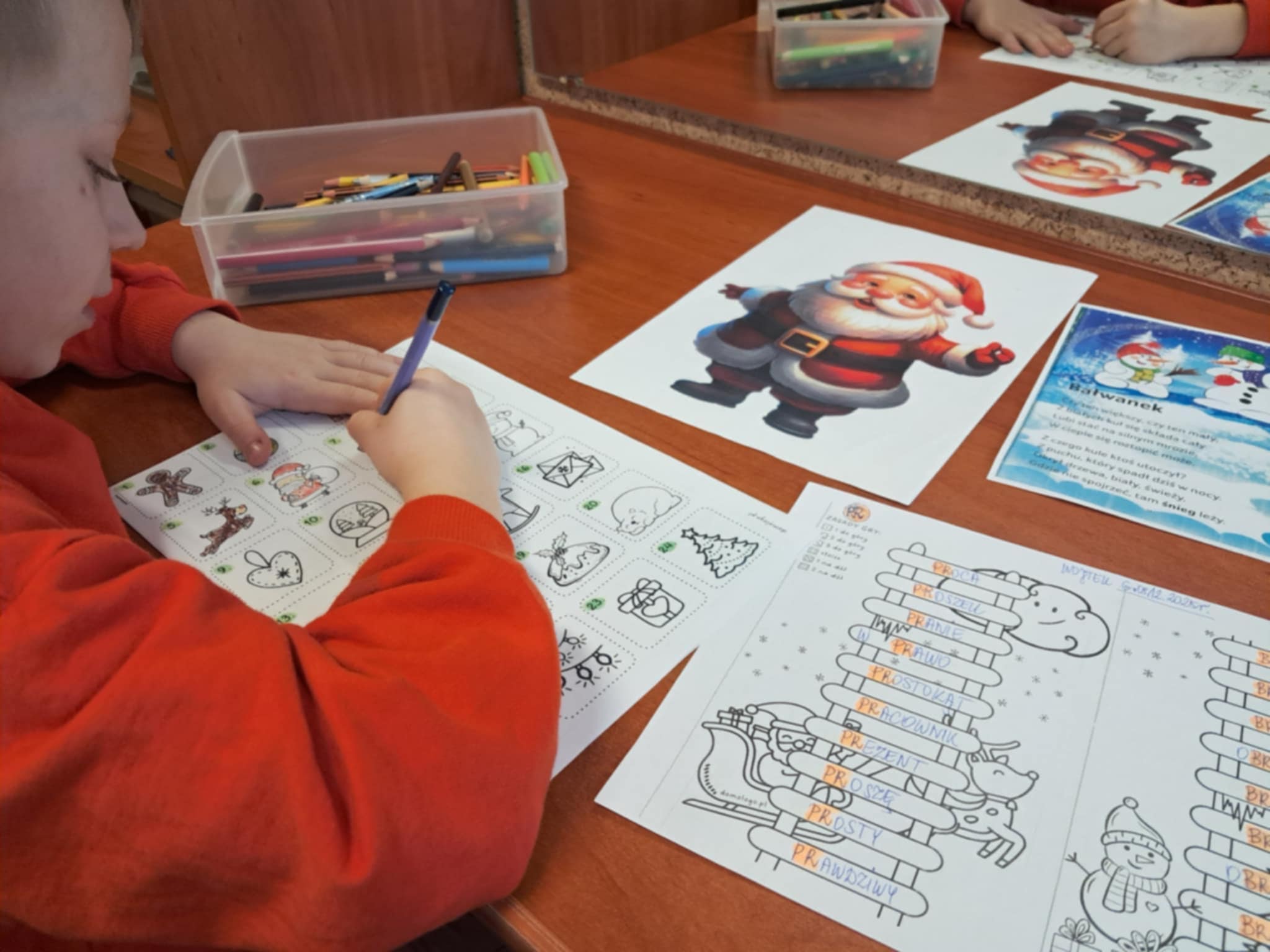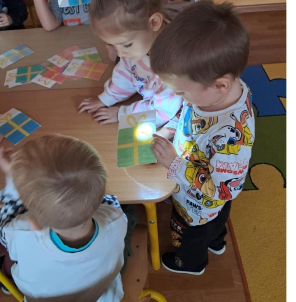 Właśnie taki miły i świąteczny nastrój towarzyszył naszym spotkaniom i zajęciom z logopedą. Dzieci chętnie opowiadały o symbolach i tradycjach Świąt Bożego Narodzenia. Z zaangażowaniem uczestniczyły w zabawach logorytmicznych, śpiewały piosenki, kolędy oraz recytowały wierszyki o tematyce zimowo-świątecznej. Doskonale radziły sobie z rozwiązywaniem zagadek słownych i obrazkowych z latarką, z układaniem i omawianiem obrazków.