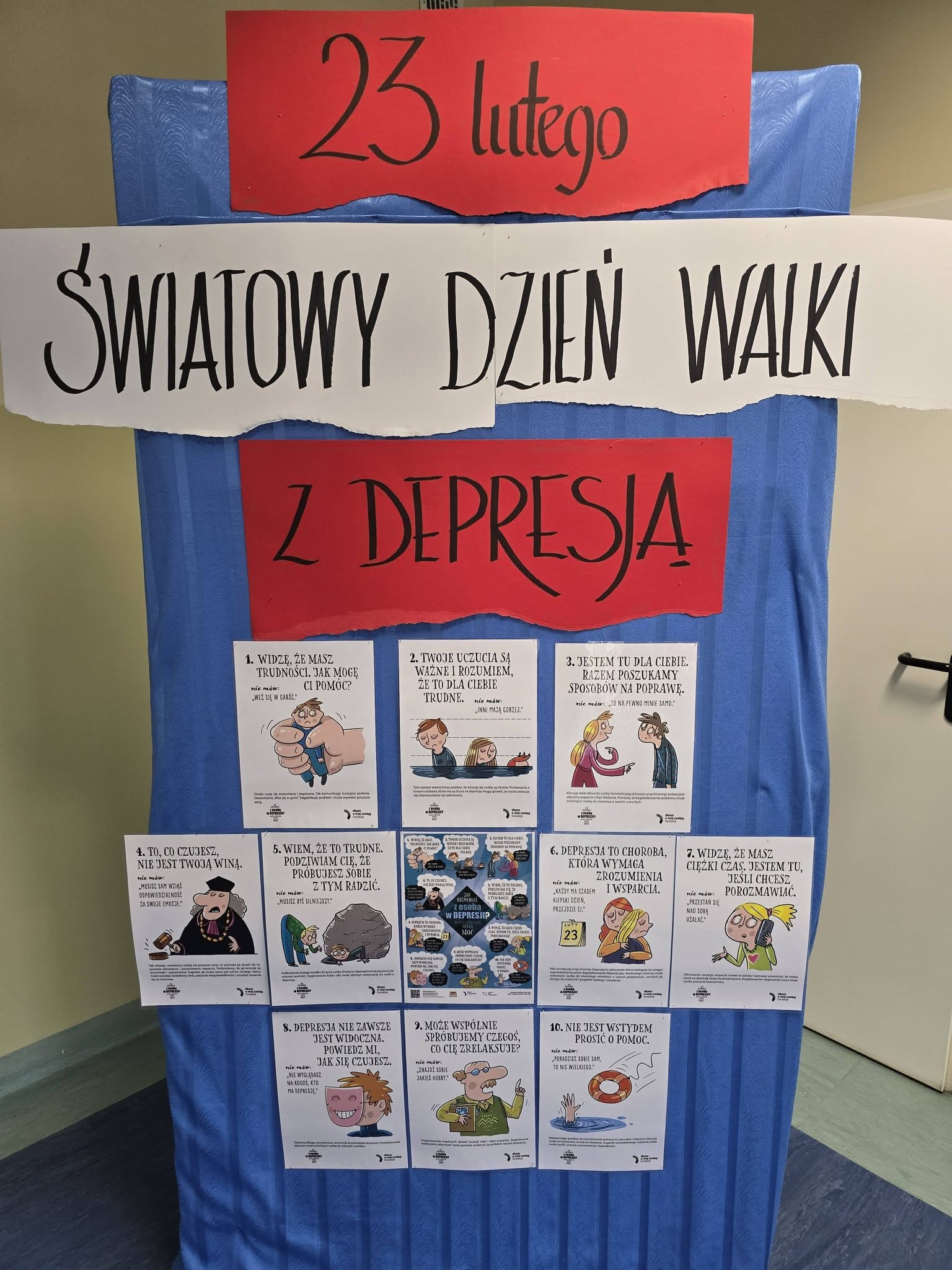 Na holu szkoły przygotowano gazetkę informacyjną poświęconą tematyce depresji. Na drzwiach sal lekcyjnych umieszczono obrazki z cytatami motywacyjnymi przypominające o sile, nadziei i znaczeniu pozytywnego myślenia.