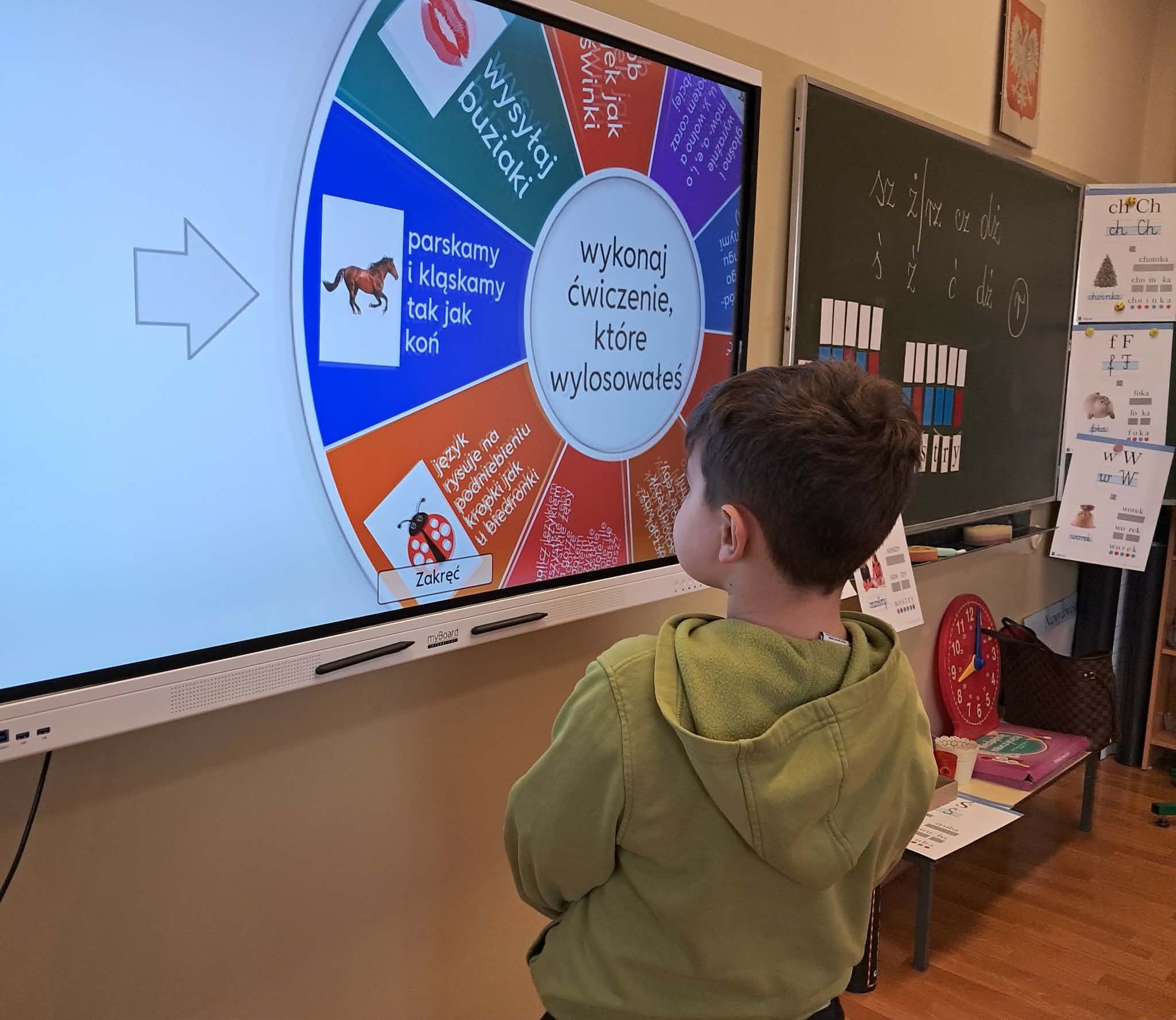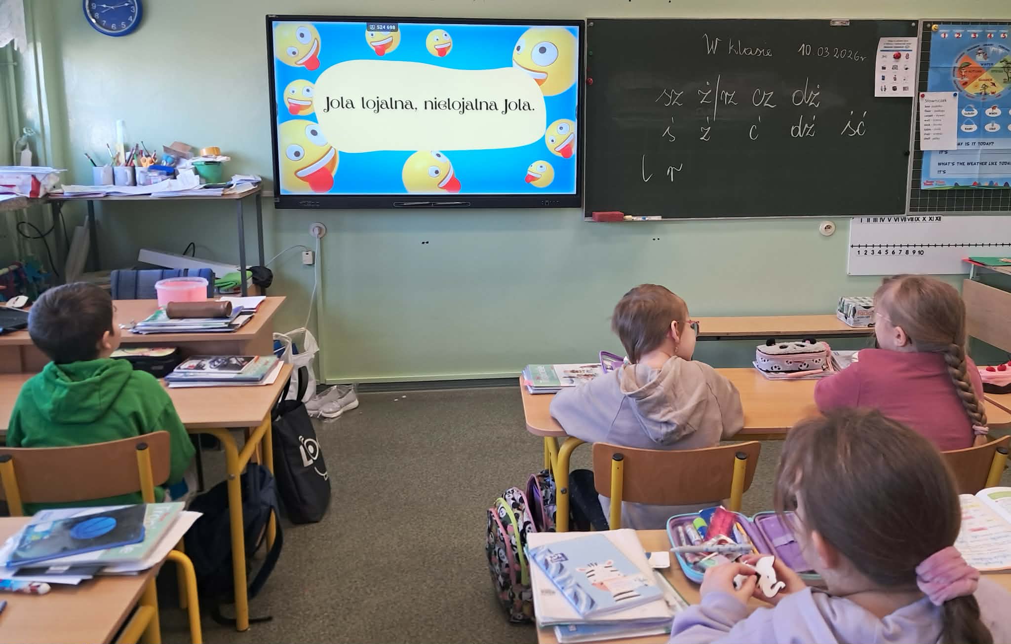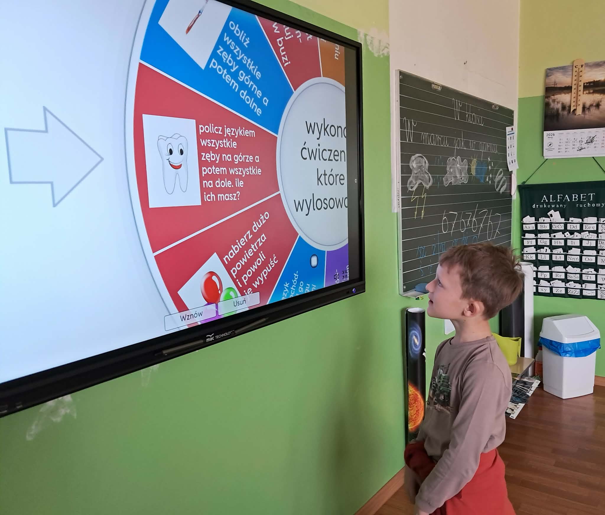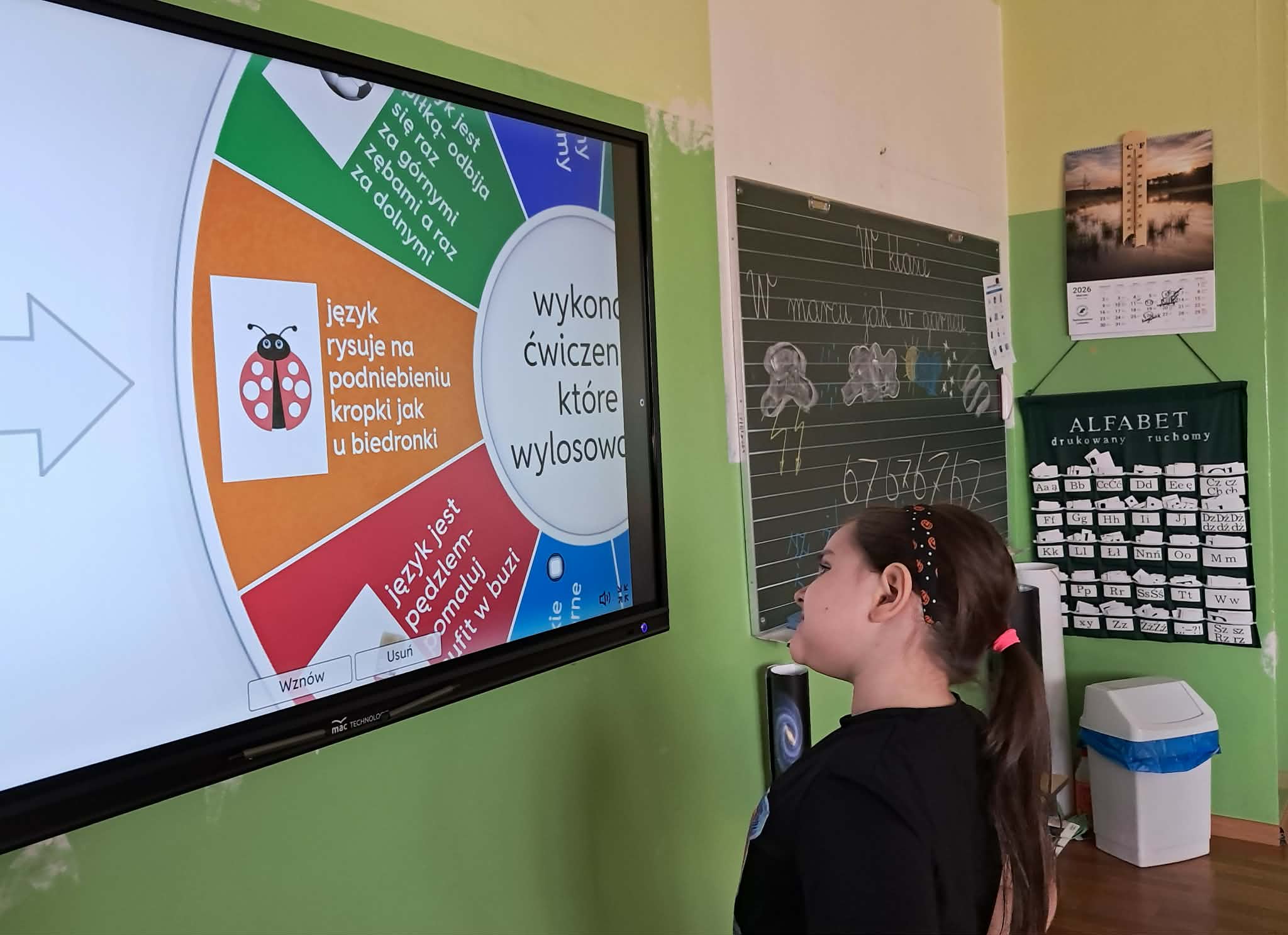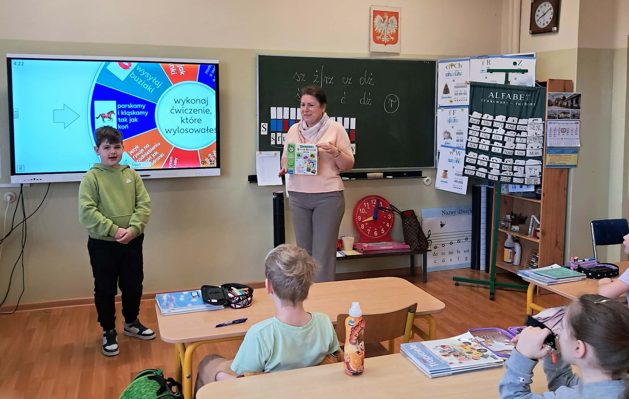 Dużym zainteresowaniem uczniów cieszyły się zagadki i zabawy słowne z wykorzystaniem kolorowych obrazków oraz tablicy interaktywnej. Dzieci rozwiązywały zadania językowe, dopasowywały wyrazy, ćwiczyły słuch fonemowy oraz rozwijały słownictwo. W trakcie zajęć uczniowie próbowali również swoich sił w powtarzaniu “łamańców językowych”, co było okazją do ćwiczenia poprawnej i wyraźnej wymowy w formie zabawy.