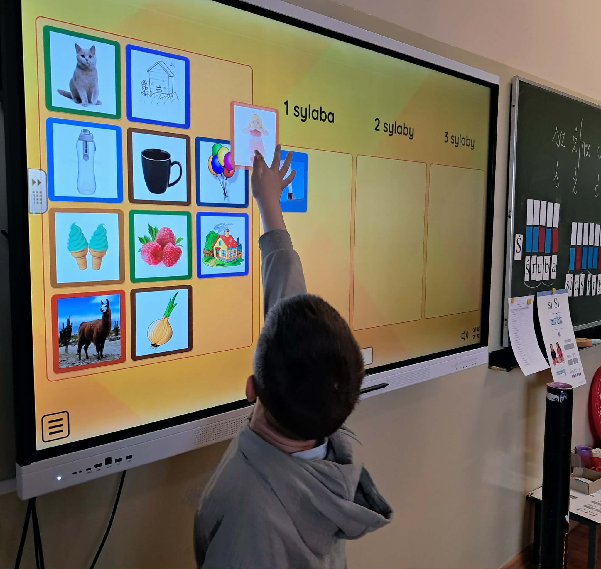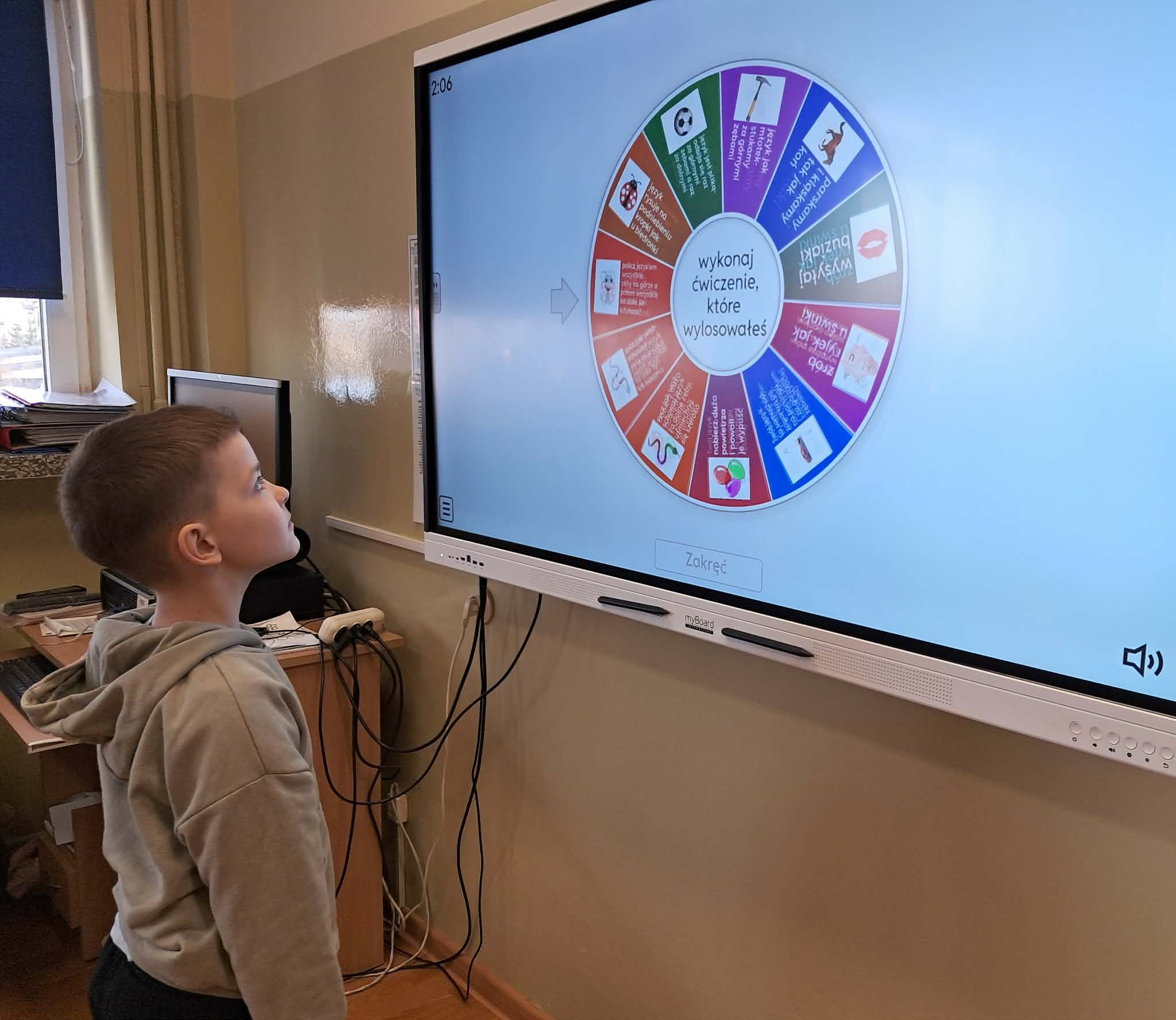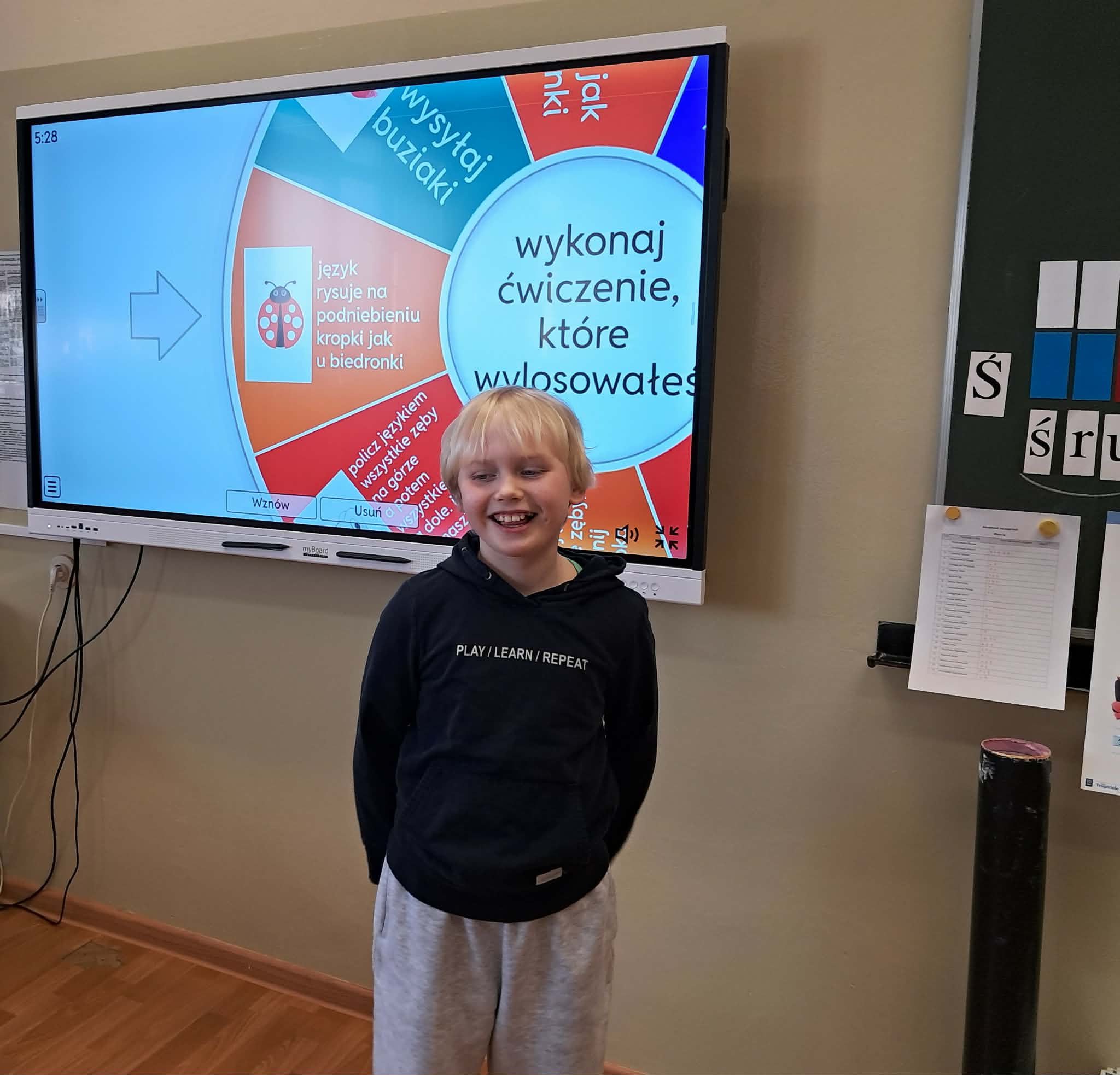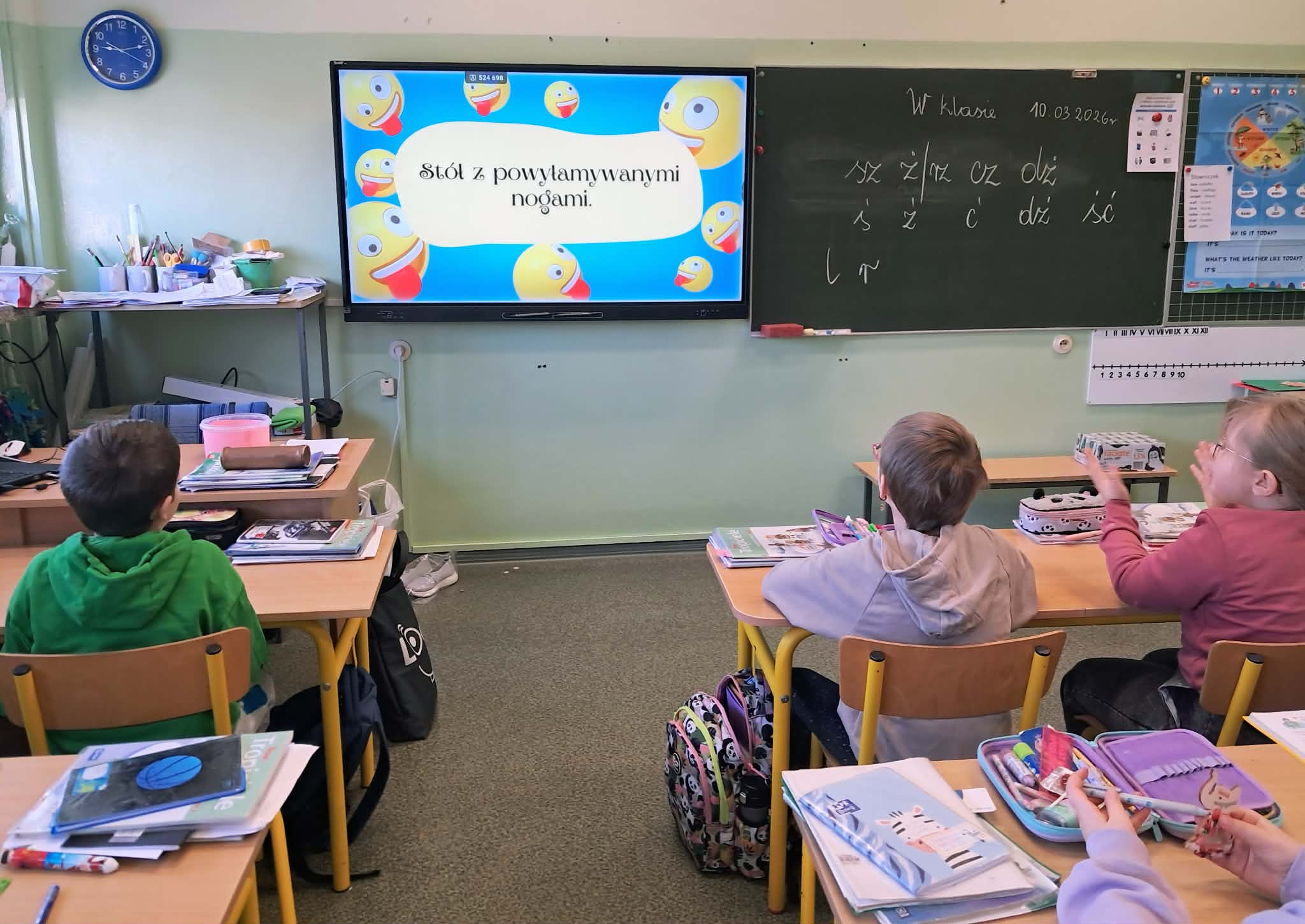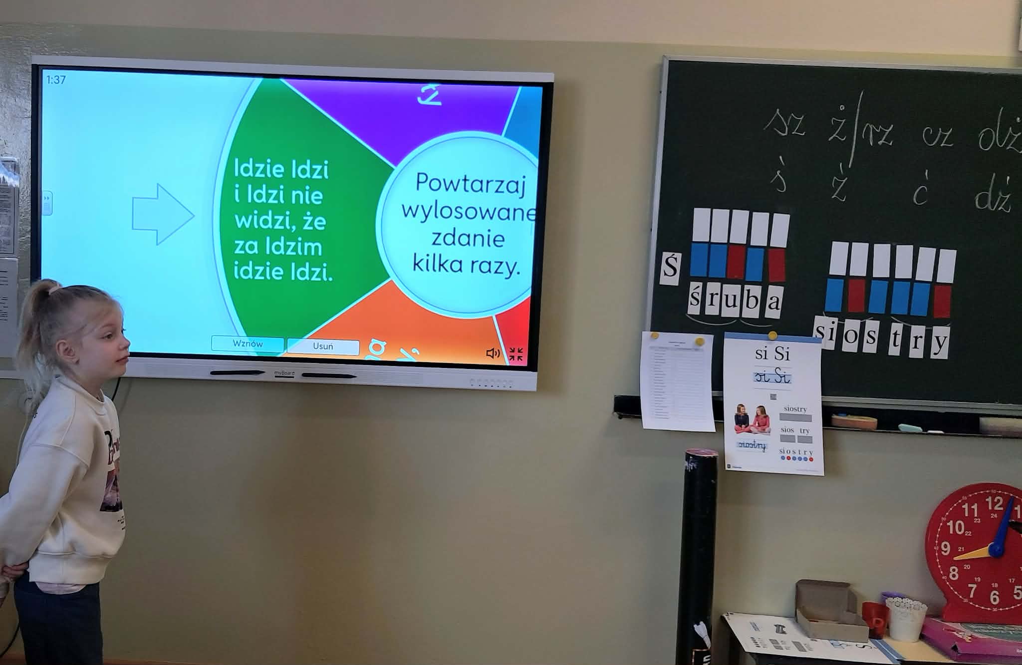 Dużym zainteresowaniem uczniów cieszyły się zagadki i zabawy słowne z wykorzystaniem kolorowych obrazków oraz tablicy interaktywnej. Dzieci rozwiązywały zadania językowe, dopasowywały wyrazy, ćwiczyły słuch fonemowy oraz rozwijały słownictwo. W trakcie zajęć uczniowie próbowali również swoich sił w powtarzaniu “łamańców językowych”, co było okazją do ćwiczenia poprawnej i wyraźnej wymowy w formie zabawy.