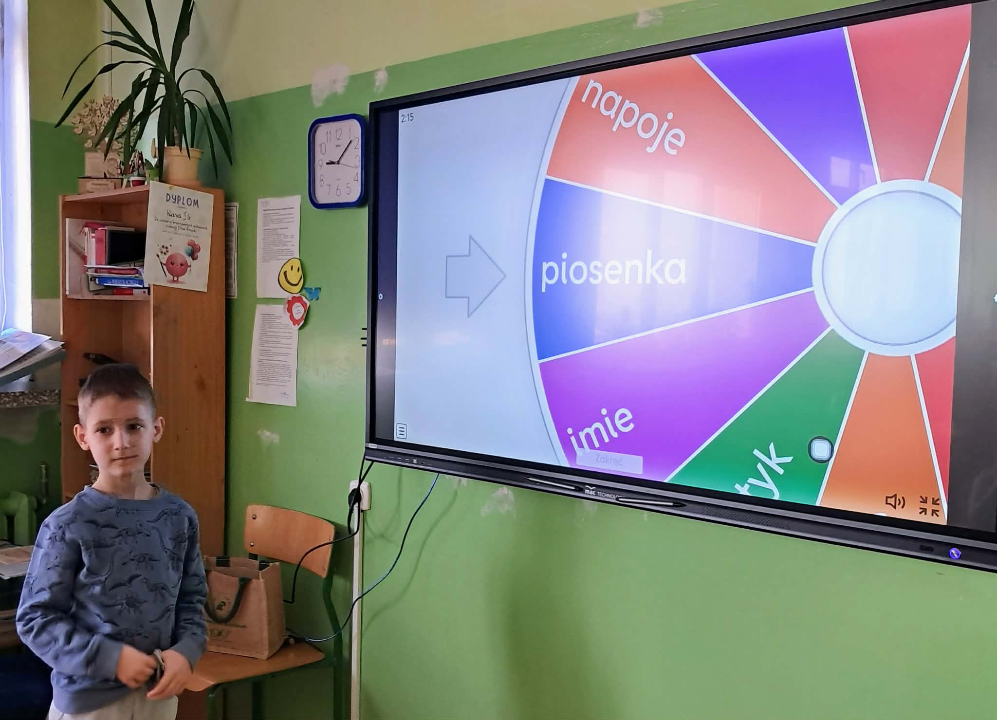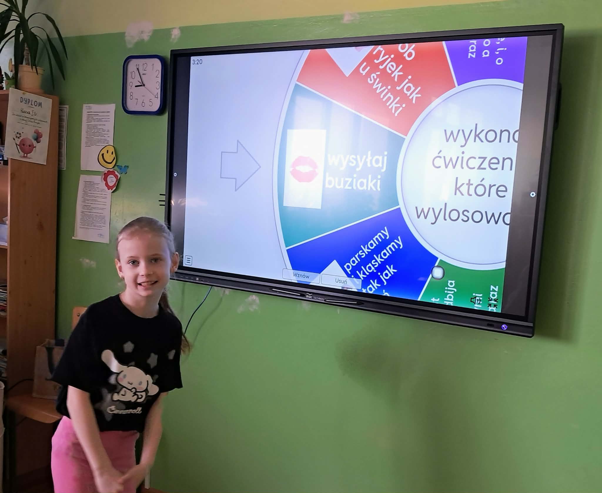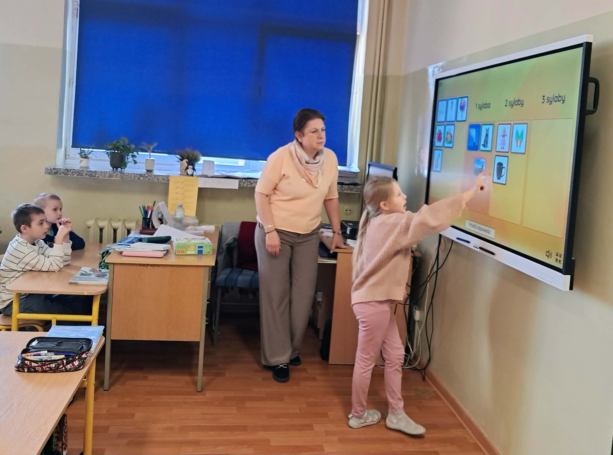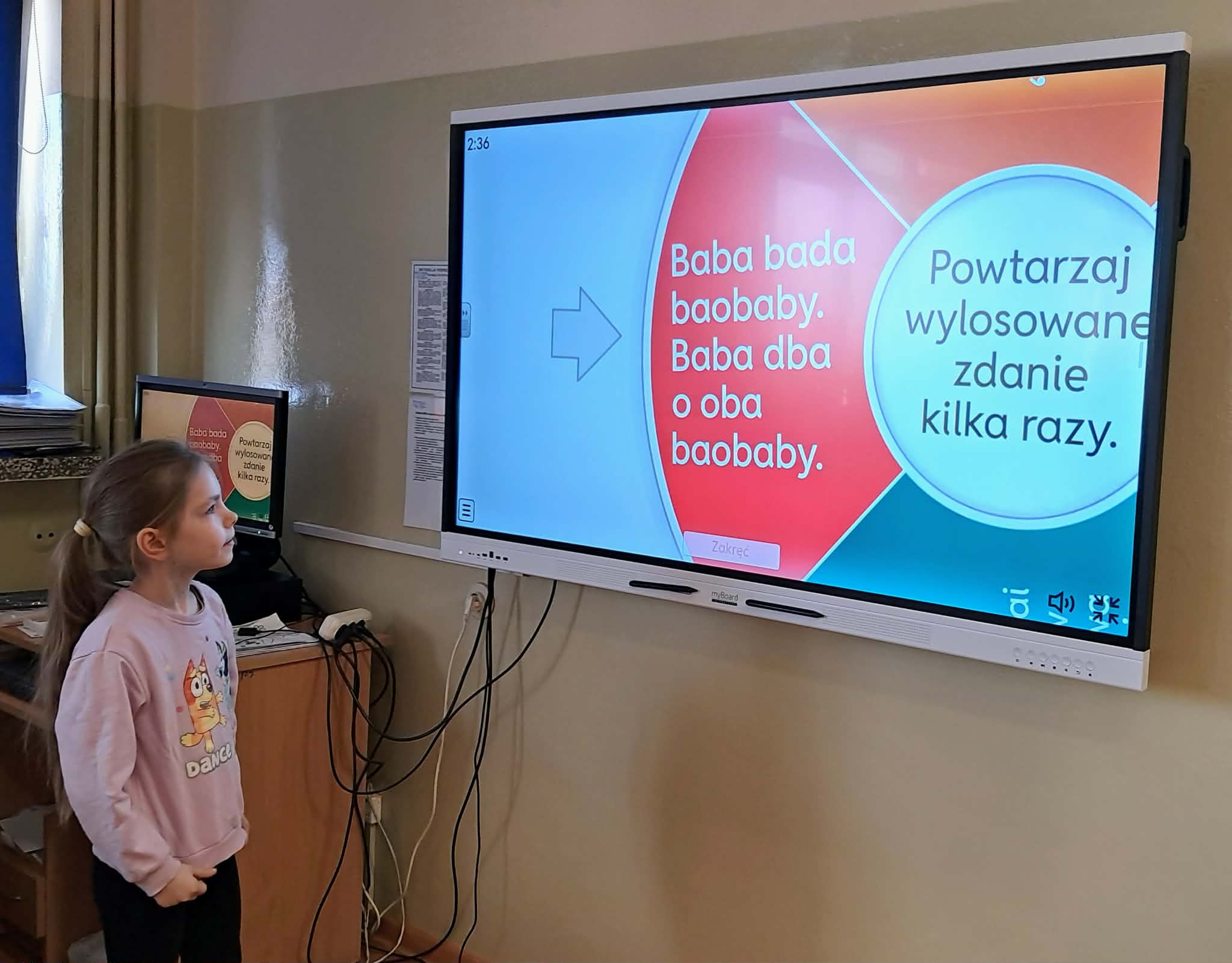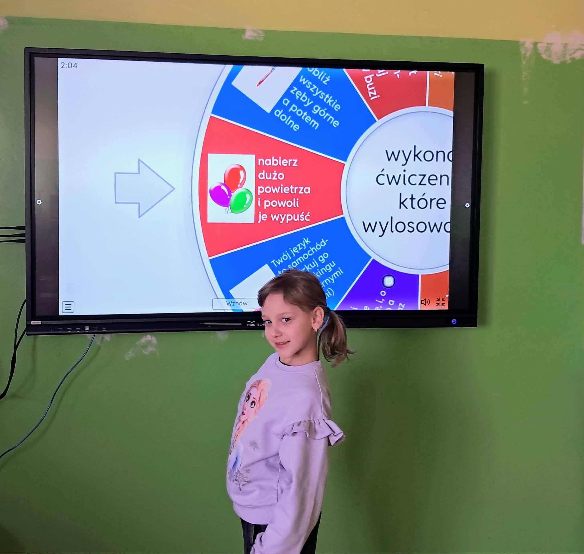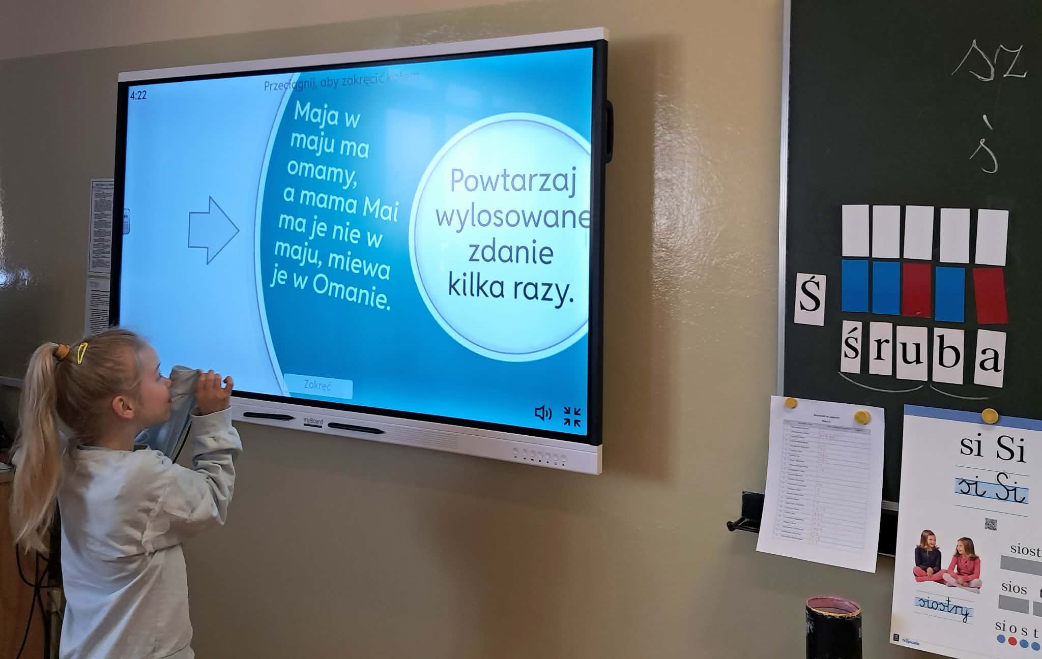 Dużym zainteresowaniem uczniów cieszyły się zagadki i zabawy słowne z wykorzystaniem kolorowych obrazków oraz tablicy interaktywnej. Dzieci rozwiązywały zadania językowe, dopasowywały wyrazy, ćwiczyły słuch fonemowy oraz rozwijały słownictwo. W trakcie zajęć uczniowie próbowali również swoich sił w powtarzaniu “łamańców językowych”, co było okazją do ćwiczenia poprawnej i wyraźnej wymowy w formie zabawy.