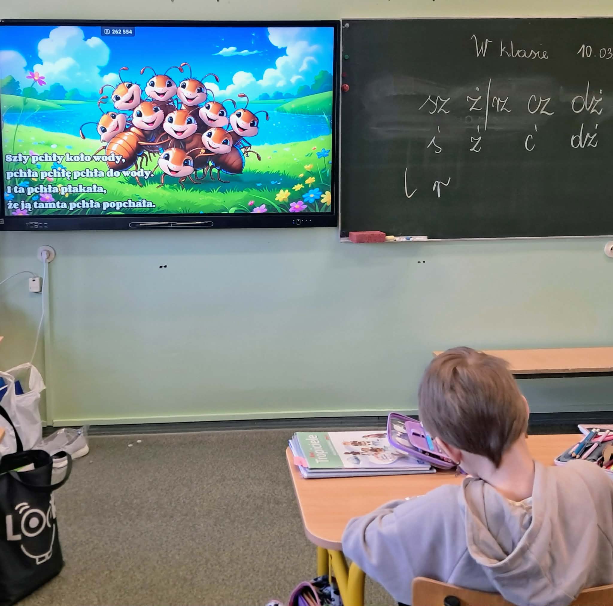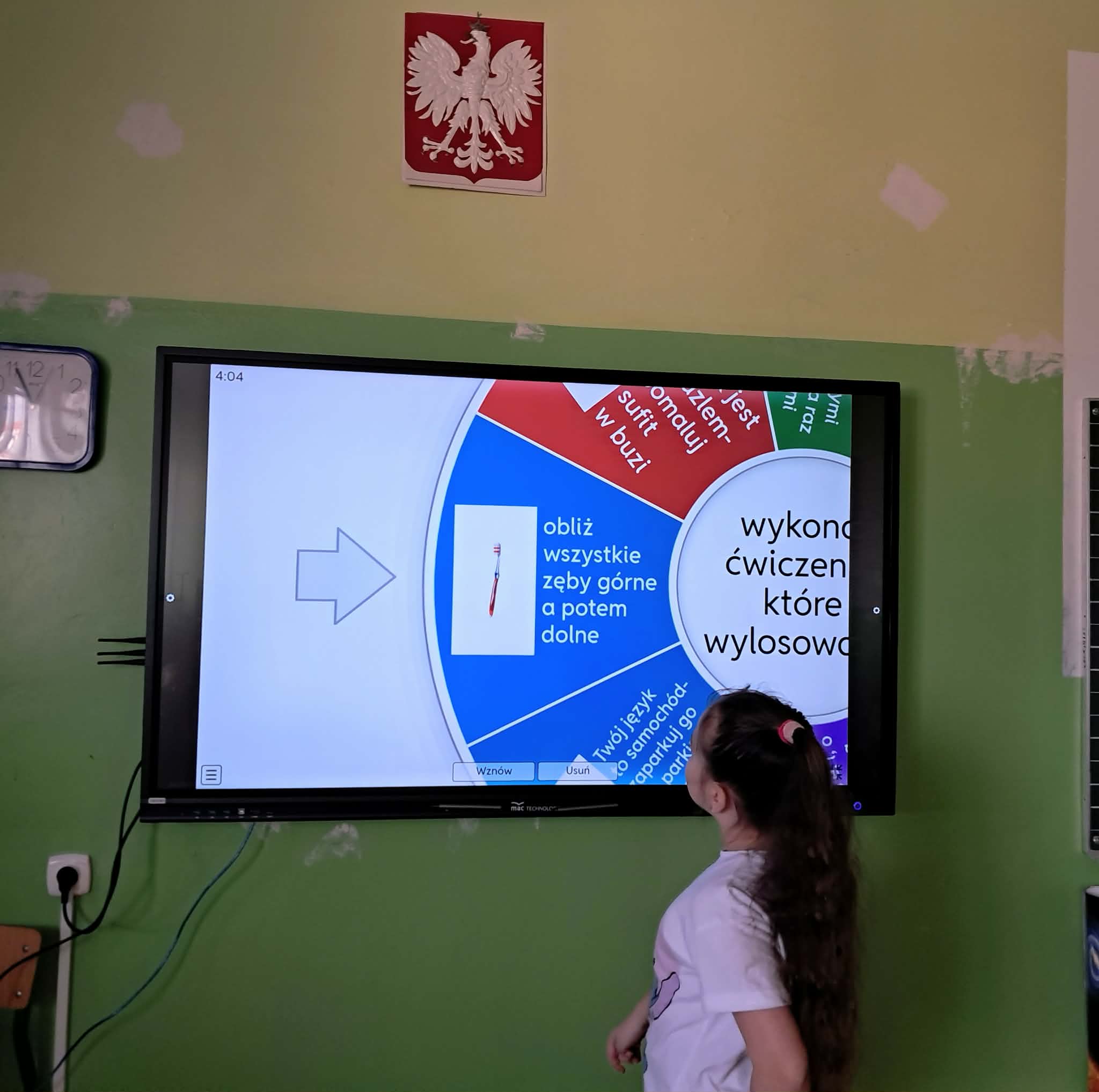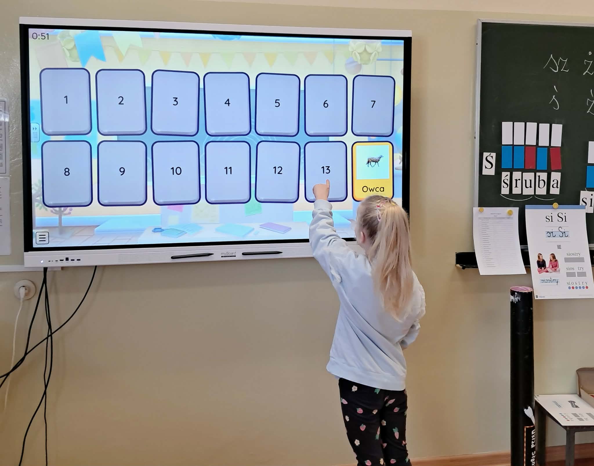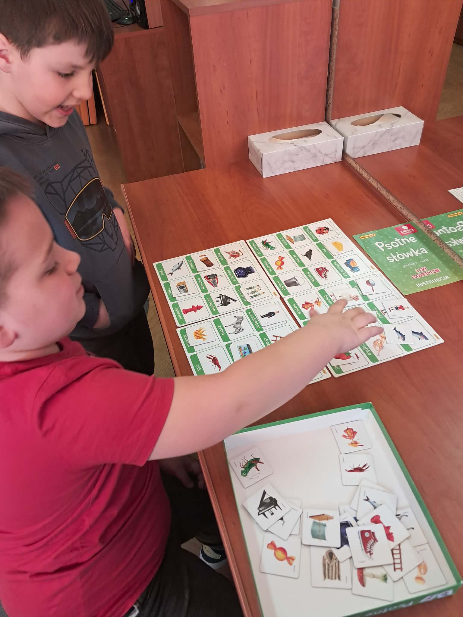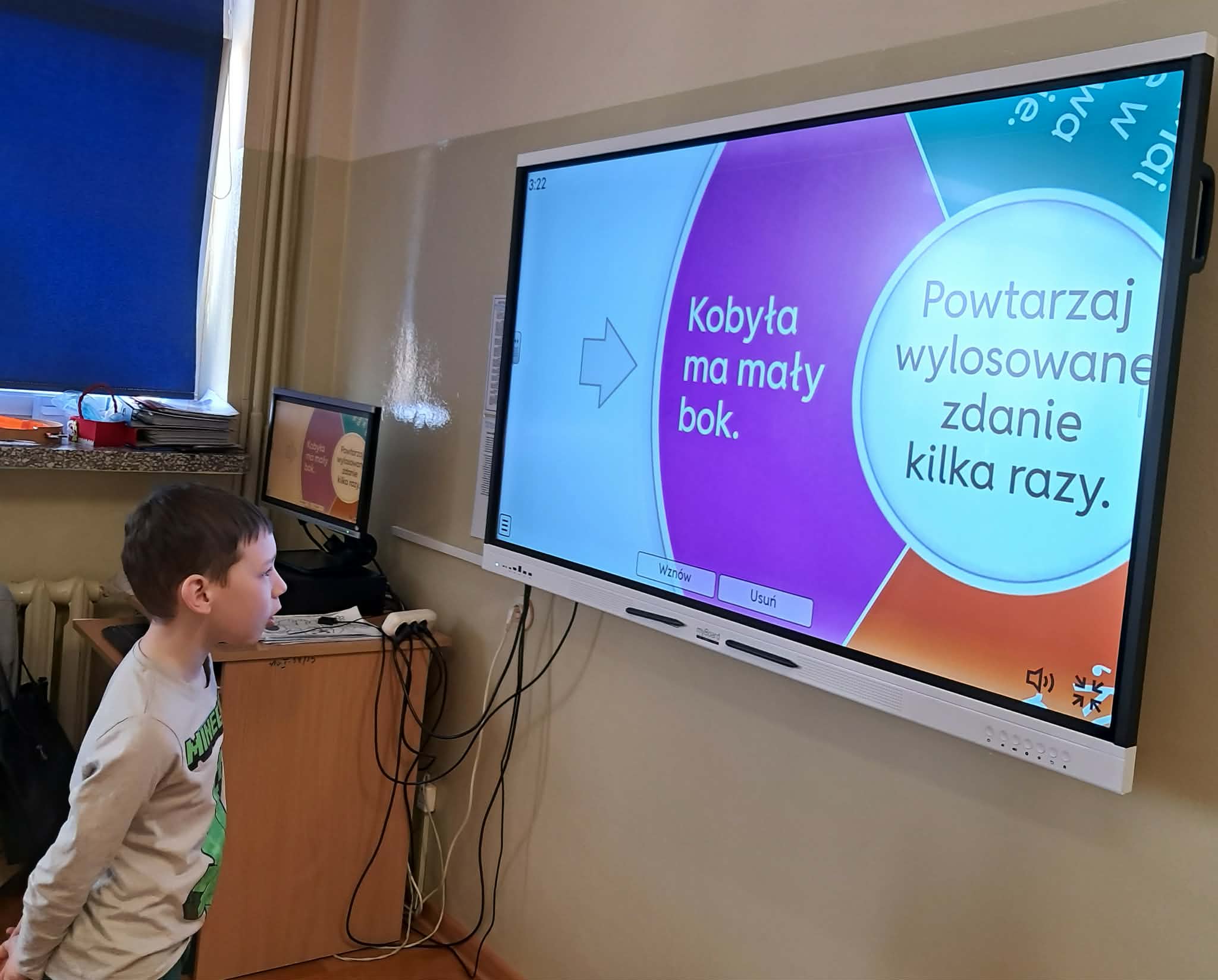 Dużym zainteresowaniem uczniów cieszyły się zagadki i zabawy słowne z wykorzystaniem kolorowych obrazków oraz tablicy interaktywnej. Dzieci rozwiązywały zadania językowe, dopasowywały wyrazy, ćwiczyły słuch fonemowy oraz rozwijały słownictwo. W trakcie zajęć uczniowie próbowali również swoich sił w powtarzaniu “łamańców językowych”, co było okazją do ćwiczenia poprawnej i wyraźnej wymowy w formie zabawy.