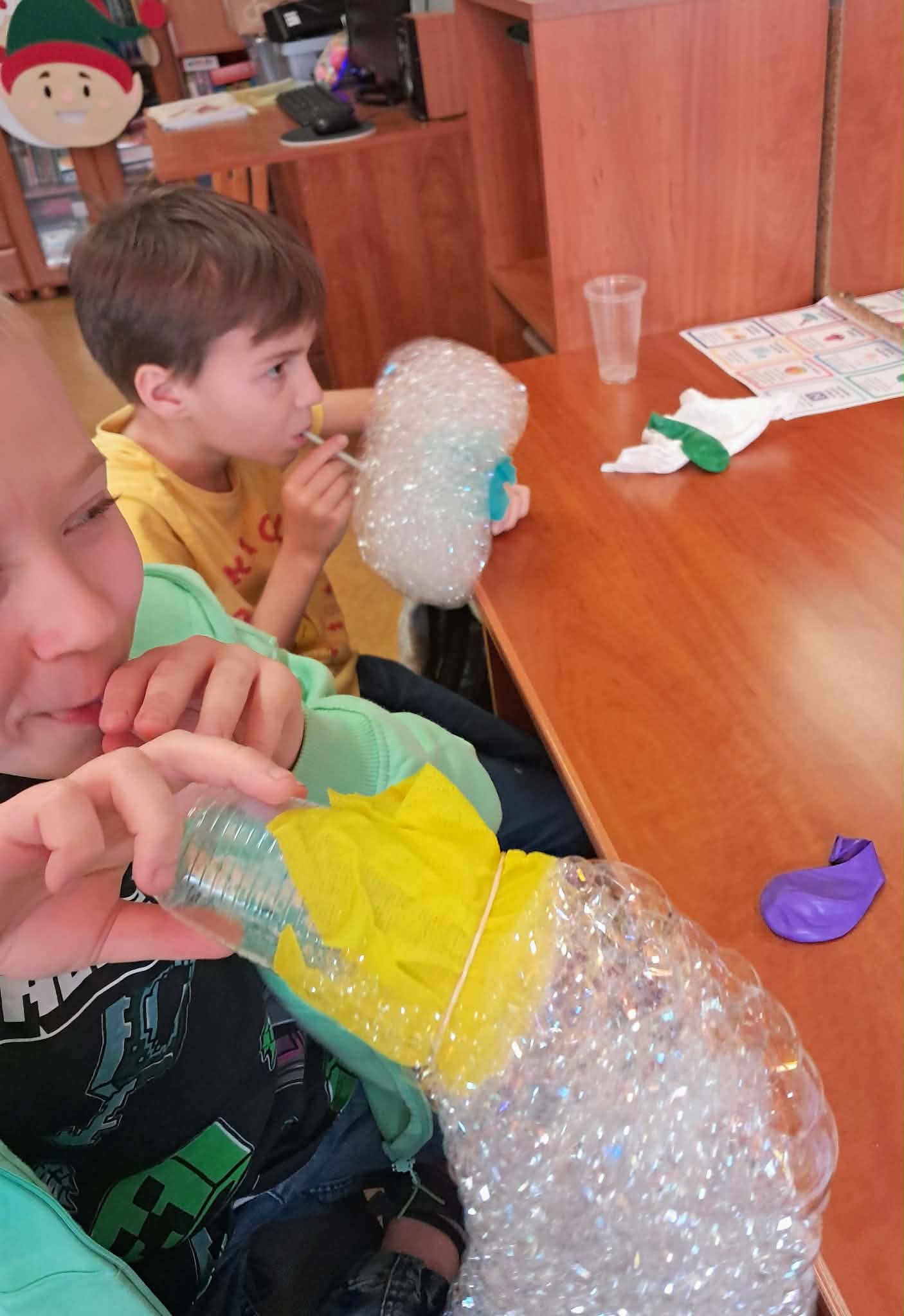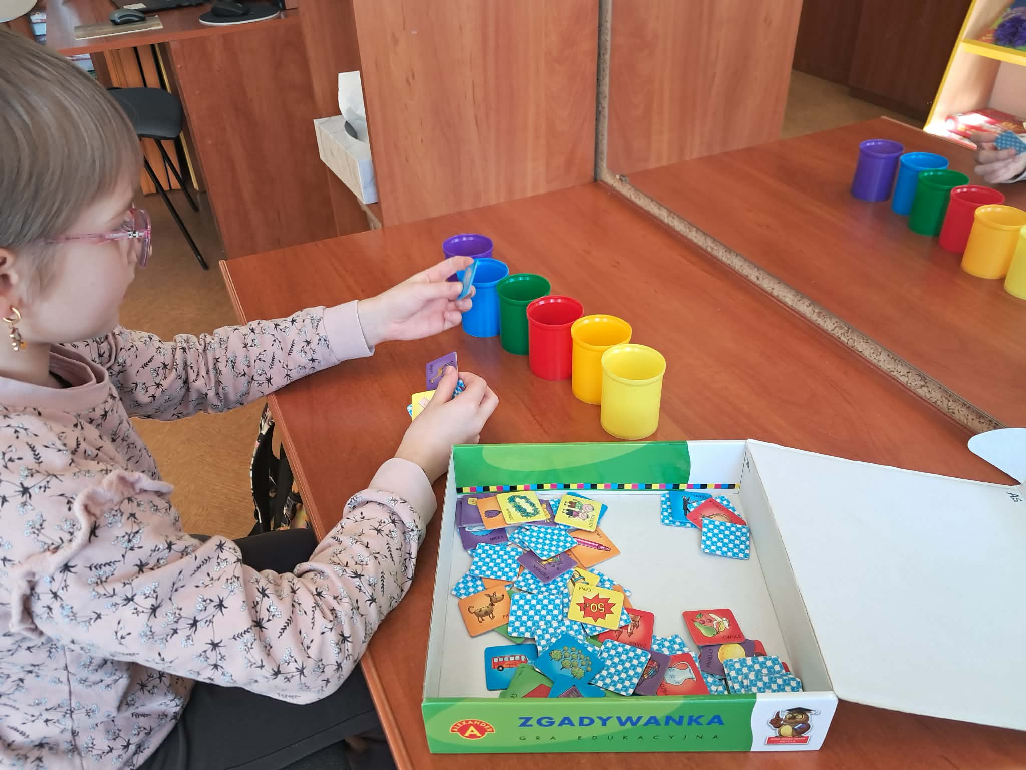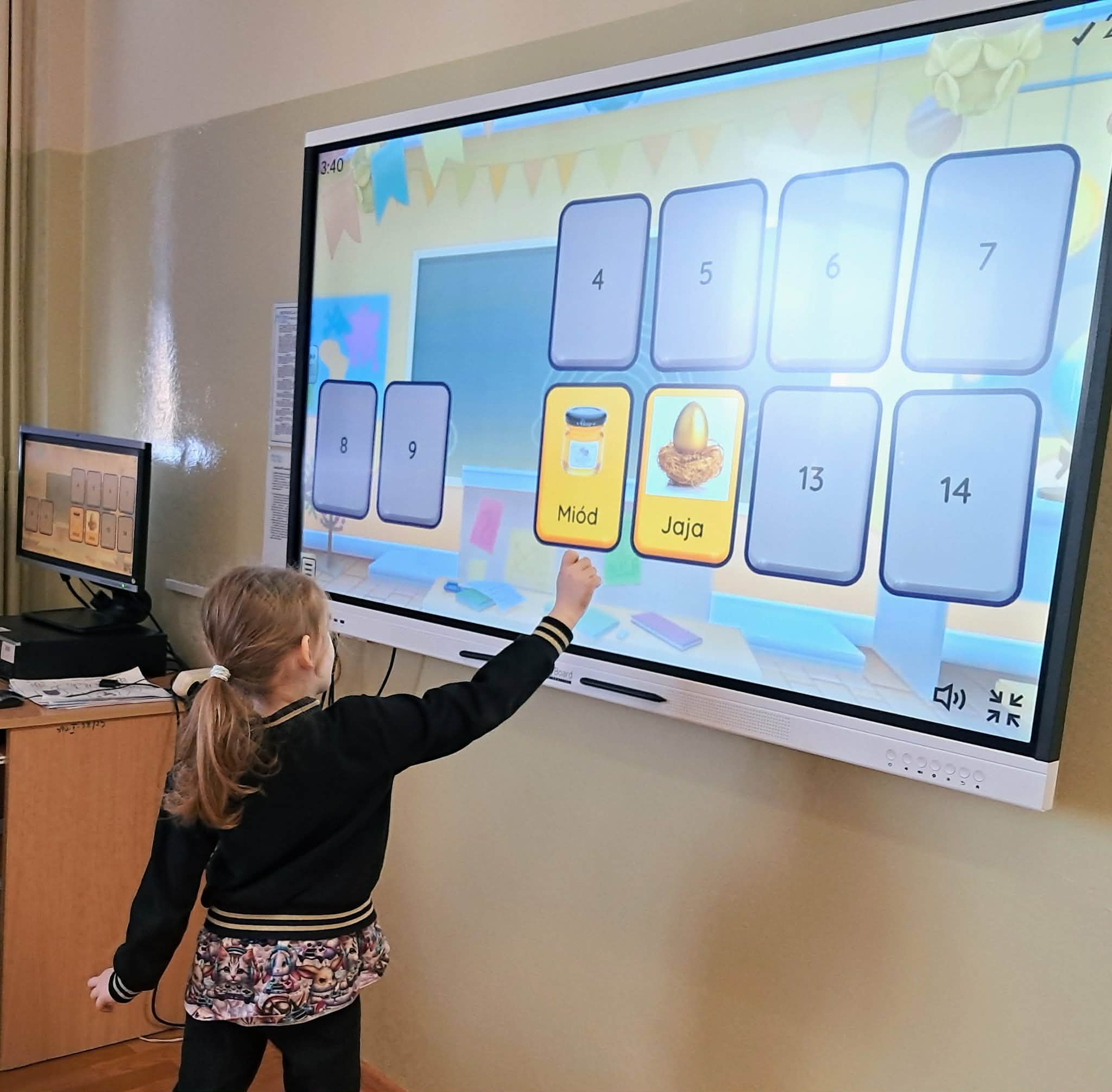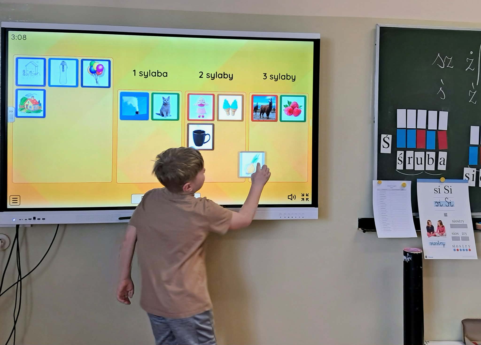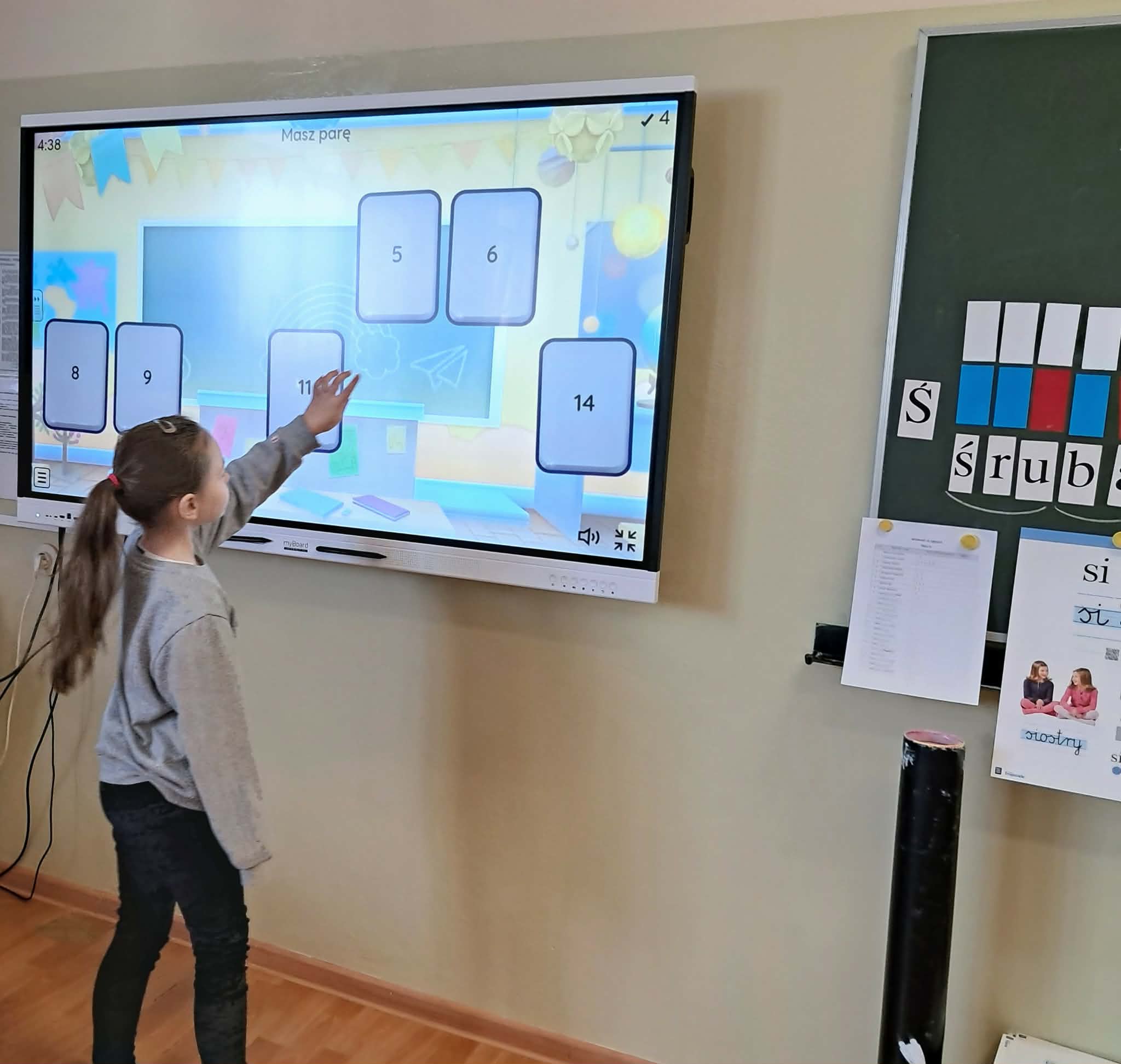 Dużym zainteresowaniem uczniów cieszyły się zagadki i zabawy słowne z wykorzystaniem kolorowych obrazków oraz tablicy interaktywnej. Dzieci rozwiązywały zadania językowe, dopasowywały wyrazy, ćwiczyły słuch fonemowy oraz rozwijały słownictwo. W trakcie zajęć uczniowie próbowali również swoich sił w powtarzaniu “łamańców językowych”, co było okazją do ćwiczenia poprawnej i wyraźnej wymowy w formie zabawy.